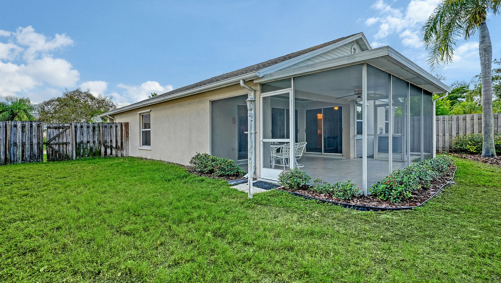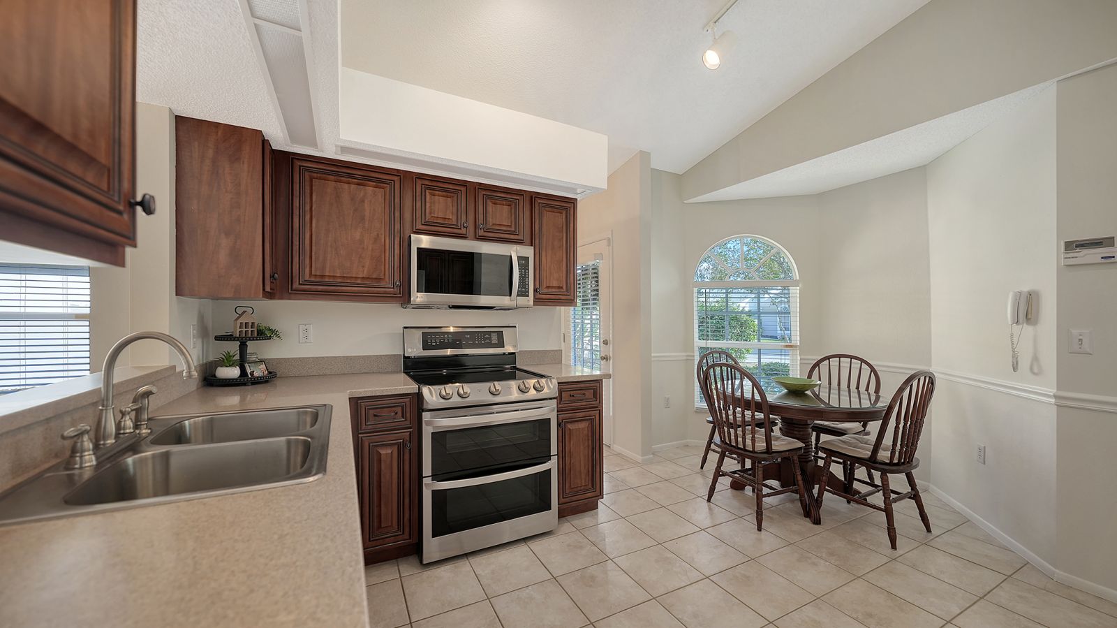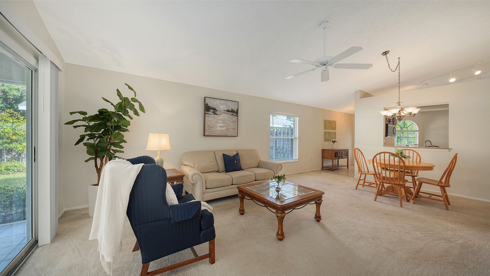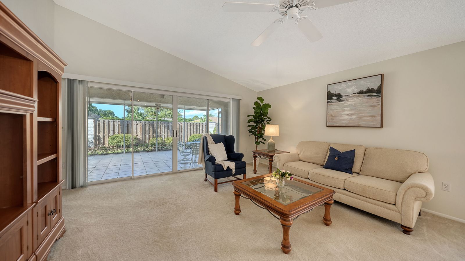 Nestled in the desirable Treetops neighborhood, centrally located to all the best Bradenton and Sarasota have to offer, this charming 3-bedroom, 2-bathroom home offers the perfect blend of comfort, functionality, and convenience. Step into the expansive great room with vaulted ceilings and a wall of glass sliders, flooding the space with natural light and providing seamless access to the large, covered, screened outdoor patio. The adjoining dining area makes entertaining effortless and enjoyable. The kitchen is both stylish and practical, featuring updated cabinetry, stunning corian countertops, and matching, like new stainless steel appliances. A convenient pass-through connects the kitchen to the dining and family room, making it easy to stay engaged with guests or family while preparing meals. An eat-in kitchen nook offers an alternative cozy spot for casual dining. The spacious primary bedroom is designed for relaxation, boasting vaulted ceilings, abundant natural light from another glass slider, also with direct access to the covered patio. The suite includes a large walk-in closet and a private en-suite. Two additional bedrooms provide options to fit one's own lifestyle. One features a standard closet, while the other offers a double French door entry and walk-in closet, ideal for use as a bedroom, office, craft room, den, or workout space to name a few. Enjoy the convenience of an interior laundry closet with a full-size washer and dryer. Outdoors, the rear yard and patio are enclosed with privacy fencing. The entire interior was recently painted, including all trim and ceilings. This home's location is truly unbeatable. Less than 5 miles from I-75 and University Town Center (UTC), offering a wealth of shops and restaurants. Sarasota-Bradenton International Airport is also just 5 miles, while Lido Beach is under 10 miles. The Treetops neighborhood features an HOA that includes a community pool and tennis court, basicinternet service, and No CDD fees. Don't miss this opportunity to make this beautifully maintained, move-in ready home yours.