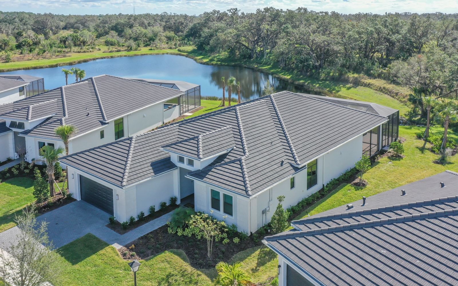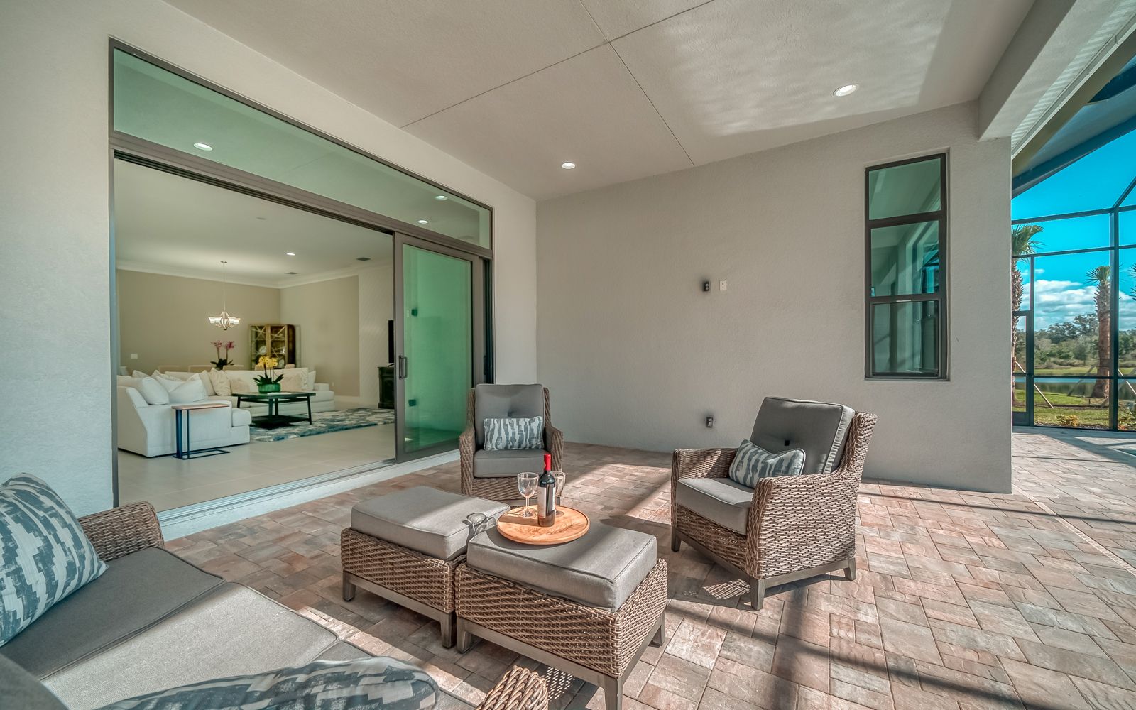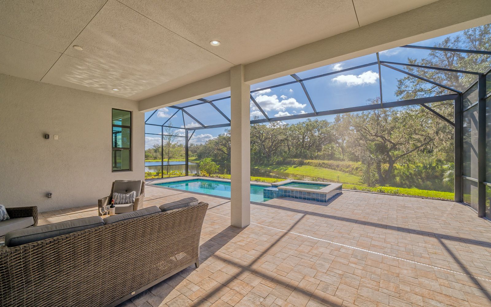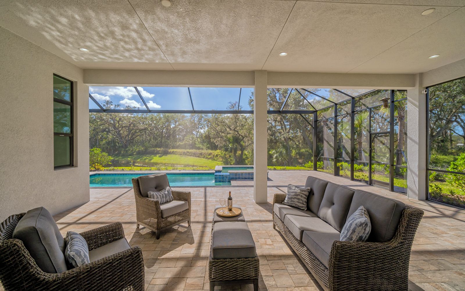 Why wait for your new home! Rarely available in Artistry Sarasota, this Van Gogh floor plan has been greatly enhanced by the owner. A true 3 bedroom / 3 full bath home that sits perfectly on an expansive lot with lake and preserve views. This residence has been constructed for your comfort with impact resistant doors and windows and a whole house water softener. The double door entry with waterfall glass opens to a generous foyer with large format porcelain tile. The adjacent den with its calm wall colors and custom-built ins is enhanced by a dry bar and beverage cooler. Open, light and bright describes the dining and great room combination. The herringbone feature wall in the great room lends a craftsman finish to the space along with the double crown molding that wraps the interior of the home. Transoms above the sliders that lead to the heated pool and spa let the sunlight in, while the clear view screen on the pool cage makes you feel open to the outdoors. A beautiful paver deck with pebble tec pool interior creates an inviting space for an afternoon swim. Inside, the kitchen offers an upgraded stainless appliance package, quartz countertops, a neutral high gloss backsplash and custom built in pantry. The primary bedroom is expansive with a large walk-in closet, lengthy bathroom quartz top vanity with two sinks, plenty of cabinetry and drawer space, linen closet and walk in shower with multiple shower heads. Artistry Sarasota residents enjoy access to a resident-exclusive clubhouse that includes a full fitness center with yoga and aerobics studio, resort-style pool, expansive poolside sun deck, community room, playground and sports courts. Outdoor amenities include covered outdoor seating areas and walking trails. A natural gas community, Artistry has no CDD fee and low monthly fees that include ground maintenance. Located in a quiet but convenient part of Sarasota, you are minutes from downtown, our beautiful beaches and all the convenience and events of Lakewood Ranch.