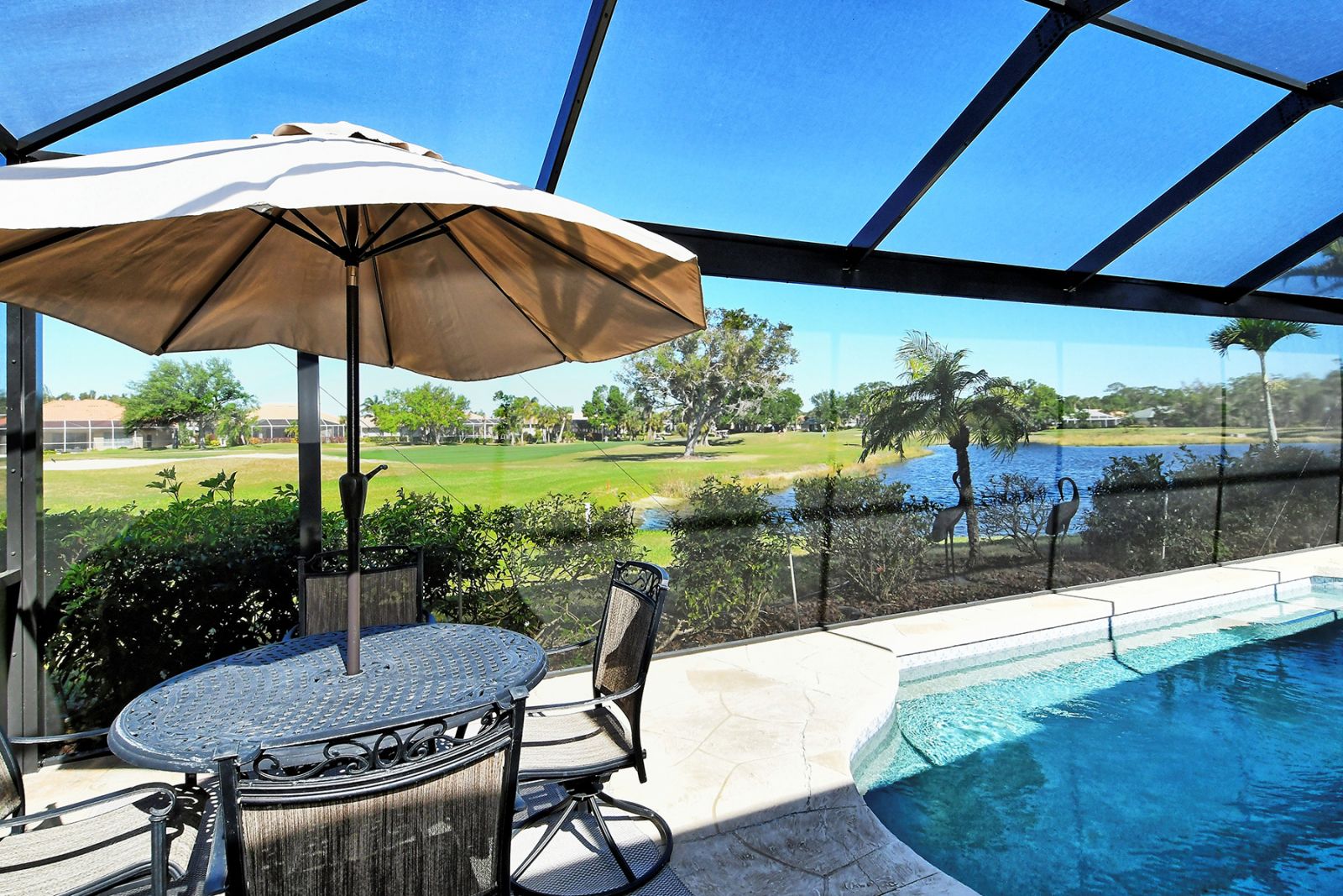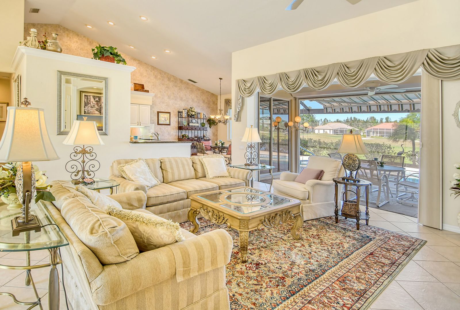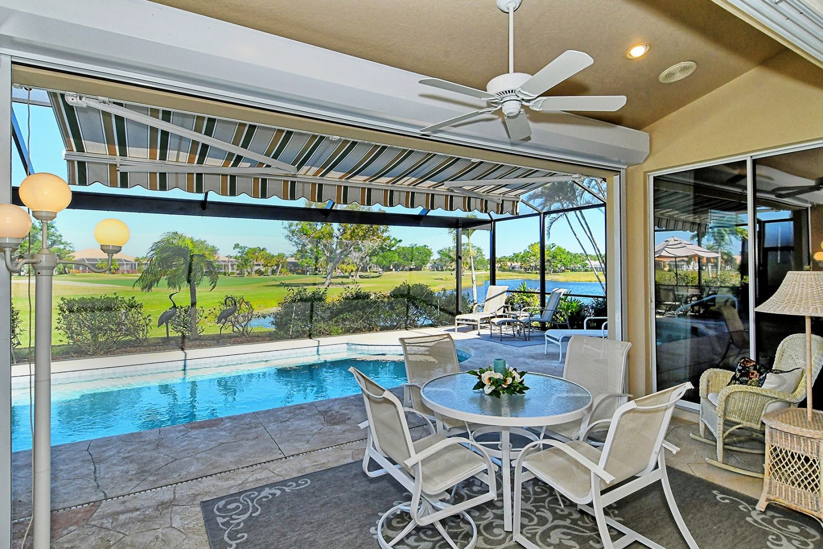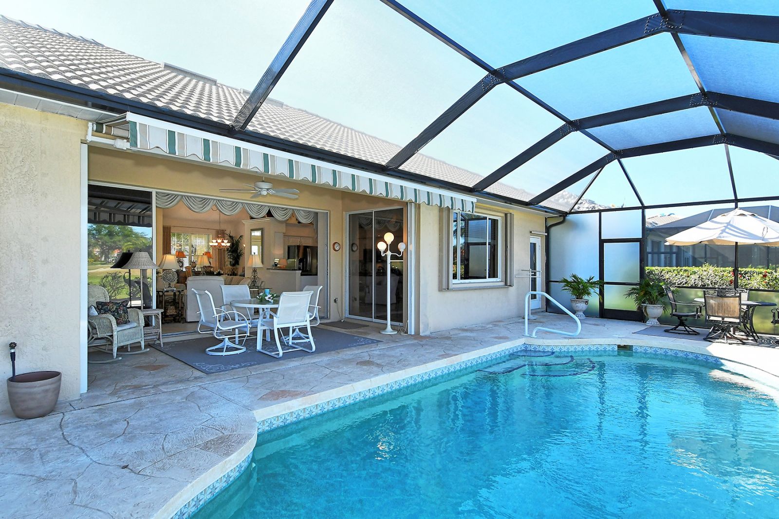 Beyond the beautiful custom leaded glass entry doors you are greeted by a bright, gracious home perfectly seated with an expansive north-western sky, and both lake and golf course views. Offered beautifully furnished, decorated and completely equipped to the smallest detail, this three bedroom, three bath, plus den/office split plan design is a rare market find. It is the perfect place to relax, rejuvenate, and enjoy your Florida lifestyle. Located in the wonderful award winning gated community, Pelican Pointe Golf & Country Club, there are many active and leisure choices to discover by being a resident. 27 holes of top rated semi-private golf, an active social calendar, dining and fitness, plus only 3 miles from downtown Venice Island, shopping, restaurants, and the shimmering gulf beaches! It doesn't get much better than this! Special features include Hunter Douglas window treatments, new carpeting and wood flooring, designer draperies, newer appliances, new high end pool equipment, and a new panoramic screened lanai designed for optimum view and privacy with protective no seeum screening for enjoying the outdoor space. A retractable awning provides shaded space for outdoor dining, and storm shutters afford peace of mind in the weather. Furnished with Lexington furniture, Karastan rugs, Serta IComfort new bedding, Ralph Lauren linens, Mikasa china and Waterford crystal, this is a must see residence for your perfect Florida, move in ready lifestyle! The homeowner's association fee includes lawn maintenance, irrigation, AND a social membership. Tennis, pickleball, fitness, a heated pool, restaurant and many activities to choose from are included in your social membership! Don't miss this one!