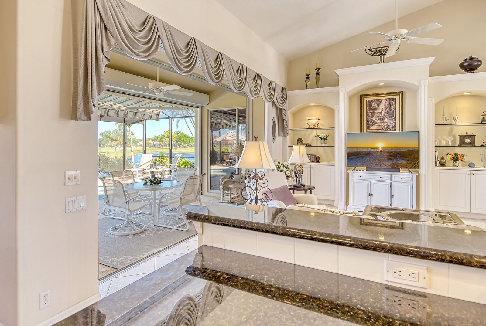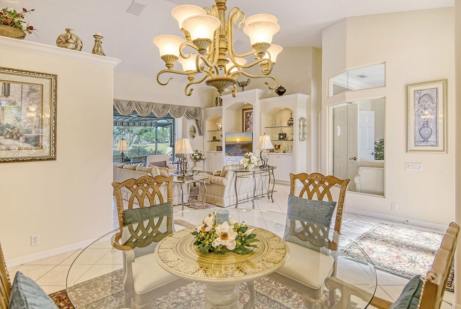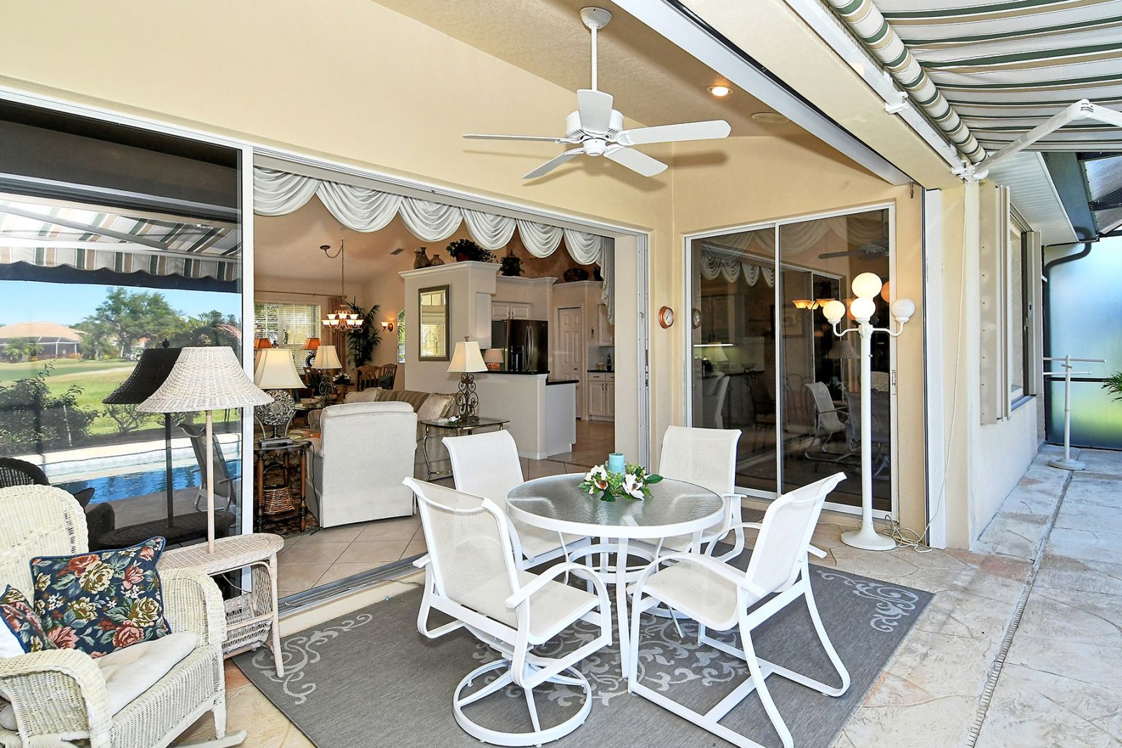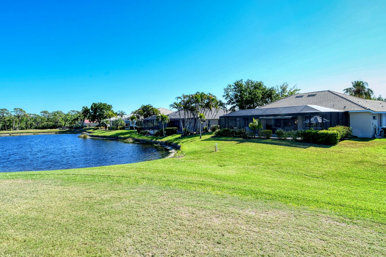 Beyond the beautiful custom leaded glass entry doors you are greeted by a bright, gracious home perfectly seated with an expansive north-western sky, and both lake and golf course views. Offered beautifully furnished, decorated and completely equipped to the smallest detail, this three bedroom, three bath, plus den/office split plan design is a rare market find. It is the perfect place to relax, rejuvenate, and enjoy your Florida lifestyle. Located in the wonderful award winning gated community, Pelican Pointe Golf & Country Club, there are many active and leisure choices to discover by being a resident. 27 holes of top rated semi-private golf, an active social calendar, dining and fitness, plus only 3 miles from downtown Venice Island, shopping, restaurants, and the shimmering gulf beaches! It doesn't get much better than this! Special features include Hunter Douglas window treatments, new carpeting and wood flooring, designer draperies, newer appliances, new high end pool equipment, and a new panoramic screened lanai designed for optimum view and privacy with protective no seeum screening for enjoying the outdoor space. A retractable awning provides shaded space for outdoor dining, and storm shutters afford peace of mind in the weather. Furnished with Lexington furniture, Karastan rugs, Serta IComfort new bedding, Ralph Lauren linens, Mikasa china and Waterford crystal, this is a must see residence for your perfect Florida, move in ready lifestyle! The homeowner's association fee includes lawn maintenance, irrigation, AND a social membership. Tennis, pickleball, fitness, a heated pool, restaurant and many activities to choose from are included in your social membership! Don't miss this one!