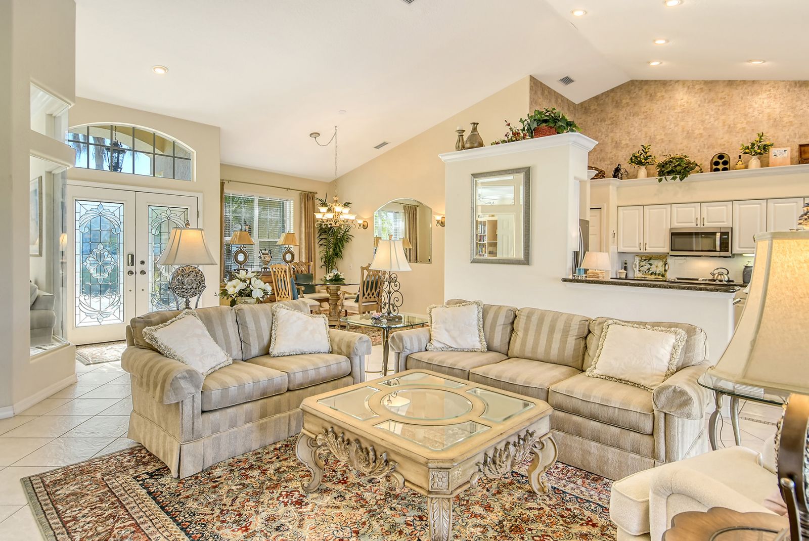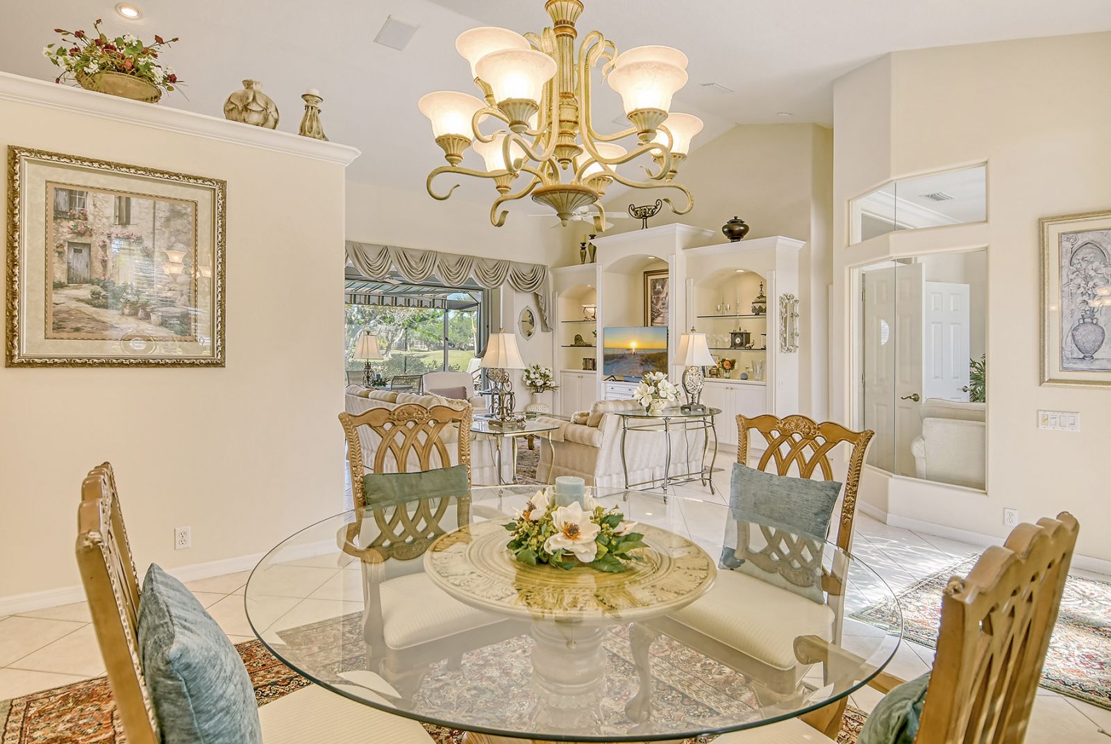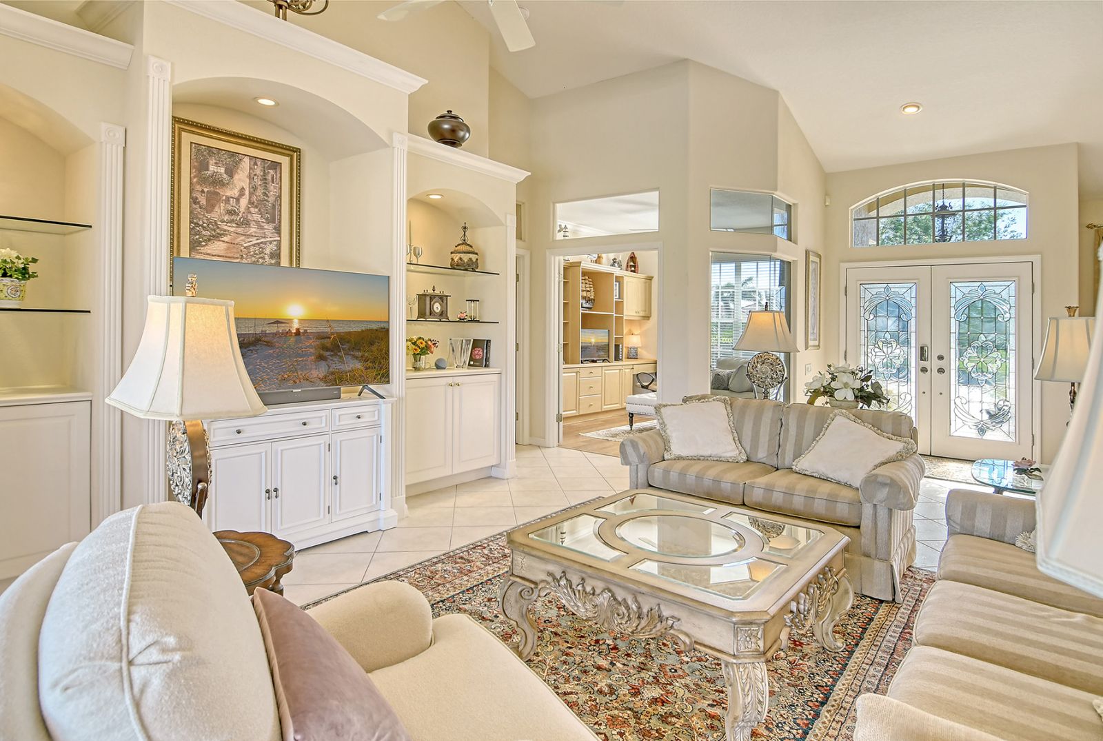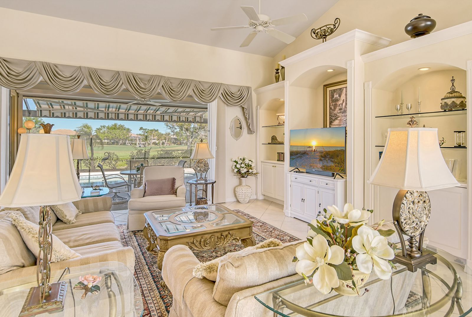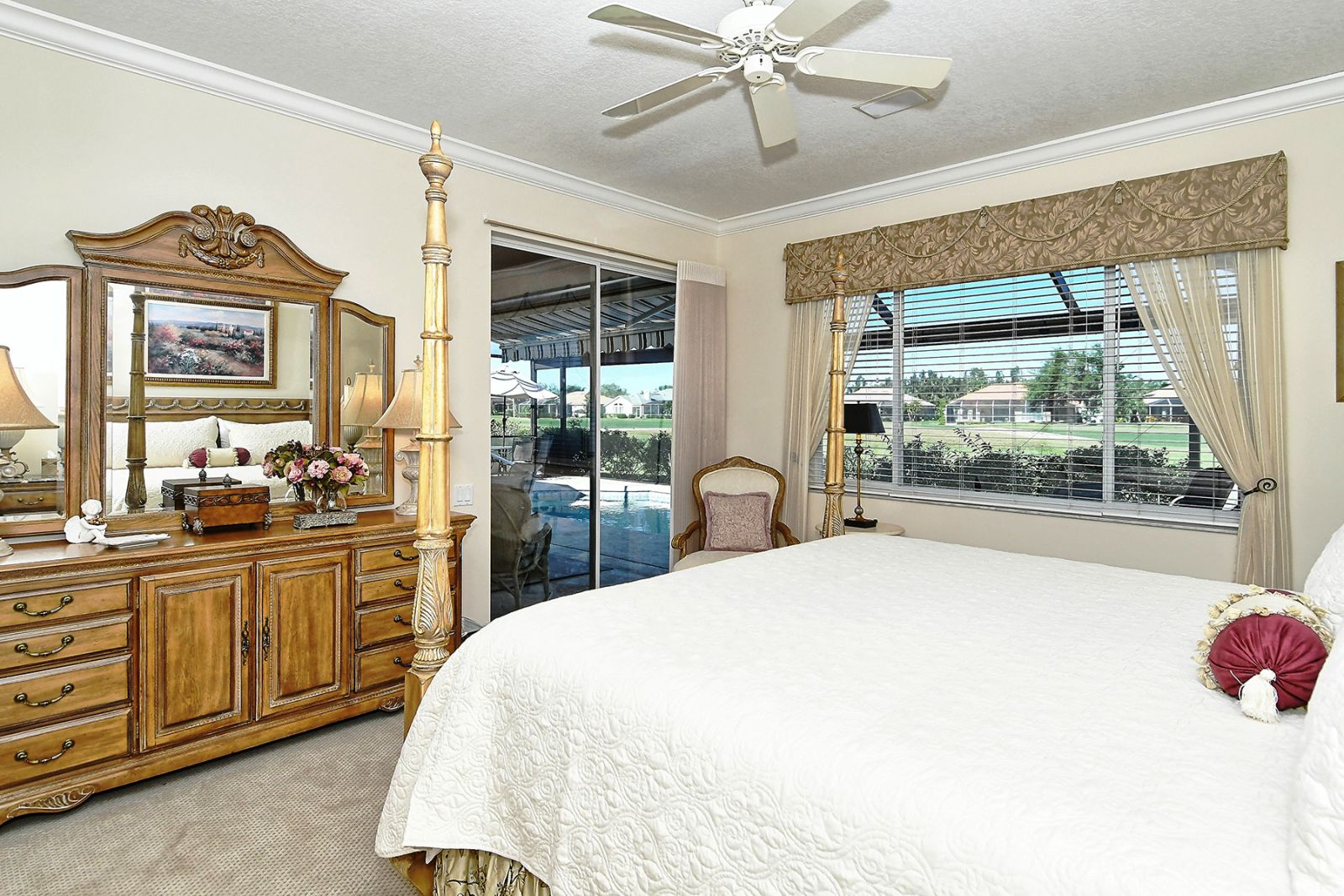 Beyond the beautiful custom leaded glass entry doors you are greeted by a bright, gracious home perfectly seated with an expansive north-western sky, and both lake and golf course views. Offered beautifully furnished, decorated and completely equipped to the smallest detail, this three bedroom, three bath, plus den/office split plan design is a rare market find. It is the perfect place to relax, rejuvenate, and enjoy your Florida lifestyle. Located in the wonderful award winning gated community, Pelican Pointe Golf & Country Club, there are many active and leisure choices to discover by being a resident. 27 holes of top rated semi-private golf, an active social calendar, dining and fitness, plus only 3 miles from downtown Venice Island, shopping, restaurants, and the shimmering gulf beaches! It doesn't get much better than this! Special features include Hunter Douglas window treatments, new carpeting and wood flooring, designer draperies, newer appliances, new high end pool equipment, and a new panoramic screened lanai designed for optimum view and privacy with protective no seeum screening for enjoying the outdoor space. A retractable awning provides shaded space for outdoor dining, and storm shutters afford peace of mind in the weather. Furnished with Lexington furniture, Karastan rugs, Serta IComfort new bedding, Ralph Lauren linens, Mikasa china and Waterford crystal, this is a must see residence for your perfect Florida, move in ready lifestyle! The homeowner's association fee includes lawn maintenance, irrigation, AND a social membership. Tennis, pickleball, fitness, a heated pool, restaurant and many activities to choose from are included in your social membership! Don't miss this one!