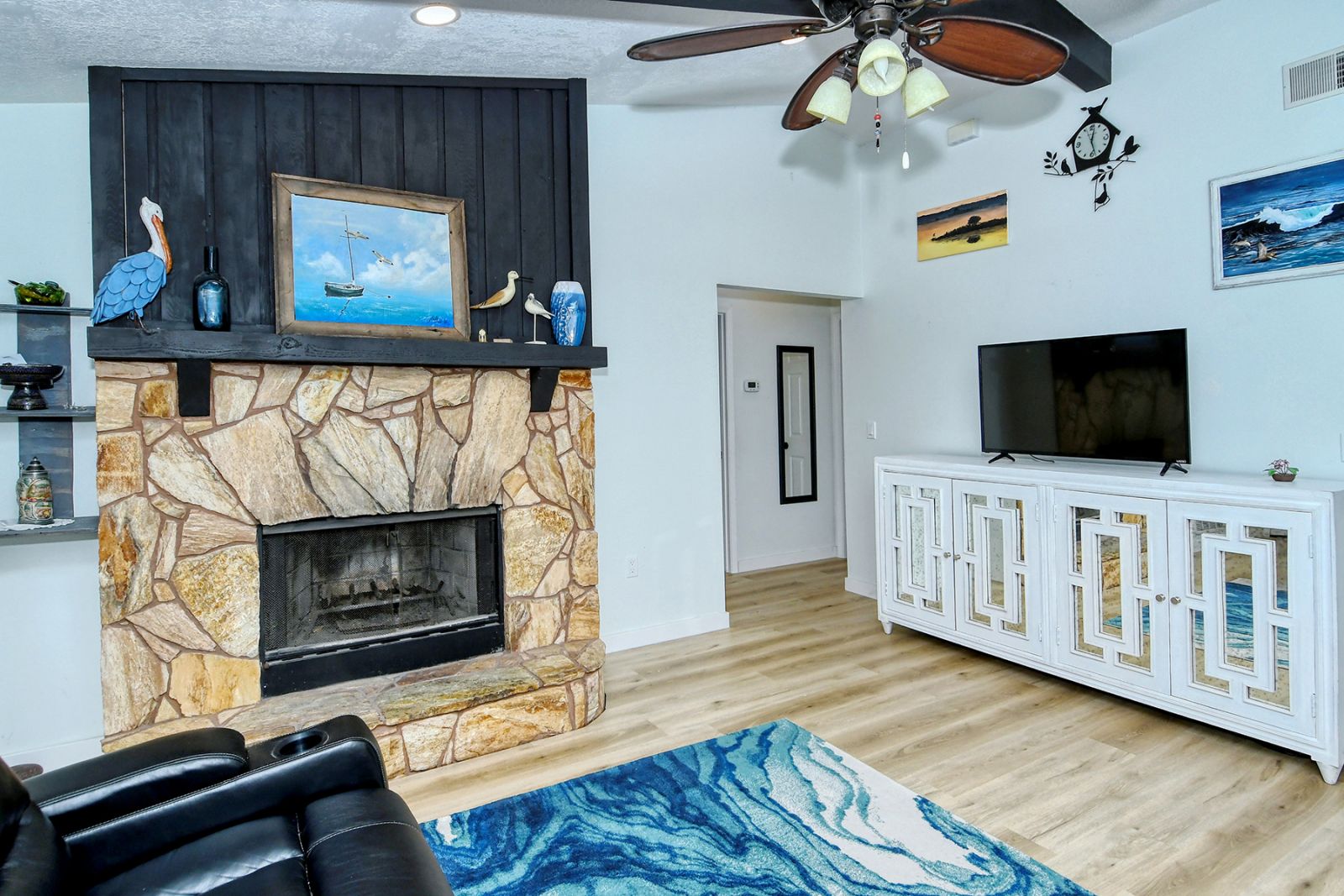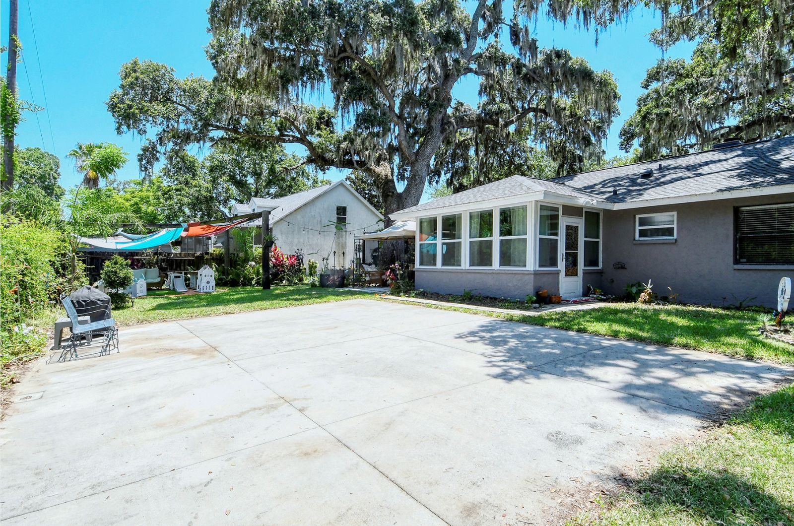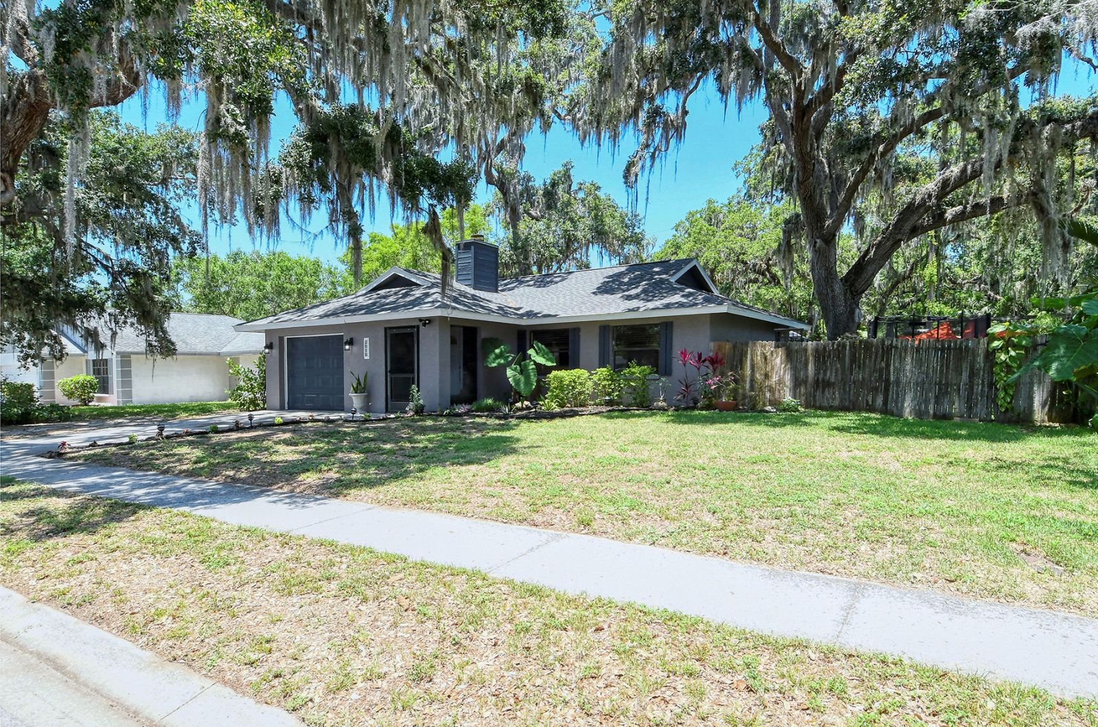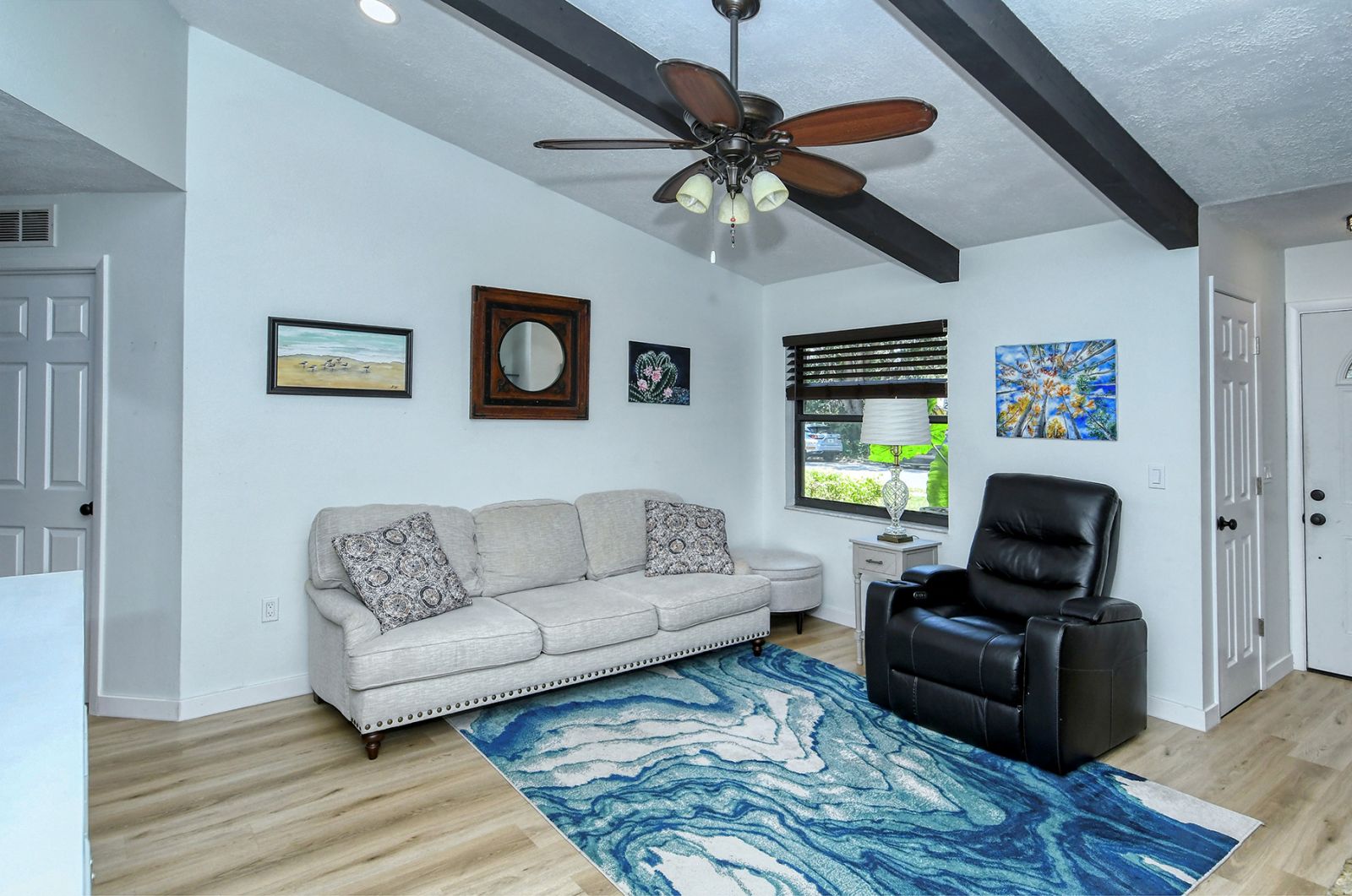 In addition to 2 bedrooms, this split-plan home includes a sunroom, currently used as a 3rd bedroom. Immediately upon entering this stunning home you're greeted with Vaulted Ceilings, Exposed Beams, a magnificent stone fireplace, and LOADS of natural light pouring into every room. The ample master bedroom includes his & her walk-in closets as well as an en-suite bathroom. The kitchen boasts all Stainless Steel Appliances, solid-surface counters, gorgeous glass & ceramic backsplash, built-in pantry, and a large breakfast bar which opens into the dining room. High quality wood laminate flooring covers the main living spaces, with carpeting in the bedrooms. The sunroom/3rd bedroom opens to the Expansive backyard- perfect for families, pets, and entertaining with plenty of room for all your toys! The large concrete pad out back could be used for additional seating with space for a grill and/or outdoor fireplace, or put in a basketball hoop and have your own backyard basketball court! **ROOF REPLACED MAY 2021**A/C REPLACED NOV 2022