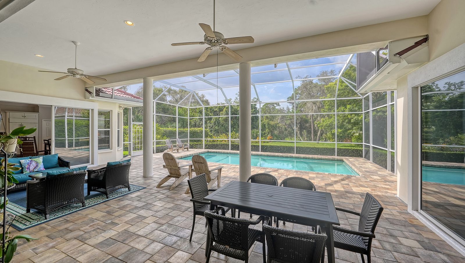 Experience complete privacy in this 3 bedroom, 4.5 bath home in The Oaks Clubside. Step inside and you will immediately be impressed with the space in front of you. The grand living/dining room has 12 foot high ceilings, crown molding, a fireplace and oversized sliding doors. Open and airy and flooded with natural light, the great room flows out to the partially covered lanai and pool area. The perfect set up for a party, with guests spilling from the inside to this spacious area to enjoy a gorgeous afternoon or a temperate Floria evening. And, when you choose to spend some quiet time downtime, this wonderful, screened area with southern exposure offers all the peace and privacy you crave. Backing to North Creek, with views of a lush lawn and local foliage, there is no better place to wind down after a day of tennis or on the golf course. The master suite has two bathrooms and two walk-in closets. Each guest room is en-suite. The kitchen is large with room for a table and chairs, and has an island, pantry and a separate entertainment area with a beverage refrigerator. This home has great storage space, with many closets and an oversized 3 car garage. The exterior of this home was just freshly painted, and a new roof was installed in 2017. With hardwood floors throughout, a full house filtration system and more, you MUST SEE this property if you are seeking a home where you can enjoy country club living in quiet comfort. The Oaks Club, Sarasota's premiere golf and country club, has two 18-hole golf courses, twelve HAR-TRU tennis courts (4 lighted), four pickleball courts, a state-of-the-art WellFit Center, an award-winning culinary team, and robust activities and social calendars. Located in the heart of South Sarasota, it is close to the area's world renowned beaches, fine restaurants and abundant shopping venues. Club membership required with homeownership.