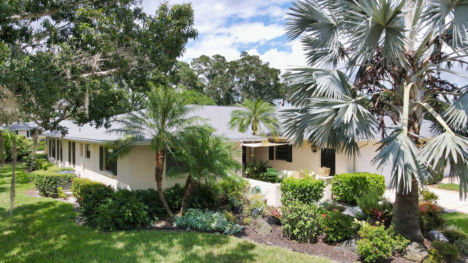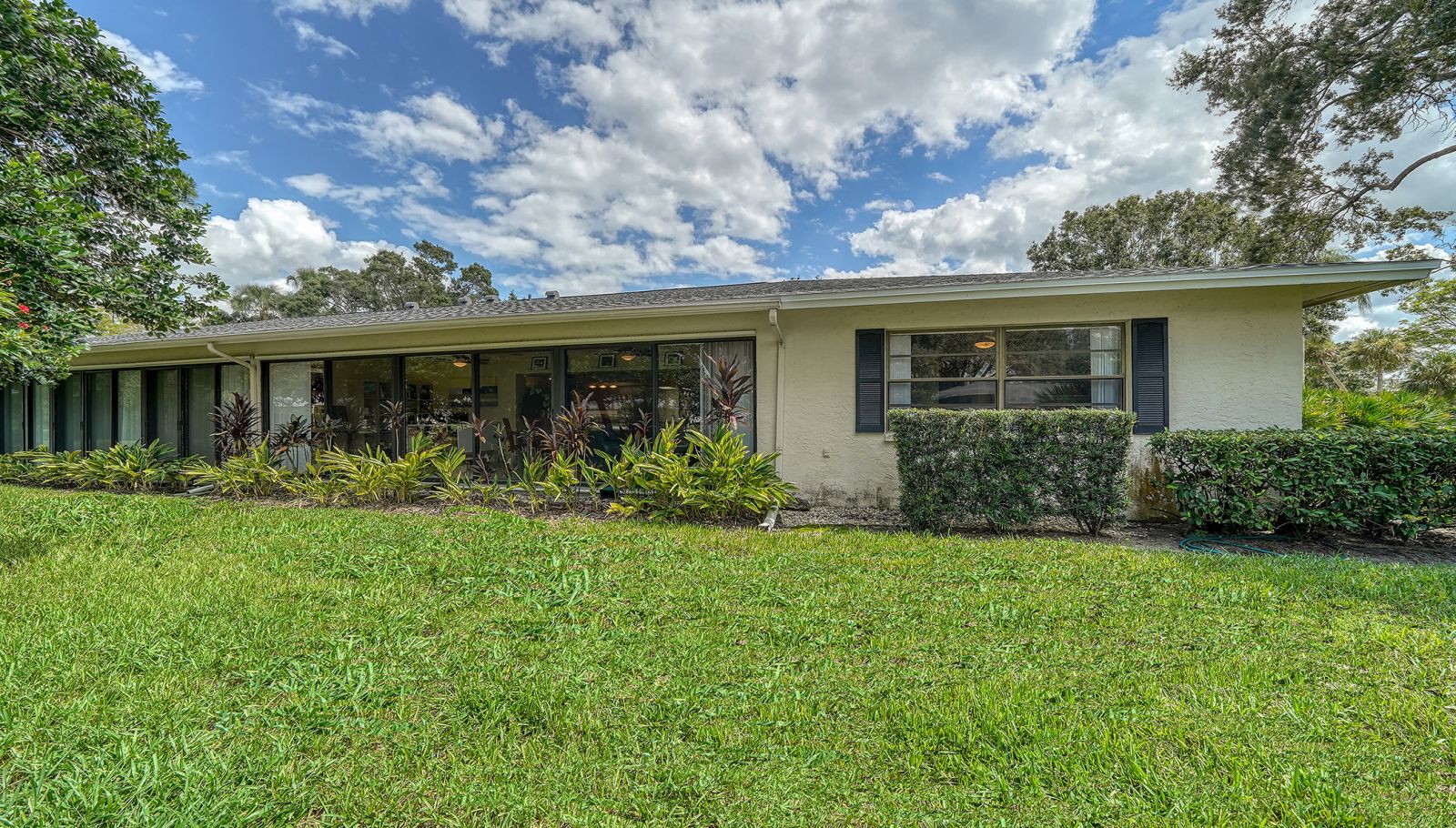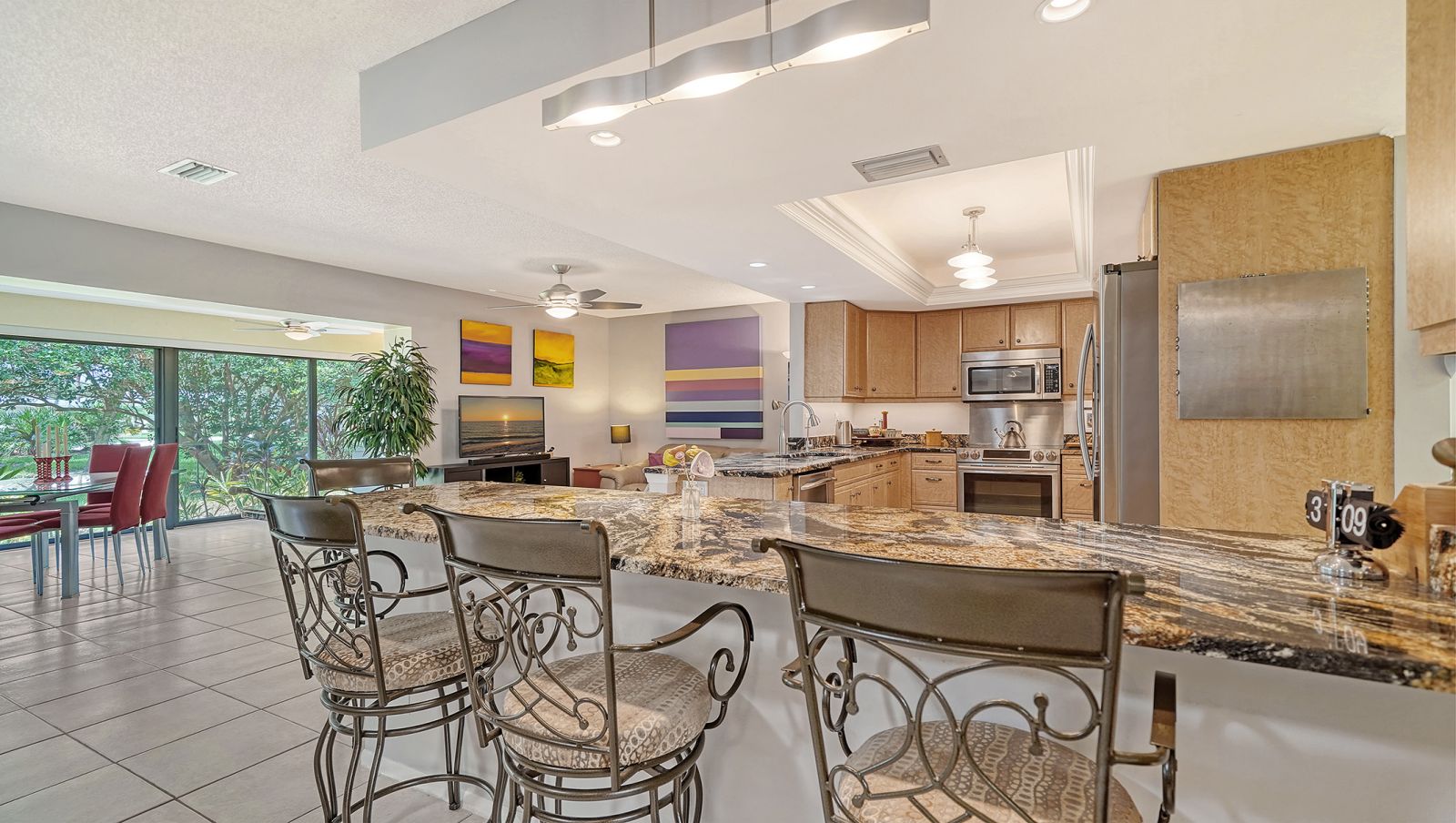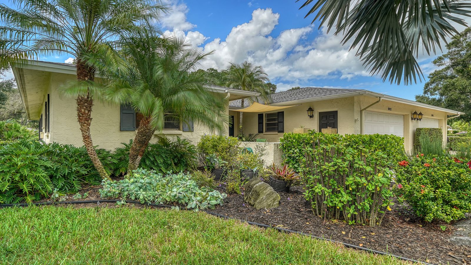 This villa in the active lifestyle community of Palm Aire is truly special. An end unit surrounded on 3 sides by greenspace and lush landscaping, providing wonderful privacy and a serene setting. It is one of the rare units in the small Fairway Bend community that is greater than 2,000 sq ft, that has 3 full bedrooms and a garage not just for 2 cars but also for a golf cart! A great home for entertaining family and friends. The large kitchen is open to both the living and family room areas with a 10 foot long breakfast bar. As you walk in the front door, your eyes will immediately be drawn to the wide-open view of the backyard. The entire wall of floor-to-ceiling glass all along the far side of the huge 30' x 11' Florida Room visually brings the outdoors in. It creates the impression that the interior space is endless. Yes, this home is very special. It is worth your time. Come and see! As you will see in the pictures, the kitchen has been nicely updated. Ask to see how the very clever corner base cabinets work, taking full advantage of all the storage space available. The master and guest bedrooms are at opposite ends of the home offering wonderful privacy and both have ensuite baths. The 3rd bedroom is adjacent to the master and separated by pocket doors so you can either incorporate it as a sitting area or nursery off the master or close it off as a separate 3rd bedroom or office. As you approach the home, you'll be charmed as you walk by the fountain in the beautifully landscaped extended front court yard. It even has its own separate irrigation system for easy maintenance and is shaded with a contemporary style sail awning. This home has even been pre-wired for easy connection to a whole house generator. The Fairway Bend Association, as a maintenance-free community, takes care of and is responsible for both the grounds and the building exterior. In fact, they just recently replaced the roof on this villa! Fairway Bend is part of the larger, delightful and active Palm Aire community. Country club memberships are reasonable and optional, offering golf, tennis, pickleball, fitness, fine dining and lots of social activities. Visit PalmAire.net for more info. Fairway Bend has its own separate heated community pool that is just a 1/10 mile walk from this home. The community is ideally located with easy access to I-75, the incredible University Town Center and surrounding shopping areas, the Sarasota international airport, downtown Sarasota, and our award winning beaches.
