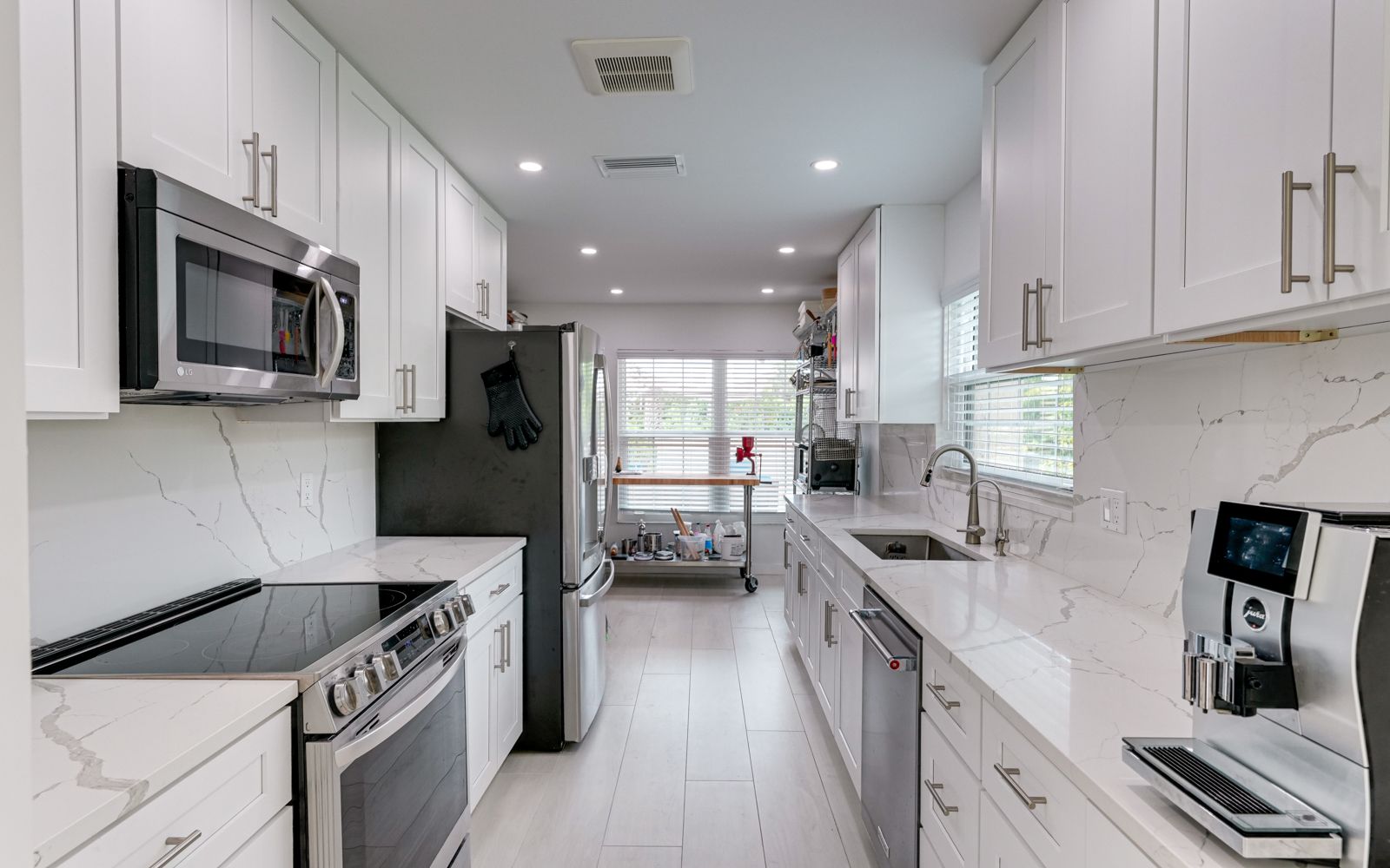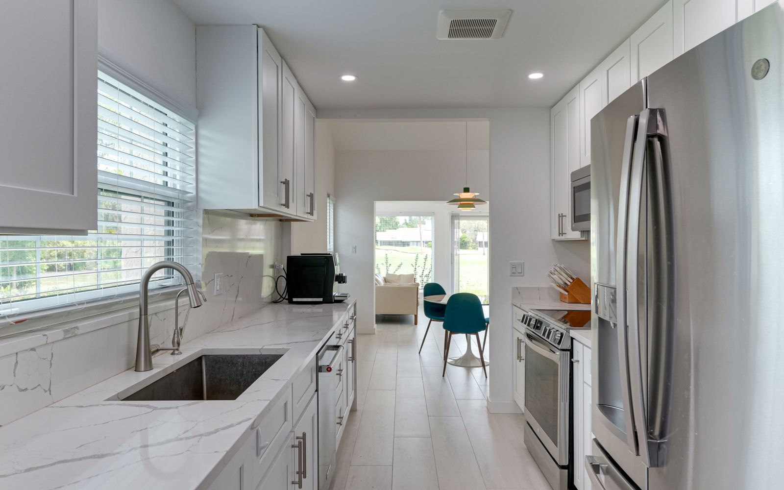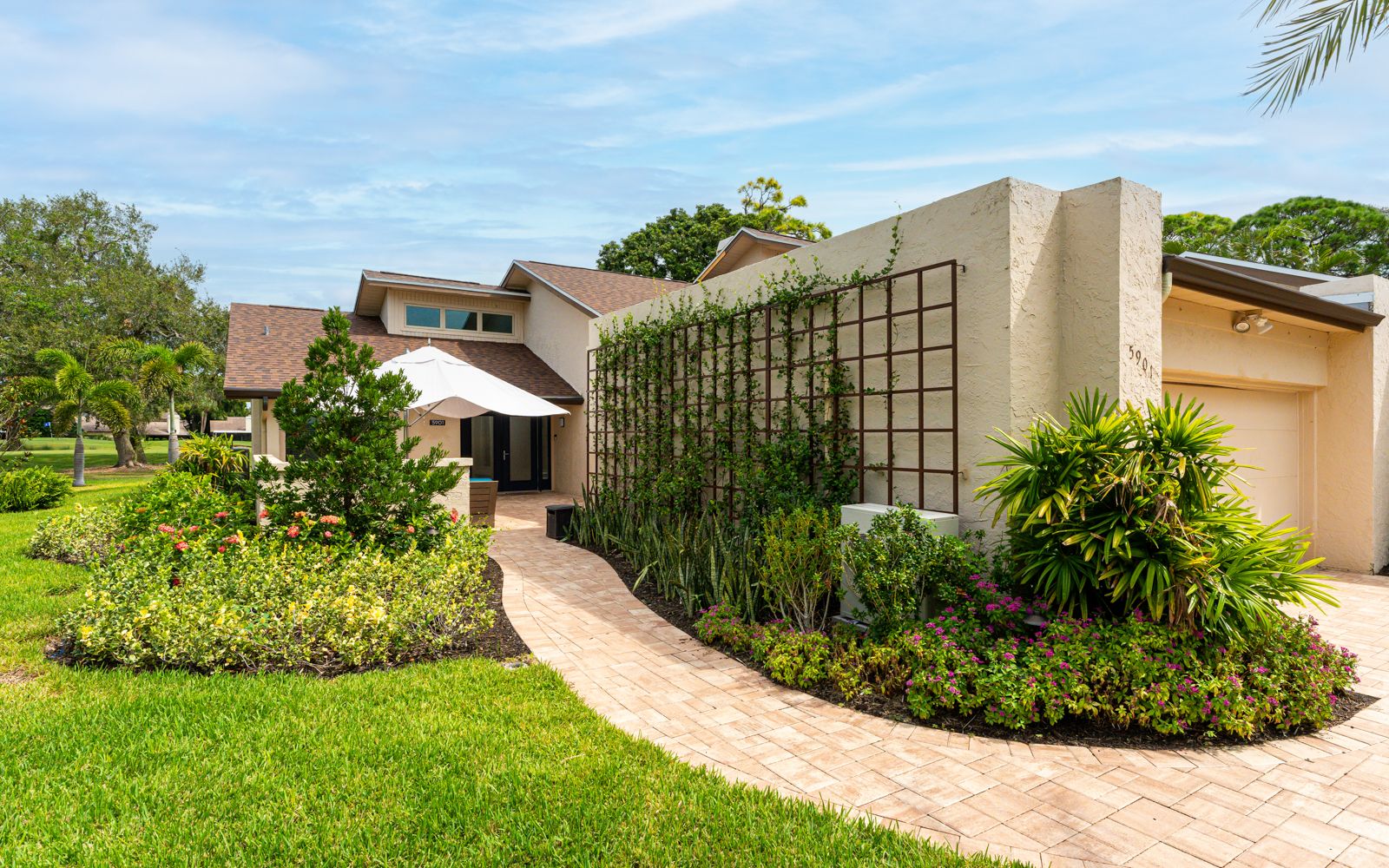 Exquisite, beautiful like new Coastal Contemporary condo villa located in the boutique community of The Fairways. This residence has been painstakingly renovated from top to bottom, inside and out. Upon entering, notice the new paver drive and walkway leading to the charming and spacious courtyard. Note the new Therma Tru front door. Once inside you'll love the natural light. the new imported Italian ceramic tile floors in the great room and throughout the residence. The soaring ceilings make this perfect for displaying your artwork. Also notice the new impact windows and sliders. From the great room move through to the Chef's kitchen with top-of-the-line state of the art appliances. Quartz counters complete the picture perfectly. From here step into the brand-new Florida Room/Office. Oversized windows bring in the outside overlooking the IMG golf course 17th tee. From here you'll enjoy the abundant wildlife that makes Florida special. Eagles, Sandhill Cranes, Osprey, Swans and the occasional River Outer are sighted daily. Both the primary and 2nd bedrooms are oversized, with completely new showers and quartz countertops. All doors are solid core.The air-conditioned garage is fantastic! New epoxy floor, newer LG refrigerator/freezer, stand-alone freezer and washer & drier, New AC, insulation, dry wall, electrical throughout the condo. The Fairways is the perfect location. IMG is 5 minutes, Anna Maria Island 15 minutes, and downtown Sarasota /Bradenton are 20 minutes away. New roof was installed Sept. 2023.