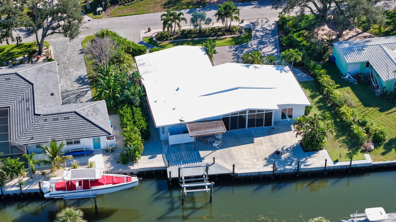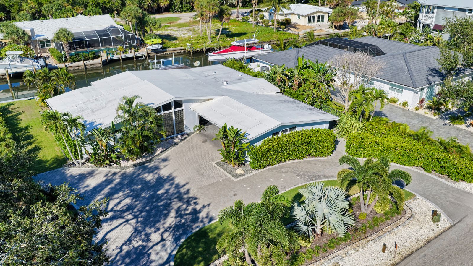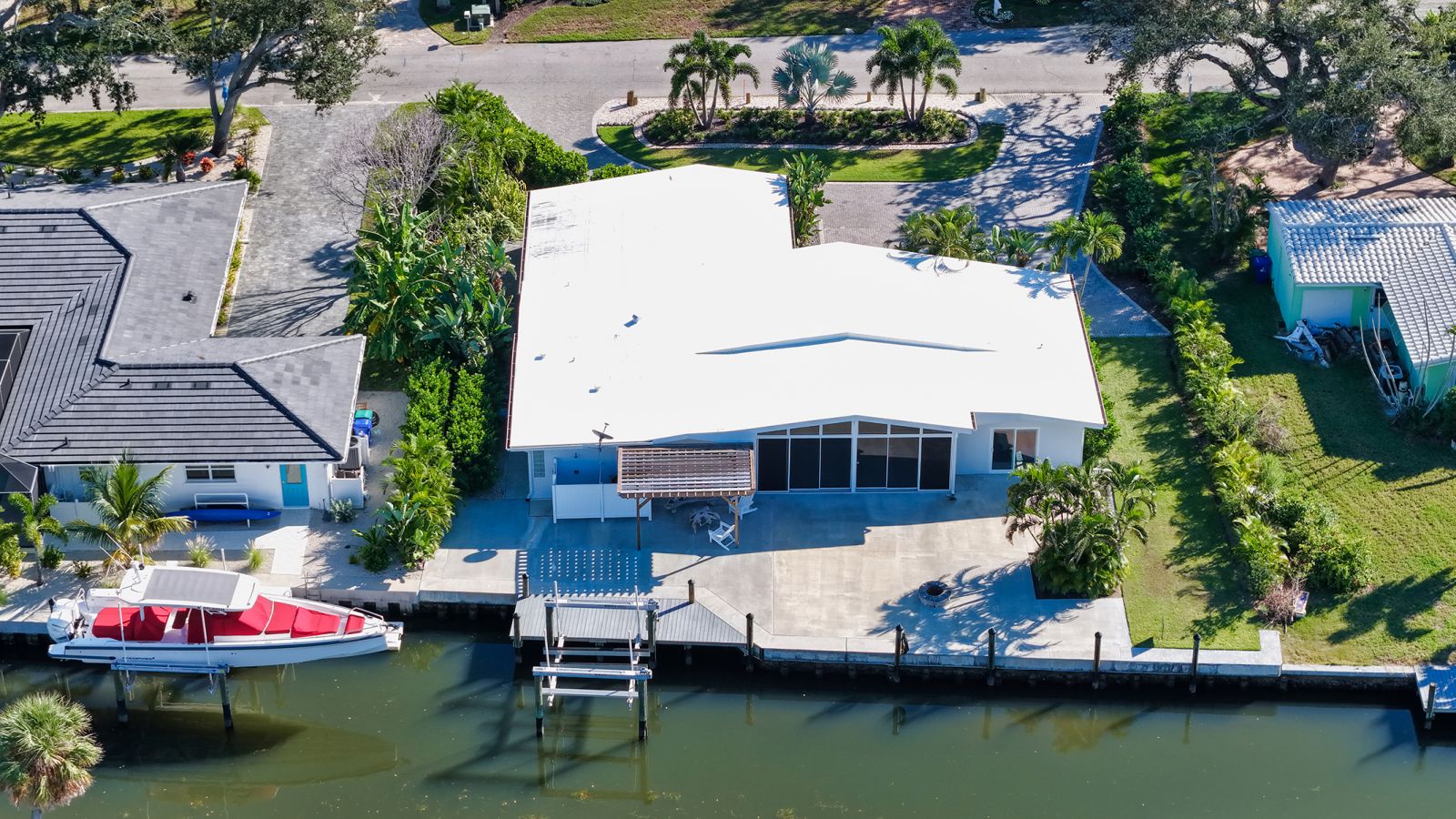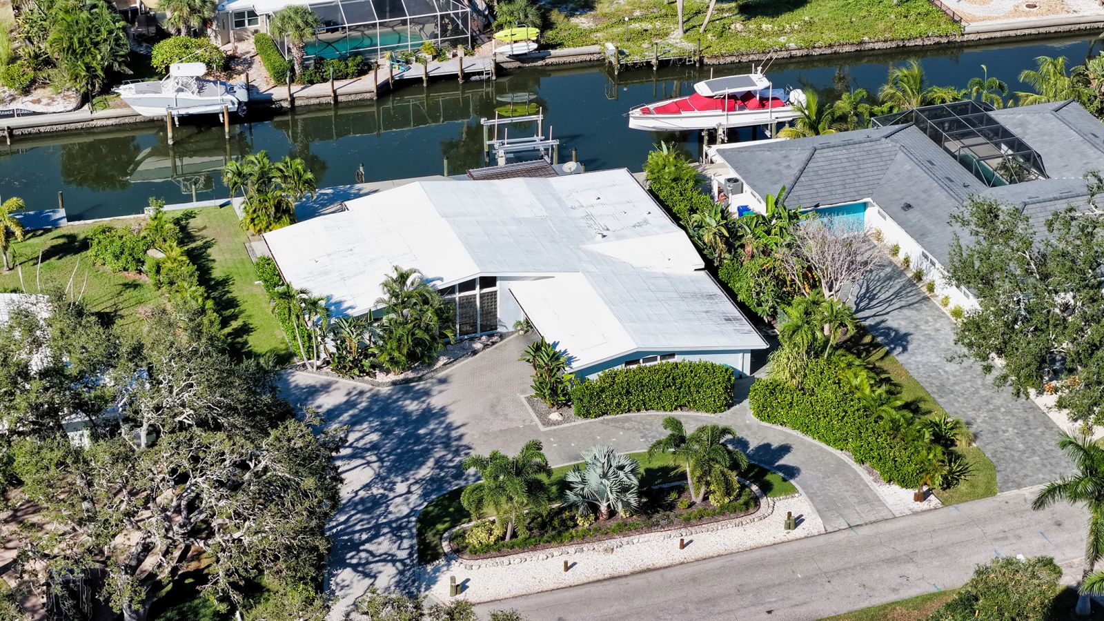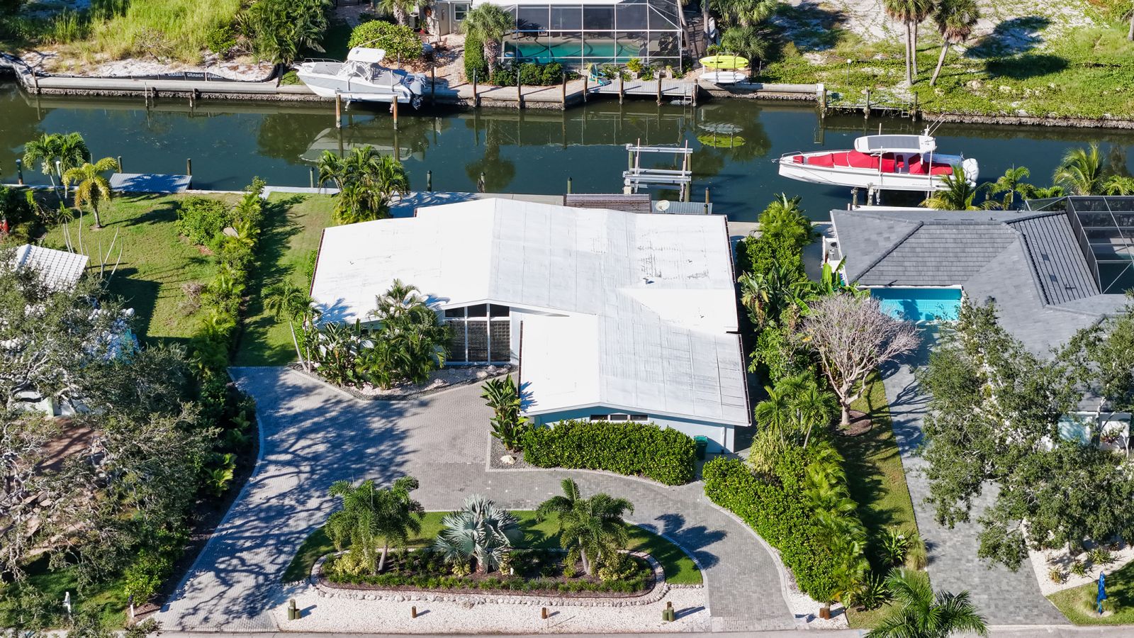 One or more photo(s) has been virtually staged. Welcome to an exceptional mid-century modern waterfront residence in Buttonwood Harbor, custom renovated from the ground up to deliver luxury coastal living. Situated on a deepwater canal with direct Gulf access, this 3-bedroom, 2-bath home offers timeless mid-century architecture, exceptional boating access, and thoughtfully integrated modern upgrades. Boaters will appreciate the private dock with a 13,000-pound boat lift, electricity, water, dock lighting, a raised seawall cap, and effortless navigation to open water. Inside, the open-concept layout centers on a spectacular chef's kitchen featuring custom shaker cabinetry, high-end appliances, a commercial-grade induction range with vent hood, wall oven, and an oversized quartzite island that anchors the space with elegance and functionality. Porcelain tile flows throughout the home, complementing the fresh interior and exterior finishes. The primary suite offers a spa-quality experience with a freestanding soaking tub, frameless glass walk-in shower, and dual vanities. Additional highlights include a new roof and HVAC system including new ductwork installed in 2020, a large laundry and utility room, a two-car garage, and a circular paver driveway. The outdoor living area is equally compelling, with tropical landscaping, a pergola, firepit, outdoor shower, and room to entertain. Located in one of Longboat Key's most desirable neighborhoods, the property offers access to a private boat ramp, fishing piers, beach access, and irrigation water through an optional $600 per year HOA. This is a rare opportunity to own a fully renovated waterfront home that delivers both immediate comfort and enduring value. Private showings available by appointment.