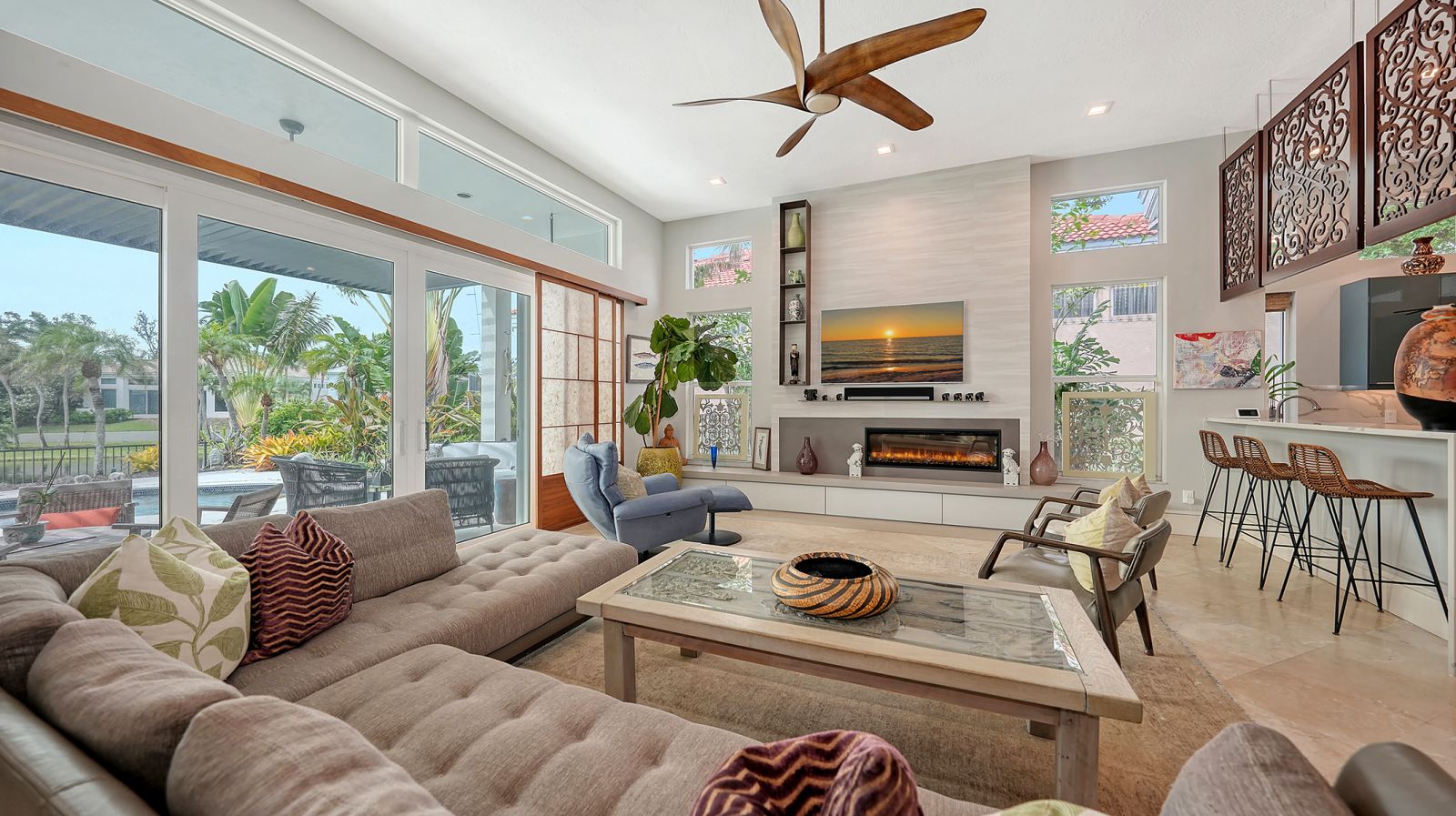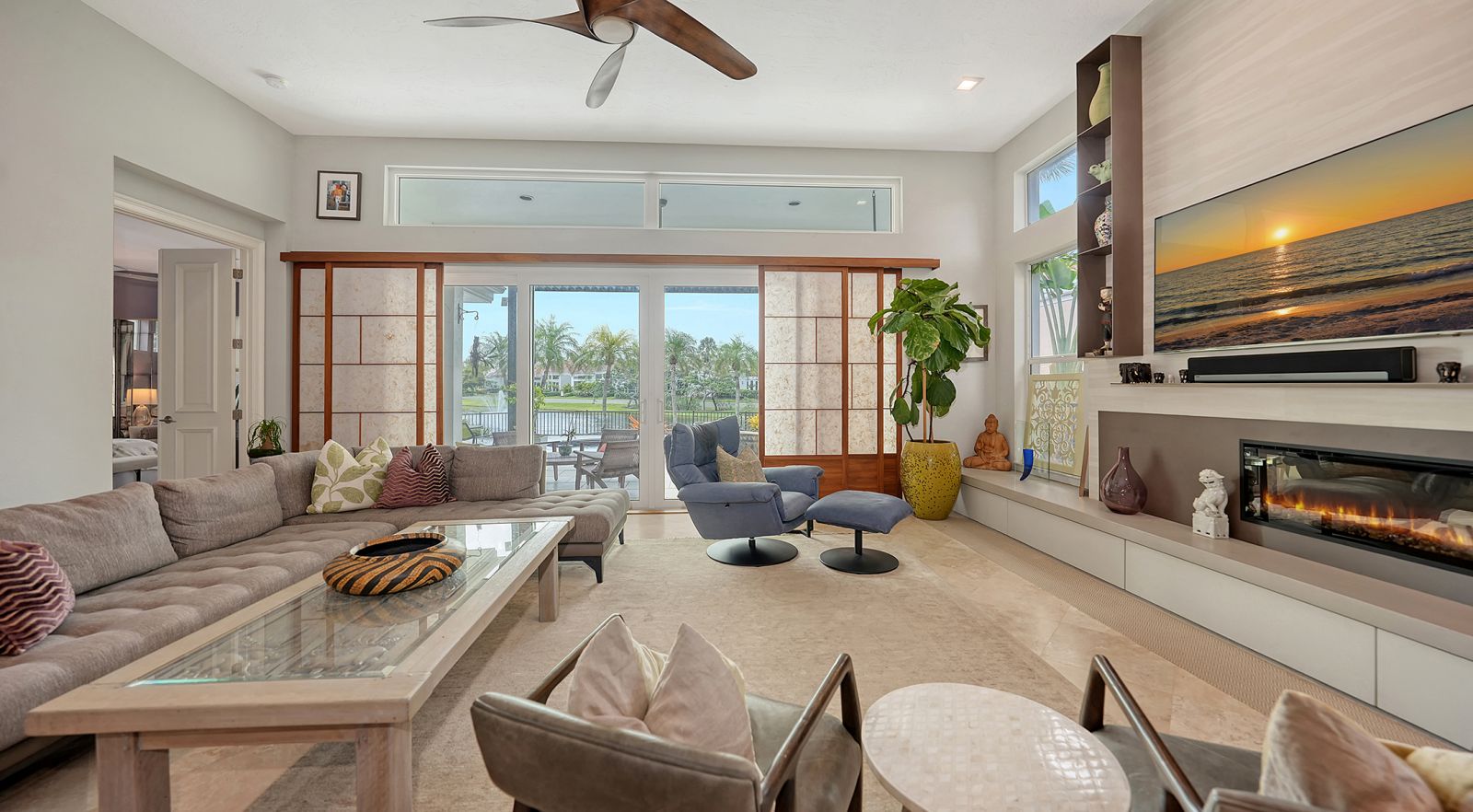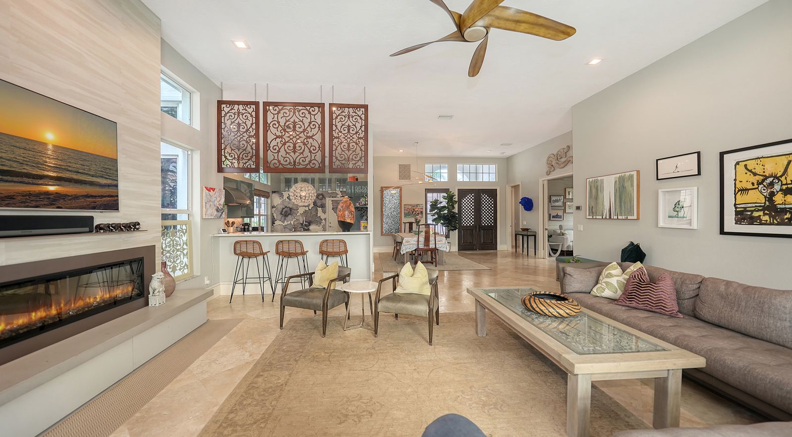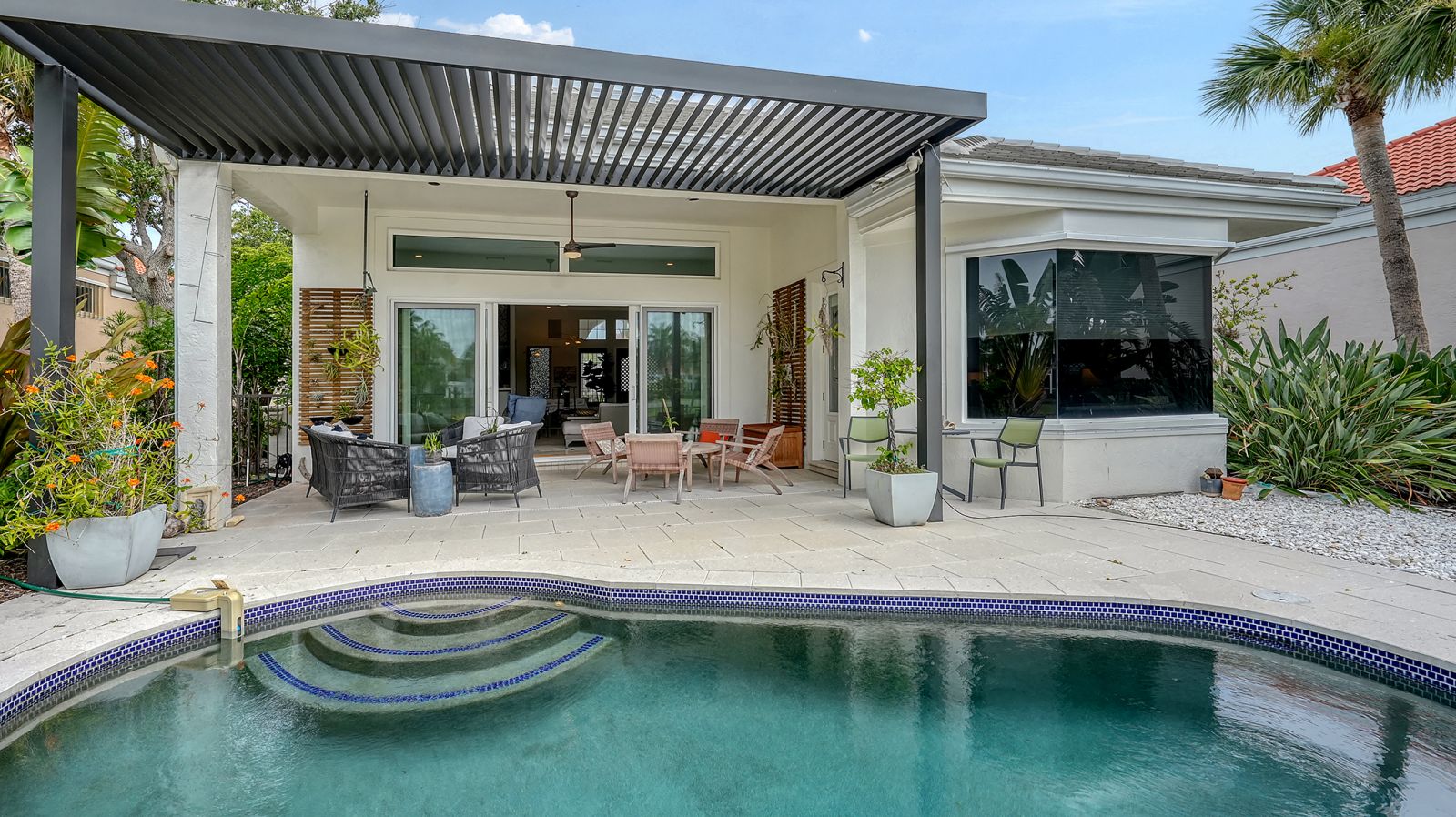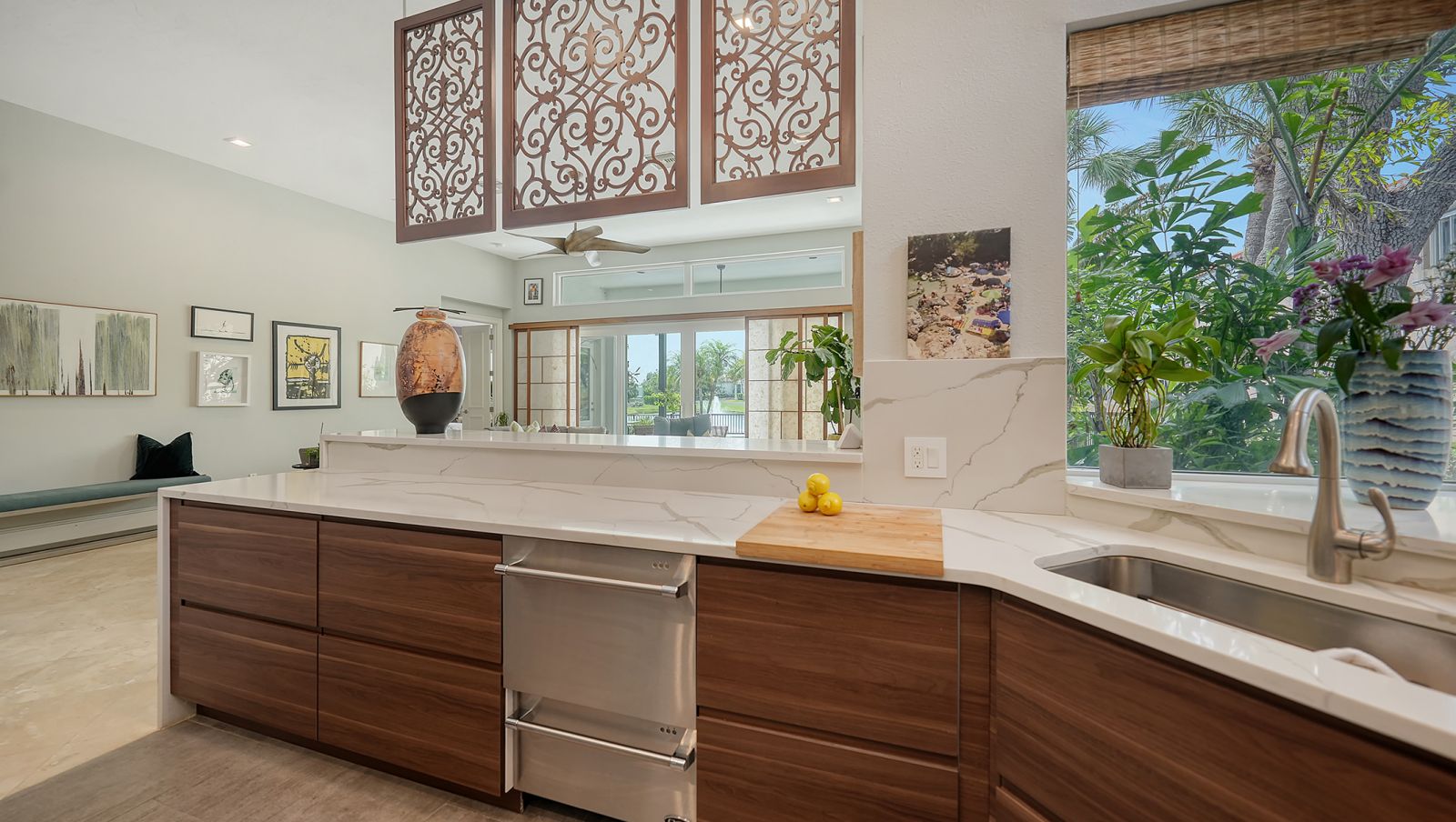 Welcome to an extraordinary transformation where sophisticated artistry meets modern urban luxury, elevating the serene prestige of Queens Harbour on Longboat Key. This impeccably reimagined 3-bedroom, 2-bath residence offers rare ambiance and refinement, seamlessly merging interior elegance with outdoor serenity. Custom shoji doors envelop hurricane-impact sliders, creating a glowing, intimate setting--perfect for alfresco evenings or savoring the sculptural stone fireplace within the great room. Soaring ceilings and curated niches showcase fine art and architectural detail, infusing the home with stylish warmth. Creamy textures--from hand-selected travertine underfoot to cascading quartz waterfall countertops--form a soothing, sophisticated backdrop. The chef-inspired kitchen is both beautiful and highly functional. An exotic wood island, hammered copper sink, and premium DCS stainless gas cooktop with built-in ovens evoke culinary artistry. Designer lighting illuminates the quartz surfaces, while the chic breakfast area--with its bespoke wall print--suggests an upscale Manhattan suite. Fisher & Paykel dishwasher drawers elevate entertaining, and the expansive breakfast bar invites guests to gather in effortless style. The luminous open plan flows to a formal dining room ideal for gracious hosting, all connected to the great room and tranquil Zen garden beyond. Oversized sliders dissolve the boundary between indoors and the lush backyard oasis, framing the serene pool like a living painting. The owners' suite is a sanctuary with generous proportions, a walk-in closet, a peaceful lounge/workspace, and private pool access overlooking the gentle pond. The primary bath is a masterpiece--dual vanities, refined finishes, and a two-person walk-in shower enclosed in seamless glass, creating a spa-like haven. The second ensuite bedroom is bathed in sunlight from a sweeping wall of windows and offers private bath access. Luxurious quartz, tile, and high-end fixtures provide understated refinement, with a spacious closet and nearby linen storage for guests. The third bedroom/den, currently styled as a chic office, easily converts to a guest suite. Custom built-ins set a sophisticated tone--ideal for unwinding after days at the nearby beaches. From its intricately carved double doors to its elevated fixtures and finishes, this home radiates warmth, craftsmanship, and refined coastal luxury. A complete 2018 renovation ensures comfort and peace of mind--move right in and begin living the easy, distinguished lifestyle that defines Queens Harbour and Longboat Key. Residents enjoy access to the Bay Isles Beach Club with BBQs, volleyball, covered pavilions, a private kitchen, and storage--perfect for sunset gatherings. Optional memberships at the renowned Longboat Key Club offer premier pickleball, tennis, 45 holes of championship golf, a deep-water marina, fine dining, spa, fitness center, and 10 miles of white-sand beach. Come live the dream.