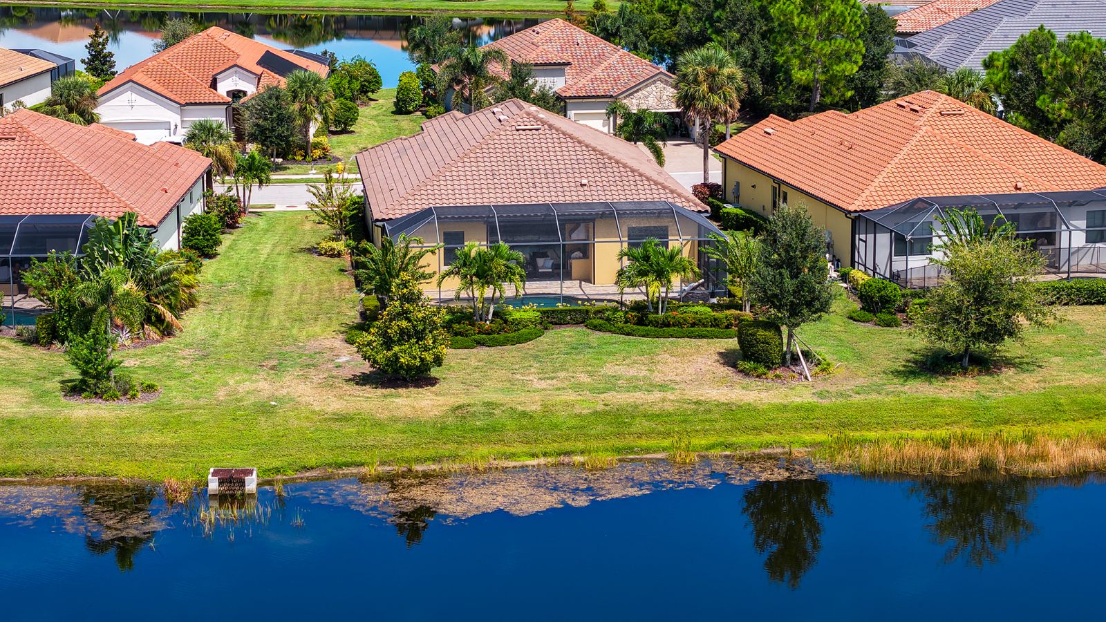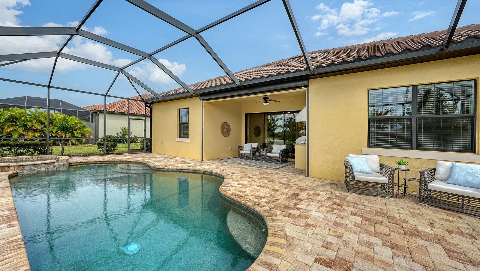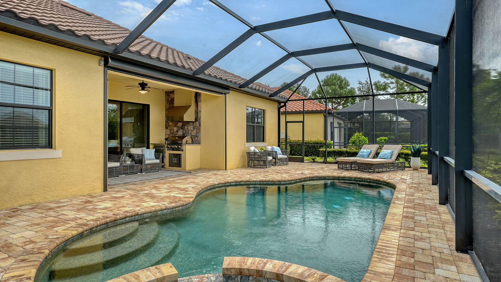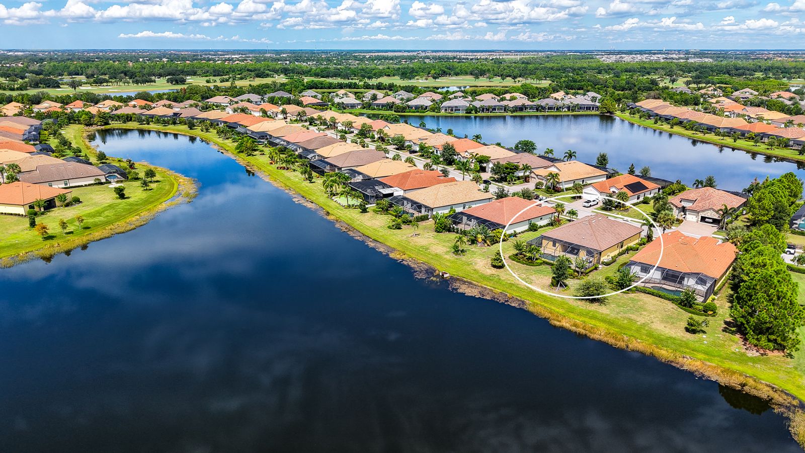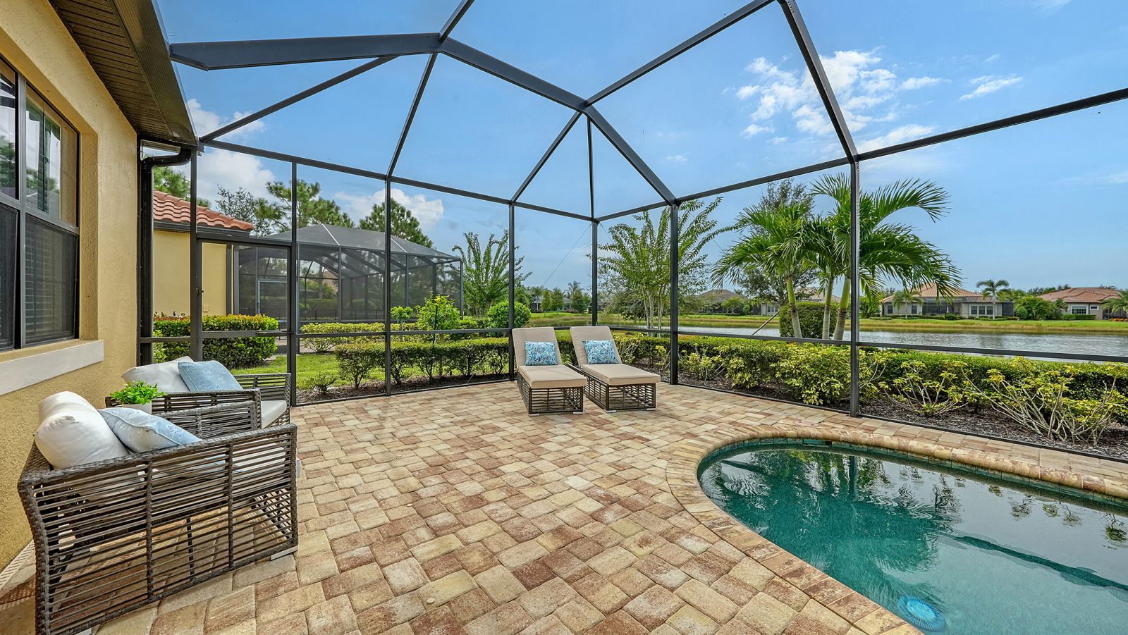 Under contract-accepting backup offers. Formerly a model home, this exquisite residence showcases hurricane impact glass windows and refined designer touches throughout, including custom molding and trim, detailed coffered ceilings, elegant lighting, and sophisticated wallpaper accents. Offered fully furnished, the home features four bedrooms, with a primary suite appointed with a soaking tub, frameless glass walk-in shower, double vanity and oversized walk-in closet. The kitchen, complete with a prep island, breakfast bar, sizable dinette space, pantry closet, gas cooktop, built-in oven and microwave, and stainless steel appliances, is complemented by an adjacent formal dining area. Designed for seamless indoor-outdoor living, sliders from the great room open to a screened lanai with an outdoor kitchen, heated pool and spa, tranquil lake views, and motorized hurricane roll-down shades for added comfort and protection. The residence also includes a spacious three-car garage, providing ample room for vehicles, storage, or a golf cart, along with a tankless water heater. Maintenance-free living enhances the appeal of this exceptional property, blending comfort and style in every detail. Residents of Country Club East enjoy gated security, The Retreat fitness and aquatic center, and convenient access to world-class shopping, dining, and recreation at Waterside Place, throughout Lakewood Ranch, and Sarasota. The community's ideal location offers a short drive to renowned Gulf Coast beaches, SRQ and Tampa airports, and top-tier medical facilities. Lakewood Ranch is recognized as the nation's number one best-selling multigenerational community, with optional membership available at Lakewood Ranch Golf and Country Club.