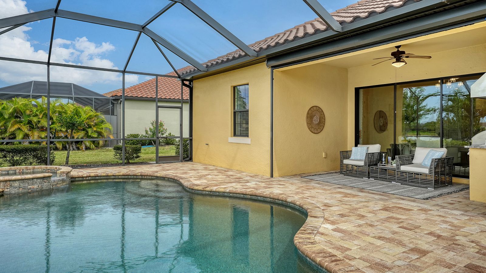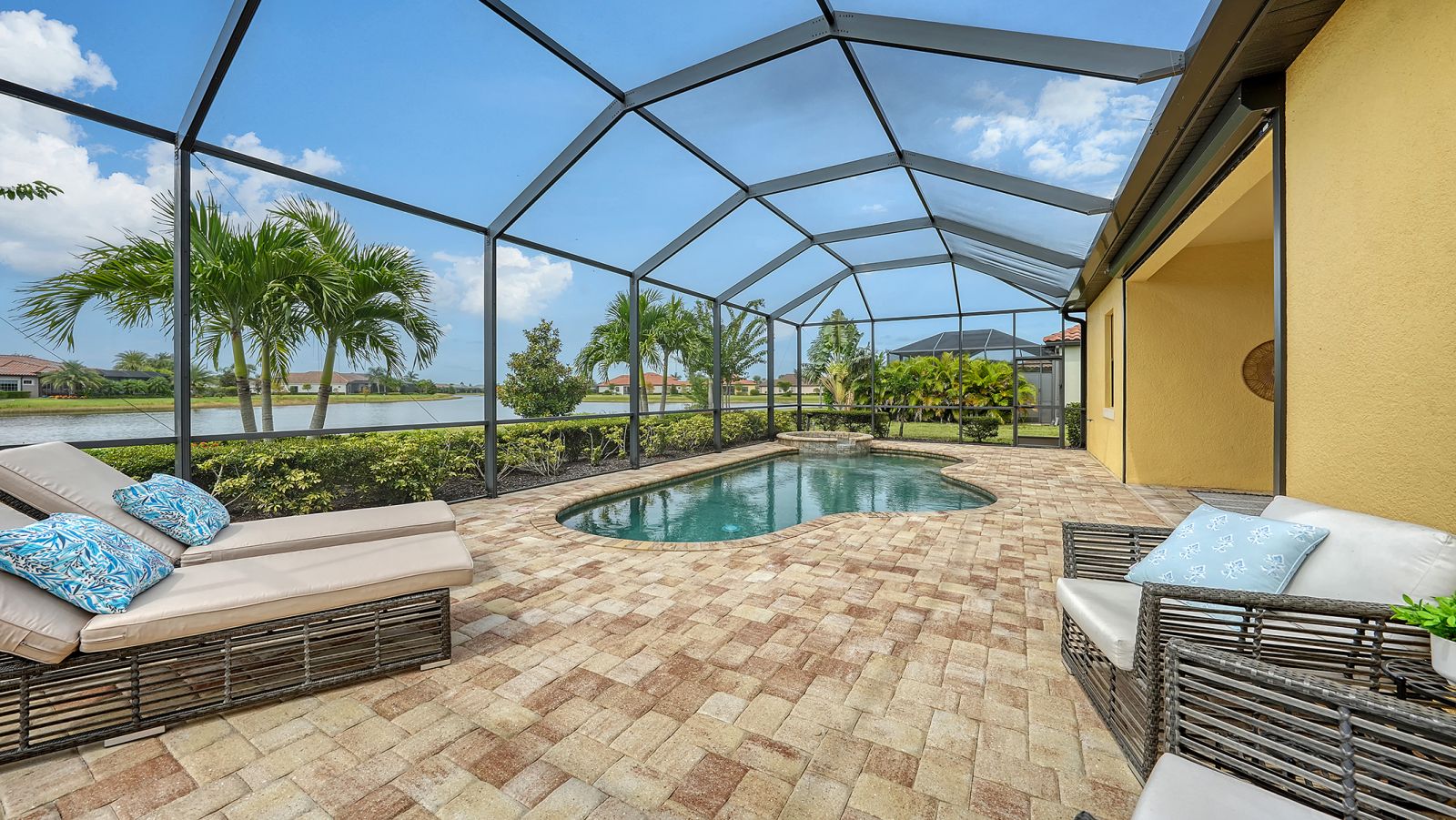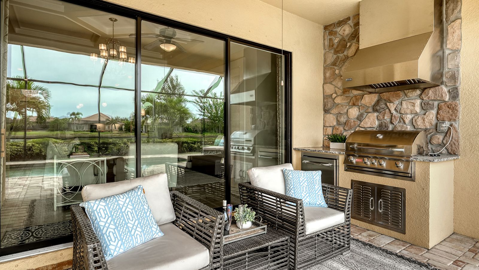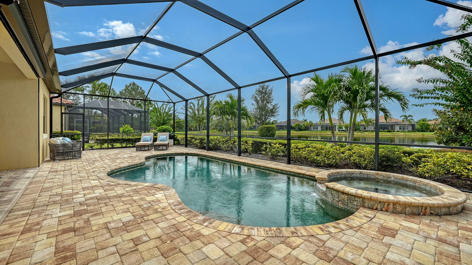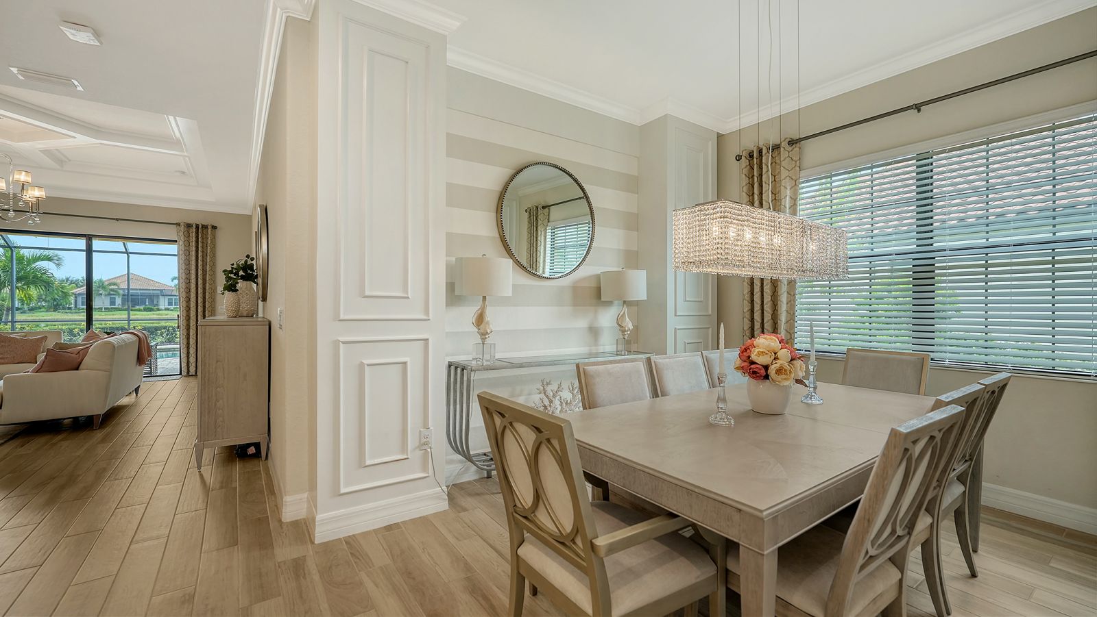 Under contract-accepting backup offers. Formerly a model home, this exquisite residence showcases hurricane impact glass windows and refined designer touches throughout, including custom molding and trim, detailed coffered ceilings, elegant lighting, and sophisticated wallpaper accents. Offered fully furnished, the home features four bedrooms, with a primary suite appointed with a soaking tub, frameless glass walk-in shower, double vanity and oversized walk-in closet. The kitchen, complete with a prep island, breakfast bar, sizable dinette space, pantry closet, gas cooktop, built-in oven and microwave, and stainless steel appliances, is complemented by an adjacent formal dining area. Designed for seamless indoor-outdoor living, sliders from the great room open to a screened lanai with an outdoor kitchen, heated pool and spa, tranquil lake views, and motorized hurricane roll-down shades for added comfort and protection. The residence also includes a spacious three-car garage, providing ample room for vehicles, storage, or a golf cart, along with a tankless water heater. Maintenance-free living enhances the appeal of this exceptional property, blending comfort and style in every detail. Residents of Country Club East enjoy gated security, The Retreat fitness and aquatic center, and convenient access to world-class shopping, dining, and recreation at Waterside Place, throughout Lakewood Ranch, and Sarasota. The community's ideal location offers a short drive to renowned Gulf Coast beaches, SRQ and Tampa airports, and top-tier medical facilities. Lakewood Ranch is recognized as the nation's number one best-selling multigenerational community, with optional membership available at Lakewood Ranch Golf and Country Club.