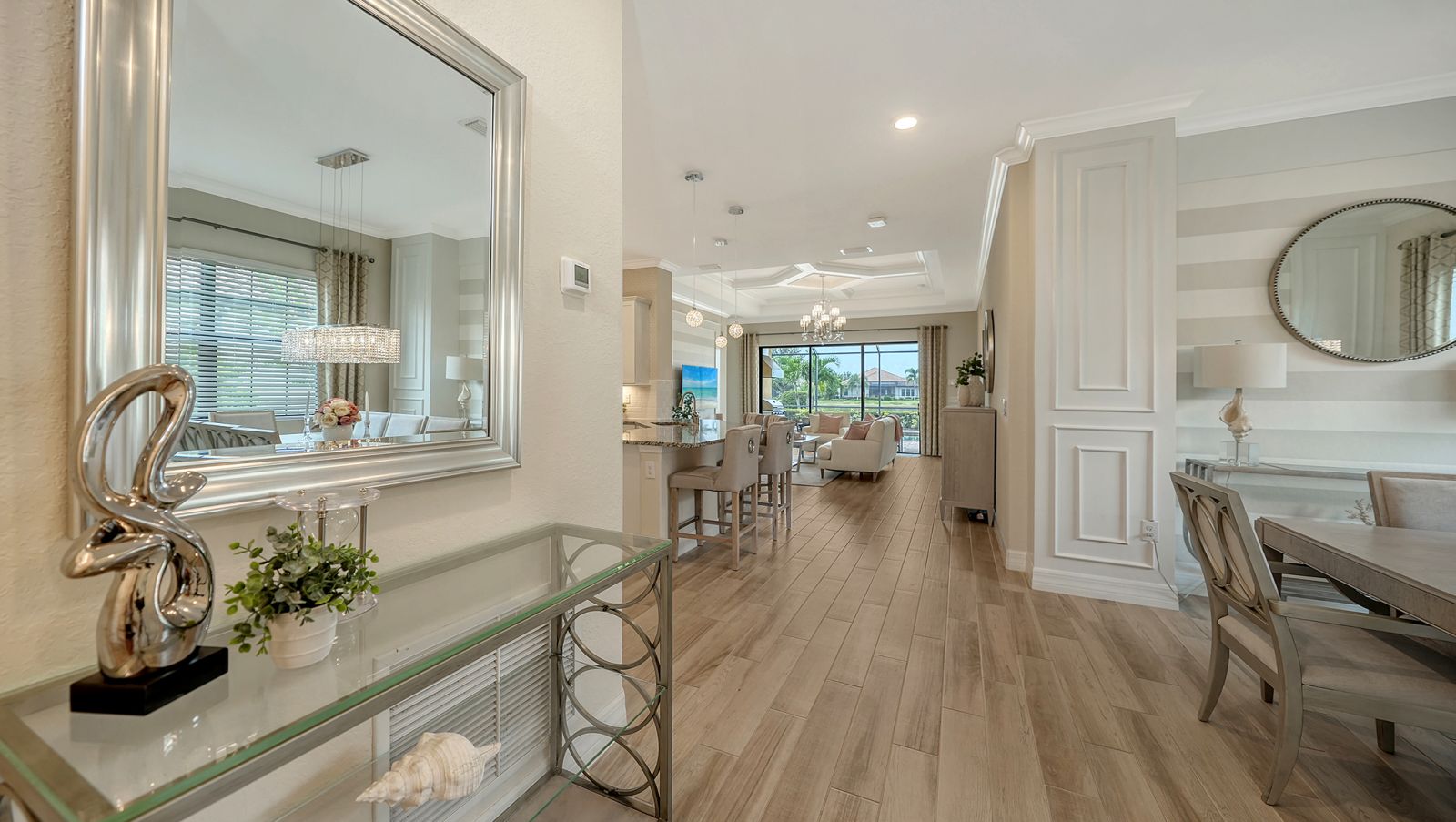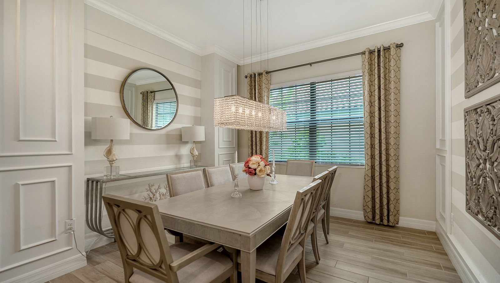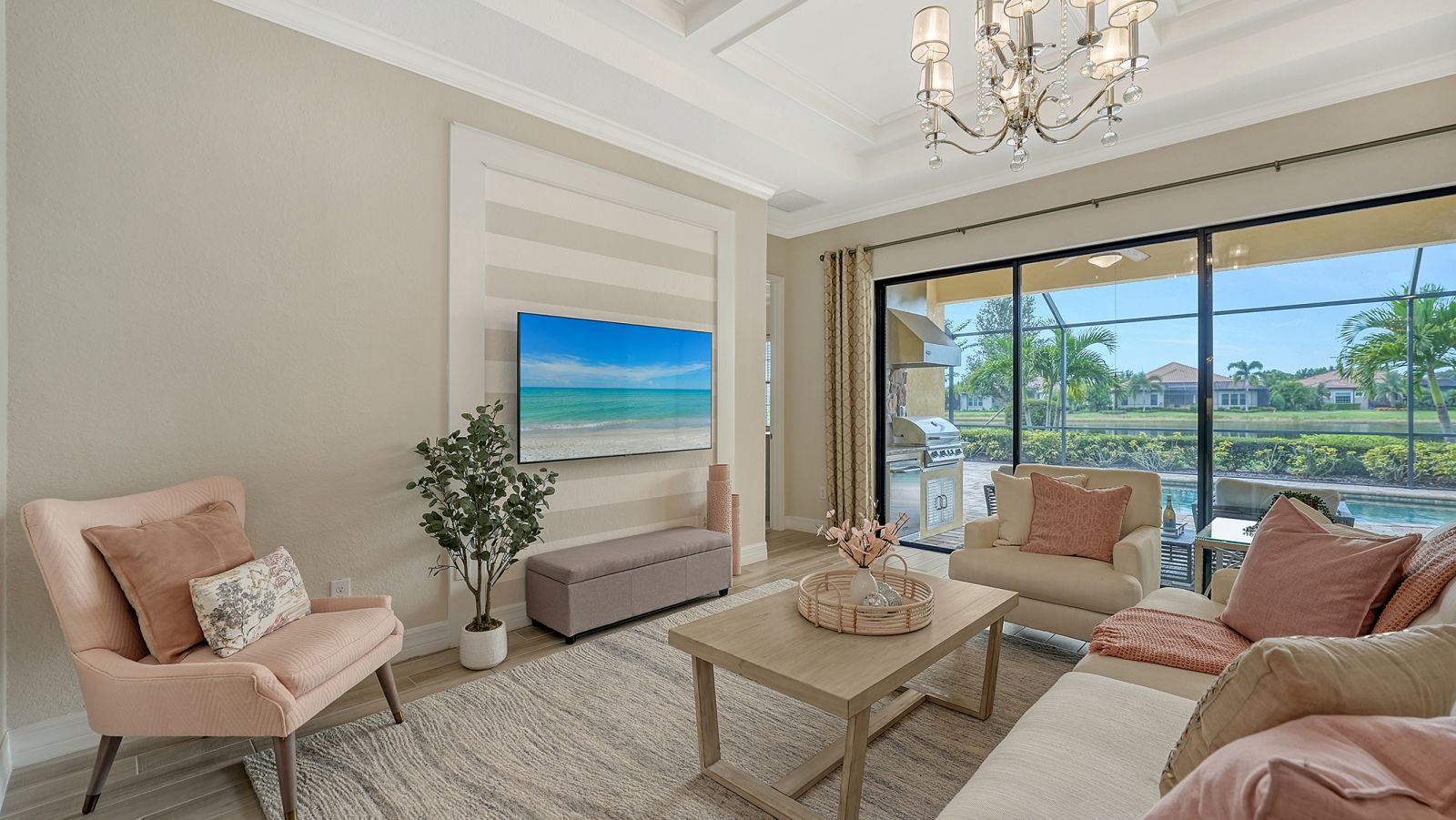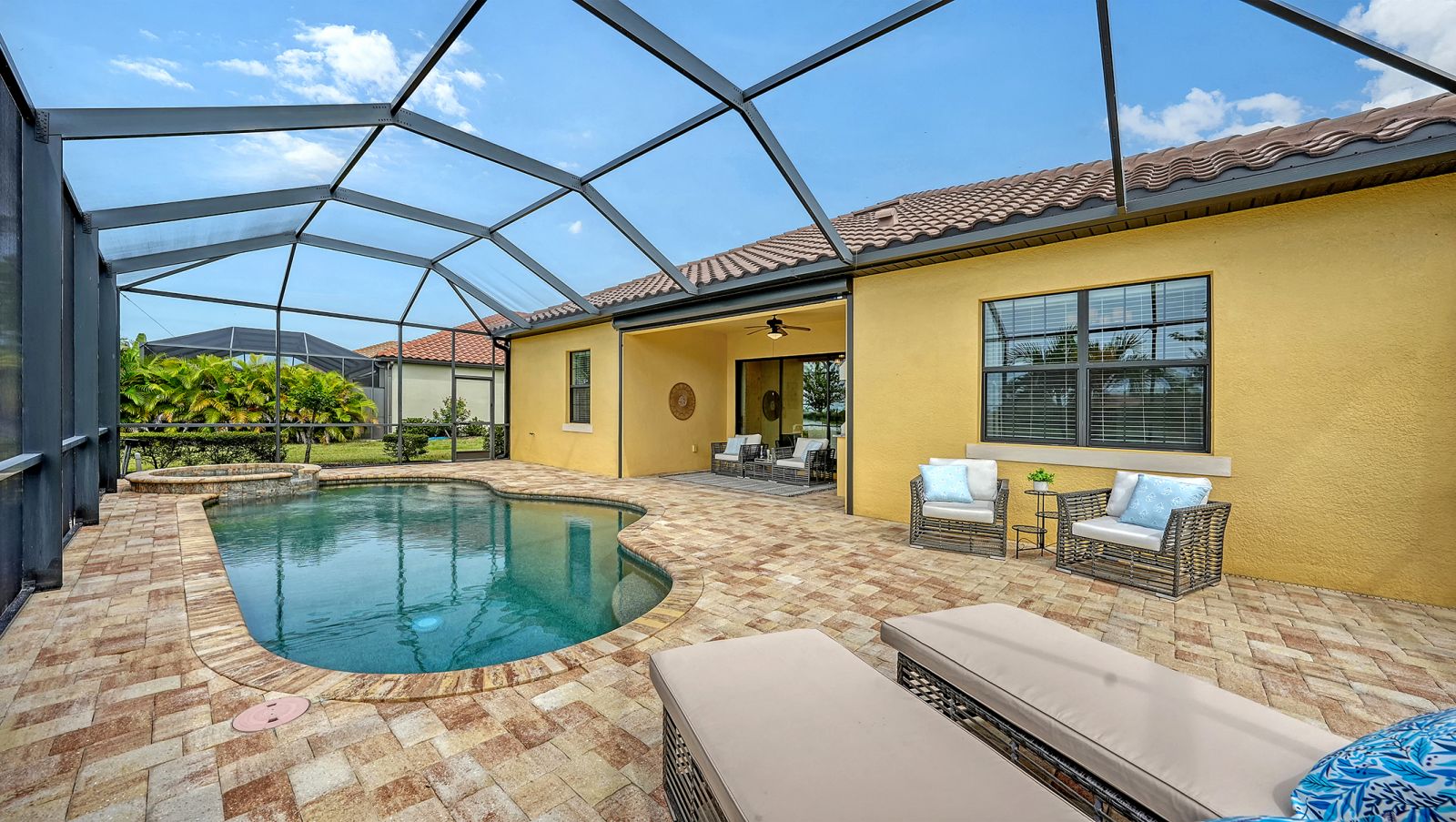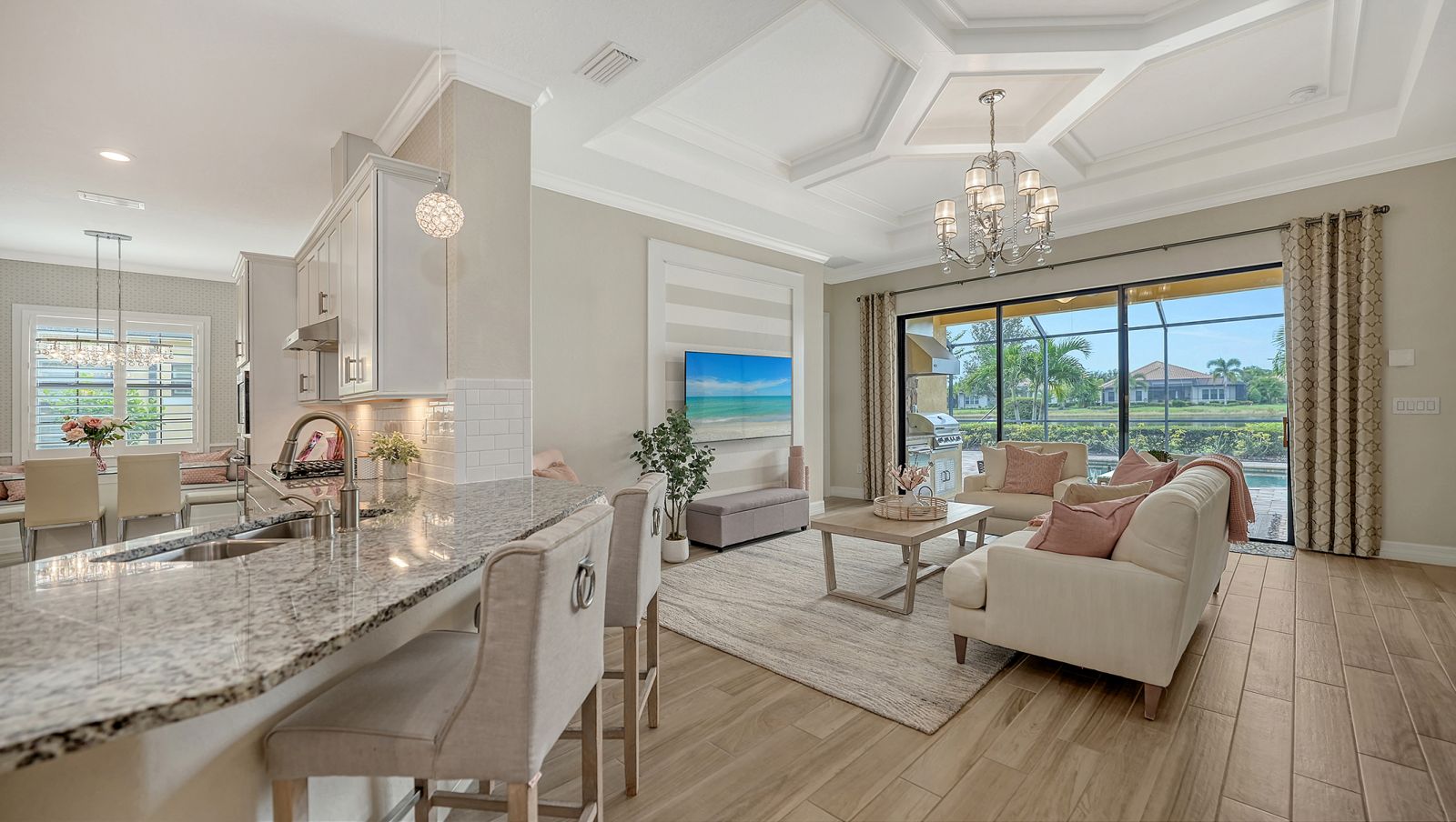 Under contract-accepting backup offers. Formerly a model home, this exquisite residence showcases hurricane impact glass windows and refined designer touches throughout, including custom molding and trim, detailed coffered ceilings, elegant lighting, and sophisticated wallpaper accents. Offered fully furnished, the home features four bedrooms, with a primary suite appointed with a soaking tub, frameless glass walk-in shower, double vanity and oversized walk-in closet. The kitchen, complete with a prep island, breakfast bar, sizable dinette space, pantry closet, gas cooktop, built-in oven and microwave, and stainless steel appliances, is complemented by an adjacent formal dining area. Designed for seamless indoor-outdoor living, sliders from the great room open to a screened lanai with an outdoor kitchen, heated pool and spa, tranquil lake views, and motorized hurricane roll-down shades for added comfort and protection. The residence also includes a spacious three-car garage, providing ample room for vehicles, storage, or a golf cart, along with a tankless water heater. Maintenance-free living enhances the appeal of this exceptional property, blending comfort and style in every detail. Residents of Country Club East enjoy gated security, The Retreat fitness and aquatic center, and convenient access to world-class shopping, dining, and recreation at Waterside Place, throughout Lakewood Ranch, and Sarasota. The community's ideal location offers a short drive to renowned Gulf Coast beaches, SRQ and Tampa airports, and top-tier medical facilities. Lakewood Ranch is recognized as the nation's number one best-selling multigenerational community, with optional membership available at Lakewood Ranch Golf and Country Club.