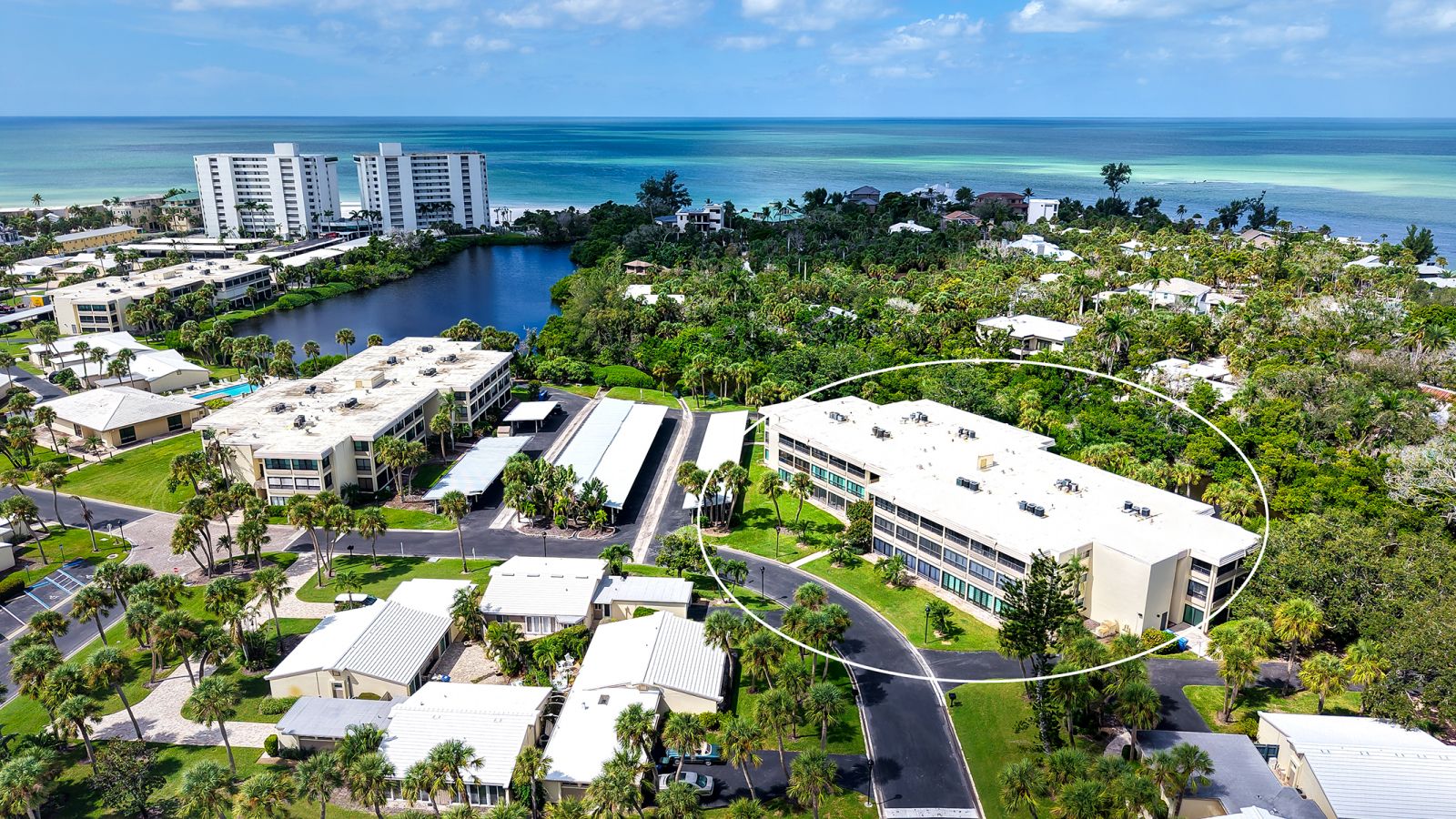One or more photo(s) has been virtually staged. Welcome to this RARE, 2 bed/2 bath, double lanai corner residence with peaceful lagoon views in the premiere Gulf front property of Whispering Sands! Nestled in the desirable Sunset House building, this freshly painted, updated unit offers a quiet, private setting, with serene views of lush landscaping and the shimmering lagoon with its abundant fish, turtles, and aquatic life. A wonderful entry hall leads into a spacious OPEN CONCEPT floor plan, where the kitchen, living and dining areas flow together to create a wonderful, flexible gathering space. The living space has been extended into what was originally an enclosed 24' x 7' lanai, resulting in the creation of additional valuable interior living space under air, flanked on all sides with floor to ceiling sliders. Sliders open into a private, sunny brick paver patio, perfect for grilling, gardening, or simply relaxing in the surrounding natural beauty. You'll enjoy hosting friends and family in your NEW 2025 kitchen featuring granite countertops, LG stainless appliances, soft-close cabinetry, tile backsplash, breakfast bar, & tray ceiling. The primary and guest bedrooms each include a set of charming French doors that open into the tiled, screened and glassed lanai with direct views into the lagoon. Updated in 2024, both bathrooms include new granite countertops, soft close vanities & fixtures, and recessed lighting. All of the sliders in this unit are Miami Dade hurricane impact rated. 2024 HVAC system. 2025 water heater. Whispering Sands is a 55+ Gulf front community ideally situated just steps to the colorful shops & restaurants of Siesta Key Village offering two heated pools, clubhouse with catering kitchen and fitness rooms currently undergoing complete remodeling, canoe/kayak storage, beachside Tiki Hut & grills, and 800' of its own beach access on the Gulf! Thoughtfully updated, inviting, and perfectly private, this peaceful corner retreat offers the perfect blend of indoor/outdoor living on beautiful Siesta Key.