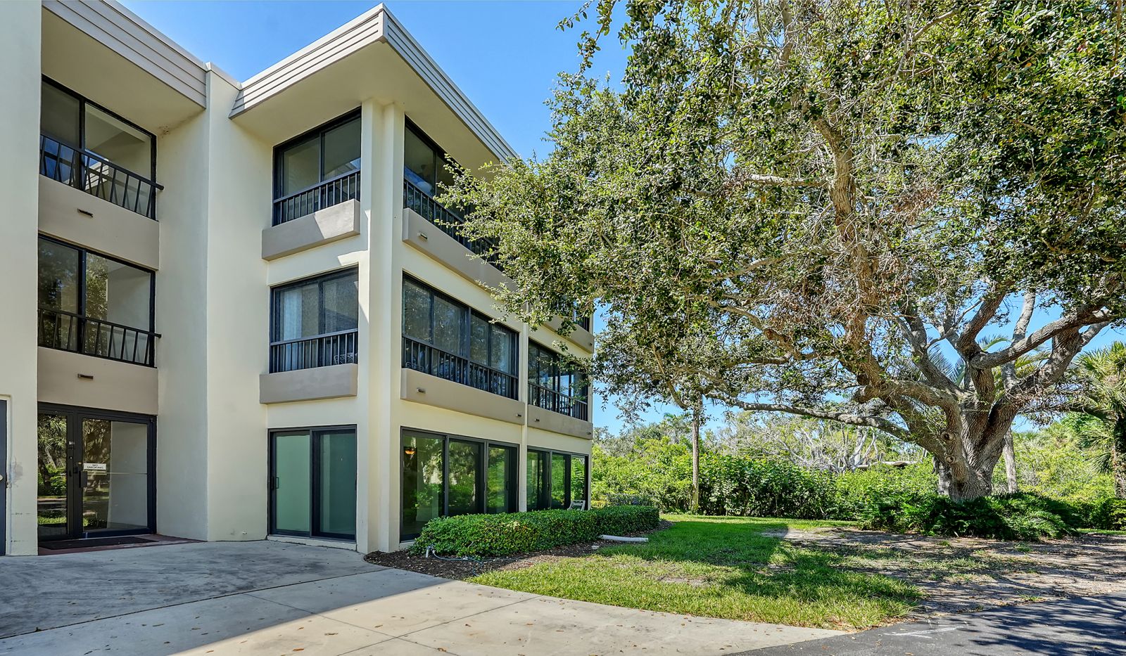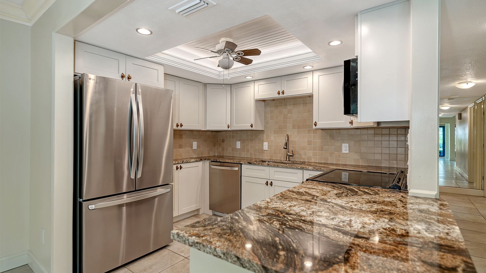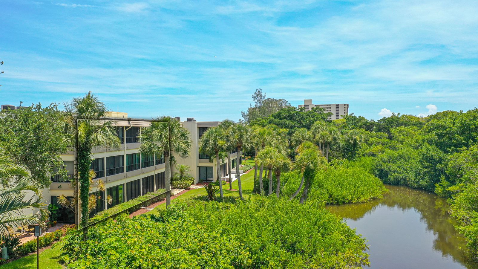 One or more photo(s) has been virtually staged. Welcome to this RARE, 2 bed/2 bath, double lanai corner residence with peaceful lagoon views in the premiere Gulf front property of Whispering Sands! Nestled in the desirable Sunset House building, this freshly painted, updated unit offers a quiet, private setting, with serene views of lush landscaping and the shimmering lagoon with its abundant fish, turtles, and aquatic life. A wonderful entry hall leads into a spacious OPEN CONCEPT floor plan, where the kitchen, living and dining areas flow together to create a wonderful, flexible gathering space. The living space has been extended into what was originally an enclosed 24' x 7' lanai, resulting in the creation of additional valuable interior living space under air, flanked on all sides with floor to ceiling sliders. Sliders open into a private, sunny brick paver patio, perfect for grilling, gardening, or simply relaxing in the surrounding natural beauty. You'll enjoy hosting friends and family in your NEW 2025 kitchen featuring granite countertops, LG stainless appliances, soft-close cabinetry, tile backsplash, breakfast bar, & tray ceiling. The primary and guest bedrooms each include a set of charming French doors that open into the tiled, screened and glassed lanai with direct views into the lagoon. Updated in 2024, both bathrooms include new granite countertops, soft close vanities & fixtures, and recessed lighting. All of the sliders in this unit are Miami Dade hurricane impact rated. 2024 HVAC system. 2025 water heater. Whispering Sands is a 55+ Gulf front community ideally situated just steps to the colorful shops & restaurants of Siesta Key Village offering two heated pools, clubhouse with catering kitchen and fitness rooms currently undergoing complete remodeling, canoe/kayak storage, beachside Tiki Hut & grills, and 800' of its own beach access on the Gulf! Thoughtfully updated, inviting, and perfectly private, this peaceful corner retreat offers the perfect blend of indoor/outdoor living on beautiful Siesta Key.