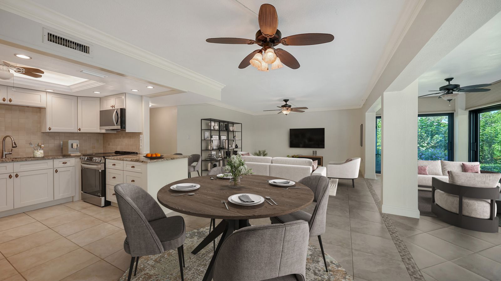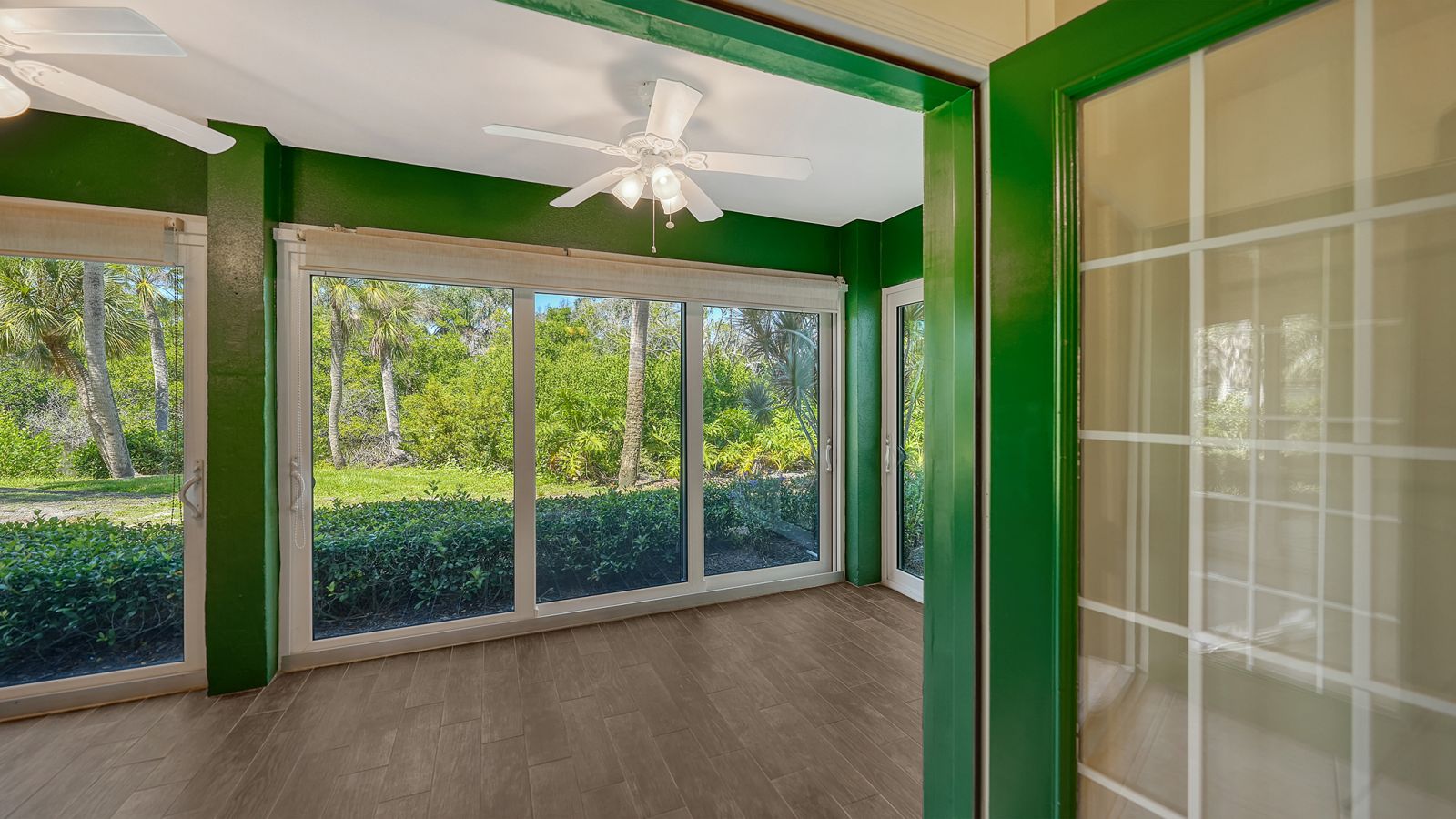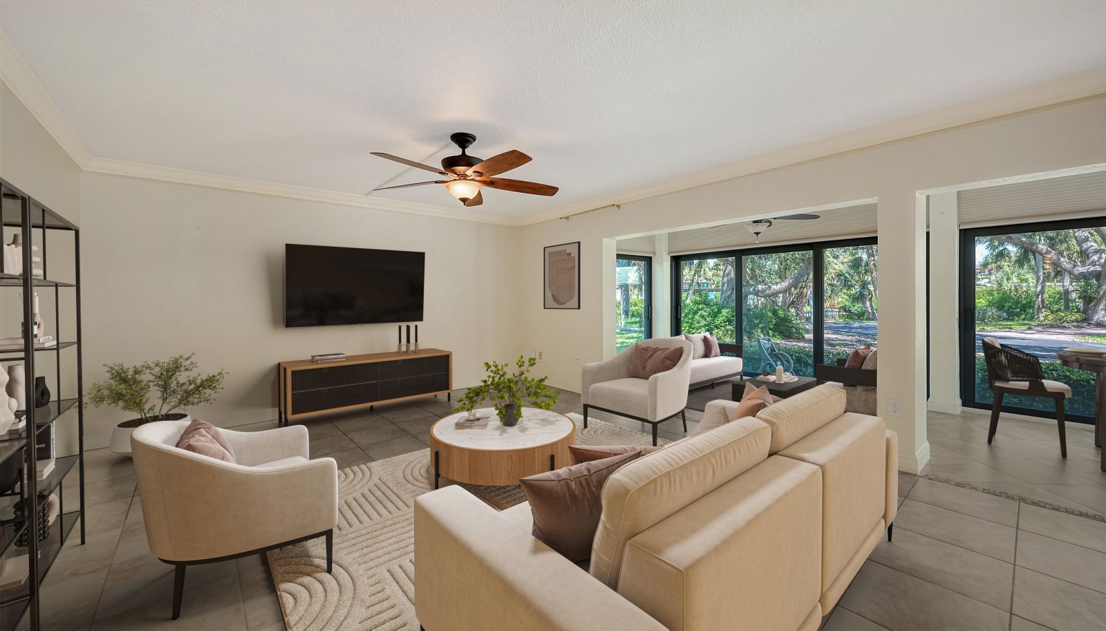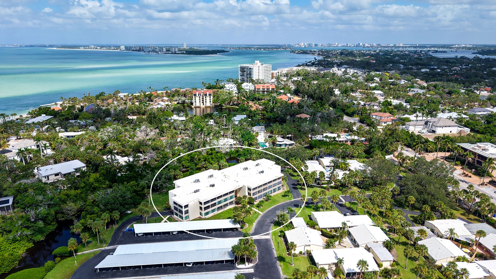 One or more photo(s) has been virtually staged. Welcome to this RARE, 2 bed/2 bath, double lanai corner residence with peaceful lagoon views in the premiere Gulf front property of Whispering Sands! Nestled in the desirable Sunset House building, this freshly painted, updated unit offers a quiet, private setting, with serene views of lush landscaping and the shimmering lagoon with its abundant fish, turtles, and aquatic life. A wonderful entry hall leads into a spacious OPEN CONCEPT floor plan, where the kitchen, living and dining areas flow together to create a wonderful, flexible gathering space. The living space has been extended into what was originally an enclosed 24' x 7' lanai, resulting in the creation of additional valuable interior living space under air, flanked on all sides with floor to ceiling sliders. Sliders open into a private, sunny brick paver patio, perfect for grilling, gardening, or simply relaxing in the surrounding natural beauty. You'll enjoy hosting friends and family in your NEW 2025 kitchen featuring granite countertops, LG stainless appliances, soft-close cabinetry, tile backsplash, breakfast bar, & tray ceiling. The primary and guest bedrooms each include a set of charming French doors that open into the tiled, screened and glassed lanai with direct views into the lagoon. Updated in 2024, both bathrooms include new granite countertops, soft close vanities & fixtures, and recessed lighting. All of the sliders in this unit are Miami Dade hurricane impact rated. 2024 HVAC system. 2025 water heater. Whispering Sands is a 55+ Gulf front community ideally situated just steps to the colorful shops & restaurants of Siesta Key Village offering two heated pools, clubhouse with catering kitchen and fitness rooms currently undergoing complete remodeling, canoe/kayak storage, beachside Tiki Hut & grills, and 800' of its own beach access on the Gulf! Thoughtfully updated, inviting, and perfectly private, this peaceful corner retreat offers the perfect blend of indoor/outdoor living on beautiful Siesta Key.