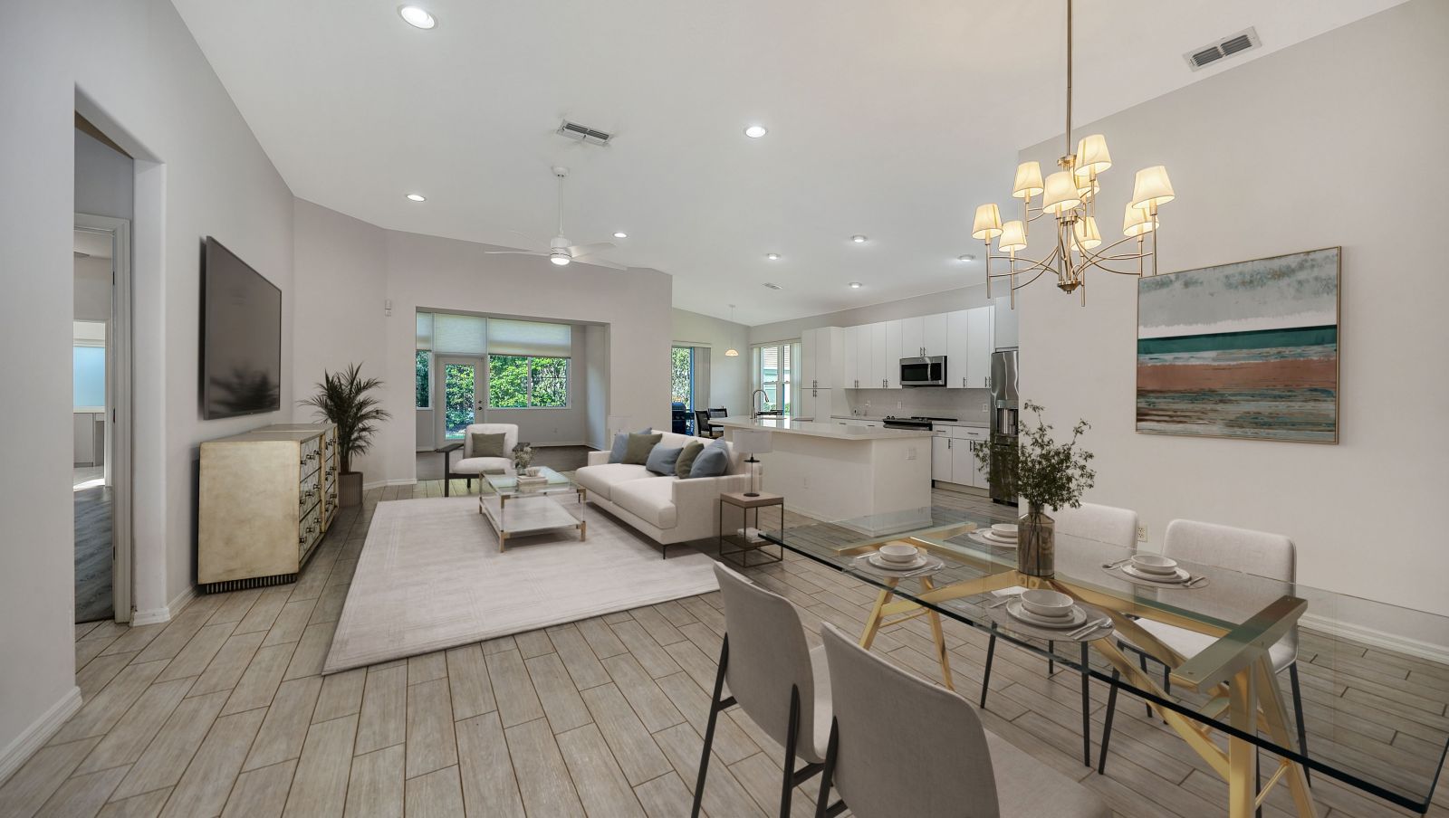 One or more photos are staged. Perfectly nestled in the peaceful, maintenance-free community of Edgewater Cove - an exclusive enclave of Edgewater Village - this modernized updated 1,928-square-foot home offers a harmonious blend of comfort, contemporary living, and the allure of natural surroundings. The property is enveloped by the scenic splendor of Lake Uihlein, affording residents access to a gated community perfect for kayaking, walking, and outdoor recreation. The home features a luminous, open-concept layout encompassing three bedrooms, two renovated bathrooms, and a versatile bonus room with an array of recent updates. The third bedroom is currently configured as a den yet functions seamlessly as a third bedroom. From the moment you enter, you will notice the appealing natural tones that extend through the spacious living areas. The recently renovated kitchen is truly the focal point of the home, appointed with premium quartz countertops, soft-close cabinetry, and sleek stainless-steel appliances--designed for both function and beauty. Enjoy morning coffee in the screened-in lanai just off the charming breakfast nook. A versatile bonus room distinguished by large windows brings in abundant natural light and enhances the open, airy feel, all while offering backyard vistas. Retreat to the generously sized primary suite with brand-new flooring, a walk-in closet, and an updated en-suite bathroom featuring dual vanities, premium surfaces, and a walk-in shower. The split layout ensures privacy with two guest rooms and a second updated bath thoughtfully positioned for family or guests. Additional highlights include: a new roof (2023), new washer and dryer, high ceilings, a two-car garage, and a well-appointed laundry room with open shelving and a utility sink. Edgewater Cove residents enjoy resort-style amenities including a clubhouse, heated pool and spa, a fishing pier, a scenic gazebo and walking distance to the Lakewood Ranch Athletic club. Just minutes from Lakewood Ranch Main Street, Waterside Place, UTC Mall, top-rated golf, tennis, dining, and healthcare--this home captures the essence of Florida living - convenient and serene.