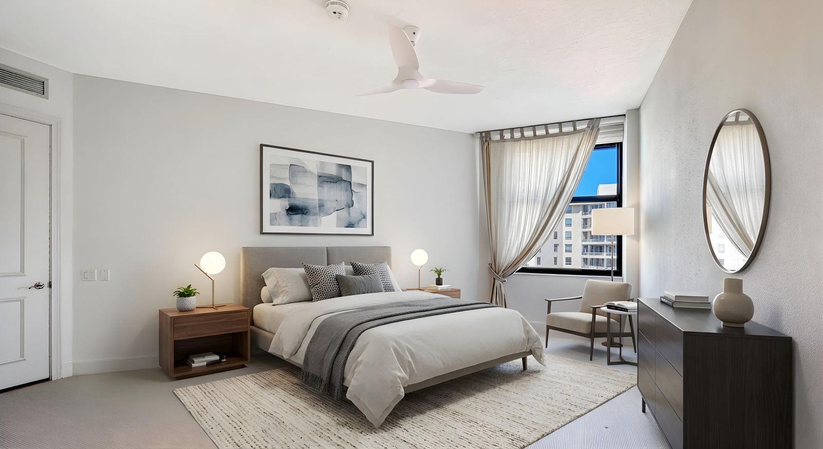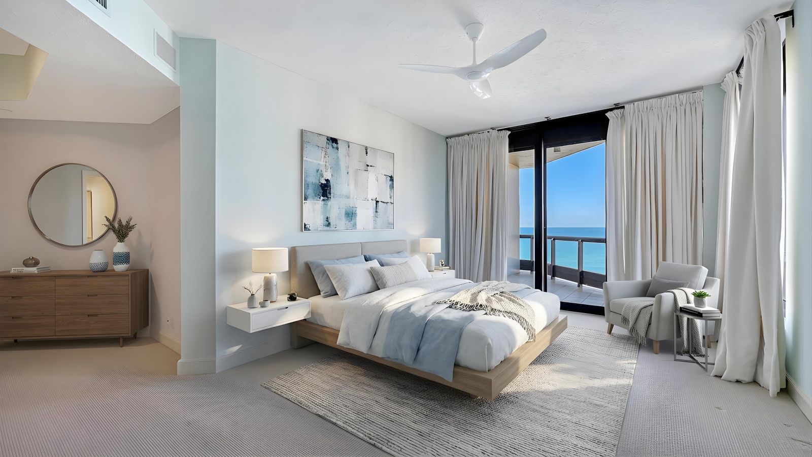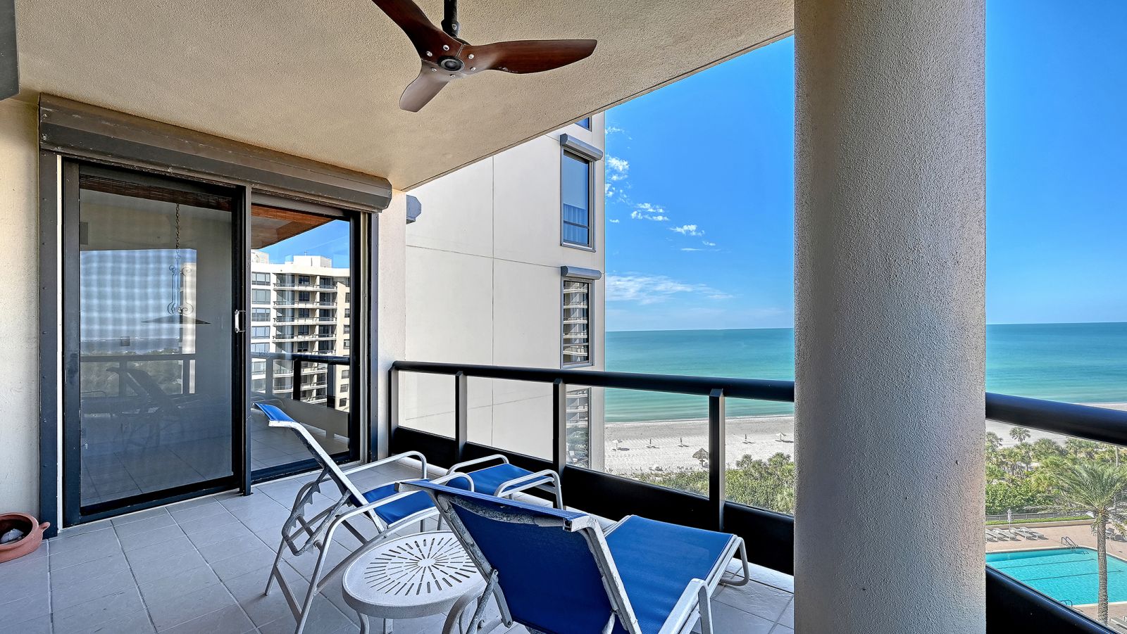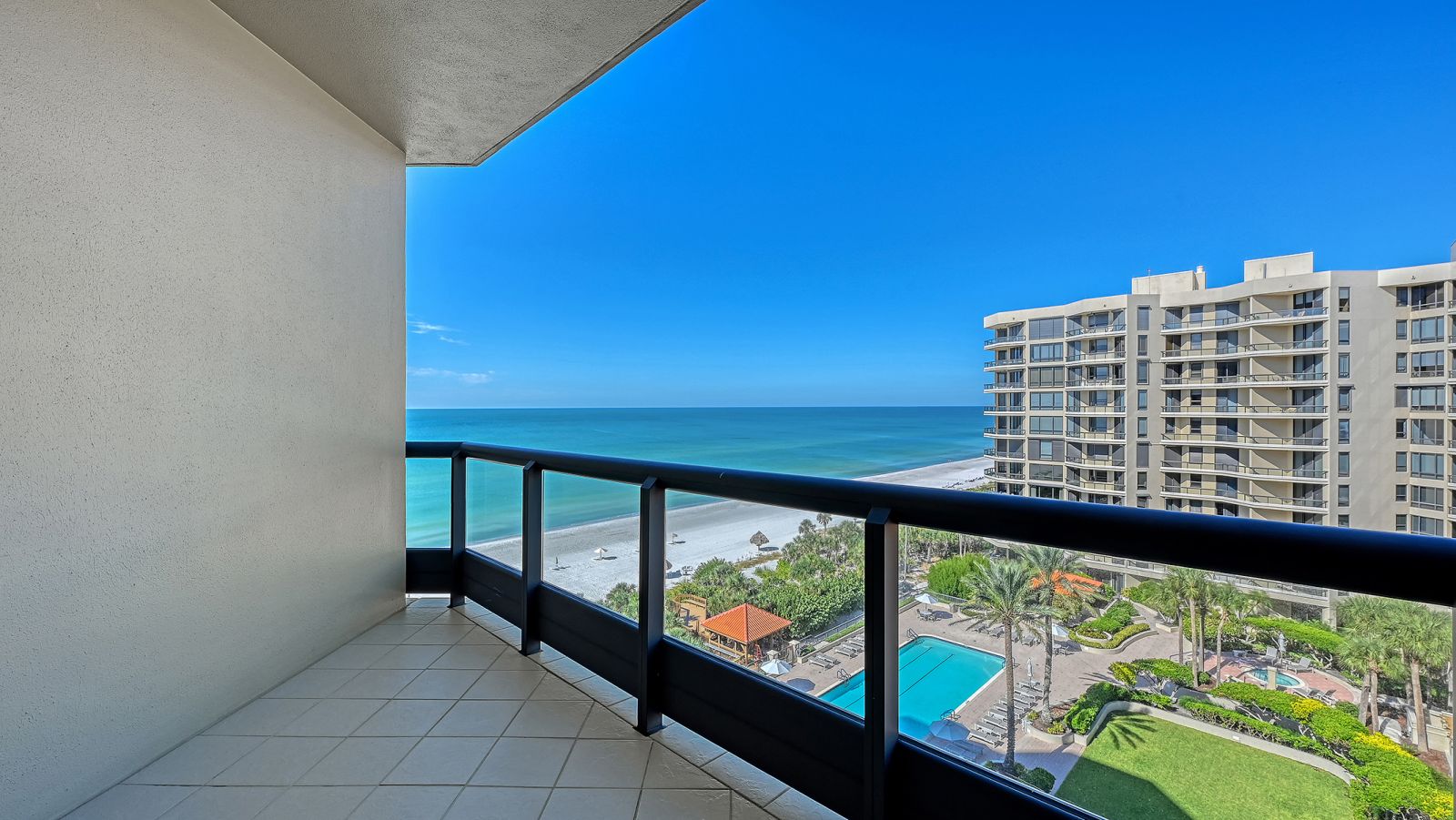 Welcome to The Water Club at Longboat Key, where privacy, spaciousness, and resort-style amenities complement the natural beauty of the setting at the edge of the sparkling waters of the Gulf of Mexico. Residents benefit from a semi-private elevator that opens directly into an impressive foyer, offering sweeping views of Sarasota Bay and the city skyline through floor-to-ceiling windows. This residence is on the north side of the south building, the sunset view side, overlooking the beautiful pool deck amenity of the community. This eighth-floor Brighton residence is highly coveted for its three-bedroom configuration with panoramic vistas of the Gulf, beach, and bay from two expansive terraces. Features include ten-foot ceilings, extensive glass walls, and storm protection shutters , enhancing both comfort and sophistication. The living room is designed to maximize openness and showcase sunsets over the Gulf. The primary suite offers a private terrace, den, walk-in closet, and dual bathrooms. With a split-bedroom plan, privacy is maintained for two generous guest suites, each featuring an en-suite bath. The kitchen is efficiently appointed with significant storage and a breakfast area overlooking the water. The Water Club stands as Longboat Key's premier gated beachfront community, situated on 16 acres of meticulously landscaped grounds. Amenities include a 17,000-square-foot clubhouse, well-equipped fitness center and spa, heated lap pool and hot tub, four Har-Tru tennis courts, concierge services, and versatile gathering spaces such as a library, billiards room, ballroom, firepit, and grilling area. Additional conveniences include under-building parking, climate-controlled storage, on-site management, and 24-hour security. Ideally located on the south end of Longboat Key, residents enjoy proximity to Longboat Key Club golf facilities, Publix shopping center, exclusive St. Armands Circle, downtown Sarasota's cultural offerings, and Sarasota International Airport, just 20 minutes away. The Water Club is pet-friendly and impeccably maintained, providing the pinnacle of coastal luxury living.