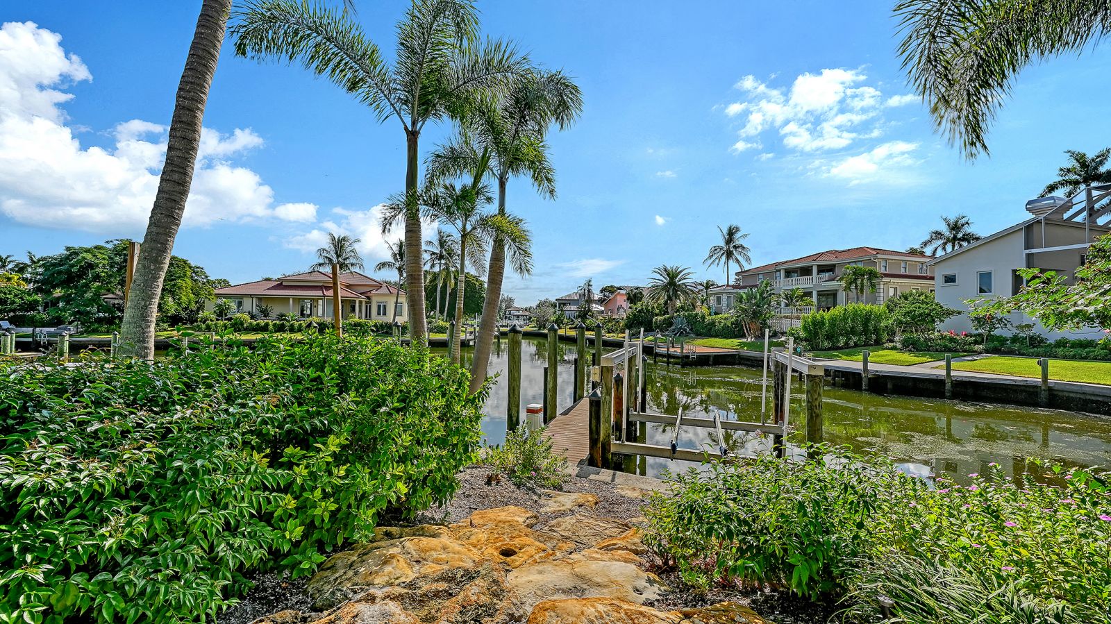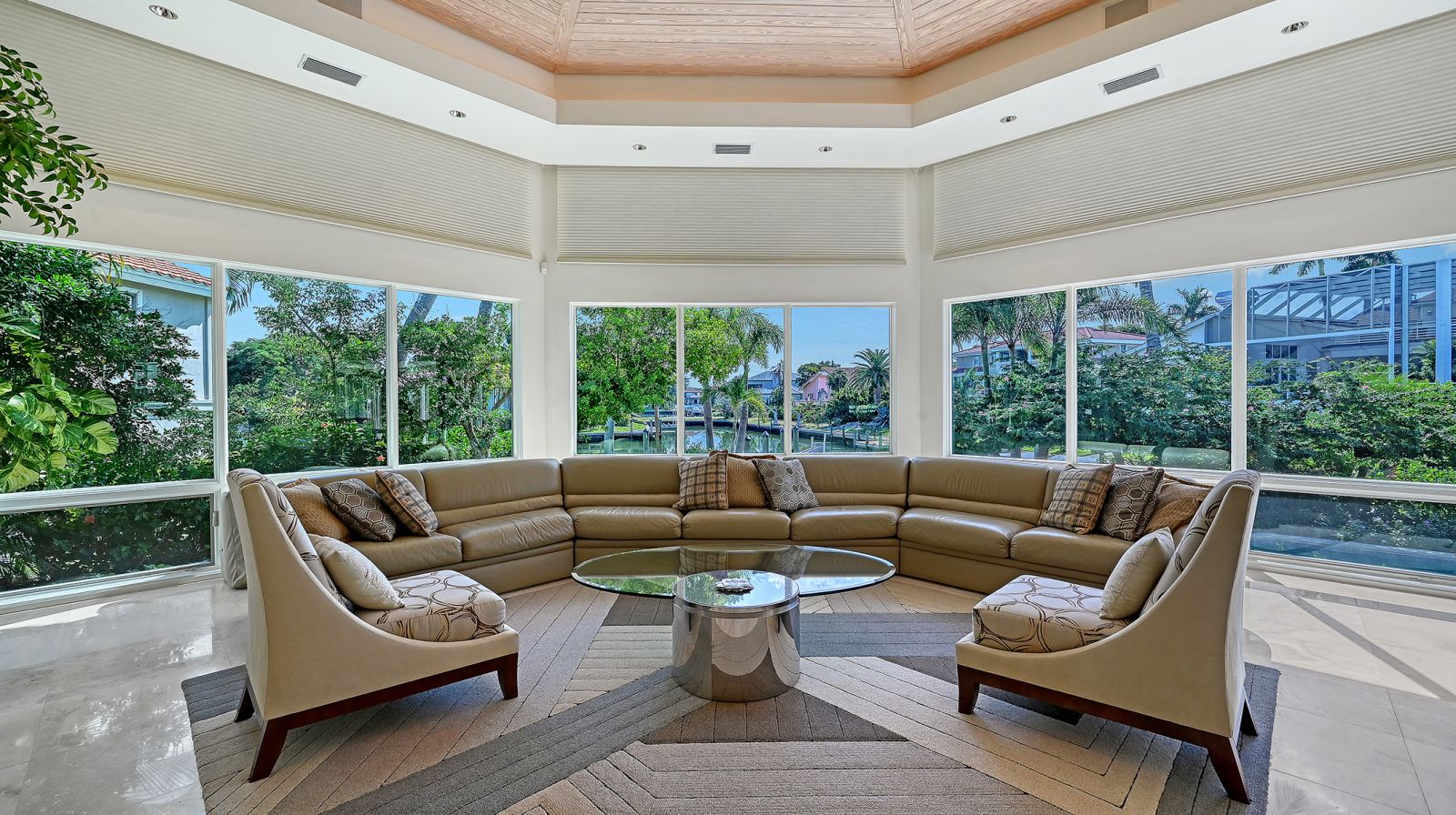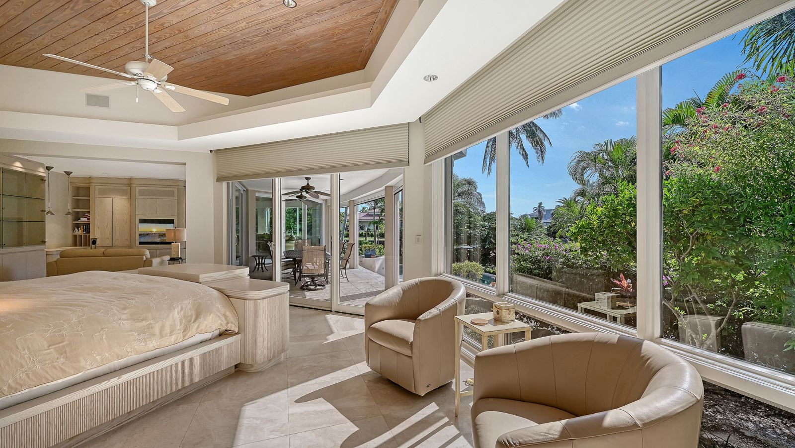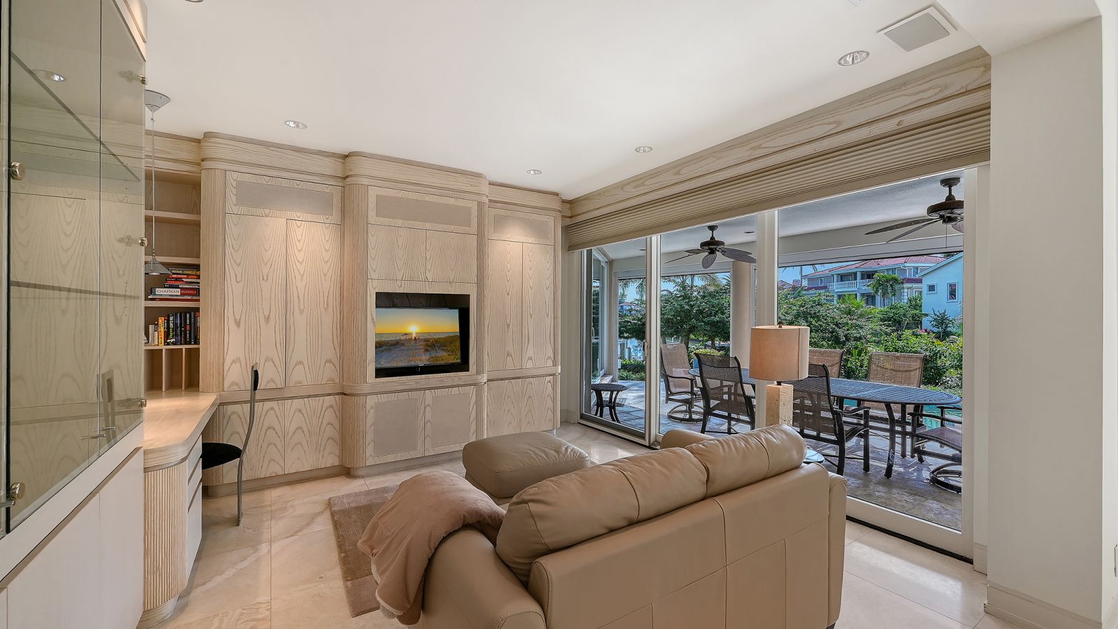 Bay Isles Harbor, Longboat Key - Stunning 4BR/5.5BA, 5,080 SF waterfront home in the prestigious Bay Isles Harbor section of Longboat Key. This architectural masterpiece features a dramatic great room with soaring tongue-and-groove ceilings and floor-to-ceiling windows showcasing sweeping water views. The circular kitchen offers stone counters, top-tier appliances, and integrated Lutron lighting, audio, and video systems. The first-floor primary suite opens to the pool and screened patio with a spa-style bath and private office. A newer 32x23 guest suite includes two Murphy beds, entertainment area, steam shower, and sauna. Enjoy a private dock on protected deep sailboat water with a 12,000 lb. lift. Bay Isles residents enjoy gated security and access to the exclusive Bay Isles Beach Club on the Gulf of Mexico.