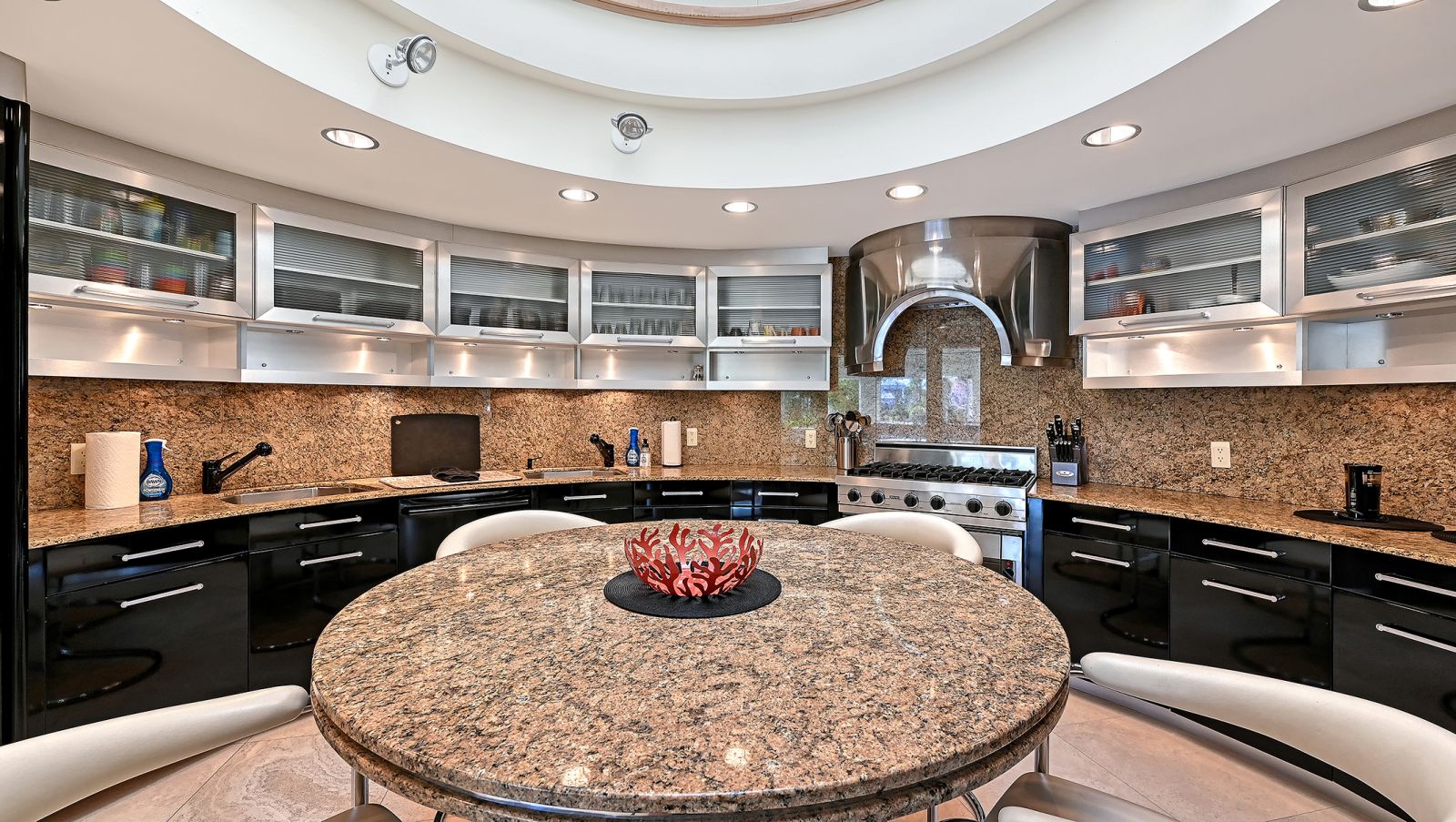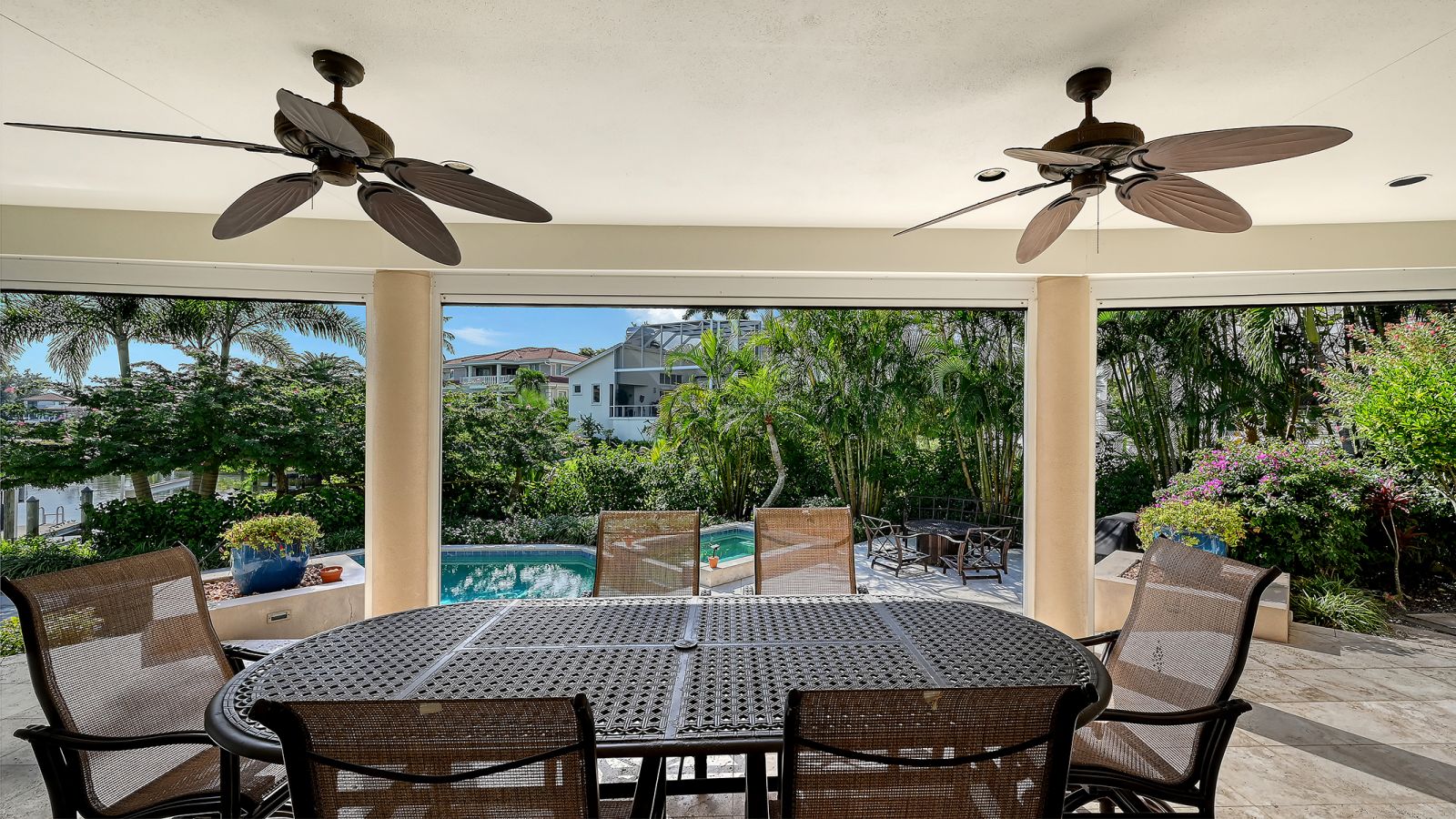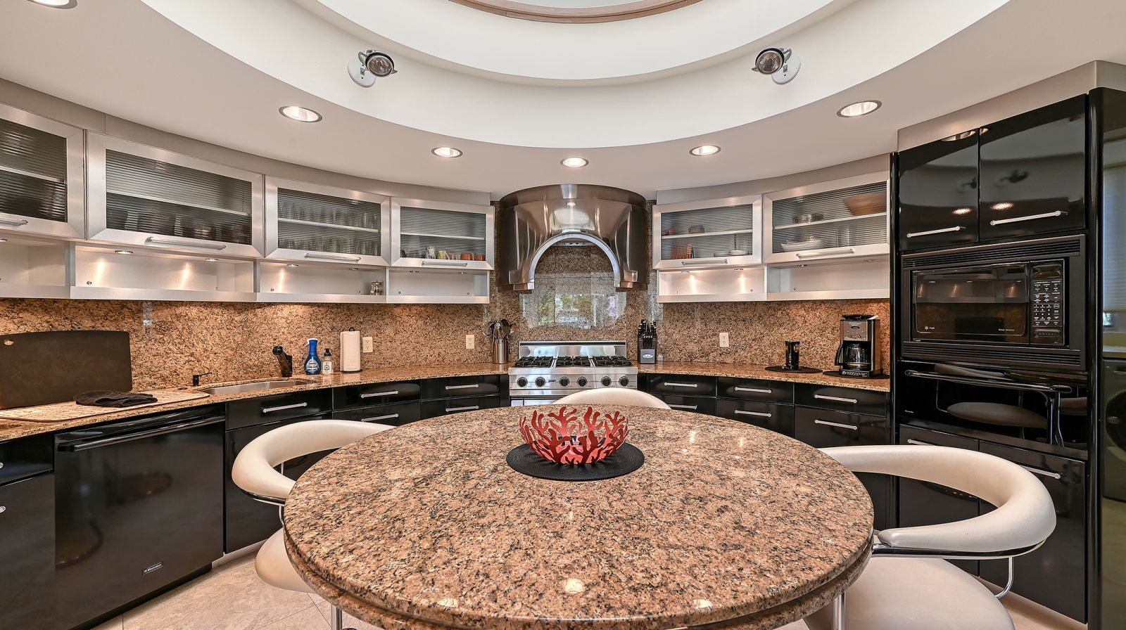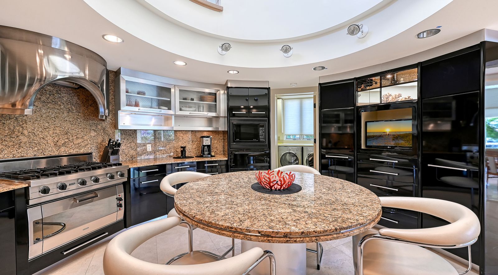 Bay Isles Harbor, Longboat Key - Stunning 4BR/5.5BA, 5,080 SF waterfront home in the prestigious Bay Isles Harbor section of Longboat Key. This architectural masterpiece features a dramatic great room with soaring tongue-and-groove ceilings and floor-to-ceiling windows showcasing sweeping water views. The circular kitchen offers stone counters, top-tier appliances, and integrated Lutron lighting, audio, and video systems. The first-floor primary suite opens to the pool and screened patio with a spa-style bath and private office. A newer 32x23 guest suite includes two Murphy beds, entertainment area, steam shower, and sauna. Enjoy a private dock on protected deep sailboat water with a 12,000 lb. lift. Bay Isles residents enjoy gated security and access to the exclusive Bay Isles Beach Club on the Gulf of Mexico.