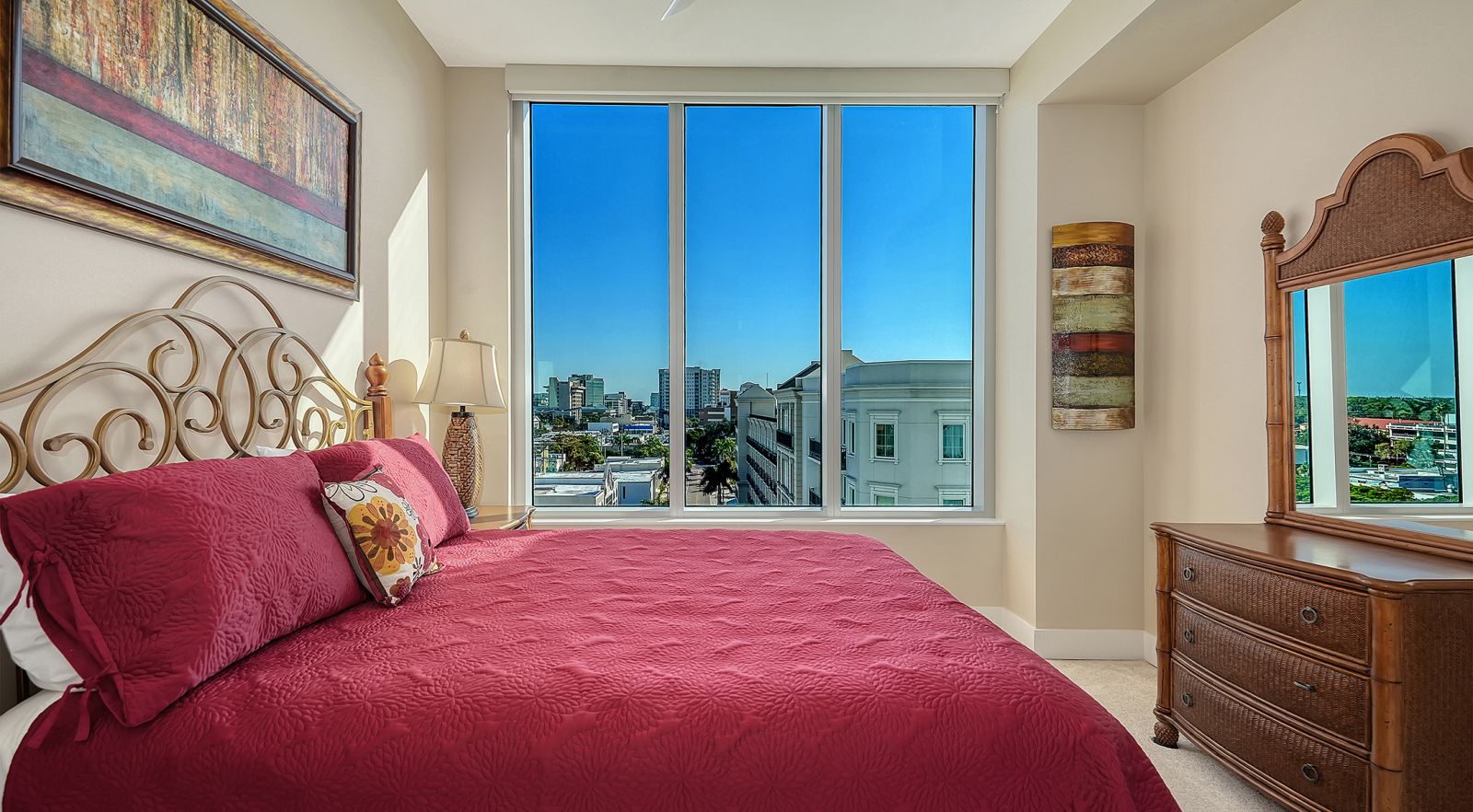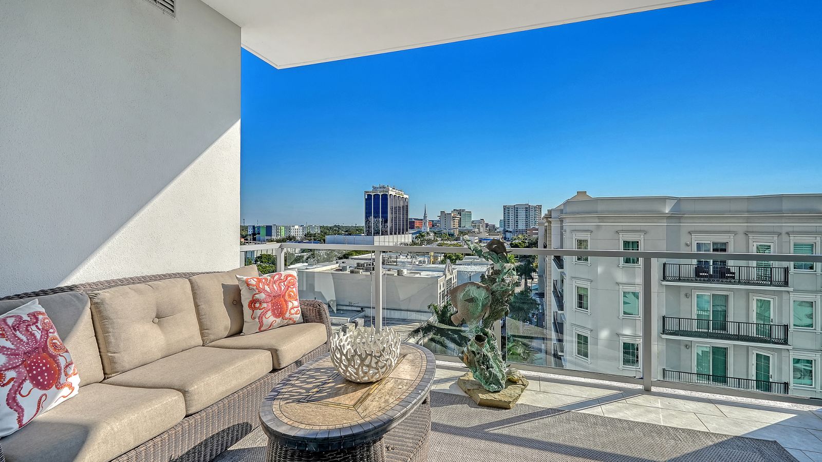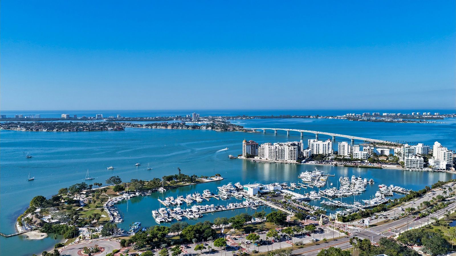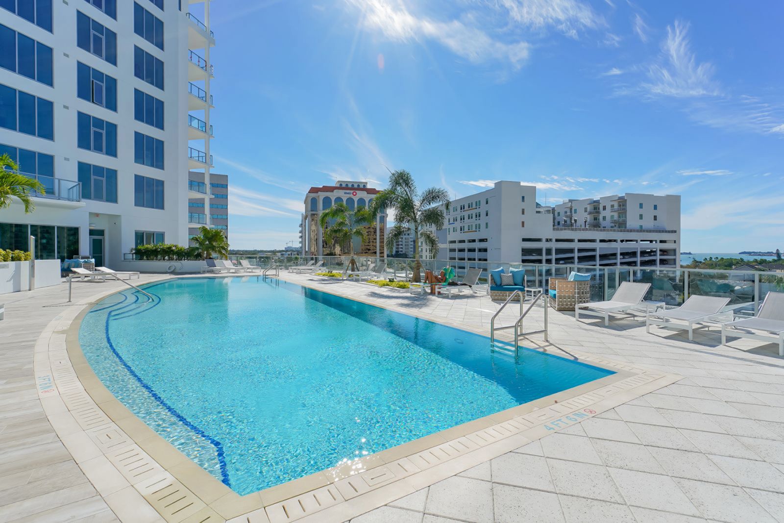 Welcome to The Mark- where it's all happening in downtown Sarasota. This incredible city-view unit is the perfect height and position in the building- facing east for sun-filled mornings, it looks directly down State Street and at the city below. The Mark is a wonderfully amenitized newer building in the core of downtown Sarasota. Just out your front door is access to the finest in dining, shopping, and entertainment that Sarasota has to offer. Inside the building you will find a true oasis- you'll be greeted by the friendly concierge, take the elevator up to you level and enjoy privacy and elegance. The amenities in the building include a heated pool and spa deck area with peek-a-boo views of the water and cityscape, outdoor seating and cabanas, a luxurious fitness center, meeting room, shared office area, grilling area, catering kitchen and much more. This unit stands out with one extra wide end parking space that was hand selected by the seller, and there is a 6x4 storage unit right across the hall. Inside this residence are lovely upgrades including tile in the main living area, automated blinds with blackout shades in the bedrooms, recessed can lighting, separate laundry room with sink, grass cloth accent walls and much more. You'll love the open floor plan with bedrooms on either side, each with its own en-suite bathroom. There is a powder room for entertaining and abundant space for sitting and hosting in the main area. There is a tucked-away office area with built-ins, custom lighting throughout, and no storm concerns with impact glass windows in all openings! The luxurious kitchen features an island with bar seating, stainless steel appliances, custom glass tile backsplash and more. The primary suite offers abundant space, dual closets, bathroom with separately enclosed walk-in shower and commode, dual vanities, and access the balcony. The lovely east facing balcony is a great retreat to sit and let the day greet you, and even see the warm glow of sunset skies over the city in the evening. This unit has been lovingly cared for its original owner- don't wait- schedule your private tour today!