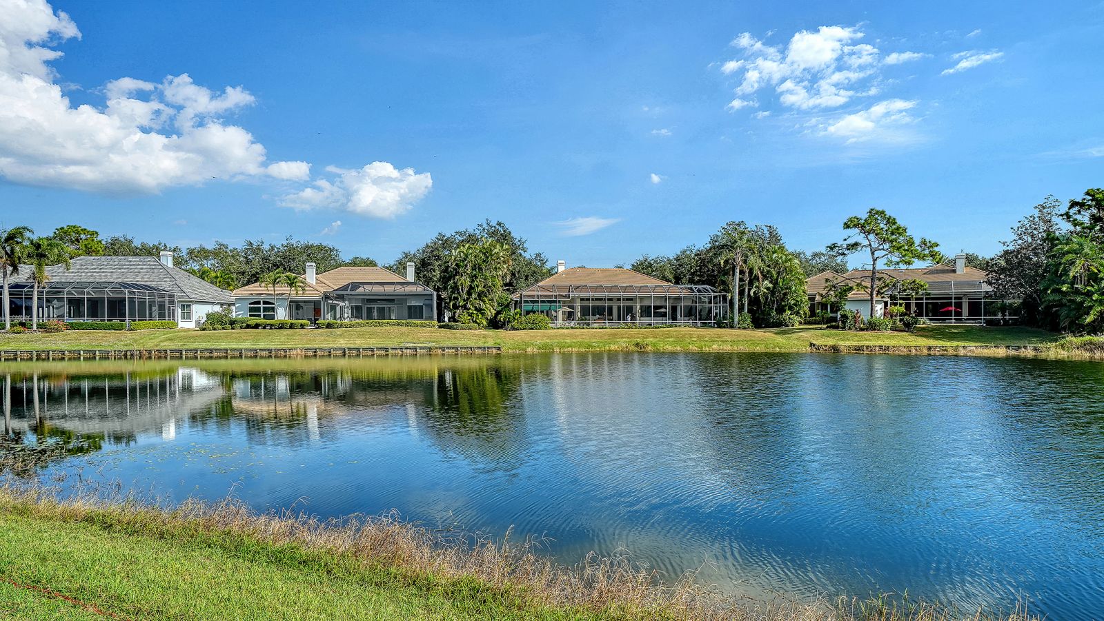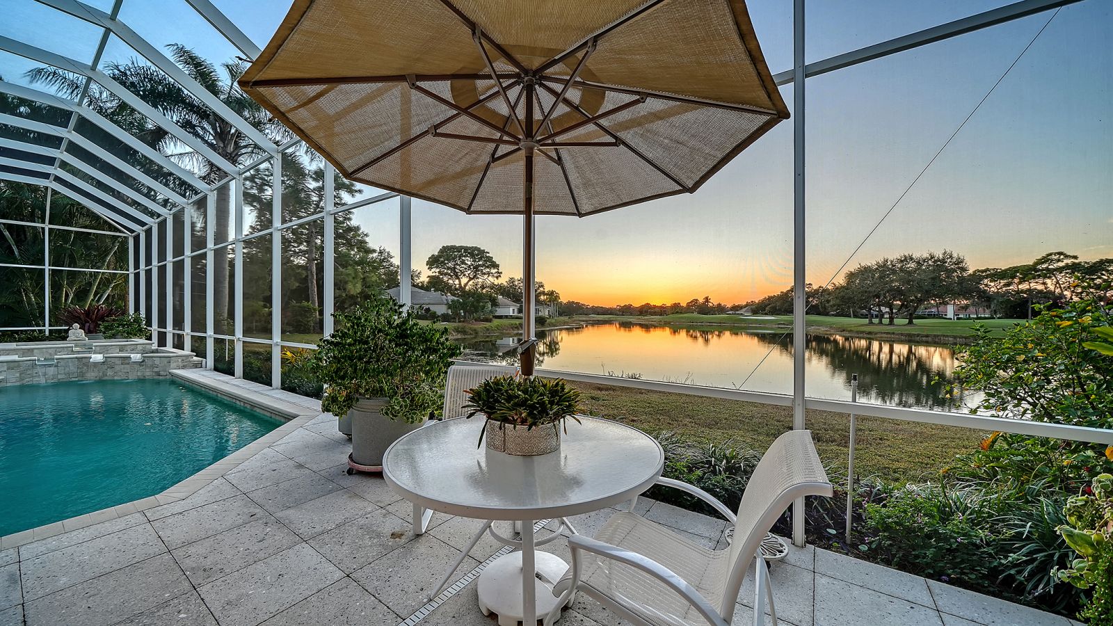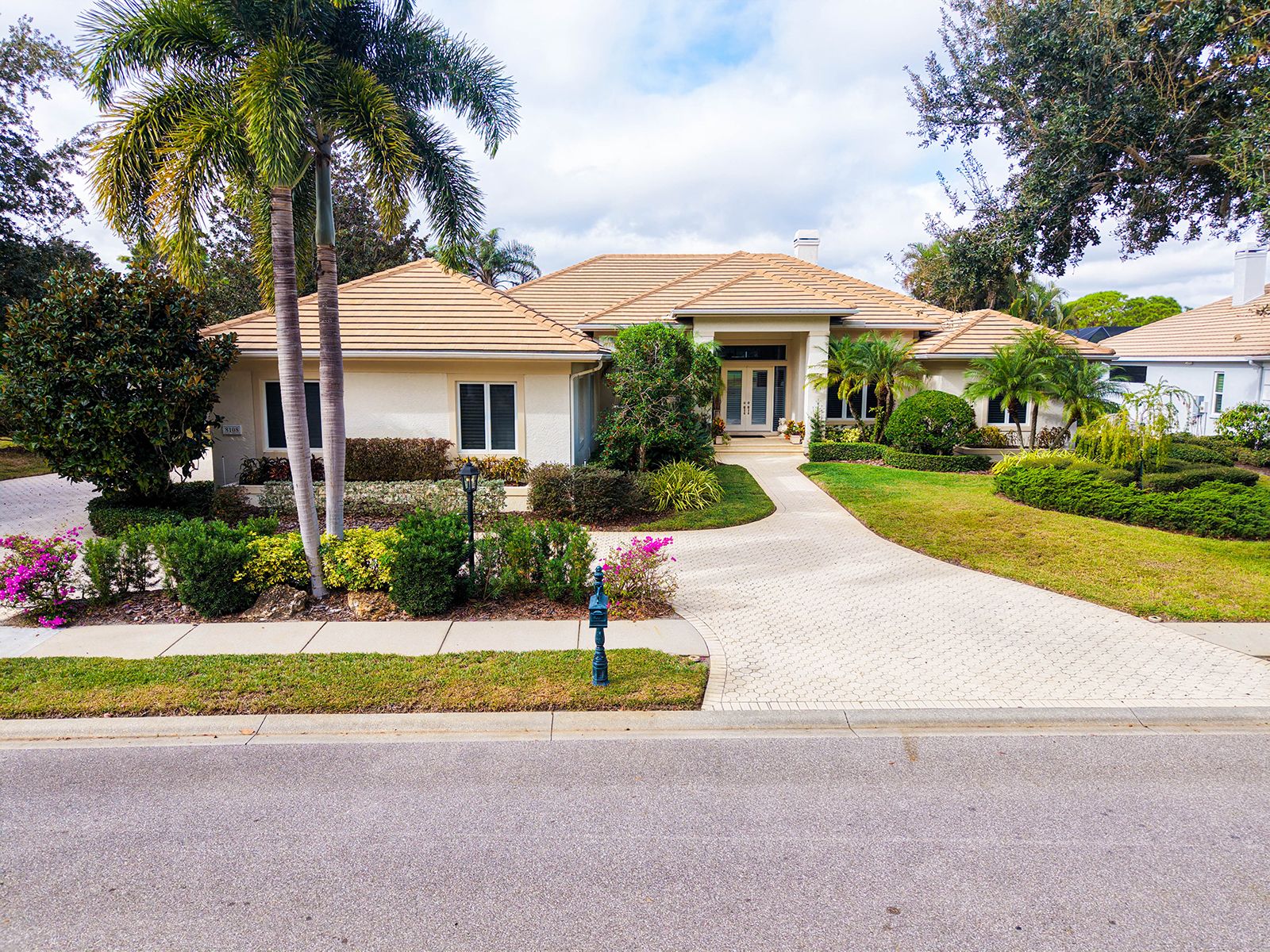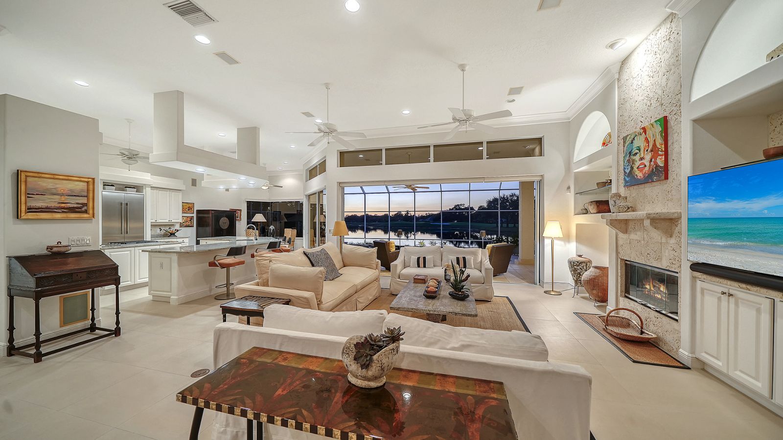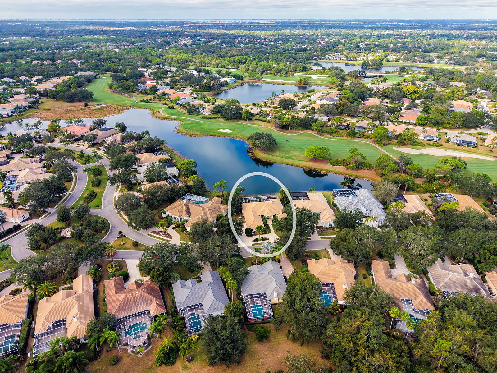 This beautiful John Cannon home has arguably the best water views in the whole of University Park! Boasting 3 bedrooms, 3 baths + den, a 3-car side-return garage, and a huge pool deck, this 3,100-square-foot home is set on 0.4 acre of lushly landscaped property against a backdrop of expansive west-facing lake and golf course views. The home has been fastidiously maintained and beautifully updated. The split-bed floor one-story plan is anchored by a stunning living area with volume ceilings, a striking coral-stone fireplace surround, built-in shelving, and pocket sliders to a huge screened terrace with a sparkling pool and jaw-dropping water views. The primary suite has a large bedroom and spacious seating area overlooking the pool and lake, two walk-in closets, and a spacious bathroom with quartz cabinetry and a vanity desk. The kitchen was remodeled in 2018 with sleek granite countertops, and the appliances were all updated in the past couple of years with Thermador and Wolf fixtures. This home boasts an abundance of natural light in every room which, combined with extra features including high ceilings, a neutral palette, plantation shutters, sunshades, built-in features, and a whole-house generator, represents incredible value in a prime location behind the gates of this sought-after country club University Park Country Club is a gated, resident-owned community offering a 27-hole Ron Garl-designed golf course, eleven lighted Har-Tru tennis courts, four pickleball courts, croquet, a fitness center, and multiple on-site dining options. Miles of tree-lined streets provide opportunities for walking and biking, and a variety of social clubs and organized activities are available to residents. Located approximately four miles from downtown Sarasota, the community provides convenient access to shopping, dining, cultural venues, healthcare, and major transportation routes. University Town Center, with its wide selection of shops, restaurants, and fitness studios, is about two miles away, along with Nathan Benderson Park and nearby Mote Marine facilities. Gulf Coast beaches, SRQ airport, the Ringling Museum, boating options, and St. Armands Circle are all within an estimated 15-minute drive.
