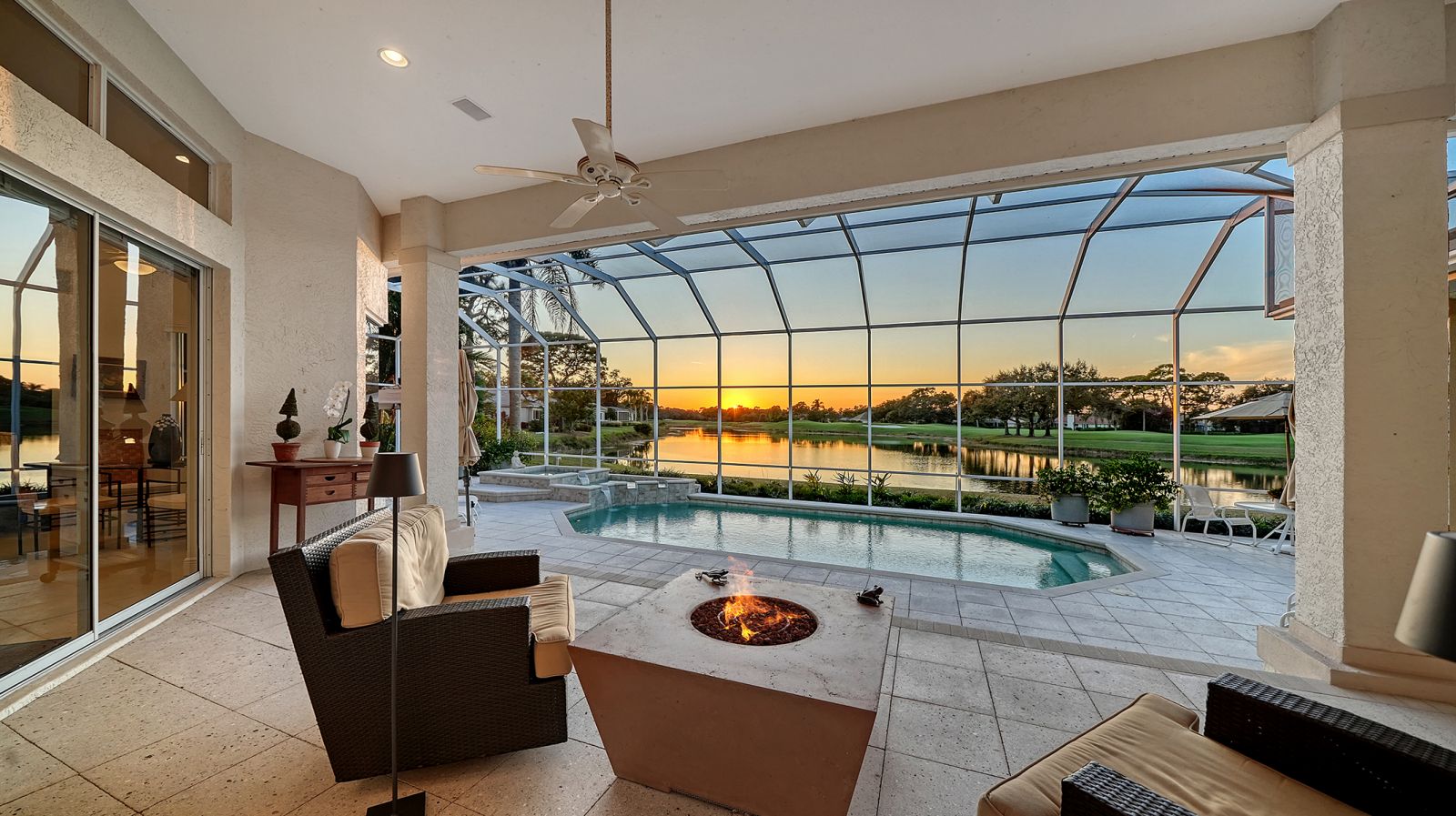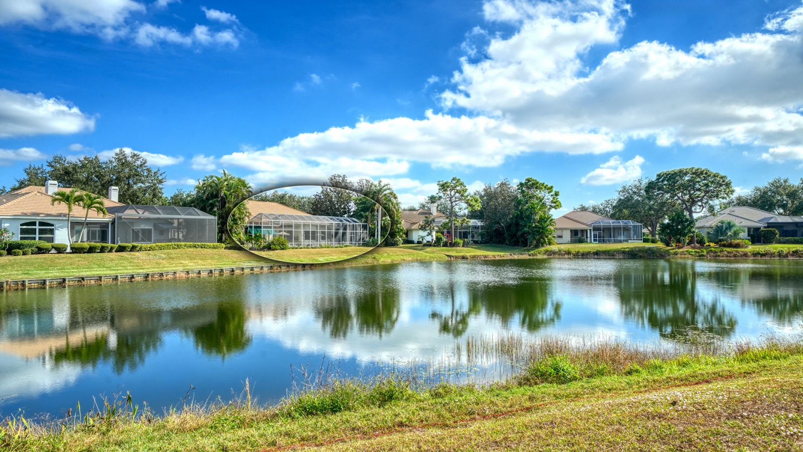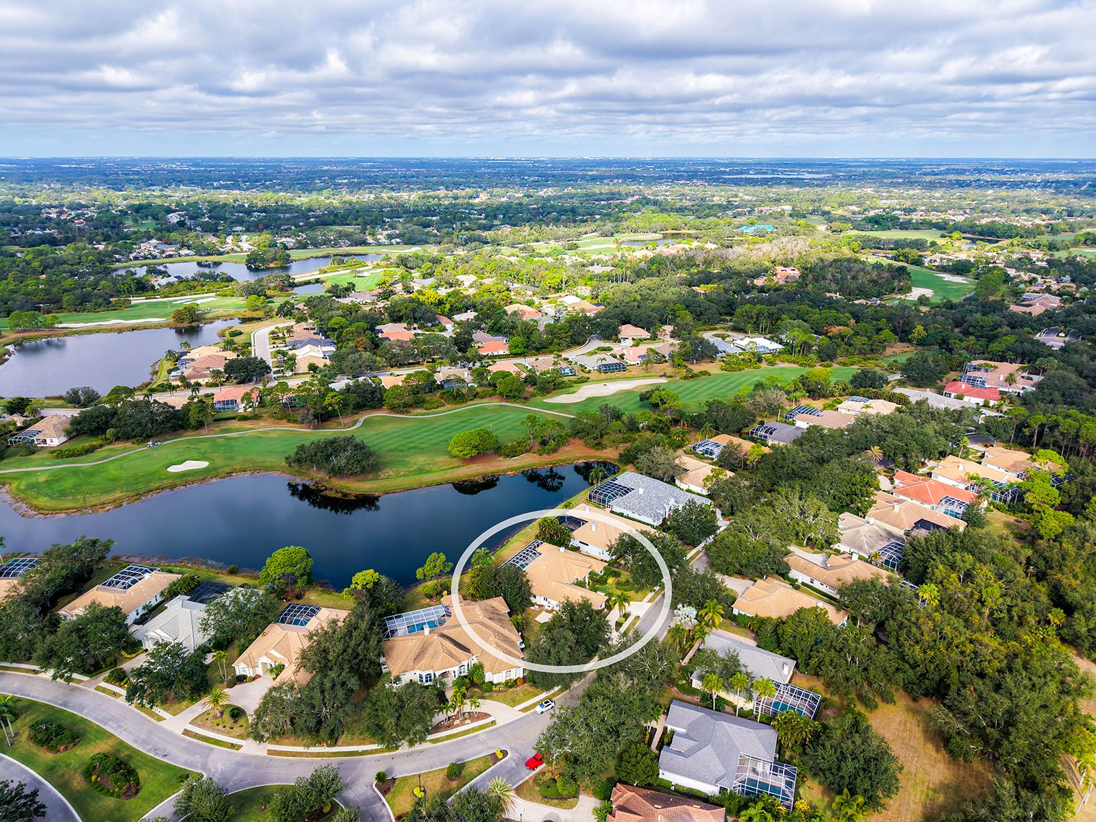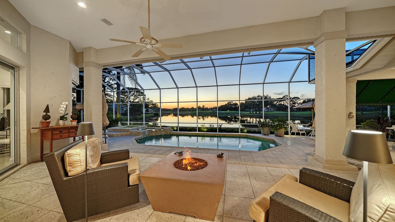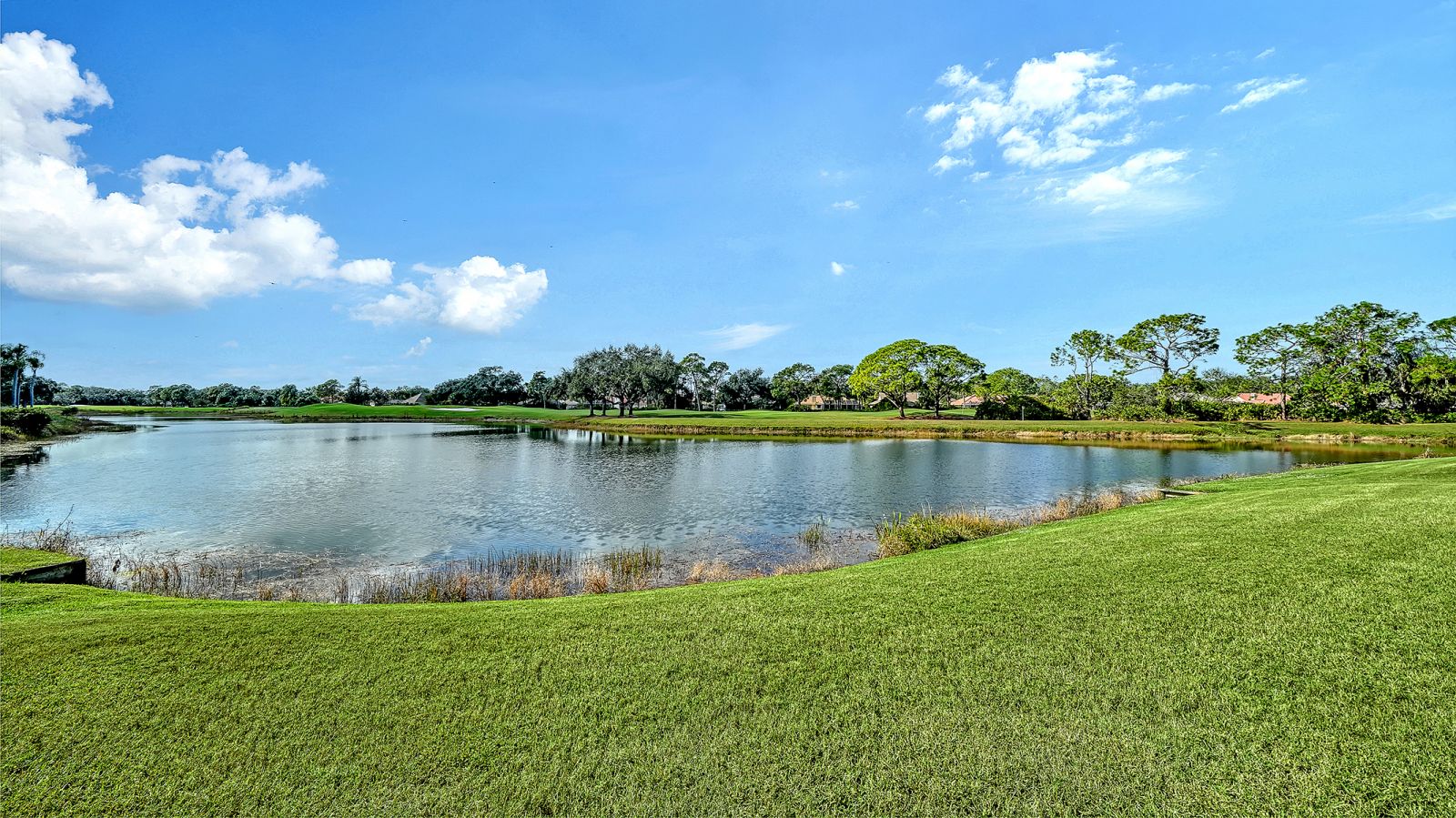 This beautiful John Cannon home has arguably the best water views in the whole of University Park! Boasting 3 bedrooms, 3 baths + den, a 3-car side-return garage, and a huge pool deck, this 3,100-square-foot home is set on 0.4 acre of lushly landscaped property against a backdrop of expansive west-facing lake and golf course views. The home has been fastidiously maintained and beautifully updated. The split-bed floor one-story plan is anchored by a stunning living area with volume ceilings, a striking coral-stone fireplace surround, built-in shelving, and pocket sliders to a huge screened terrace with a sparkling pool and jaw-dropping water views. The primary suite has a large bedroom and spacious seating area overlooking the pool and lake, two walk-in closets, and a spacious bathroom with quartz cabinetry and a vanity desk. The kitchen was remodeled in 2018 with sleek granite countertops, and the appliances were all updated in the past couple of years with Thermador and Wolf fixtures. This home boasts an abundance of natural light in every room which, combined with extra features including high ceilings, a neutral palette, plantation shutters, sunshades, built-in features, and a whole-house generator, represents incredible value in a prime location behind the gates of this sought-after country club University Park Country Club is a gated, resident-owned community offering a 27-hole Ron Garl-designed golf course, eleven lighted Har-Tru tennis courts, four pickleball courts, croquet, a fitness center, and multiple on-site dining options. Miles of tree-lined streets provide opportunities for walking and biking, and a variety of social clubs and organized activities are available to residents. Located approximately four miles from downtown Sarasota, the community provides convenient access to shopping, dining, cultural venues, healthcare, and major transportation routes. University Town Center, with its wide selection of shops, restaurants, and fitness studios, is about two miles away, along with Nathan Benderson Park and nearby Mote Marine facilities. Gulf Coast beaches, SRQ airport, the Ringling Museum, boating options, and St. Armands Circle are all within an estimated 15-minute drive.
