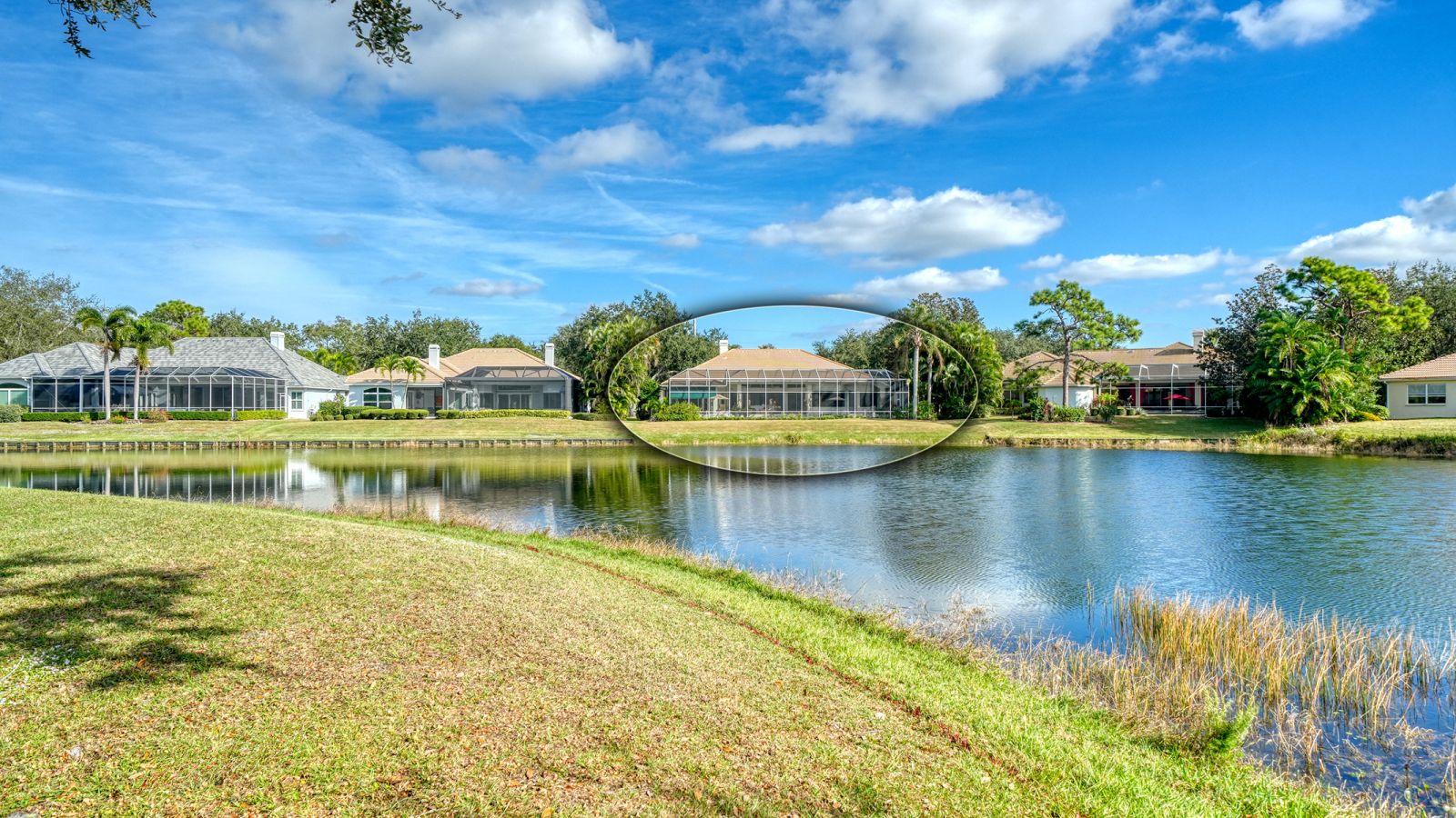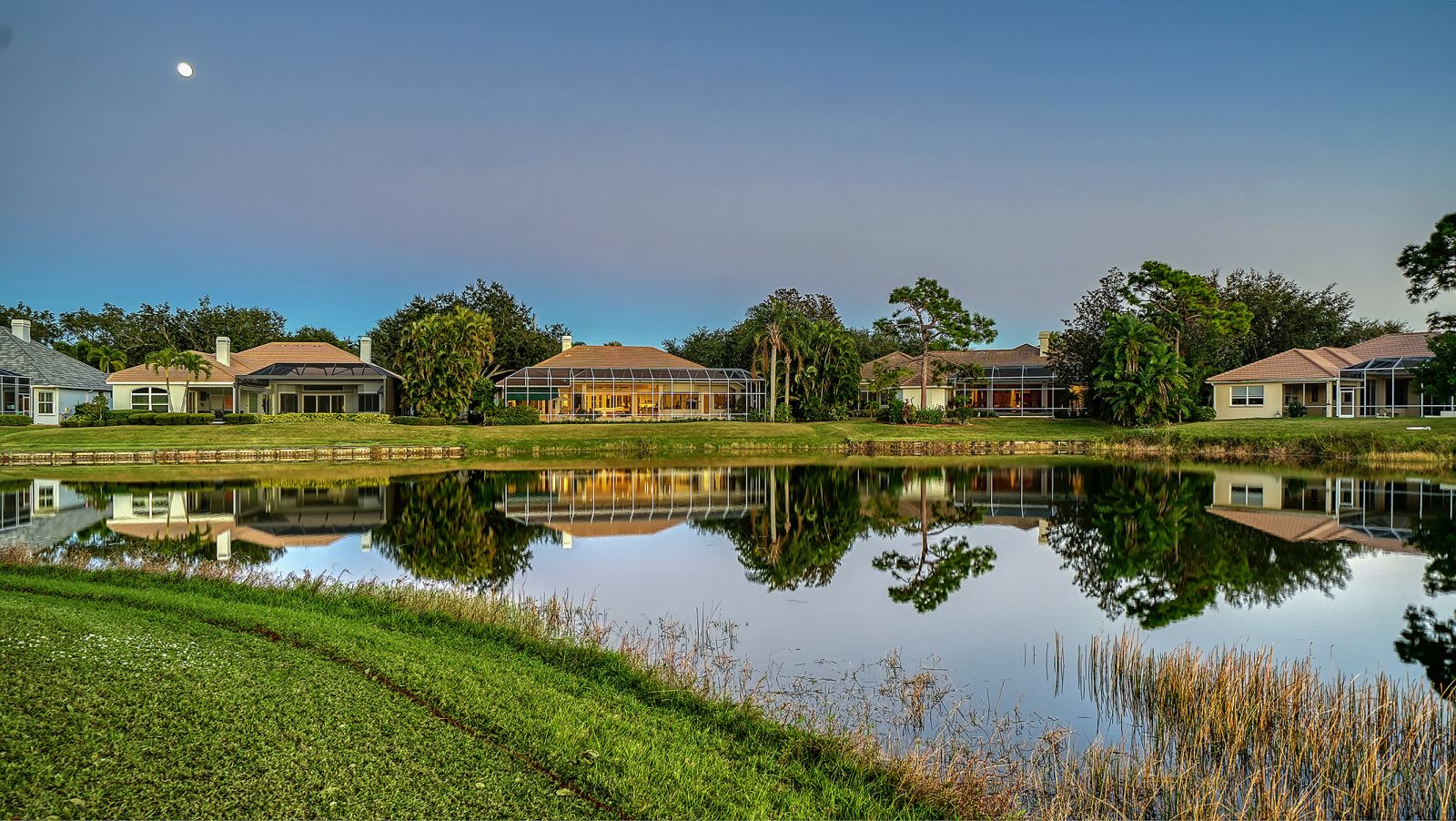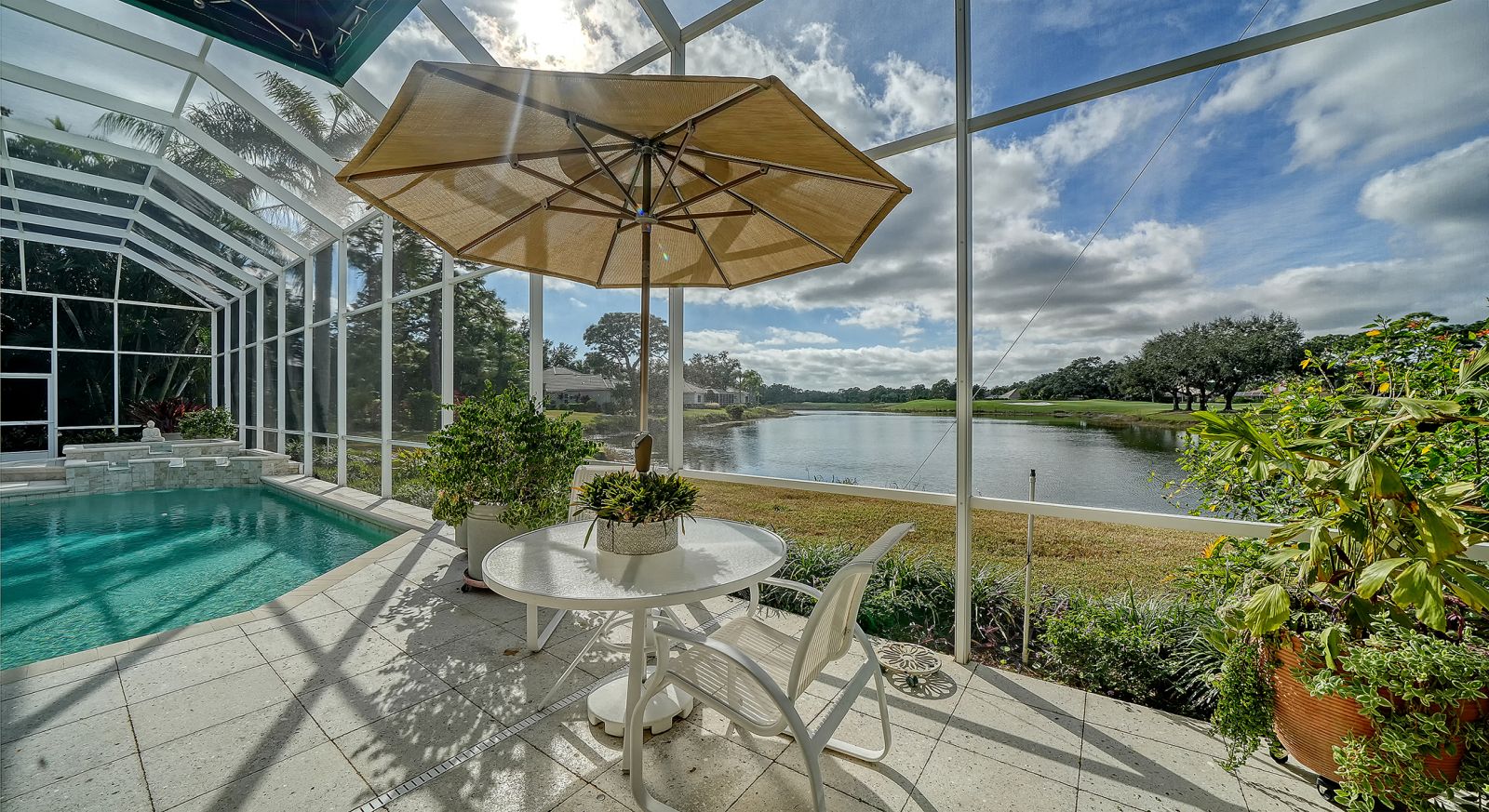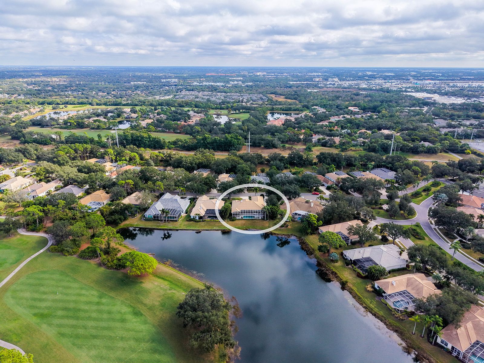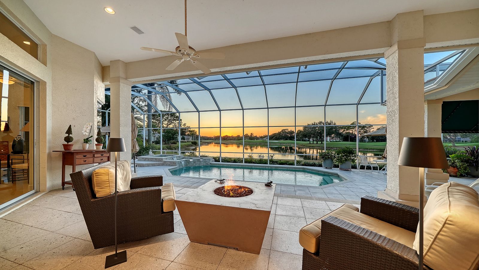 This beautiful John Cannon home has arguably the best water views in the whole of University Park! Boasting 3 bedrooms, 3 baths + den, a 3-car side-return garage, and a huge pool deck, this 3,100-square-foot home is set on 0.4 acre of lushly landscaped property against a backdrop of expansive west-facing lake and golf course views. The home has been fastidiously maintained and beautifully updated. The split-bed floor one-story plan is anchored by a stunning living area with volume ceilings, a striking coral-stone fireplace surround, built-in shelving, and pocket sliders to a huge screened terrace with a sparkling pool and jaw-dropping water views. The primary suite has a large bedroom and spacious seating area overlooking the pool and lake, two walk-in closets, and a spacious bathroom with quartz cabinetry and a vanity desk. The kitchen was remodeled in 2018 with sleek granite countertops, and the appliances were all updated in the past couple of years with Thermador and Wolf fixtures. This home boasts an abundance of natural light in every room which, combined with extra features including high ceilings, a neutral palette, plantation shutters, sunshades, built-in features, and a whole-house generator, represents incredible value in a prime location behind the gates of this sought-after country club University Park Country Club is a gated, resident-owned community offering a 27-hole Ron Garl-designed golf course, eleven lighted Har-Tru tennis courts, four pickleball courts, croquet, a fitness center, and multiple on-site dining options. Miles of tree-lined streets provide opportunities for walking and biking, and a variety of social clubs and organized activities are available to residents. Located approximately four miles from downtown Sarasota, the community provides convenient access to shopping, dining, cultural venues, healthcare, and major transportation routes. University Town Center, with its wide selection of shops, restaurants, and fitness studios, is about two miles away, along with Nathan Benderson Park and nearby Mote Marine facilities. Gulf Coast beaches, SRQ airport, the Ringling Museum, boating options, and St. Armands Circle are all within an estimated 15-minute drive.