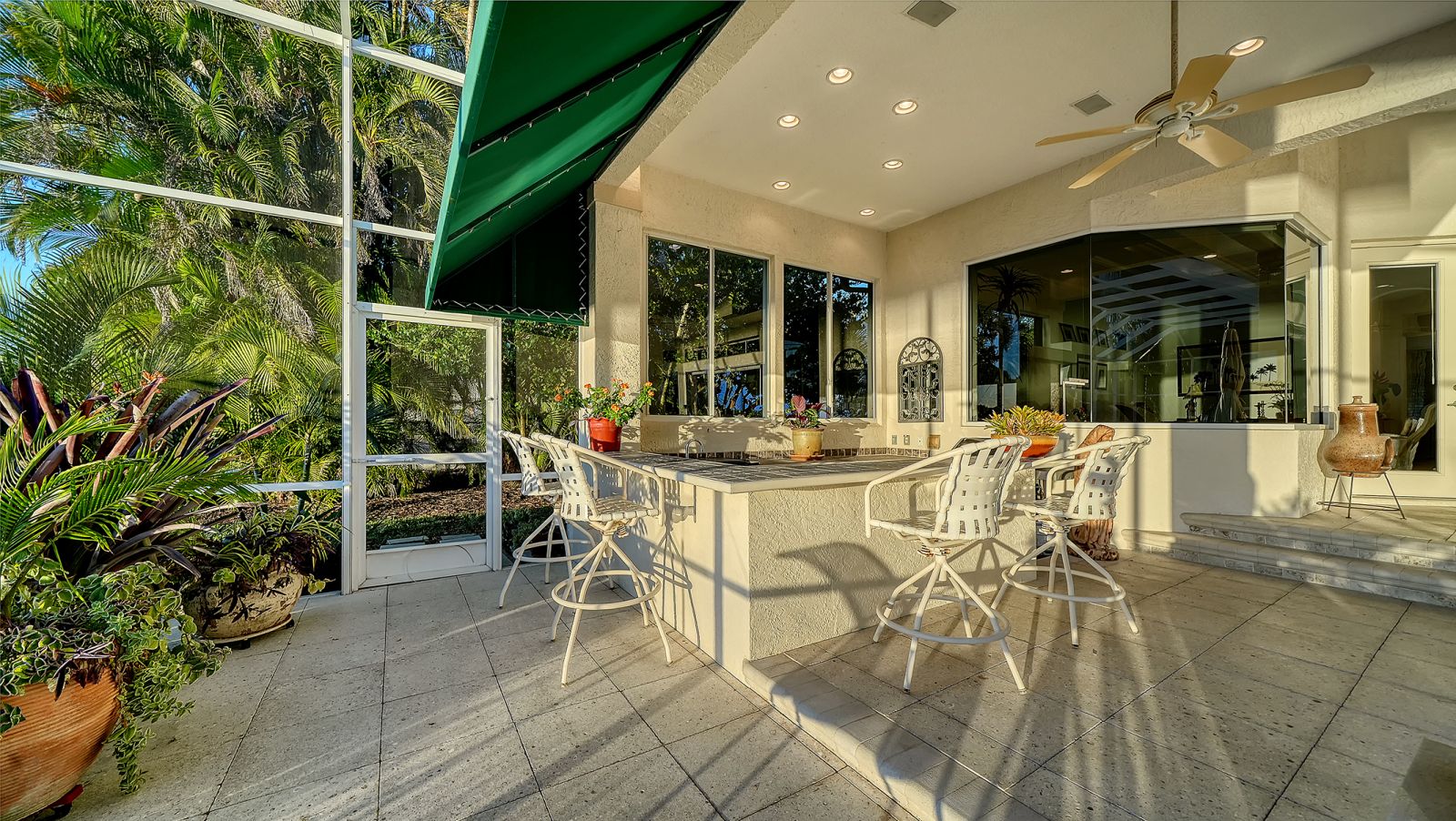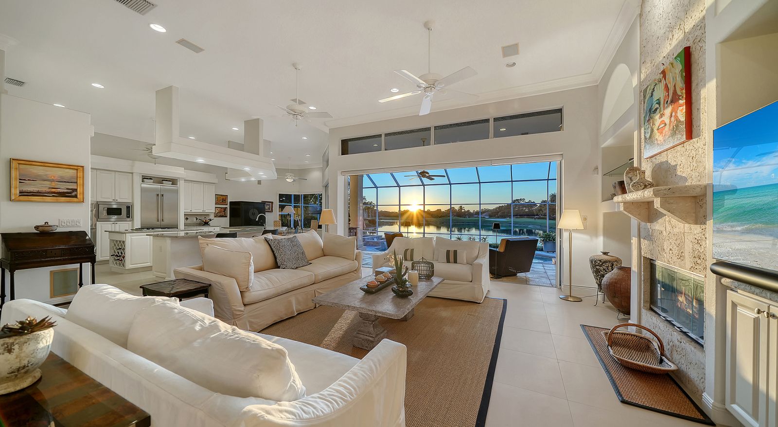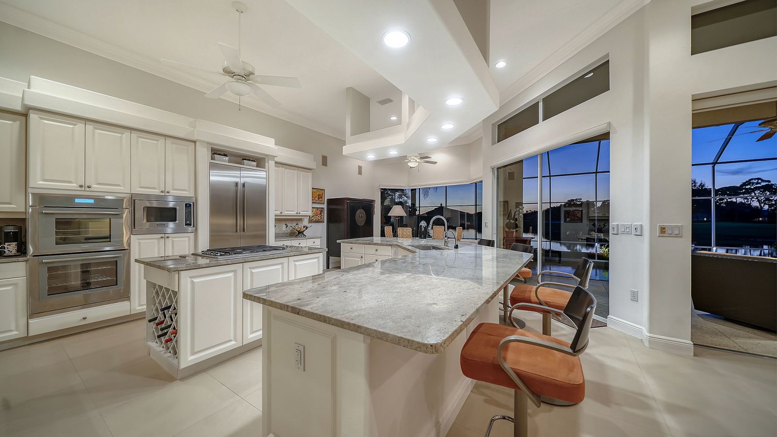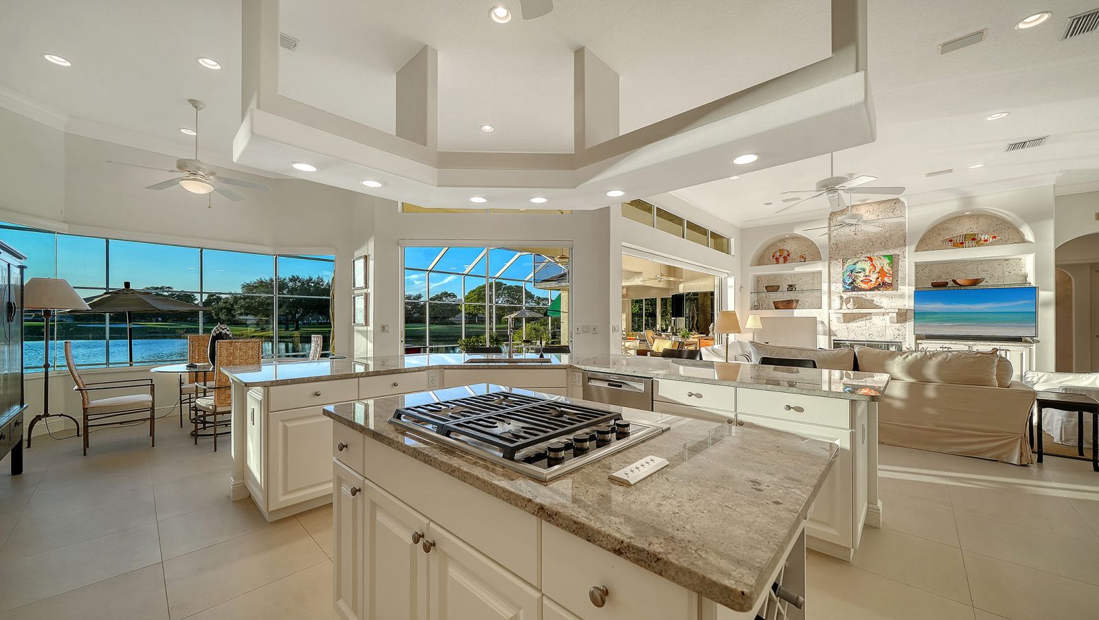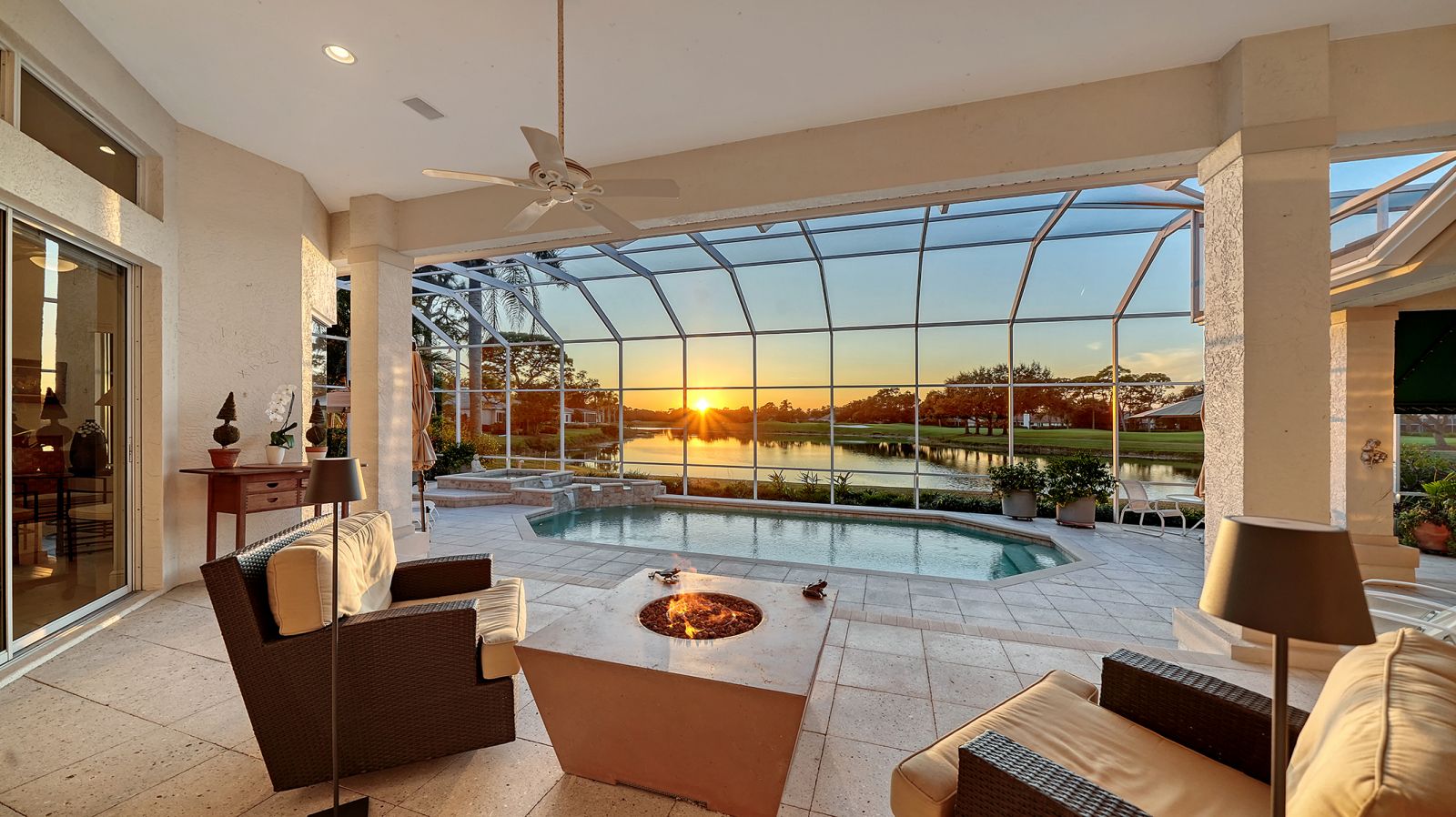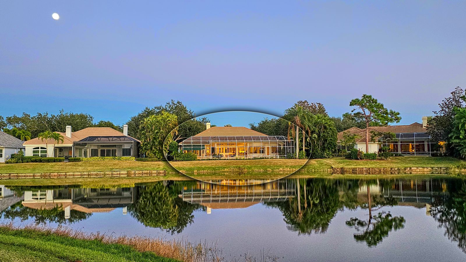This beautiful John Cannon home has arguably the best water views in the whole of University Park! Boasting 3 bedrooms, 3 baths + den, a 3-car side-return garage, and a huge pool deck, this 3,100-square-foot home is set on 0.4 acre of lushly landscaped property against a backdrop of expansive west-facing lake and golf course views. The home has been fastidiously maintained and beautifully updated. The split-bed floor one-story plan is anchored by a stunning living area with volume ceilings, a striking coral-stone fireplace surround, built-in shelving, and pocket sliders to a huge screened terrace with a sparkling pool and jaw-dropping water views. The primary suite has a large bedroom and spacious seating area overlooking the pool and lake, two walk-in closets, and a spacious bathroom with quartz cabinetry and a vanity desk. The kitchen was remodeled in 2018 with sleek granite countertops, and the appliances were all updated in the past couple of years with Thermador and Wolf fixtures. This home boasts an abundance of natural light in every room which, combined with extra features including high ceilings, a neutral palette, plantation shutters, sunshades, built-in features, and a whole-house generator, represents incredible value in a prime location behind the gates of this sought-after country club University Park Country Club is a gated, resident-owned community offering a 27-hole Ron Garl-designed golf course, eleven lighted Har-Tru tennis courts, four pickleball courts, croquet, a fitness center, and multiple on-site dining options. Miles of tree-lined streets provide opportunities for walking and biking, and a variety of social clubs and organized activities are available to residents. Located approximately four miles from downtown Sarasota, the community provides convenient access to shopping, dining, cultural venues, healthcare, and major transportation routes. University Town Center, with its wide selection of shops, restaurants, and fitness studios, is about two miles away, along with Nathan Benderson Park and nearby Mote Marine facilities. Gulf Coast beaches, SRQ airport, the Ringling Museum, boating options, and St. Armands Circle are all within an estimated 15-minute drive.