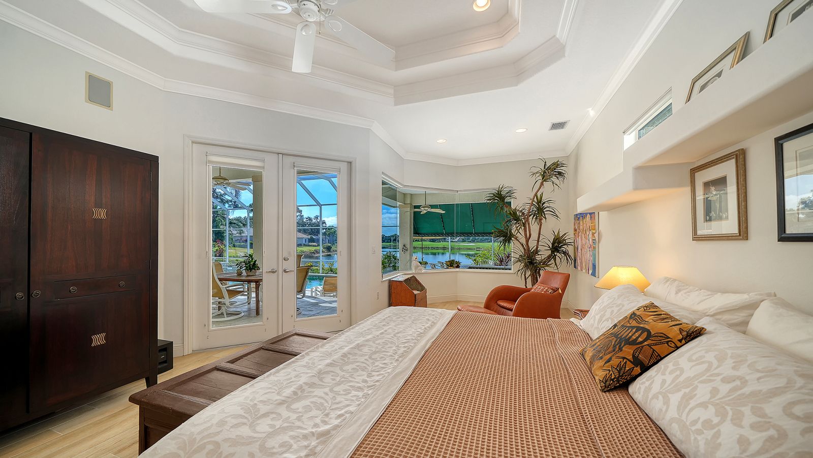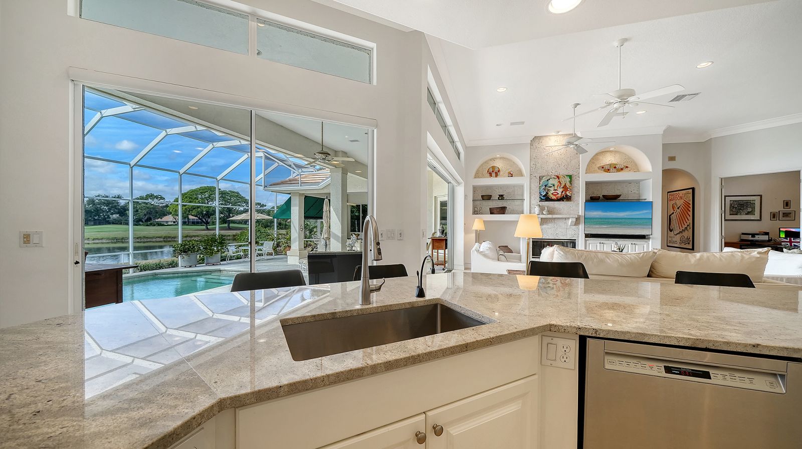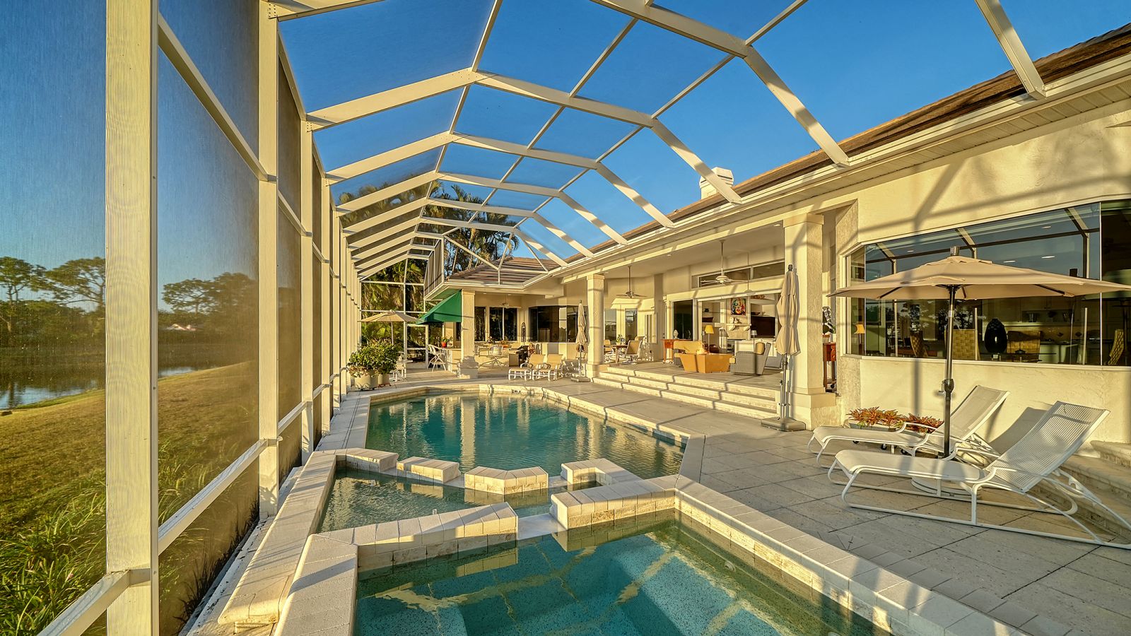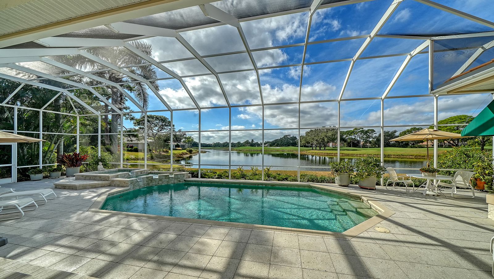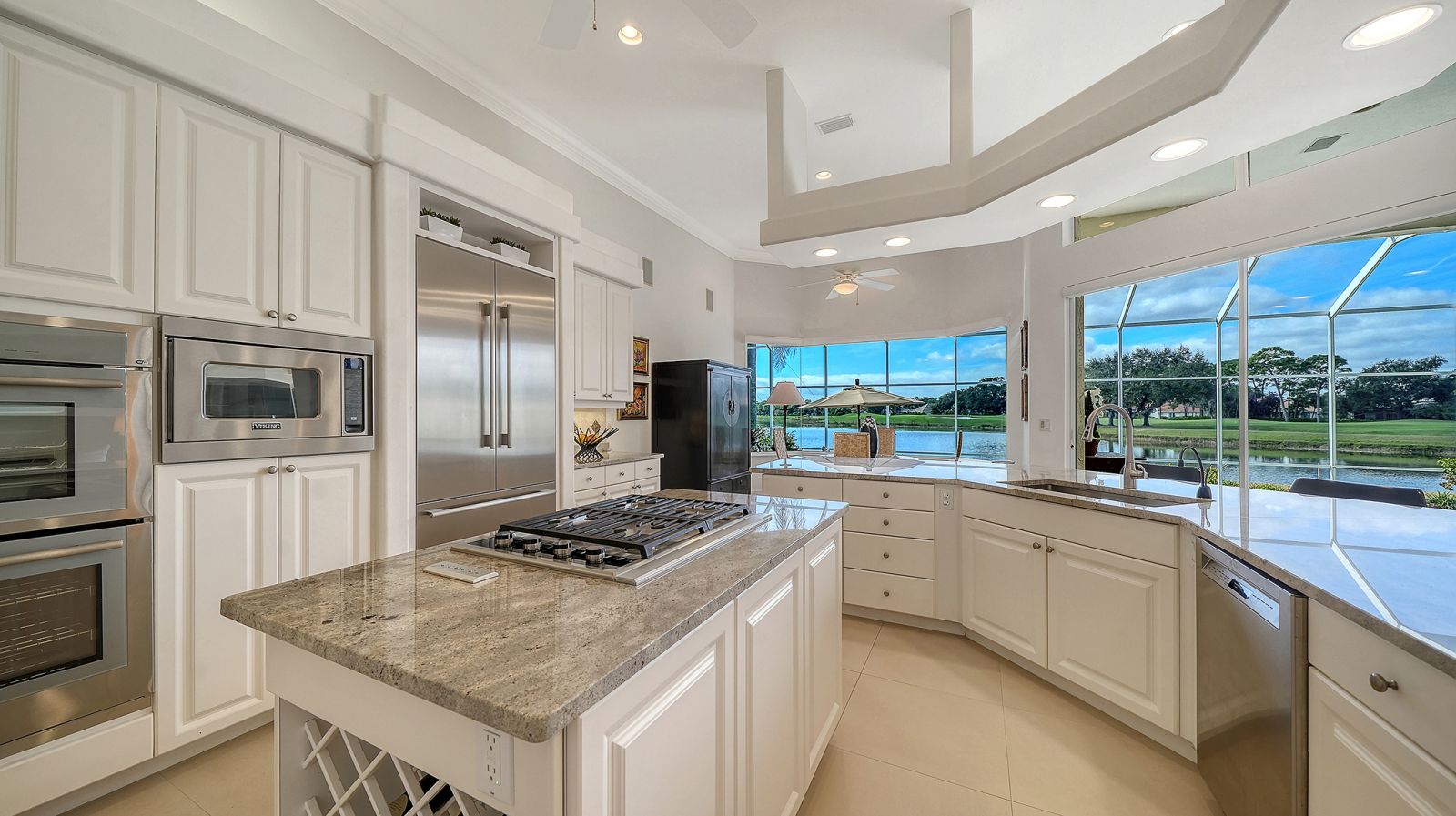 This beautiful John Cannon home has arguably the best water views in the whole of University Park! Boasting 3 bedrooms, 3 baths + den, a 3-car side-return garage, and a huge pool deck, this 3,100-square-foot home is set on 0.4 acre of lushly landscaped property against a backdrop of expansive west-facing lake and golf course views. The home has been fastidiously maintained and beautifully updated. The split-bed floor one-story plan is anchored by a stunning living area with volume ceilings, a striking coral-stone fireplace surround, built-in shelving, and pocket sliders to a huge screened terrace with a sparkling pool and jaw-dropping water views. The primary suite has a large bedroom and spacious seating area overlooking the pool and lake, two walk-in closets, and a spacious bathroom with quartz cabinetry and a vanity desk. The kitchen was remodeled in 2018 with sleek granite countertops, and the appliances were all updated in the past couple of years with Thermador and Wolf fixtures. This home boasts an abundance of natural light in every room which, combined with extra features including high ceilings, a neutral palette, plantation shutters, sunshades, built-in features, and a whole-house generator, represents incredible value in a prime location behind the gates of this sought-after country club University Park Country Club is a gated, resident-owned community offering a 27-hole Ron Garl-designed golf course, eleven lighted Har-Tru tennis courts, four pickleball courts, croquet, a fitness center, and multiple on-site dining options. Miles of tree-lined streets provide opportunities for walking and biking, and a variety of social clubs and organized activities are available to residents. Located approximately four miles from downtown Sarasota, the community provides convenient access to shopping, dining, cultural venues, healthcare, and major transportation routes. University Town Center, with its wide selection of shops, restaurants, and fitness studios, is about two miles away, along with Nathan Benderson Park and nearby Mote Marine facilities. Gulf Coast beaches, SRQ airport, the Ringling Museum, boating options, and St. Armands Circle are all within an estimated 15-minute drive.