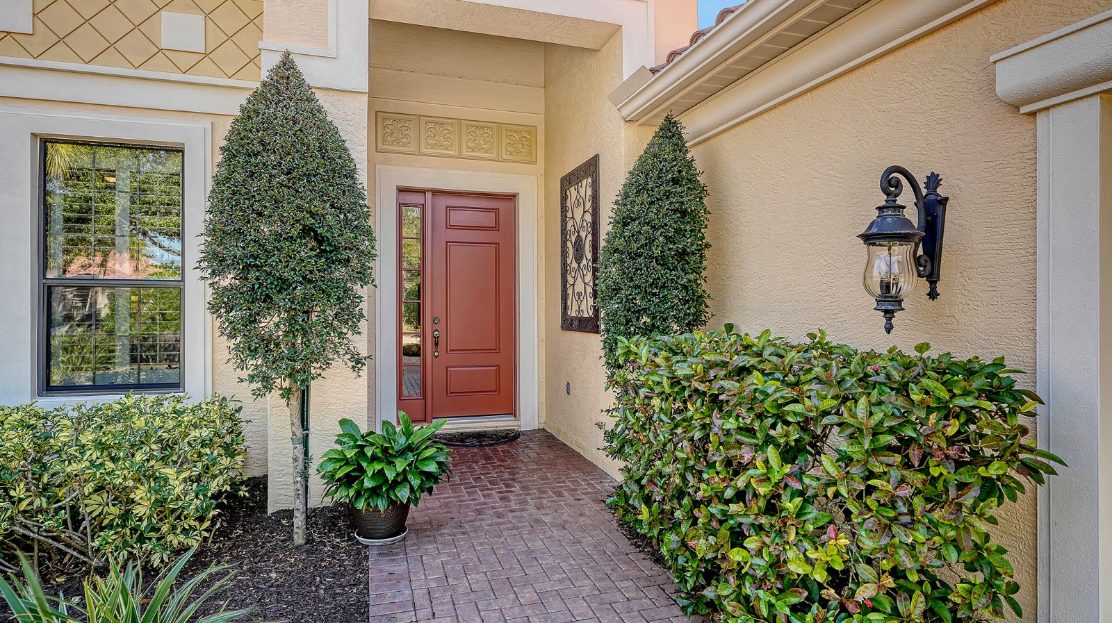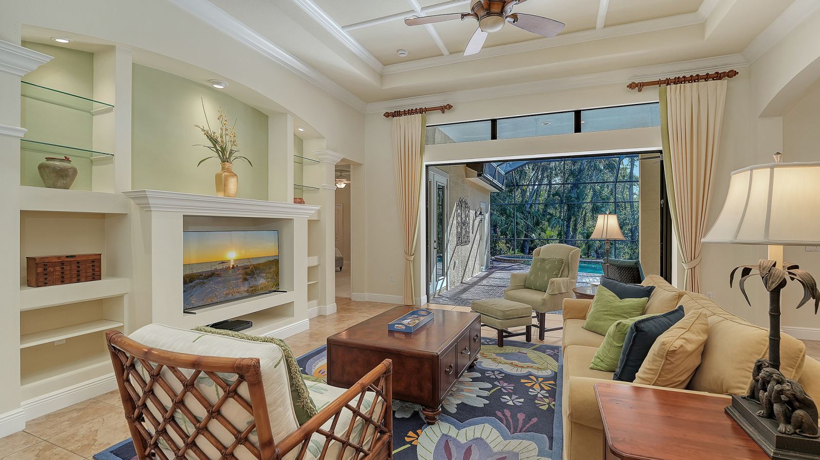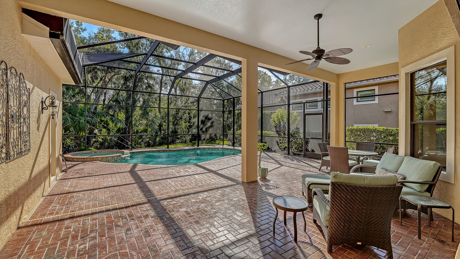 Located in the sought-after maintenance-free Silverwood enclave of the prestigious gated Lakewood Ranch Country Club, this Neal Homes residence combines timeless craftsmanship with refined comfort in a beautifully landscaped setting. A gracious entry reveals tile flooring throughout the main living areas, crown molding, recessed lighting, and a living room enhanced by beam detailing on the tray ceiling, custom built-ins, and gorgeous views of the screened lanai, pool, and spa, and lush landscaping. The kitchen is thoughtfully designed with stainless steel appliances including a five-burner LG gas range, granite countertops, a center island, ample cabinetry, pendant and under-cabinet task lighting, a large pantry, and an inviting eat-in area overlooking the pool. A formal dining room adds elegance with its ceiling medallion and natural flow for entertaining. The expansive primary suite offers a quiet retreat with high-end carpet, 2 spacious walk-in closets, private French-door access to the lanai, and a spa-inspired bath featuring dual vanities, a soaking tub, a walk-in glass-and-tile shower, and a separate water closet. Two generously sized guest bedrooms provide comfort and versatility--one currently serving as a bright office space--with large closets, including one walk-in, and access to a well-appointed guest bath with a bathtub/shower combination and stylish vanity. The home includes a laundry room with newer full-size LG washer, dryer and utility sink, plus an oversized 2-car courtyard-facing garage with plentiful built-in storage and an additional convenient utility sink. White plantation shutters, high-end finishes, a new water heater (2025), 3M protection on all windows, hurricane-rated fabric panel for the front entry and mature landscaping elevate the overall safety and appeal, while the herringbone-pattern brick paver driveway and meticulously maintained grounds create an inviting arrival. Silverwood is known for its winding streets, majestic trees, and wide sidewalks, all within the guard-gated Lakewood Ranch Country Club, where optional membership in the Club provides access to 4 championship golf courses, a state-of-the-art fitness center, tennis and pickleball courts, resort-style pools, multiple clubhouse dining options, and miles of scenic trails. Lakewood Ranch, America's #1 rated master-planned community, is nationally recognized for its exceptional lifestyle, offering beautifully maintained neighborhoods, scenic trails and parks, top-rated schools, and vibrant town centers filled with dining, shopping, and year-round events...all just minutes from premier beaches, medical centers, and Sarasota's cultural attractions.