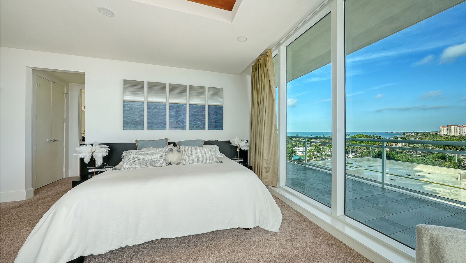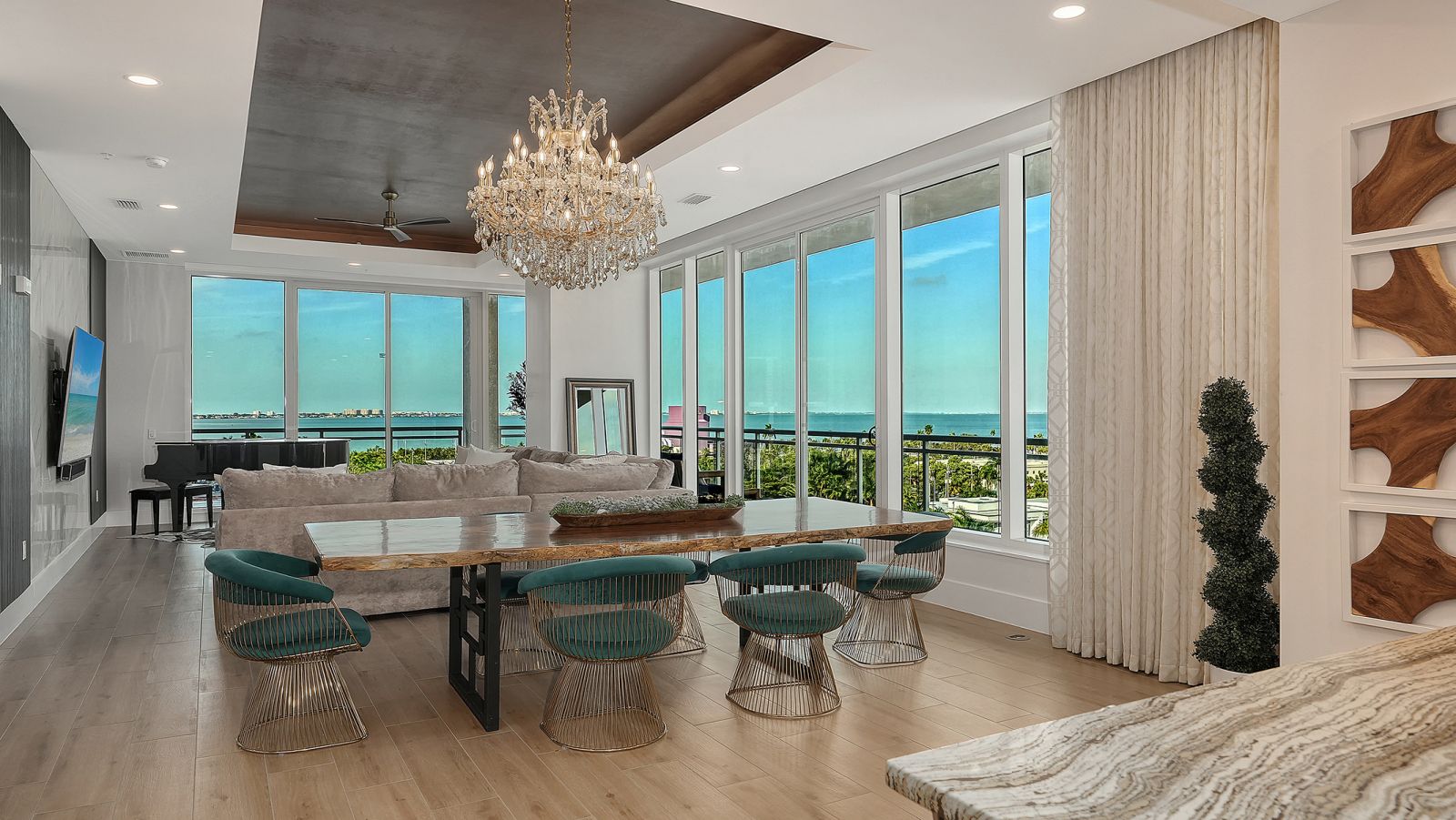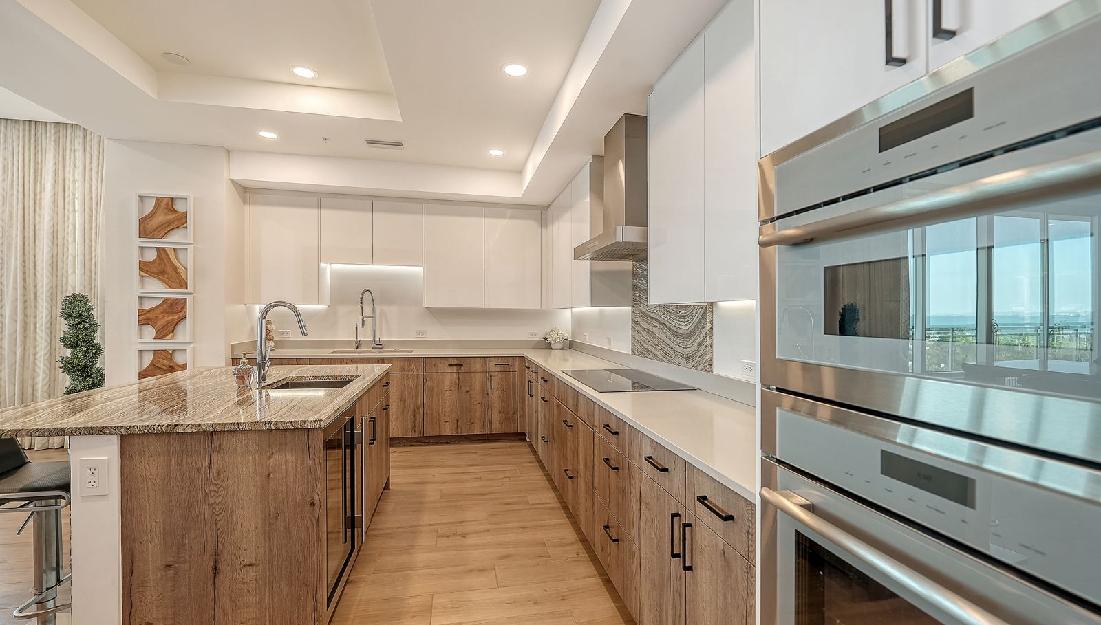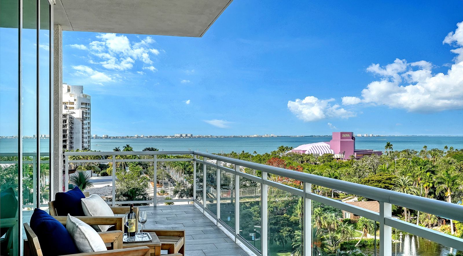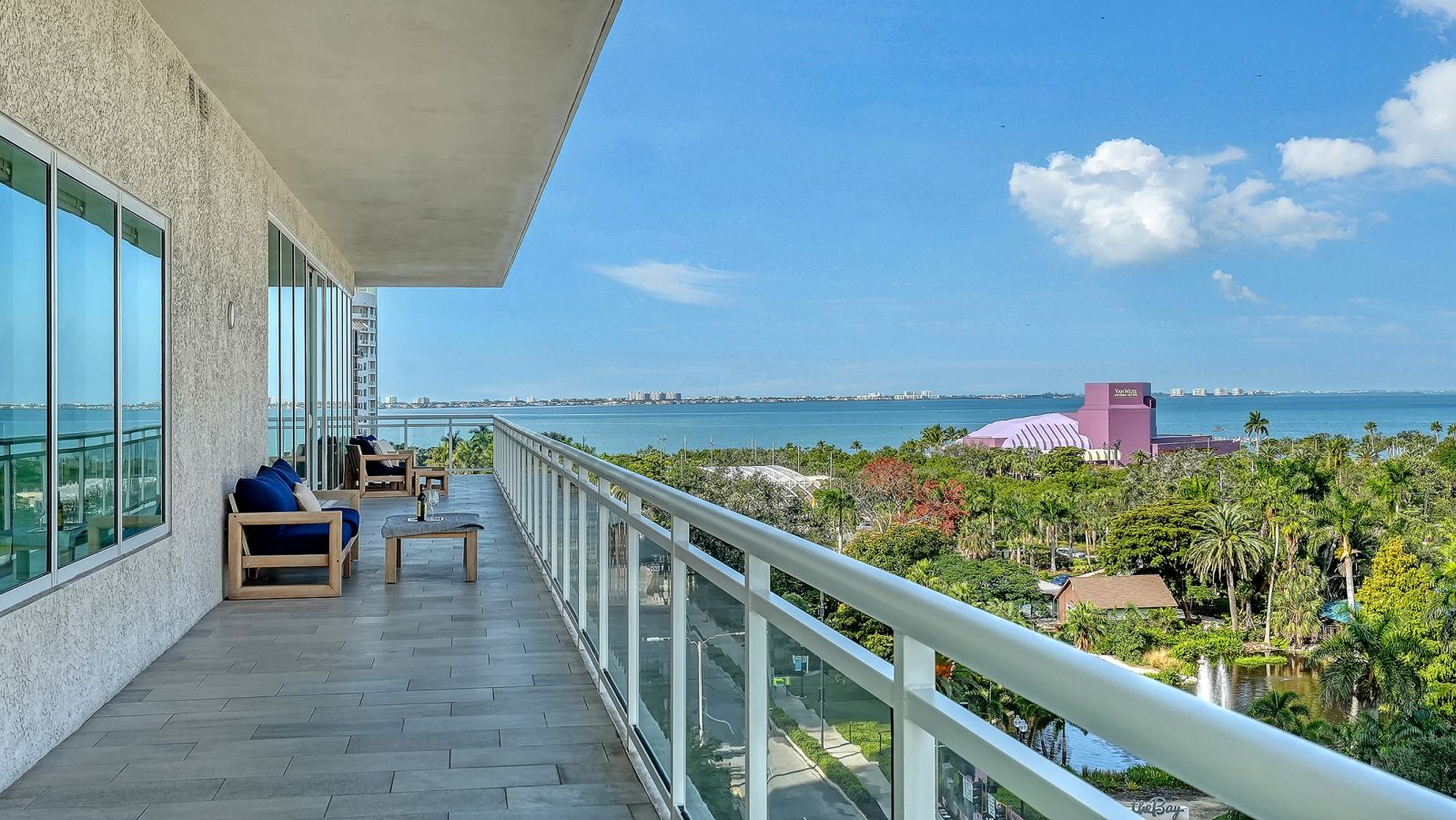 Enjoy refined elevated Living at The BLVD offering more than a home--this northwest corner 4-bedroom unit delivers a premier vantage to Sarasota's spectacular bay and city skyline views from sunrise to sunset. Perfectly positioned in the Bayfront District, this modern masterpiece rises above the ordinary to bestow a stunning expression of Sarasota living. Expansive floor-to-ceiling glass along with a 1,356 sq ft wraparound balcony reveal sweeping unobstructed bay vistas and glittering city views. A private elevator entry introduces a flowing 3,698 sq ft layout with tons of natural light designed to showcase the view from nearly every space. The generous great room is designed for both comfort and entertaining, highlighted by soaring tray ceilings, a custom wooden slatwall, and wood-planked tile flooring. The kitchen serves as a striking focal point, blending refined cabinetry and a tailored tile backsplash for a clean, contemporary aesthetic. A quartz-clad island provides abundant workspace and storage, while premium Thermador appliances--including convection cooktop, built-in wall oven, wine refrigerator, and dual pantries with custom shelving--cater to both everyday living and elevated culinary pursuits. The primary suite offers a tranquil retreat, featuring two walk-in closets and a spa-inspired bath complete with a soaking tub and an expansive glass-enclosed shower featuring luxurious his-and-her Rain Head, enhanced with integrated steam for a spa-like retreat. An additional oversized bedroom suite currently used as a bonus room could become the primary bedroom. Two additional bedroom suites each enjoy private terrace access and indulgent en-suite baths. A stylish powder room and a well-appointed laundry room complete the interior.BLVD is an intimate, boutique residence with just forty-nine homes, distinguished by its curated, hotel-inspired amenities and full-time concierge services. Residents enjoy an elegant social lounge with service bar, a state-of-the-art fitness center, conference facilities, a temperature-controlled wine room with private secured storage, an indoor driving range, and a dedicated dog grooming suite. An expansive outdoor terrace provides additional lounge spaces and thoughtfully designed pet amenities. At the pinnacle of the building, Sarasota's premier rooftop retreat offers an unmatched setting for relaxation and entertaining, featuring a stunning zero-horizon pool, inviting lounge areas, a covered summer kitchen, and a fire pit overlooking the bay. Residence 701 reflects the very essence of the Sarasota lifestyle--where refined luxury and effortless sophistication converge. And COMING SOON - 1000 NORTH Sarasota, an exclusive members-only club located on the bottom floor of the BLVD and centered in the heart of the city's cultural corridor. This private retreat will offer refined dining and handcrafted cocktails. From waterfront strolls and acclaimed dining to world-class arts and cultural events just moments away, BLVD is as much a destination as it is a home.