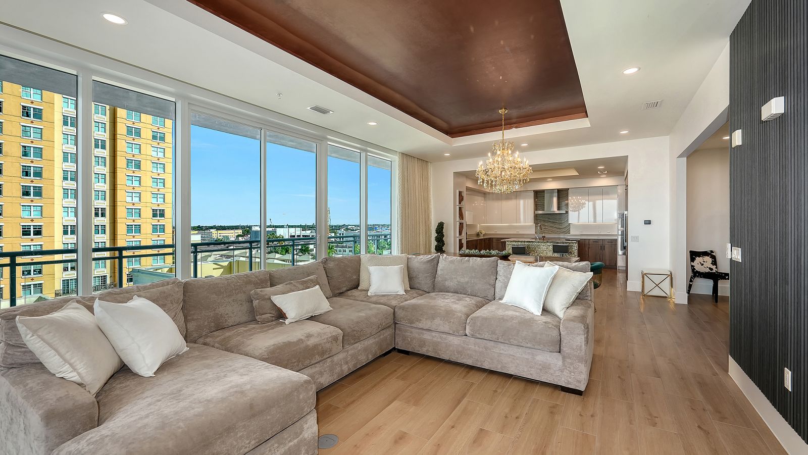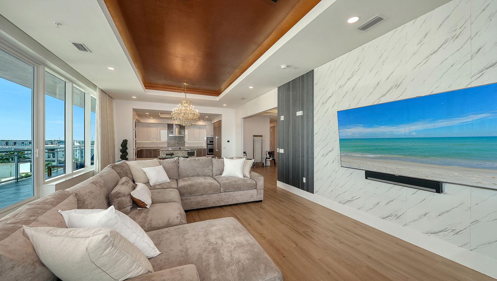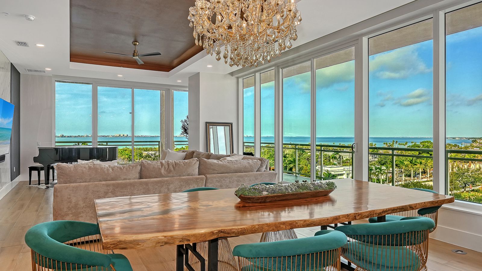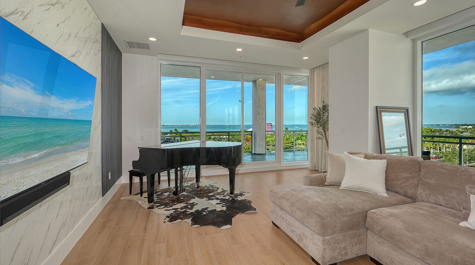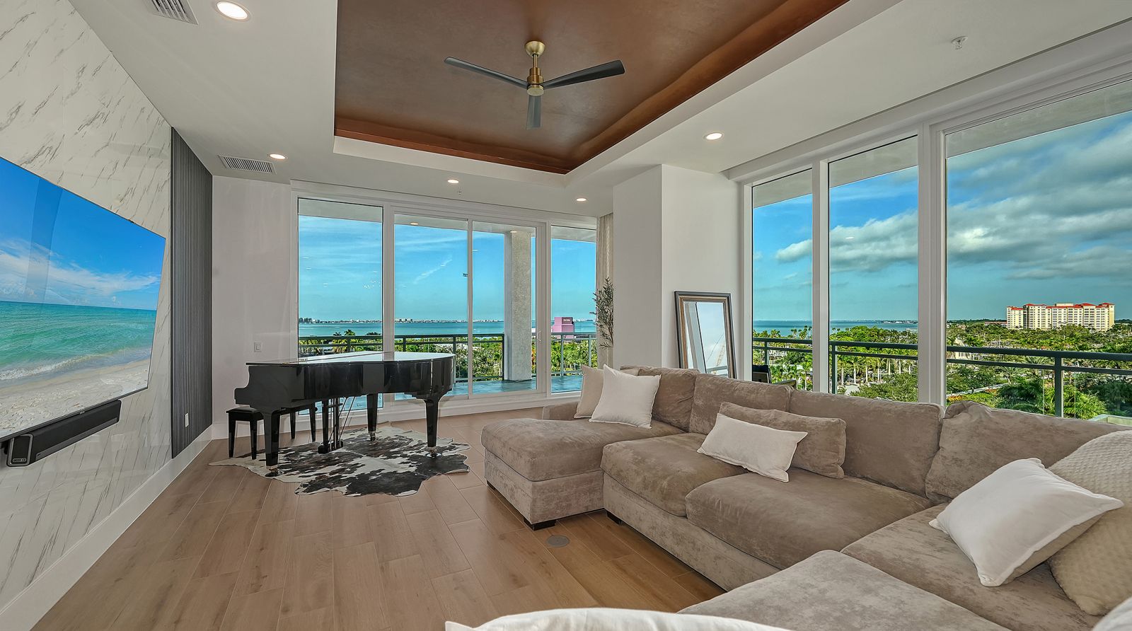 Enjoy refined elevated Living at The BLVD offering more than a home--this northwest corner 4-bedroom unit delivers a premier vantage to Sarasota's spectacular bay and city skyline views from sunrise to sunset. Perfectly positioned in the Bayfront District, this modern masterpiece rises above the ordinary to bestow a stunning expression of Sarasota living. Expansive floor-to-ceiling glass along with a 1,356 sq ft wraparound balcony reveal sweeping unobstructed bay vistas and glittering city views. A private elevator entry introduces a flowing 3,698 sq ft layout with tons of natural light designed to showcase the view from nearly every space. The generous great room is designed for both comfort and entertaining, highlighted by soaring tray ceilings, a custom wooden slatwall, and wood-planked tile flooring. The kitchen serves as a striking focal point, blending refined cabinetry and a tailored tile backsplash for a clean, contemporary aesthetic. A quartz-clad island provides abundant workspace and storage, while premium Thermador appliances--including convection cooktop, built-in wall oven, wine refrigerator, and dual pantries with custom shelving--cater to both everyday living and elevated culinary pursuits. The primary suite offers a tranquil retreat, featuring two walk-in closets and a spa-inspired bath complete with a soaking tub and an expansive glass-enclosed shower featuring luxurious his-and-her Rain Head, enhanced with integrated steam for a spa-like retreat. An additional oversized bedroom suite currently used as a bonus room could become the primary bedroom. Two additional bedroom suites each enjoy private terrace access and indulgent en-suite baths. A stylish powder room and a well-appointed laundry room complete the interior.BLVD is an intimate, boutique residence with just forty-nine homes, distinguished by its curated, hotel-inspired amenities and full-time concierge services. Residents enjoy an elegant social lounge with service bar, a state-of-the-art fitness center, conference facilities, a temperature-controlled wine room with private secured storage, an indoor driving range, and a dedicated dog grooming suite. An expansive outdoor terrace provides additional lounge spaces and thoughtfully designed pet amenities. At the pinnacle of the building, Sarasota's premier rooftop retreat offers an unmatched setting for relaxation and entertaining, featuring a stunning zero-horizon pool, inviting lounge areas, a covered summer kitchen, and a fire pit overlooking the bay. Residence 701 reflects the very essence of the Sarasota lifestyle--where refined luxury and effortless sophistication converge. And COMING SOON - 1000 NORTH Sarasota, an exclusive members-only club located on the bottom floor of the BLVD and centered in the heart of the city's cultural corridor. This private retreat will offer refined dining and handcrafted cocktails. From waterfront strolls and acclaimed dining to world-class arts and cultural events just moments away, BLVD is as much a destination as it is a home.