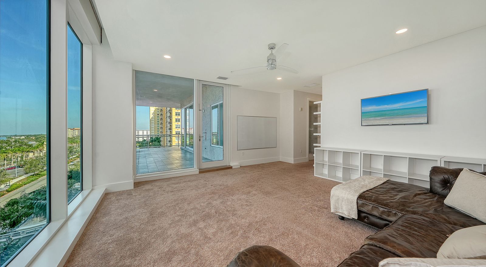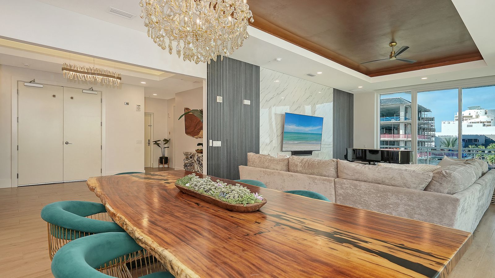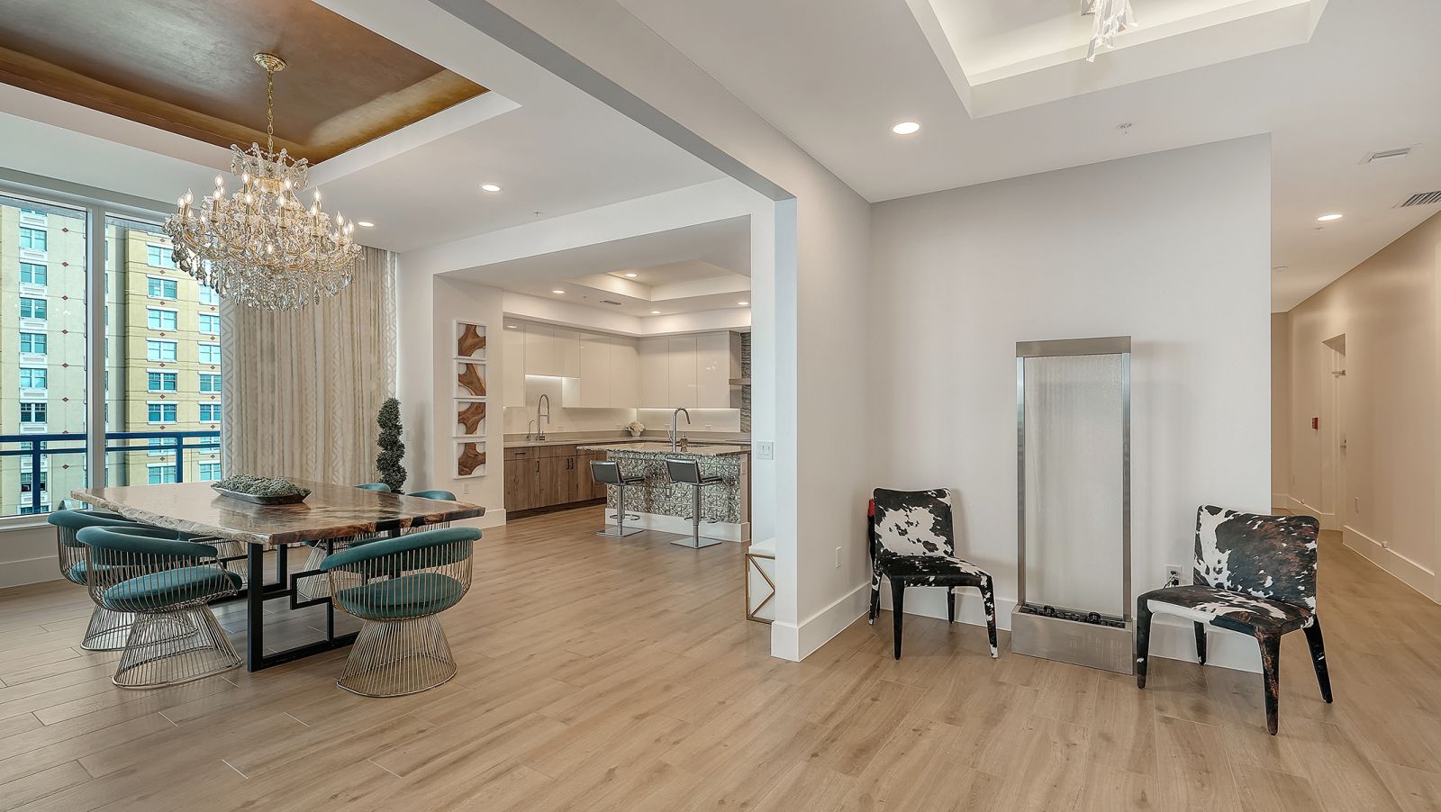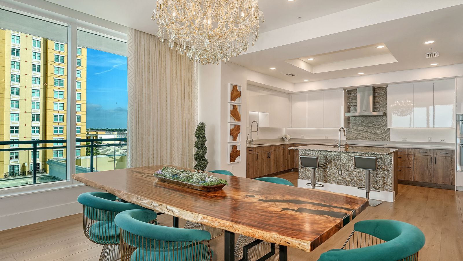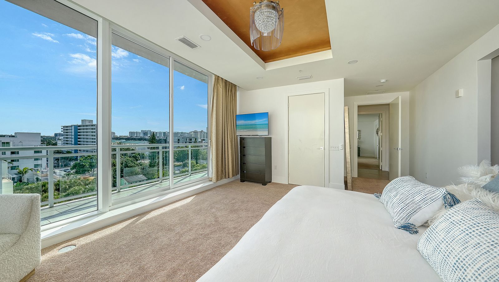 Enjoy refined elevated Living at The BLVD offering more than a home--this northwest corner 4-bedroom unit delivers a premier vantage to Sarasota's spectacular bay and city skyline views from sunrise to sunset. Perfectly positioned in the Bayfront District, this modern masterpiece rises above the ordinary to bestow a stunning expression of Sarasota living. Expansive floor-to-ceiling glass along with a 1,356 sq ft wraparound balcony reveal sweeping unobstructed bay vistas and glittering city views. A private elevator entry introduces a flowing 3,698 sq ft layout with tons of natural light designed to showcase the view from nearly every space. The generous great room is designed for both comfort and entertaining, highlighted by soaring tray ceilings, a custom wooden slatwall, and wood-planked tile flooring. The kitchen serves as a striking focal point, blending refined cabinetry and a tailored tile backsplash for a clean, contemporary aesthetic. A quartz-clad island provides abundant workspace and storage, while premium Thermador appliances--including convection cooktop, built-in wall oven, wine refrigerator, and dual pantries with custom shelving--cater to both everyday living and elevated culinary pursuits. The primary suite offers a tranquil retreat, featuring two walk-in closets and a spa-inspired bath complete with a soaking tub and an expansive glass-enclosed shower featuring luxurious his-and-her Rain Head, enhanced with integrated steam for a spa-like retreat. An additional oversized bedroom suite currently used as a bonus room could become the primary bedroom. Two additional bedroom suites each enjoy private terrace access and indulgent en-suite baths. A stylish powder room and a well-appointed laundry room complete the interior.BLVD is an intimate, boutique residence with just forty-nine homes, distinguished by its curated, hotel-inspired amenities and full-time concierge services. Residents enjoy an elegant social lounge with service bar, a state-of-the-art fitness center, conference facilities, a temperature-controlled wine room with private secured storage, an indoor driving range, and a dedicated dog grooming suite. An expansive outdoor terrace provides additional lounge spaces and thoughtfully designed pet amenities. At the pinnacle of the building, Sarasota's premier rooftop retreat offers an unmatched setting for relaxation and entertaining, featuring a stunning zero-horizon pool, inviting lounge areas, a covered summer kitchen, and a fire pit overlooking the bay. Residence 701 reflects the very essence of the Sarasota lifestyle--where refined luxury and effortless sophistication converge. And COMING SOON - 1000 NORTH Sarasota, an exclusive members-only club located on the bottom floor of the BLVD and centered in the heart of the city's cultural corridor. This private retreat will offer refined dining and handcrafted cocktails. From waterfront strolls and acclaimed dining to world-class arts and cultural events just moments away, BLVD is as much a destination as it is a home.