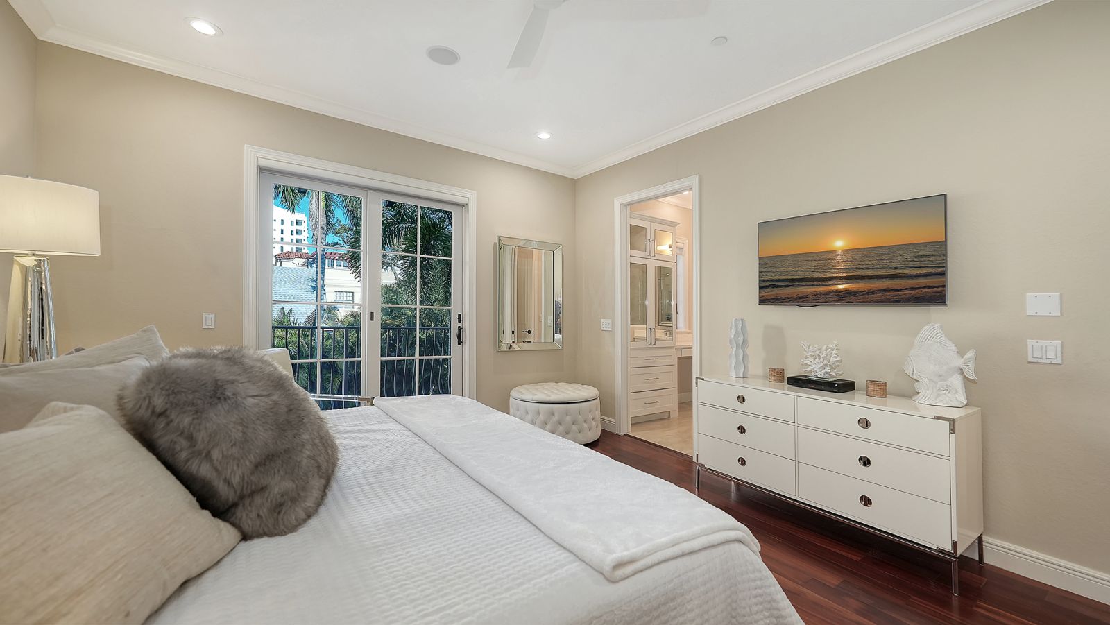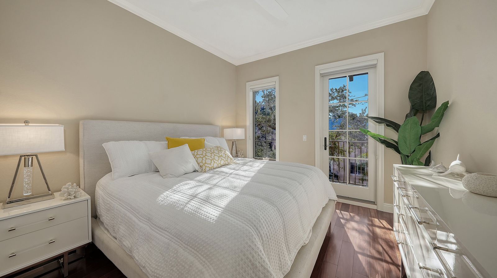 Located in the heart of Sarasota's iconic Burns Court, this three-bedroom, two-story residence at Burns Court Villas offers the privacy and comfort of a single-family home with the walkability and energy of downtown just outside your door. Spanning more than 1,900 square feet, the thoughtfully designed layout is enhanced by multiple outdoor living spaces--including the largest private courtyard in the community and three private bedroom balconies.A solid mahogany front door opens to refined interiors featuring travertine flooring, high ceilings, crown molding, and abundant natural light filtered through impact-rated windows and doors. The main level flows seamlessly from the living room--anchored by a gas fireplace and custom built-ins--to the formal dining area and sunlit family room overlooking the lush courtyard, creating an ideal setting for entertaining or everyday living.The gourmet kitchen, remodeled in 2023, is equipped with custom wood cabinetry with soft-close drawers and pull-out storage, under-cabinet lighting, and thick quartz countertops. The extended island offers room for dining in. Premium appliances include a Sub-Zero refrigerator, Viking gas range, hood and range, and Miele dishwasher. Upgraded LED lighting enhances both function and atmosphere throughout the home.Upstairs, Brazilian cherry engineered hardwood flooring leads to a serene primary suite with a private balcony, custom walk-in closet, and a fully renovated en-suite bath (2025) featuring dual vanities topped with quartz counters, a tile-and-glass walk-in shower with built-in bench seating, and a dedicated makeup area. Two additional guest suites--each with its own balcony--share a beautifully reimagined full bath with high-end finishes. A second-floor laundry room with storage cabinetry adds everyday convenience.Residents of Burns Court Villas enjoy a tranquil, gated setting with trellised stone walkways, a heated courtyard pool and spa, lounge area with outdoor fireplace, secure parking, and enhanced perimeter security with fob-access gates.Perfectly positioned moments from Downtown Sarasota, this residence places you in an ideal walkable location to Sarasota's Cultural Coast. Enjoy the convenience of city living, near the Bayfront, Marina Jack, theaters, museums, galleries, farmers markets, and acclaimed dining along Main Street. St. Armands Circle, Lido Beach, and Sarasota's Gulf beaches are just minutes away, offering the ideal balance of cultural vibrancy and coastal living.A rare opportunity to enjoy refined city living within one of Sarasota's most distinctive downtown enclaves.