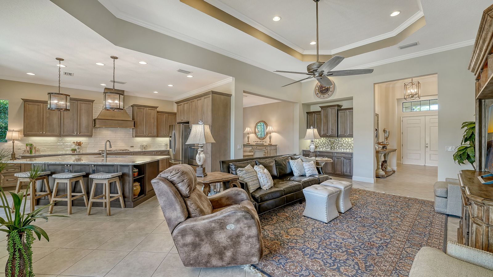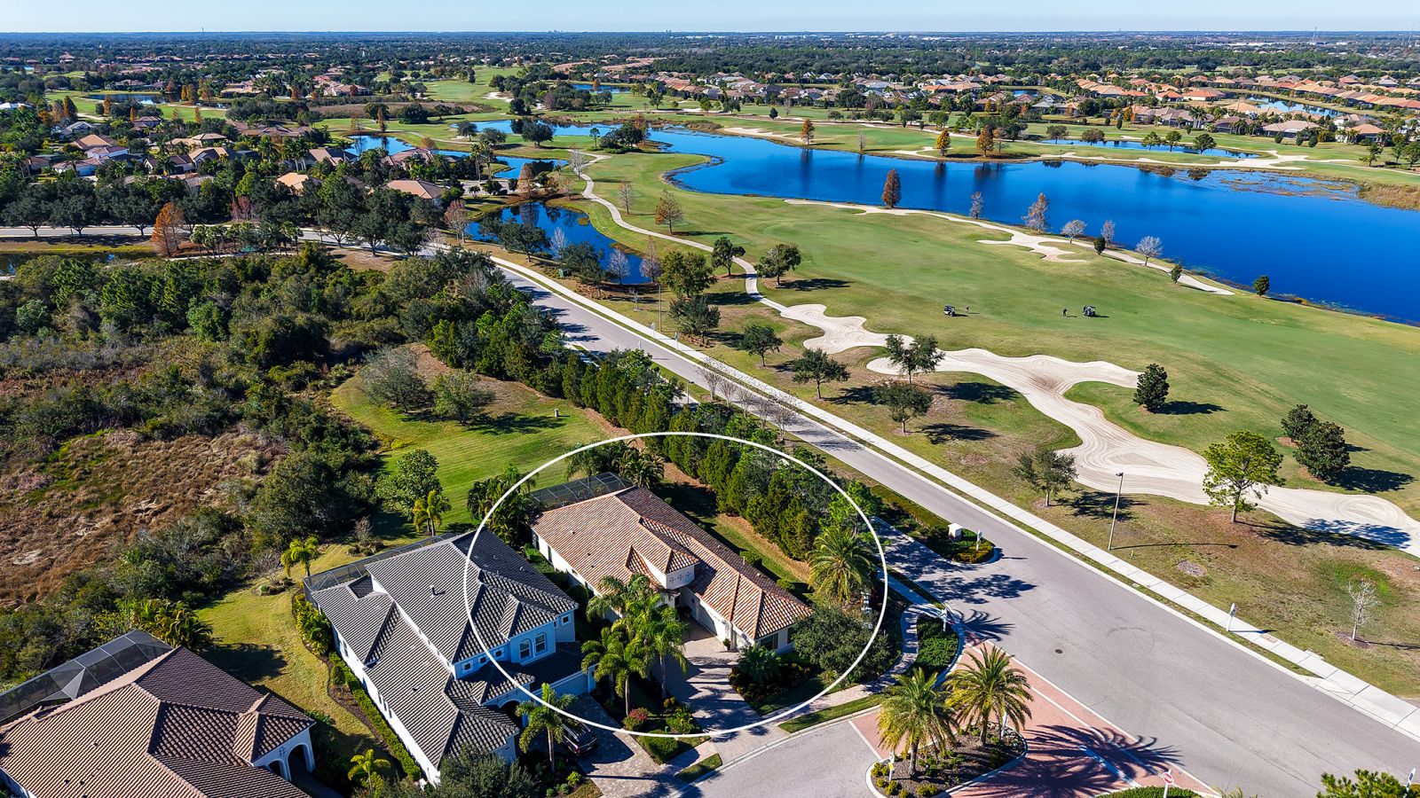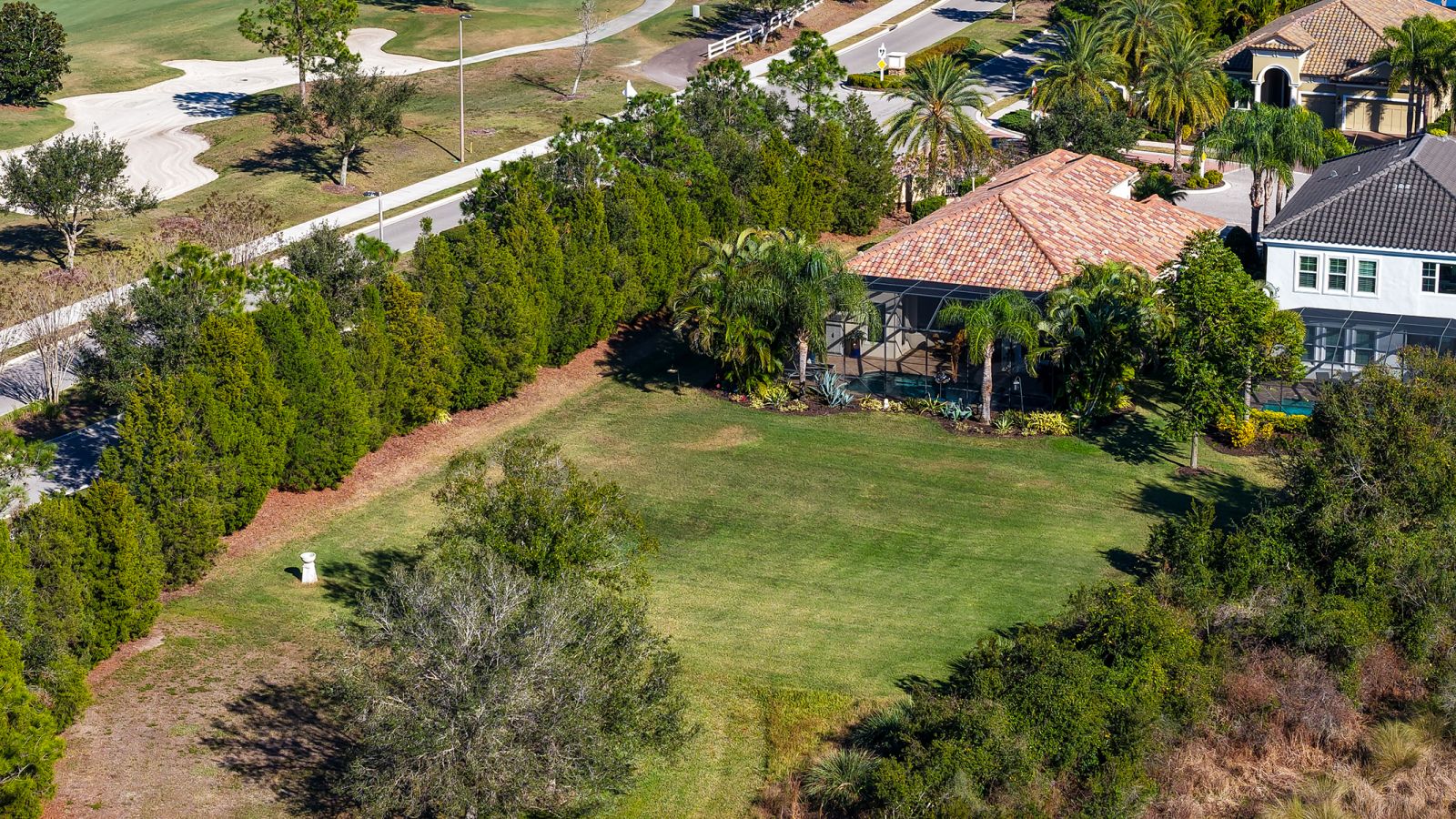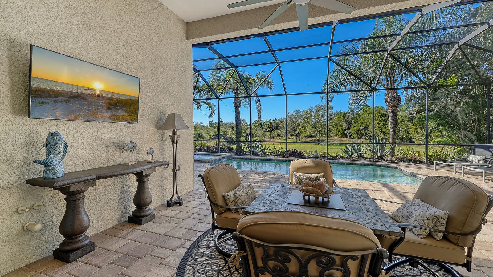 Privately positioned on an oversized homesite within the gated enclave of Country Club East, this beautifully appointed three-bedroom, 3.5-bath residence with a private office enjoys tranquil preserve views that create a serene, park-like backdrop for everyday living. The setting offers a rare sense of space and privacy while embracing the best of Florida's indoor-outdoor lifestyle.A welcoming entry through double front doors introduces a light-filled interior where a private office with double doors sits just off the foyer. The open great room is designed for both comfort and entertaining, highlighted by soaring ceilings, tray accents, and a sleek wet bar with stone countertop. Large sliding glass doors frame peaceful preserve views and lead seamlessly to the lanai beyond.The chef's kitchen is thoughtfully designed with rich wood cabinetry, stone countertops, stainless steel appliances, upgraded lighting, and a generous island with breakfast bar. A built-in desk tucked beside a picture window provides a charming workspace with views of the surrounding greenery, while the formal dining area with crown molding and designer lighting sets the stage for memorable gatherings.The primary suite is a true retreat, featuring luxury vinyl plank flooring, plantation shutters, a tray ceiling, and two walk-in closets. The spa-inspired bath offers split vanities, a beautifully tiled walk-in shower, and a private water closet. Two additional guest suites, each with its own bath, are positioned at the front of the home to ensure privacy for family and guests.Outdoor living takes center stage on the expansive lanai with a heated pool and spa, dedicated pool bath, and breathtaking sunset views over the preserve--ideal for relaxing or entertaining. Notable upgrades include a side-entry three -car garage, enhanced landscaping, a Culligan whole-house water system, sealed attic for energy efficiency, and more.Residents of Country Club East enjoy gated security, scenic walking trails, a fitness center, and multiple community pools, along with exclusive access to The Retreat and The Residents Club offering resort-style amenities, dining, and social spaces. Optional membership to Lakewood Ranch Golf & Country Club provides access to championship golf, tennis, pickleball, state-of-the-art fitness facilities, and multiple clubhouses.