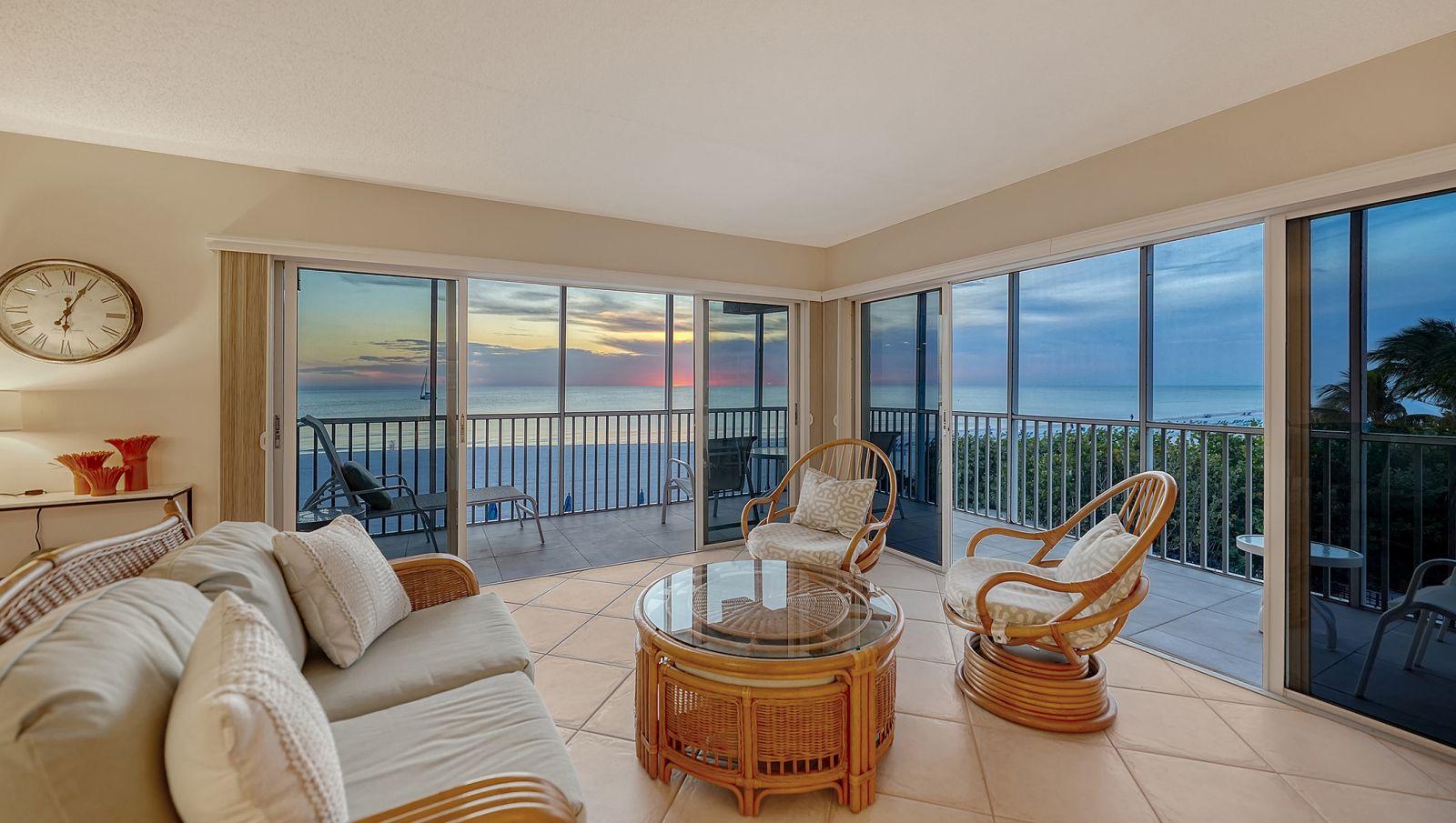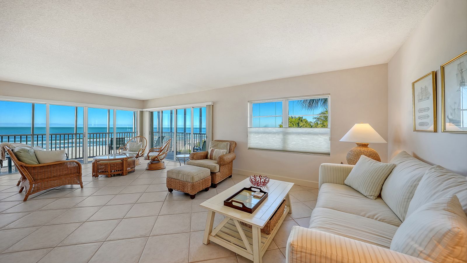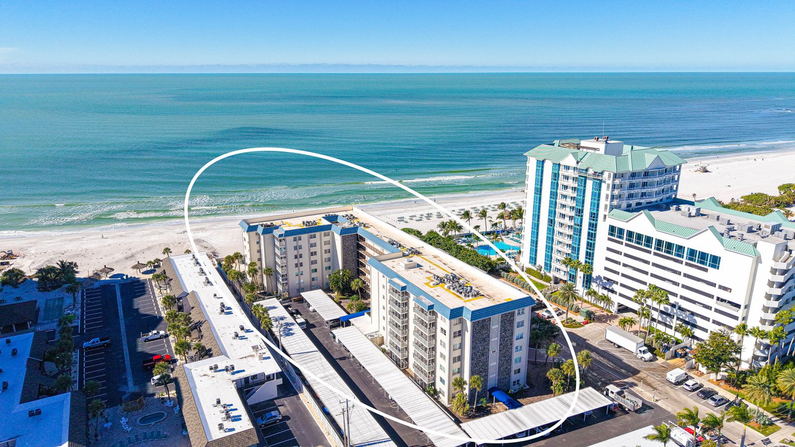Experience beachfront living in this rarely available northwest corner residence at Lido Ambassador. This 3rd floor end-unit offers unparalleled panoramic views of the Gulf and beach, creating an extraordinary backdrop from every main living space. The residence features two bedrooms and two bathrooms encompassing 1,350 sq. ft. of interior living space complemented by a wraparound screened balcony that seamlessly blends indoor and outdoor living. Natural light fills the home, showcasing an open-concept layout that transitions from the entry area into the spacious great room overlooking the beachfront balcony. This thoughtful design is perfect for both entertaining guests and enjoying peaceful evenings at home, with endless beach views. The kitchen features Corian countertops, light colored cabinetry, generous storage all anchored by a trey ceiling. The primary suite offers a walk-in closet and an en-suite bath, while the guest bedroom and bath provide a private retreat for visitors. Lido Ambassador is a well-managed community known for its maintained grounds and attentive upkeep. Residents enjoy access to a Gulf-front pool and sun deck, which is currently undergoing a full renovation, to create a refreshed, resort-style atmosphere. And for added peace of mind, the roof of the building is brand new. Additional amenities include a fitness center, catering kitchen, outdoor grills, private storage, and one assigned covered parking space. The location is simply phenomenal. Nestled on the exclusive south end of Lido Key, the residence is steps from the Lido Beach Resort Tiki Bar and short distance from St. Armands Circle, Longboat Key, and with easy access to downtown Sarasota's arts and culture scene including the weekly farmer's market. Whether you are seeking a coastal getaway, investment opportunity, or full-time residence, this unit delivers exceptional location, and breathtaking views.
