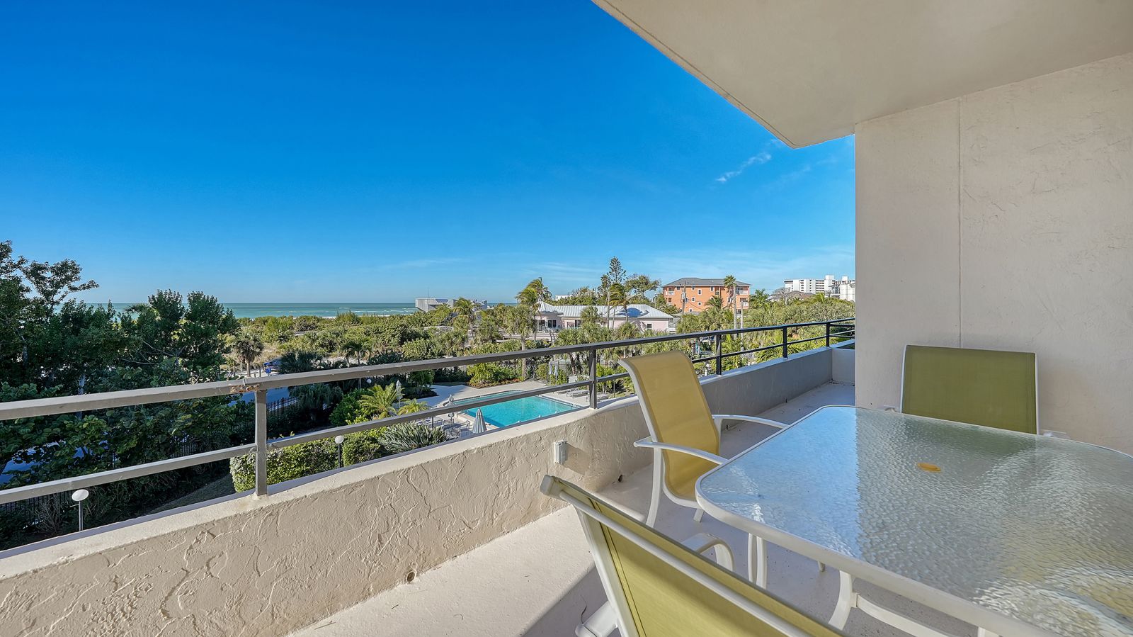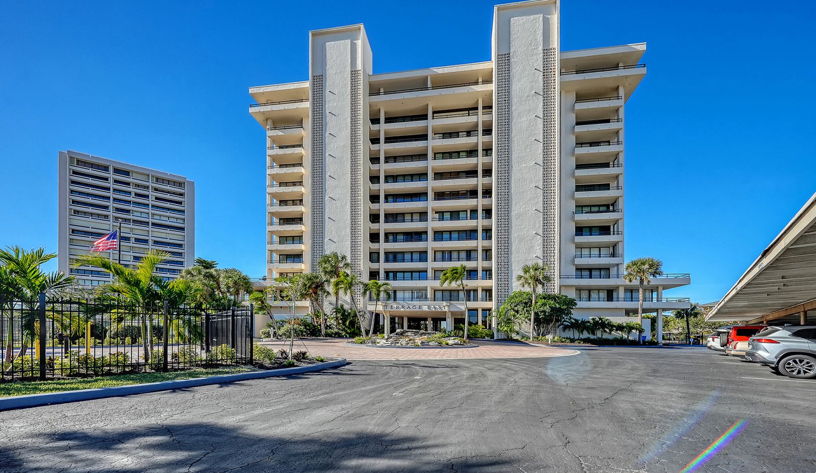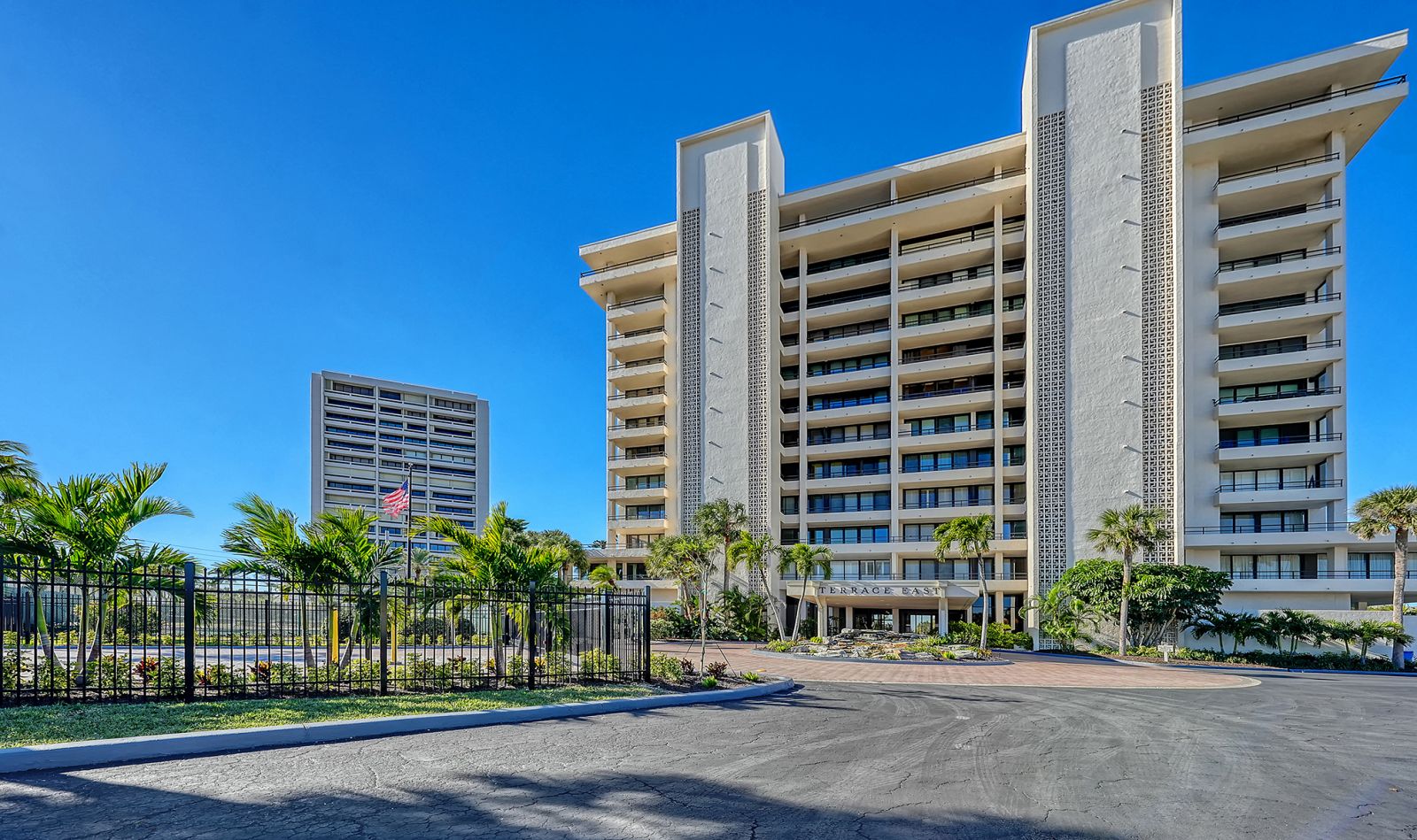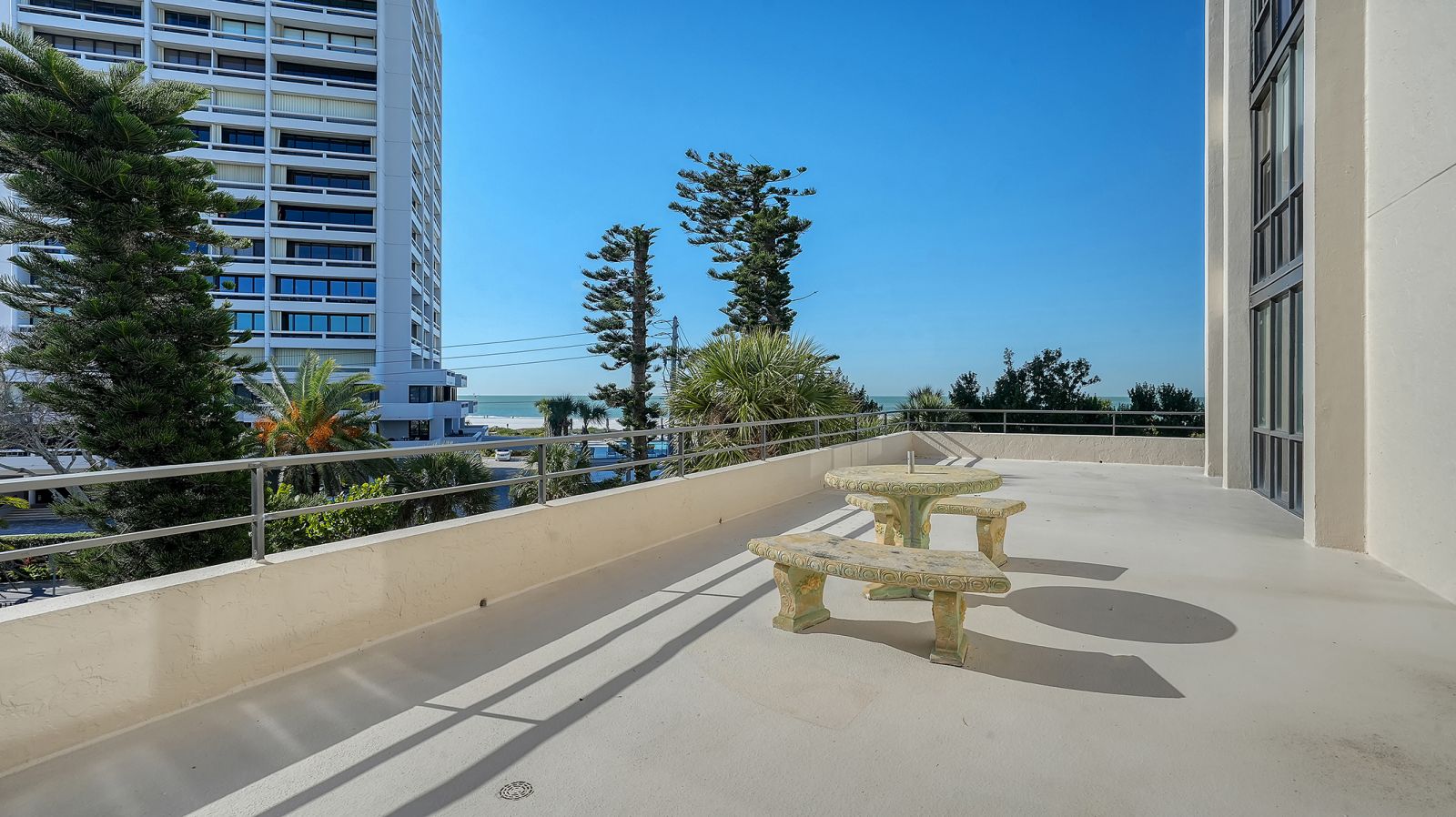 The ultimate beach condo with 270-degree views. Priceless. This beachy 1,446 square-foot 2-bedroom 2-bath corner residence offers a unique sunny, oversized corner, south-facing wraparound balcony with views of the beach, Gulf of Mexico and pool. Priceless. The unusual 1,130 square foot terrace is very special for alfresco dining, entertaining family and friends, parties, shuffleboard, play space, sunning and more, which is not available in other condos. From this incredible Siesta Key location you can walk out to the sugar-white sands of #1 Siesta Key beach for a relaxing swim in the azure-blue Gulf of Mexico, or get some exercise walking the 3 miles of beachfront, snorkel, paddleboard, or take your beach bike for a spin on the beach. Enjoy your morning coffee or a cocktail from your extensive terrace balconies while watching the colorful hues of the Florida sunrise and sunset without having to leave your condo. For a more lively experience, take a short stroll into quaint Siesta Village and indulge in the fun shops, restaurants and bars. The floor plan flows from the balcony on the beachside all the way through to the back of the building with sliding glass doors leading to both balconies and views looking east over Siesta Village and west over the Gulf of Mexico. The elevator services only two condos per floor with an updated private foyer and private laundry facilities for two condos. The Terrace East has a modern updated lobby and social room, newly refinished pool with new grills & refrigerator, new pool furniture, new roof in 2025, and equipped fitness center. All the fixed windows in all the condos will be replaced by the association by January 2028. This is a secure gated building with onsite full-time manager and maintenance man, very well-run association with active board and no current special assessments, and secure surveillance system. Amenities include a heated pool, a tennis court, pickleball, beautifully landscaped garden and grounds, and bicycle & paddleboard storage. Priceless!