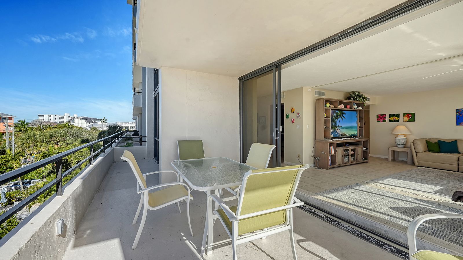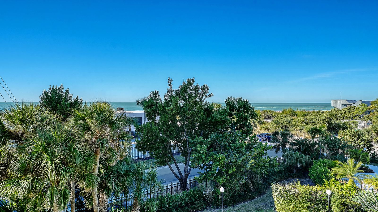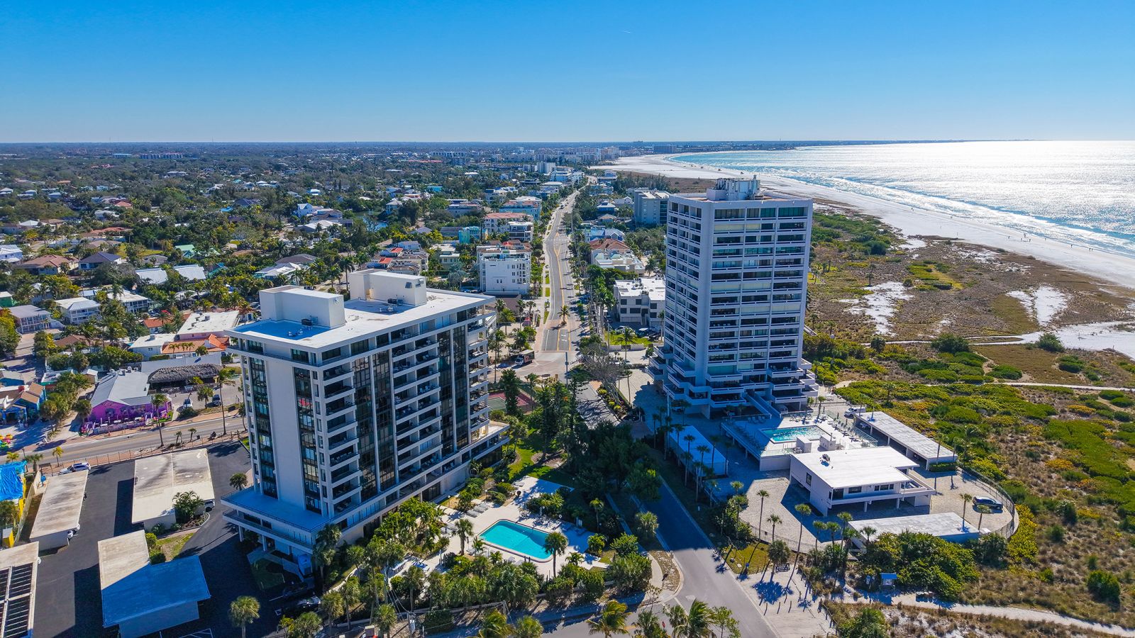 The ultimate beach condo with 270-degree views. Priceless. This beachy 1,446 square-foot 2-bedroom 2-bath corner residence offers a unique sunny, oversized corner, south-facing wraparound balcony with views of the beach, Gulf of Mexico and pool. Priceless. The unusual 1,130 square foot terrace is very special for alfresco dining, entertaining family and friends, parties, shuffleboard, play space, sunning and more, which is not available in other condos. From this incredible Siesta Key location you can walk out to the sugar-white sands of #1 Siesta Key beach for a relaxing swim in the azure-blue Gulf of Mexico, or get some exercise walking the 3 miles of beachfront, snorkel, paddleboard, or take your beach bike for a spin on the beach. Enjoy your morning coffee or a cocktail from your extensive terrace balconies while watching the colorful hues of the Florida sunrise and sunset without having to leave your condo. For a more lively experience, take a short stroll into quaint Siesta Village and indulge in the fun shops, restaurants and bars. The floor plan flows from the balcony on the beachside all the way through to the back of the building with sliding glass doors leading to both balconies and views looking east over Siesta Village and west over the Gulf of Mexico. The elevator services only two condos per floor with an updated private foyer and private laundry facilities for two condos. The Terrace East has a modern updated lobby and social room, newly refinished pool with new grills & refrigerator, new pool furniture, new roof in 2025, and equipped fitness center. All the fixed windows in all the condos will be replaced by the association by January 2028. This is a secure gated building with onsite full-time manager and maintenance man, very well-run association with active board and no current special assessments, and secure surveillance system. Amenities include a heated pool, a tennis court, pickleball, beautifully landscaped garden and grounds, and bicycle & paddleboard storage. Priceless!
