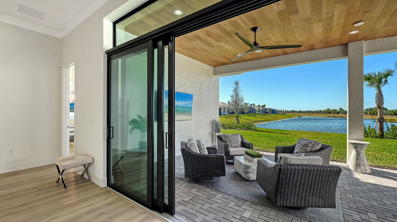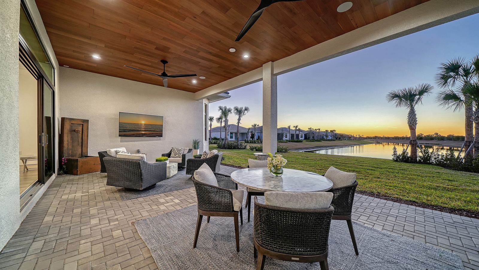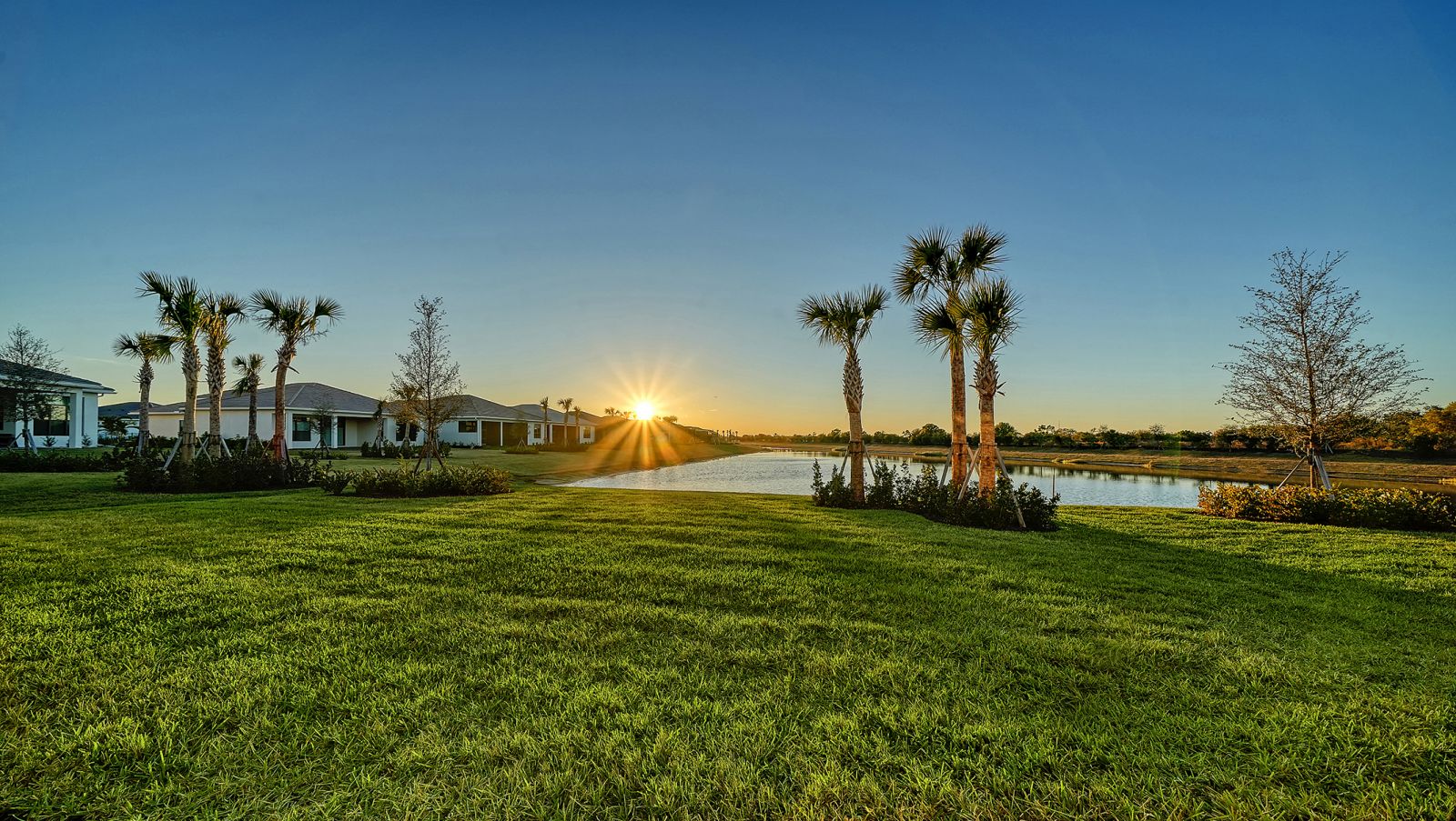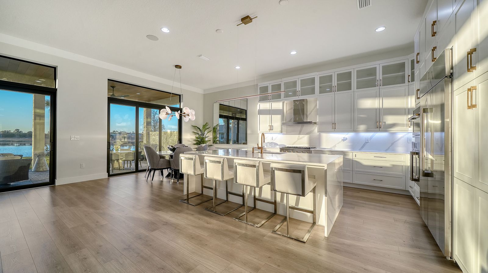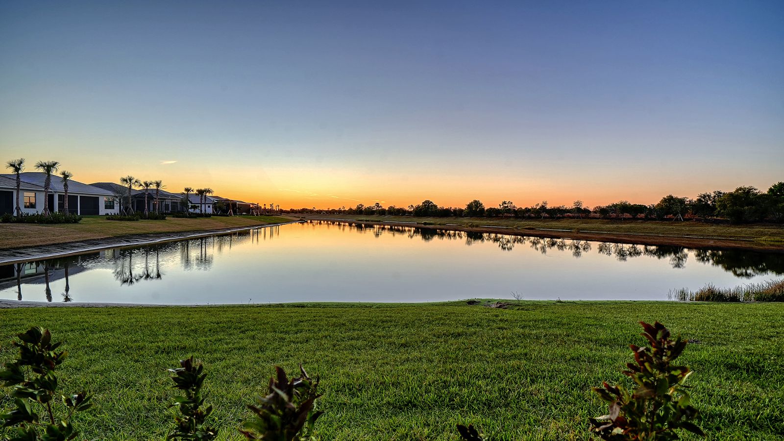 Sunsets become a daily celebration in this extraordinary lakefront residence, where architectural refinement, generous scale and serene water views come together in perfect harmony. Built in July 2025 and set within the gated Artistry Sarasota community, this newly constructed home offers 3,097+/- sq. ft. of thoughtfully designed interior space with an additional 600 sq. ft. of outdoor living, all positioned to capture western exposure and breathtaking evening skies across the horizon. From the moment you arrive, the home feels intentional and welcoming. Soaring high ceilings with tray accents, grand 8' doors and dramatic walls of glass create an atmosphere that feels refined yet relaxed. More than 30' of sliders with transoms frame the lake beyond and open directly from the great room to the extended covered lanai, allowing indoor and outdoor living to flow effortlessly. Morning light filters through the double-glass entry with transom while evenings glow with reflections dancing across the water. The flowing open floor plan centers around a beautifully appointed gourmet kitchen, featuring an expansive quartz waterfall island and quartz countertops that continue seamlessly into the backsplash. The white shaker style cabinetry with upgraded pull-out drawers and a second row of upper cabinets ensures ample storage. Beautiful, antique brushed gold accent hardware adds to the thoughtful design touches. For the Chef in the family, enjoy entertaining with the beautiful GE Monogram appliance suite that includes, a natural 36" gas cooktop with designer hood, a 30" built-in Advantium convection microwave, 30" professional french-door electronic convection wall oven, 48" built-in side-by-side double door refrigerator and the 30" fully integrated dishwasher with statement handle. A large office/den offers flexibility for work or retreat, while three bedrooms include two private ensuite accommodations ideal for guests or family. The primary suite overlooks the lake and sunset horizon, offering an expanded layout with angled windows, a spa-inspired bath with soaking tub, designer tile running from floor to ceiling, an oversized frameless shower with added bench, dual vanities, and a linen closet. Enjoy the oversized custom walk-in closet offering three-tiers of ample storage. More than $400k in builder upgrades enhance the home, including smart systems for HVAC, appliances, security, whole house audio, ceiling speakers, wi-fi extender, smart garage system and keyless entry. Added upgrades are the impact glass on all windows and doors, foam insulation, tankless water heater, custom laundry room, epoxy-finished three-car tandem garage, custom wood ceiling accents on the front porch and lanai, ceiling fans, recessed lighting with dimmers and pre-wired pool package and a beautiful summer kitchen being installed in February. Artistry is a true maintenance-free lifestyle with NO CDD fees, and the HOA fee also covers lawn maintenance, mulching, irrigation and 2 secured gated entrances. Enjoy the resort-style clubhouse, fitness and yoga studio, heated saltwater pool, pickleball and basketball courts as well as miles of scenic walking trails. Conveniently located near Sarasota's most desirable destinations for fine dining, shopping, world renowned culture, world-class beaches as well as the nearby Lakewood Ranch, Waterside and several top-ranked Golf courses.