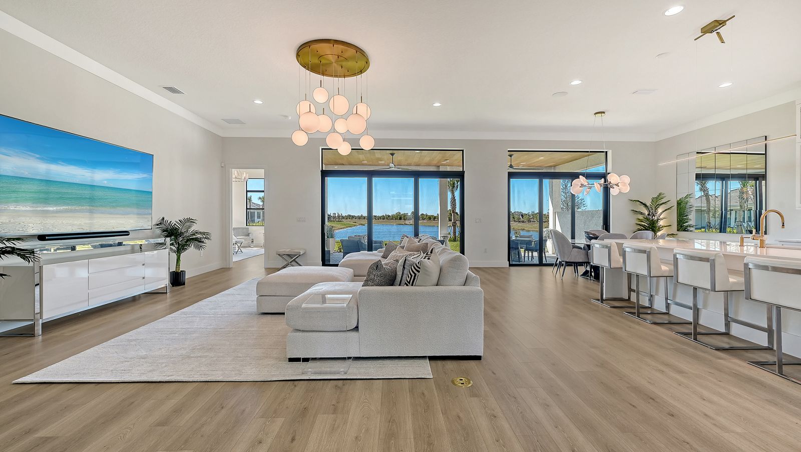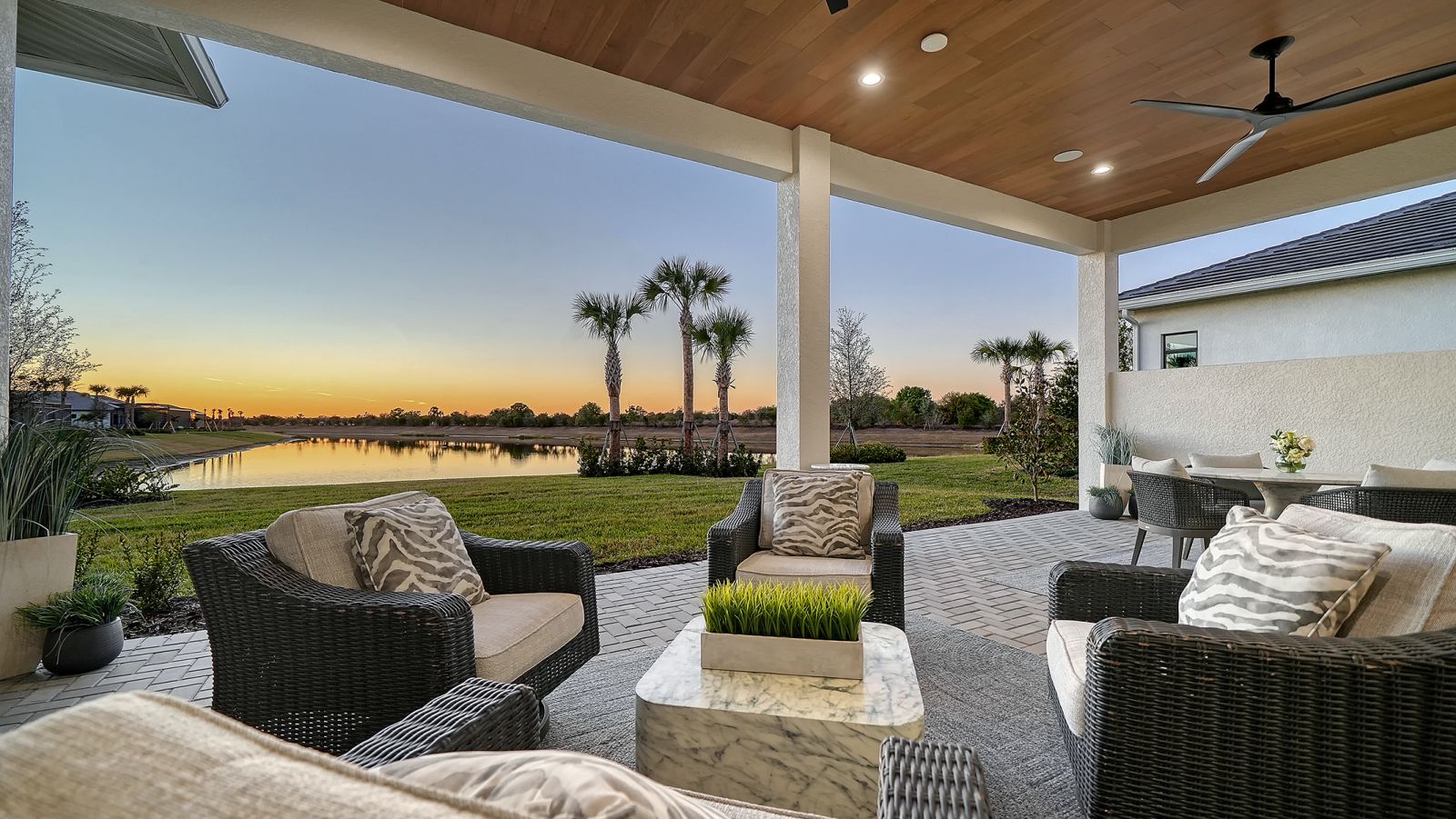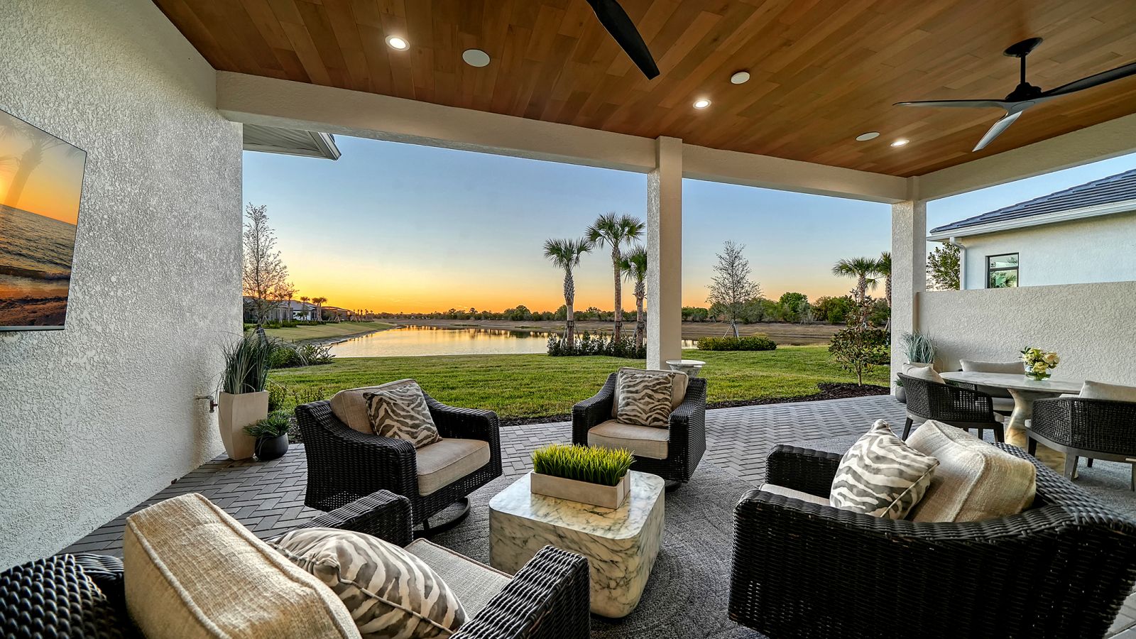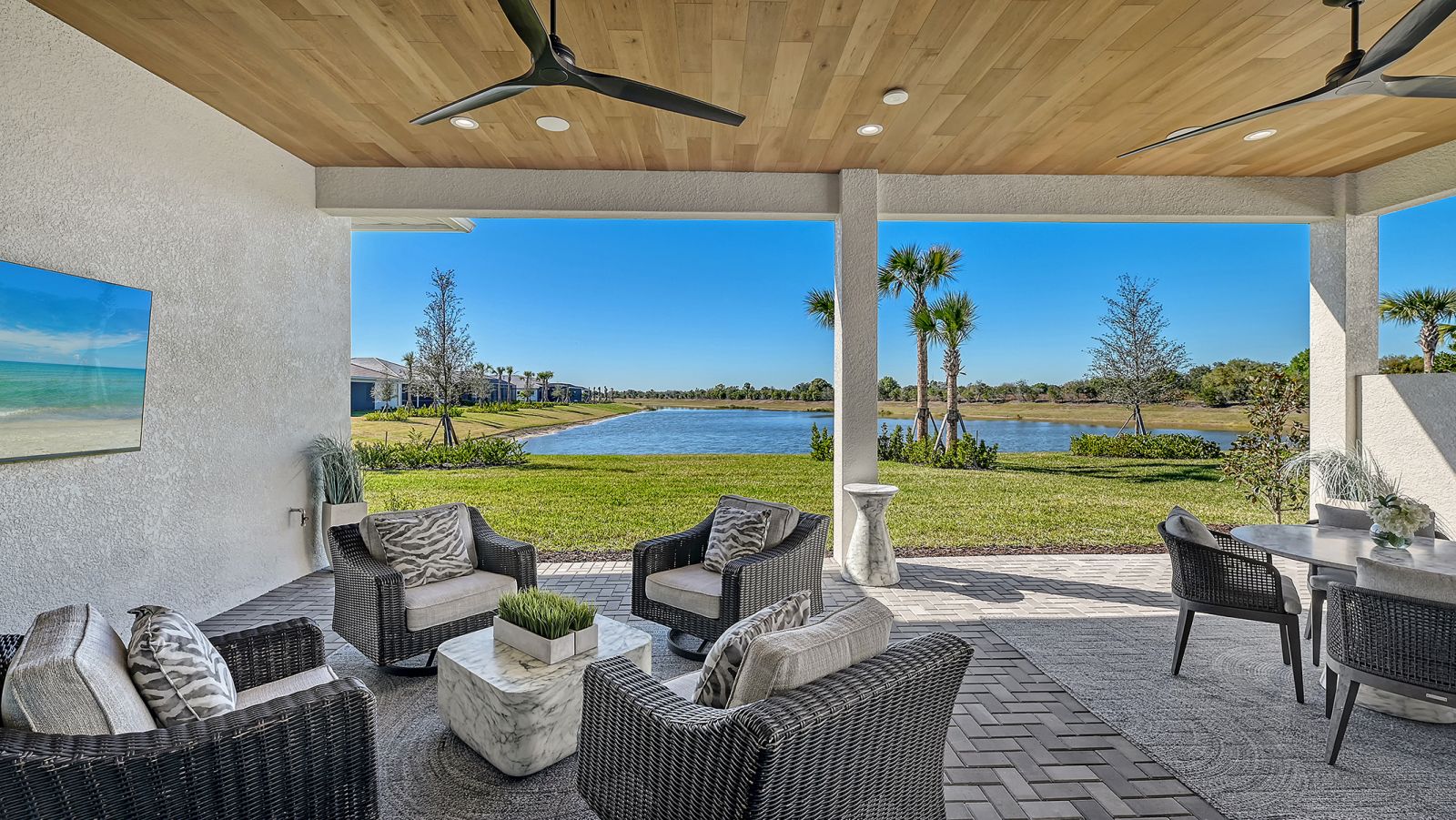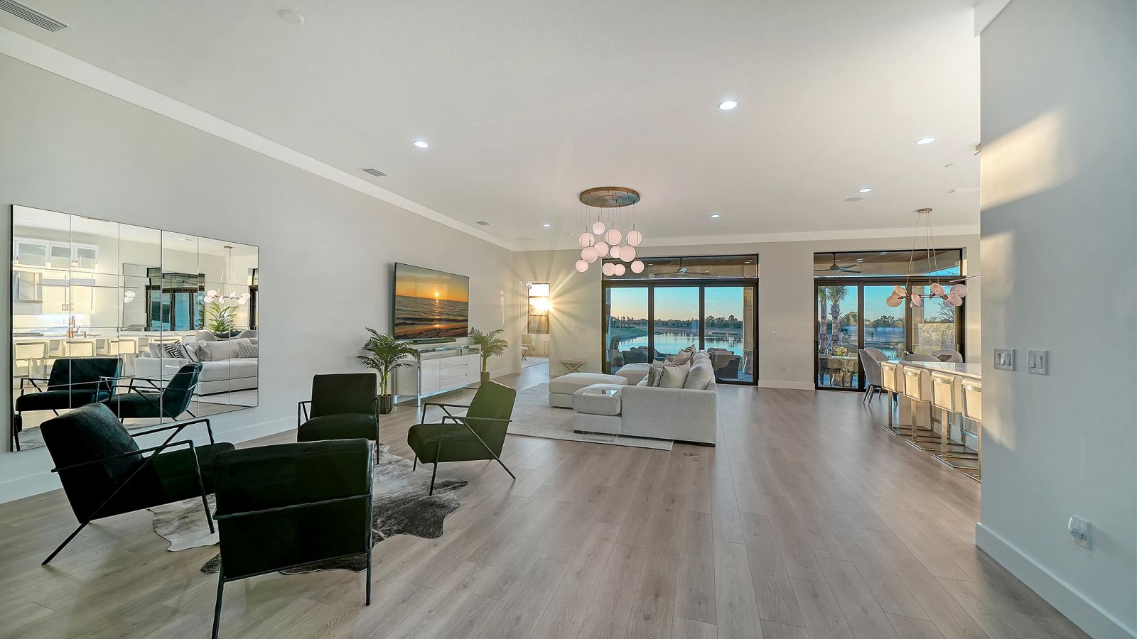 Sunsets become a daily celebration in this extraordinary lakefront residence, where architectural refinement, generous scale and serene water views come together in perfect harmony. Built in July 2025 and set within the gated Artistry Sarasota community, this newly constructed home offers 3,097+/- sq. ft. of thoughtfully designed interior space with an additional 600 sq. ft. of outdoor living, all positioned to capture western exposure and breathtaking evening skies across the horizon. From the moment you arrive, the home feels intentional and welcoming. Soaring high ceilings with tray accents, grand 8' doors and dramatic walls of glass create an atmosphere that feels refined yet relaxed. More than 30' of sliders with transoms frame the lake beyond and open directly from the great room to the extended covered lanai, allowing indoor and outdoor living to flow effortlessly. Morning light filters through the double-glass entry with transom while evenings glow with reflections dancing across the water. The flowing open floor plan centers around a beautifully appointed gourmet kitchen, featuring an expansive quartz waterfall island and quartz countertops that continue seamlessly into the backsplash. The white shaker style cabinetry with upgraded pull-out drawers and a second row of upper cabinets ensures ample storage. Beautiful, antique brushed gold accent hardware adds to the thoughtful design touches. For the Chef in the family, enjoy entertaining with the beautiful GE Monogram appliance suite that includes, a natural 36" gas cooktop with designer hood, a 30" built-in Advantium convection microwave, 30" professional french-door electronic convection wall oven, 48" built-in side-by-side double door refrigerator and the 30" fully integrated dishwasher with statement handle. A large office/den offers flexibility for work or retreat, while three bedrooms include two private ensuite accommodations ideal for guests or family. The primary suite overlooks the lake and sunset horizon, offering an expanded layout with angled windows, a spa-inspired bath with soaking tub, designer tile running from floor to ceiling, an oversized frameless shower with added bench, dual vanities, and a linen closet. Enjoy the oversized custom walk-in closet offering three-tiers of ample storage. More than $400k in builder upgrades enhance the home, including smart systems for HVAC, appliances, security, whole house audio, ceiling speakers, wi-fi extender, smart garage system and keyless entry. Added upgrades are the impact glass on all windows and doors, foam insulation, tankless water heater, custom laundry room, epoxy-finished three-car tandem garage, custom wood ceiling accents on the front porch and lanai, ceiling fans, recessed lighting with dimmers and pre-wired pool package and a beautiful summer kitchen being installed in February. Artistry is a true maintenance-free lifestyle with NO CDD fees, and the HOA fee also covers lawn maintenance, mulching, irrigation and 2 secured gated entrances. Enjoy the resort-style clubhouse, fitness and yoga studio, heated saltwater pool, pickleball and basketball courts as well as miles of scenic walking trails. Conveniently located near Sarasota's most desirable destinations for fine dining, shopping, world renowned culture, world-class beaches as well as the nearby Lakewood Ranch, Waterside and several top-ranked Golf courses.