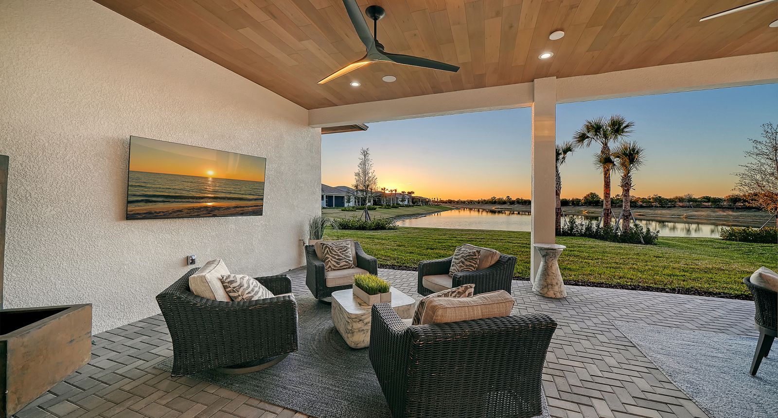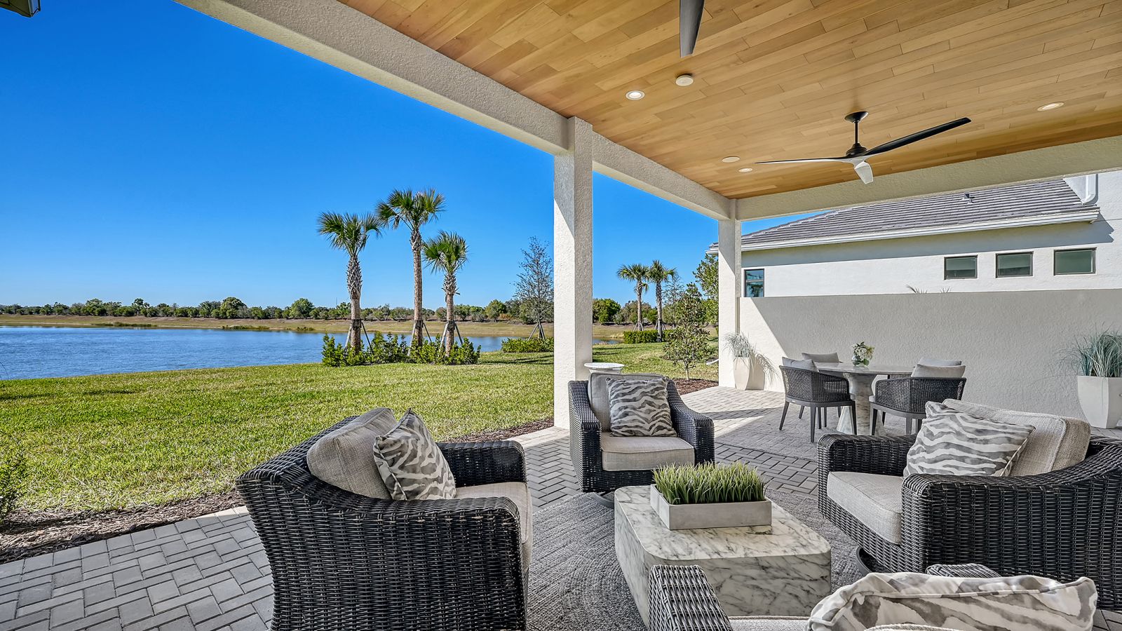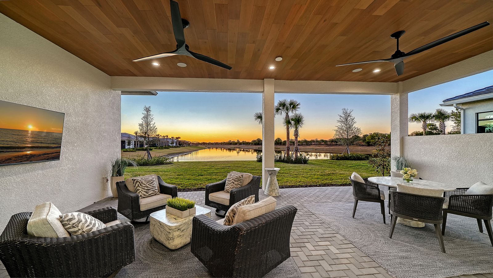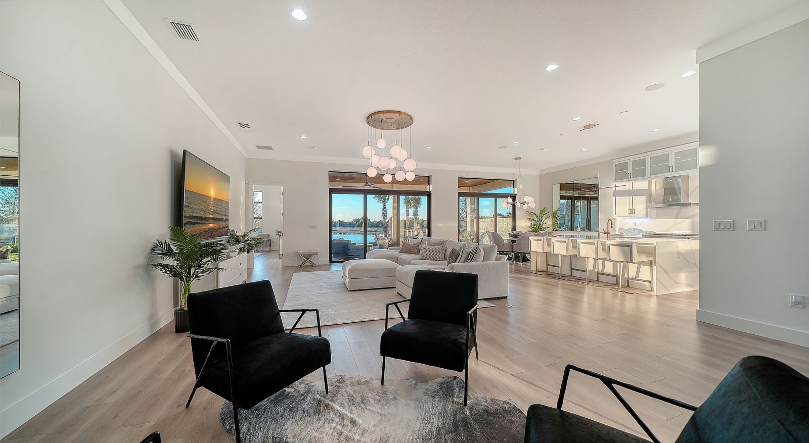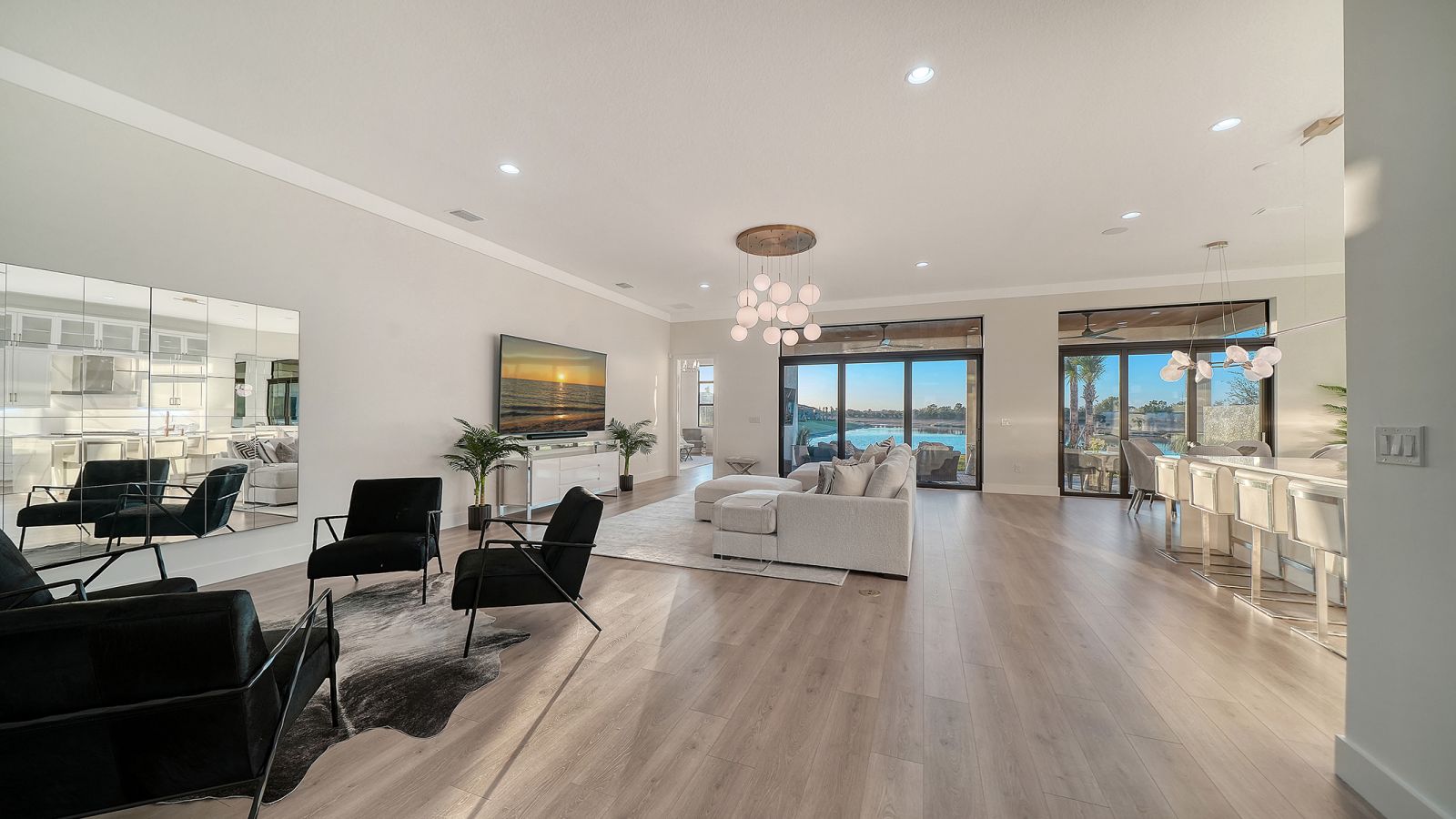 Sunsets become a daily celebration in this extraordinary lakefront residence, where architectural refinement, generous scale and serene water views come together in perfect harmony. Built in July 2025 and set within the gated Artistry Sarasota community, this newly constructed home offers 3,097+/- sq. ft. of thoughtfully designed interior space with an additional 600 sq. ft. of outdoor living, all positioned to capture western exposure and breathtaking evening skies across the horizon. From the moment you arrive, the home feels intentional and welcoming. Soaring high ceilings with tray accents, grand 8' doors and dramatic walls of glass create an atmosphere that feels refined yet relaxed. More than 30' of sliders with transoms frame the lake beyond and open directly from the great room to the extended covered lanai, allowing indoor and outdoor living to flow effortlessly. Morning light filters through the double-glass entry with transom while evenings glow with reflections dancing across the water. The flowing open floor plan centers around a beautifully appointed gourmet kitchen, featuring an expansive quartz waterfall island and quartz countertops that continue seamlessly into the backsplash. The white shaker style cabinetry with upgraded pull-out drawers and a second row of upper cabinets ensures ample storage. Beautiful, antique brushed gold accent hardware adds to the thoughtful design touches. For the Chef in the family, enjoy entertaining with the beautiful GE Monogram appliance suite that includes, a natural 36" gas cooktop with designer hood, a 30" built-in Advantium convection microwave, 30" professional french-door electronic convection wall oven, 48" built-in side-by-side double door refrigerator and the 30" fully integrated dishwasher with statement handle. A large office/den offers flexibility for work or retreat, while three bedrooms include two private ensuite accommodations ideal for guests or family. The primary suite overlooks the lake and sunset horizon, offering an expanded layout with angled windows, a spa-inspired bath with soaking tub, designer tile running from floor to ceiling, an oversized frameless shower with added bench, dual vanities, and a linen closet. Enjoy the oversized custom walk-in closet offering three-tiers of ample storage. More than $400k in builder upgrades enhance the home, including smart systems for HVAC, appliances, security, whole house audio, ceiling speakers, wi-fi extender, smart garage system and keyless entry. Added upgrades are the impact glass on all windows and doors, foam insulation, tankless water heater, custom laundry room, epoxy-finished three-car tandem garage, custom wood ceiling accents on the front porch and lanai, ceiling fans, recessed lighting with dimmers and pre-wired pool package and a beautiful summer kitchen being installed in February. Artistry is a true maintenance-free lifestyle with NO CDD fees, and the HOA fee also covers lawn maintenance, mulching, irrigation and 2 secured gated entrances. Enjoy the resort-style clubhouse, fitness and yoga studio, heated saltwater pool, pickleball and basketball courts as well as miles of scenic walking trails. Conveniently located near Sarasota's most desirable destinations for fine dining, shopping, world renowned culture, world-class beaches as well as the nearby Lakewood Ranch, Waterside and several top-ranked Golf courses.