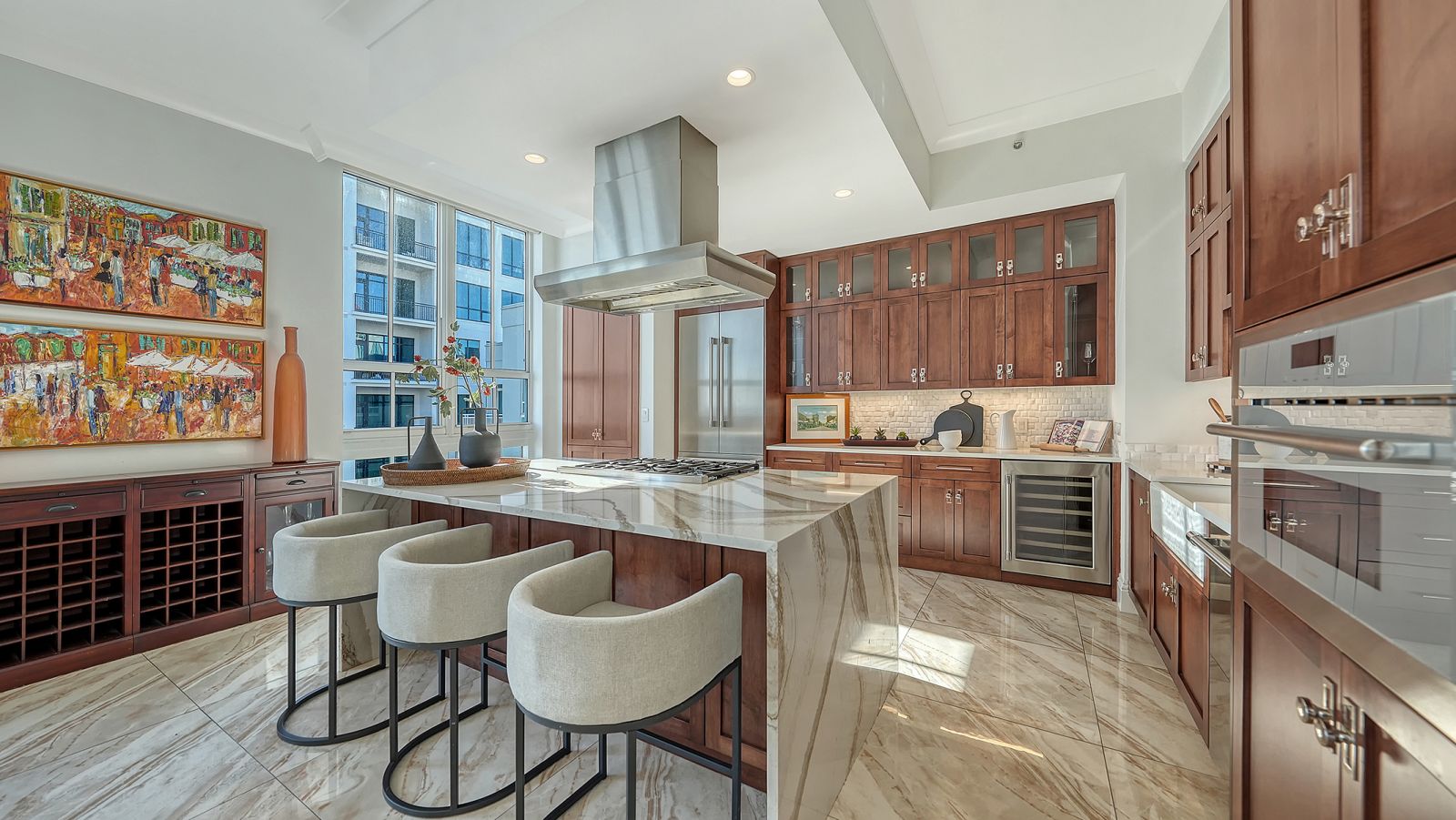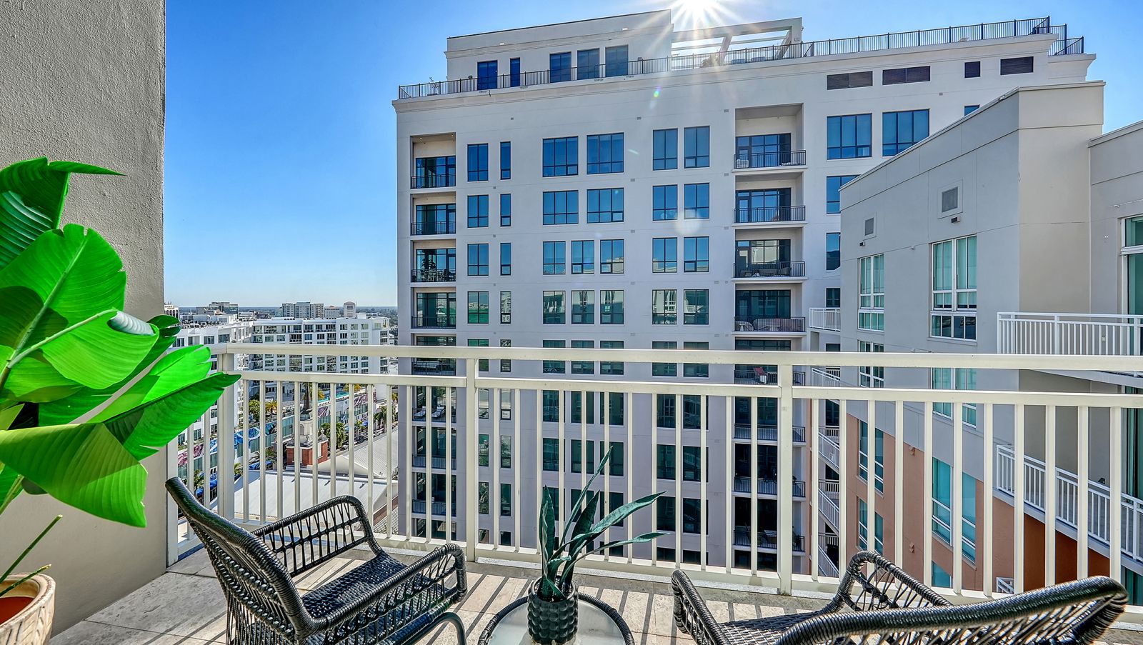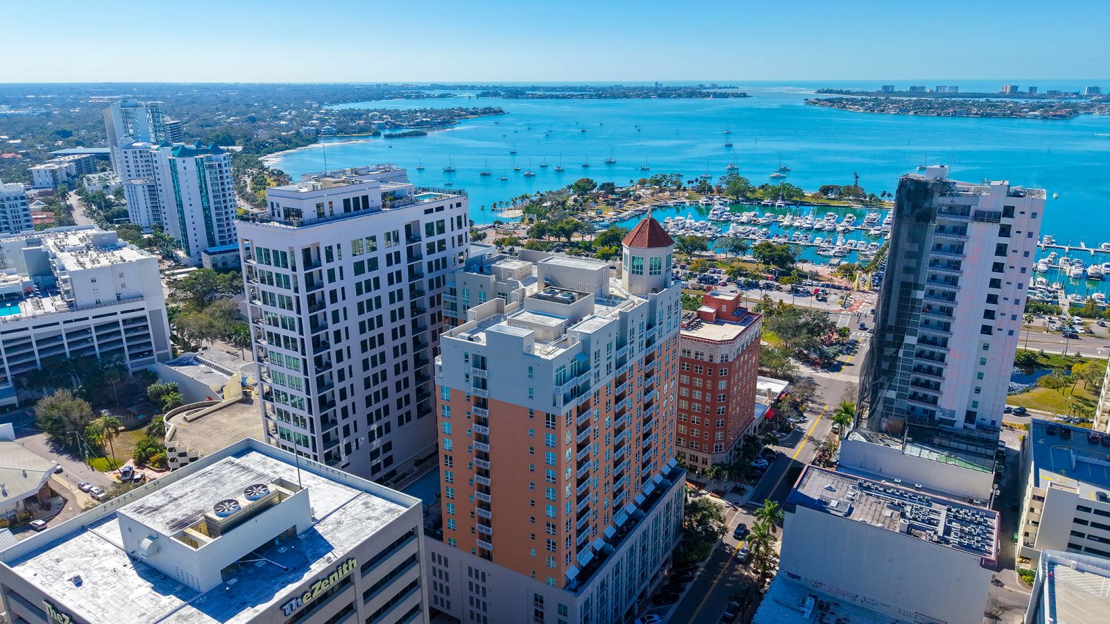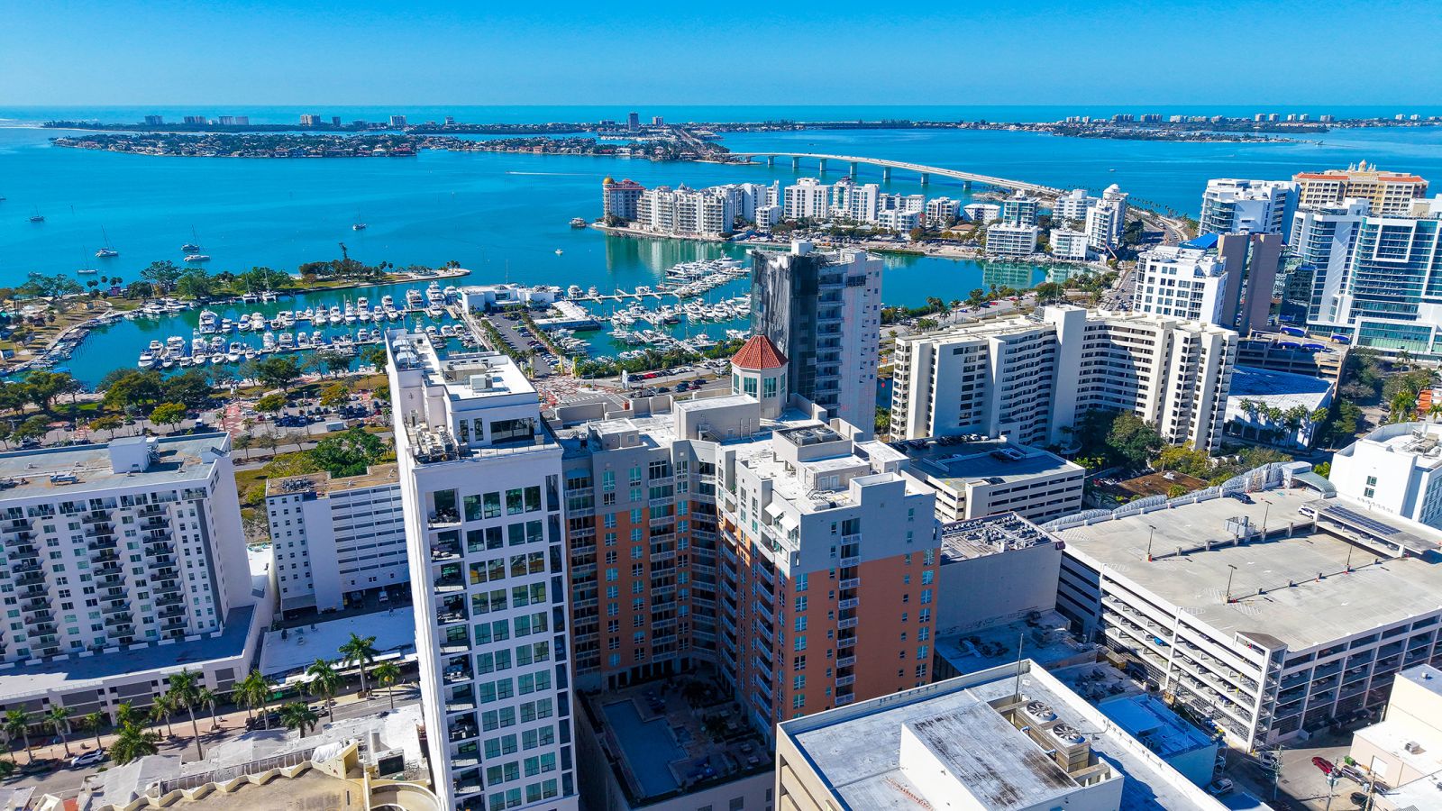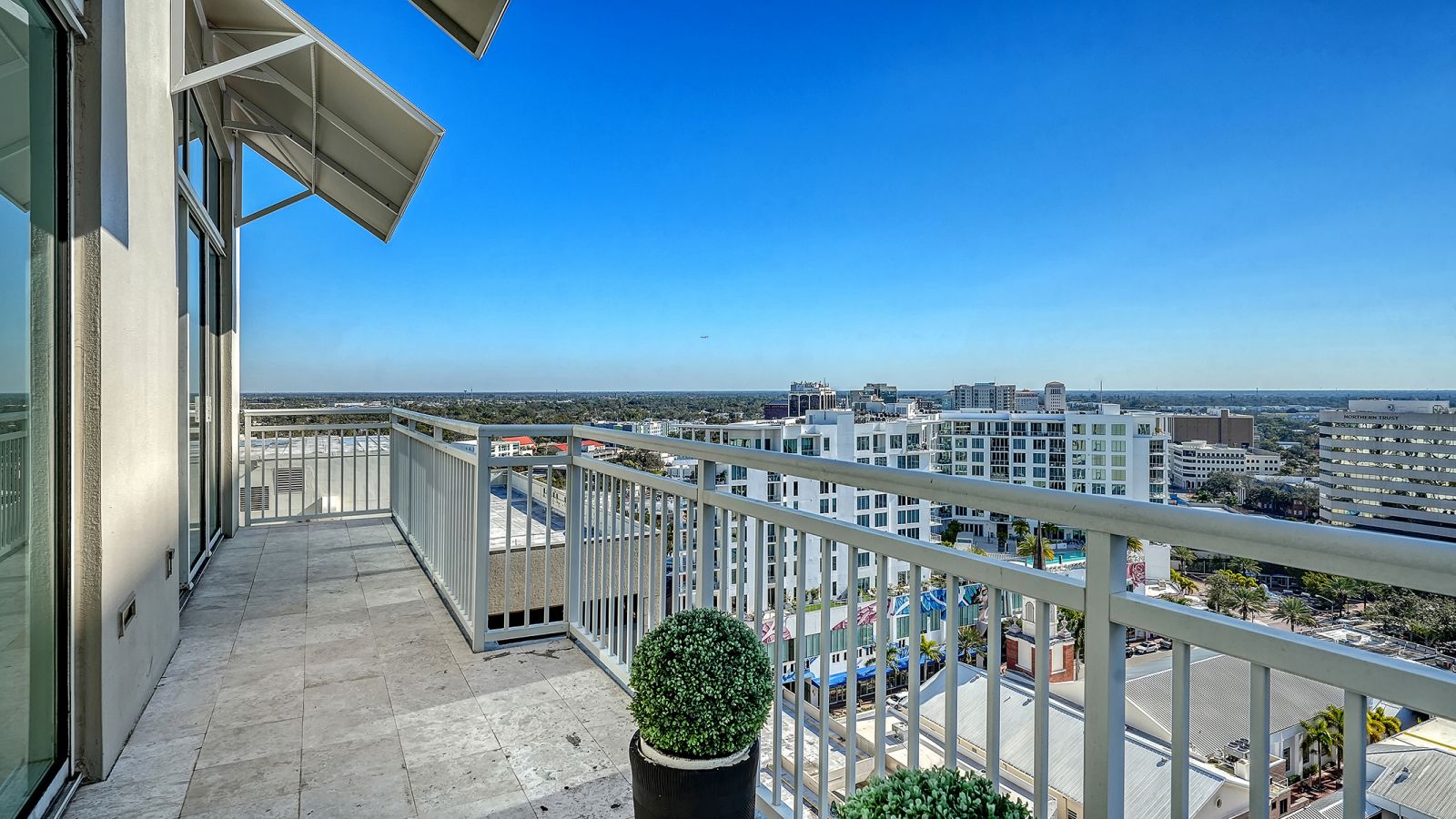 Neighbored by the upcoming new Waldorf Astoria, this spectacular penthouse at 1350 Main offers a tremendous value! Imagine living on the top floor overlooking the pool and gardens of the Waldorf Astoria! This fantastic residence was completely remodeled by the current owner. Nicely appointed with a great split floor plan that features 3 en-suite bedrooms, an additional half bath, and 3 private balconies, creating privacy for everyone. You will enjoy the fabulous kitchen featuring a natural gas range with 6 burners, custom wood cabinetry, Quartz countertops, stainless steel appliances, wine refrigerator, and a wonderful island to accommodate 3 bar stools and extra storage cabinets. The spacious primary suite has access to a private balcony, a large custom walk-in closet, and an elegant bathroom with 2 water closets, 2 sinks, and a nice walk-in shower. At the opposite end, 2 other en-suite bedrooms with balconies. Bright and open unit with natural light from the floor-to-ceiling glass, beautiful porcelain tile throughout, the great room is a comfortable place to spend your time. 2 parking spaces and a large climate control storage are included. 1350 Main offers state-of-the-art amenities with 24 hour person at the front desk, a huge social room, a library, a conference room, a heated lap pool & spa, a steam room, fitness center, a guest suite, cable and internet. The reserves are fully funded. Perfectly located at the corner of Main Street & Palm Ave, you are surrounded by restaurants, shops, theaters, parks, with access to the bayfront at Marina Jack. A short drive to St. Armands Circle and Lido Beach.