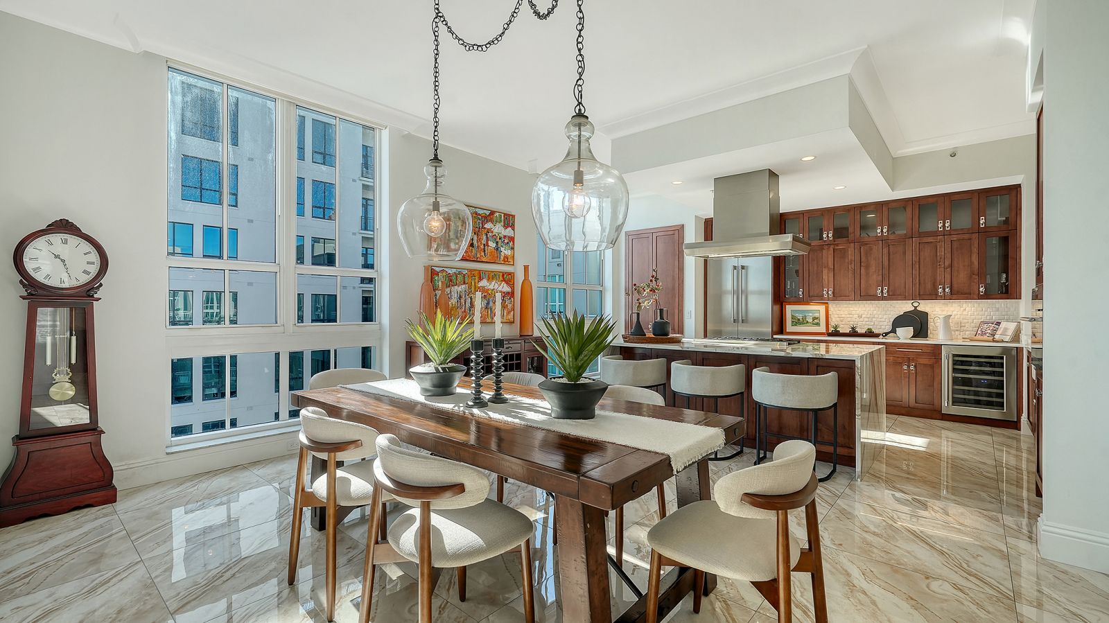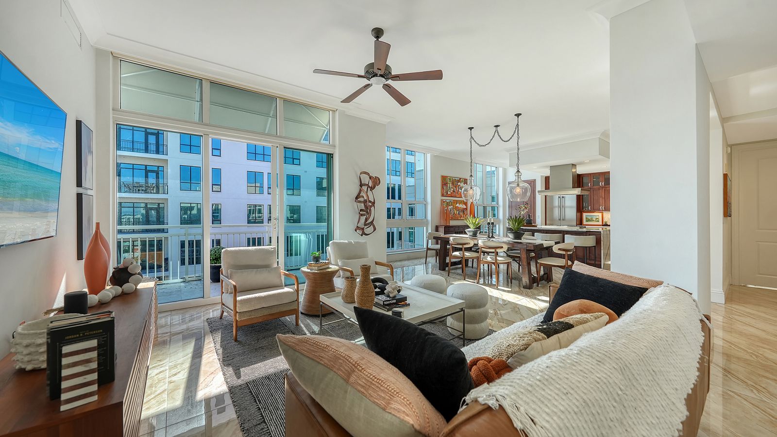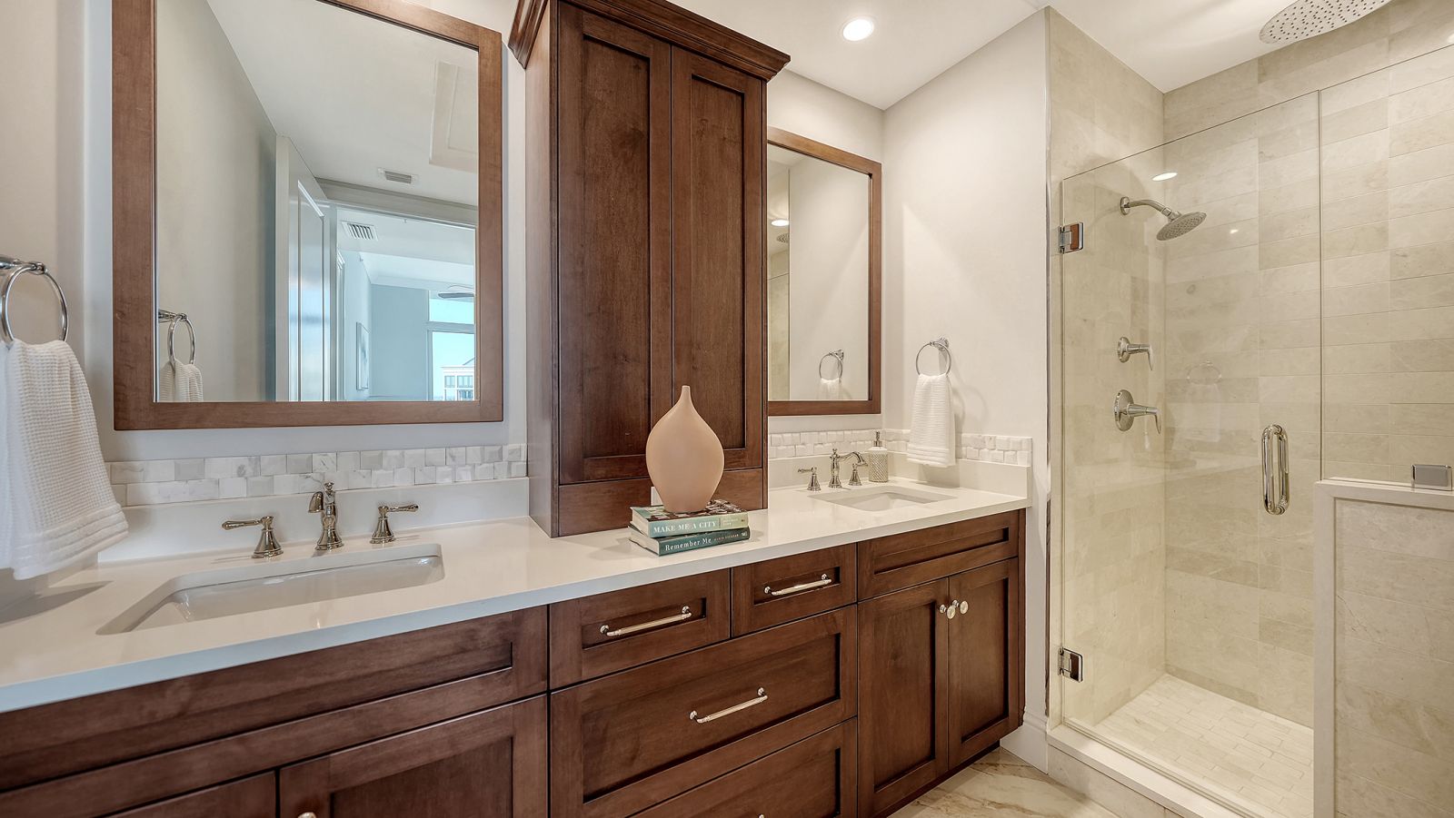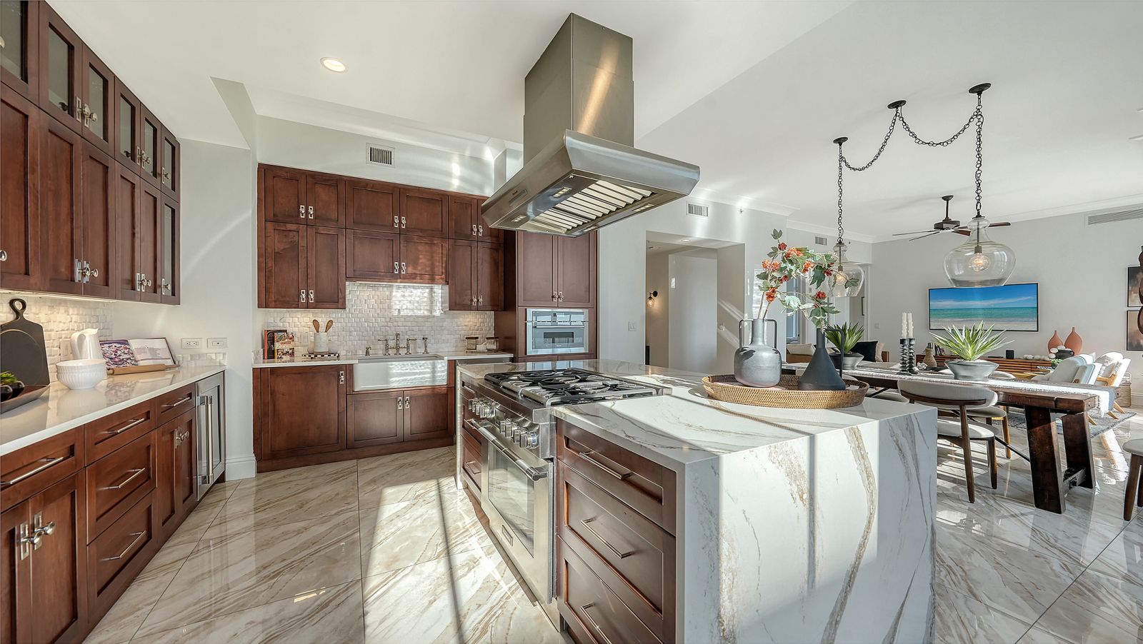 Neighbored by the upcoming new Waldorf Astoria, this spectacular penthouse at 1350 Main offers a tremendous value! Imagine living on the top floor overlooking the pool and gardens of the Waldorf Astoria! This fantastic residence was completely remodeled by the current owner. Nicely appointed with a great split floor plan that features 3 en-suite bedrooms, an additional half bath, and 3 private balconies, creating privacy for everyone. You will enjoy the fabulous kitchen featuring a natural gas range with 6 burners, custom wood cabinetry, Quartz countertops, stainless steel appliances, wine refrigerator, and a wonderful island to accommodate 3 bar stools and extra storage cabinets. The spacious primary suite has access to a private balcony, a large custom walk-in closet, and an elegant bathroom with 2 water closets, 2 sinks, and a nice walk-in shower. At the opposite end, 2 other en-suite bedrooms with balconies. Bright and open unit with natural light from the floor-to-ceiling glass, beautiful porcelain tile throughout, the great room is a comfortable place to spend your time. 2 parking spaces and a large climate control storage are included. 1350 Main offers state-of-the-art amenities with 24 hour person at the front desk, a huge social room, a library, a conference room, a heated lap pool & spa, a steam room, fitness center, a guest suite, cable and internet. The reserves are fully funded. Perfectly located at the corner of Main Street & Palm Ave, you are surrounded by restaurants, shops, theaters, parks, with access to the bayfront at Marina Jack. A short drive to St. Armands Circle and Lido Beach.
