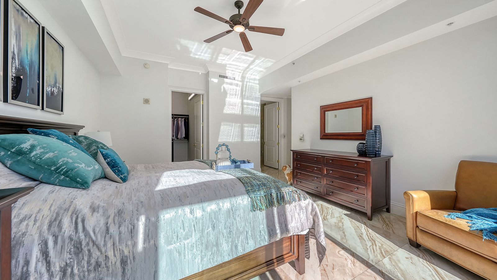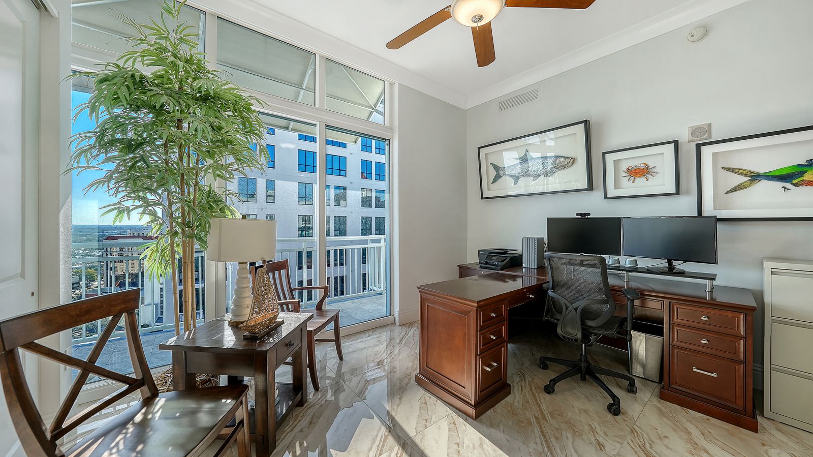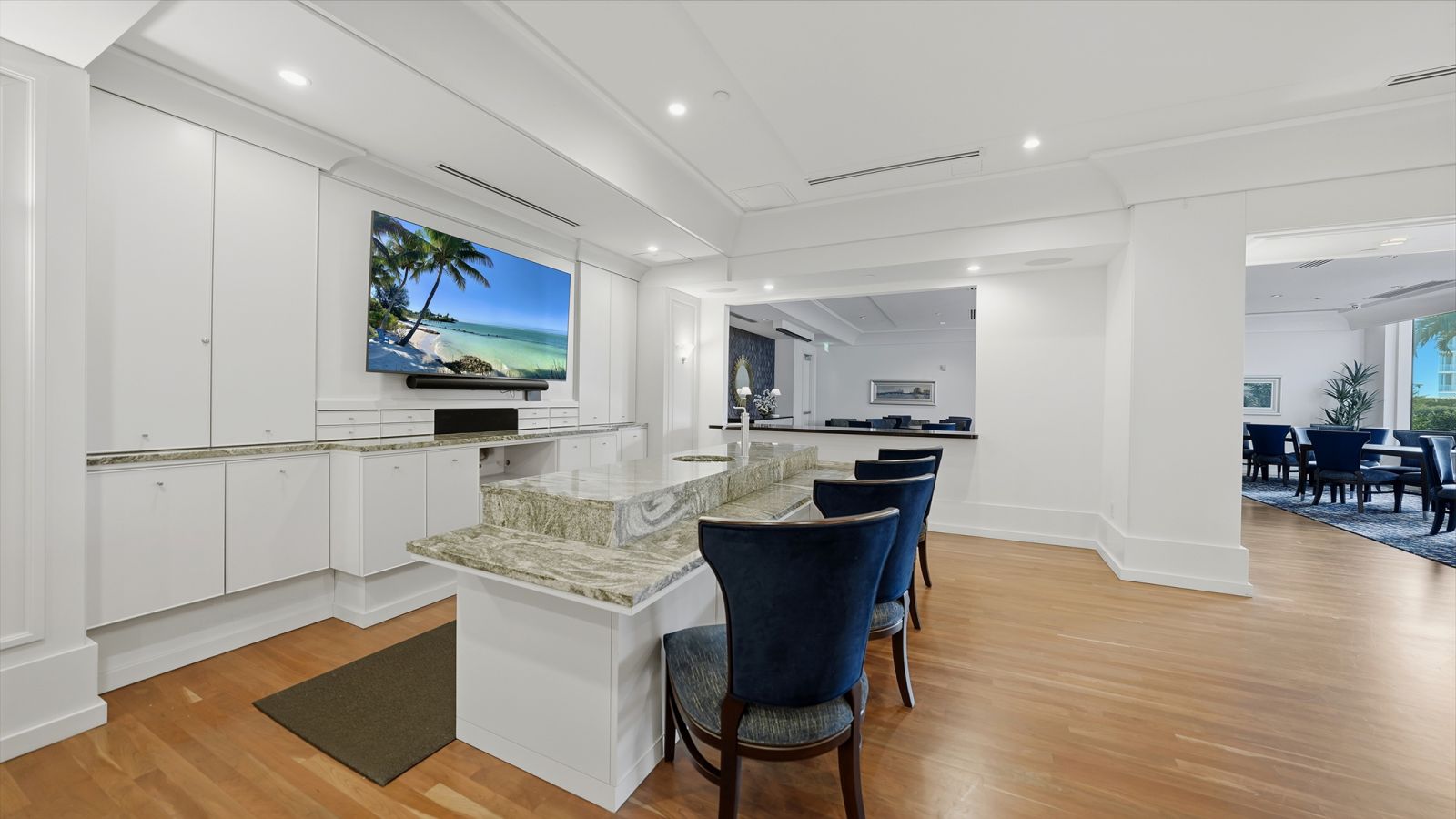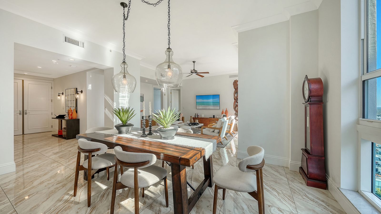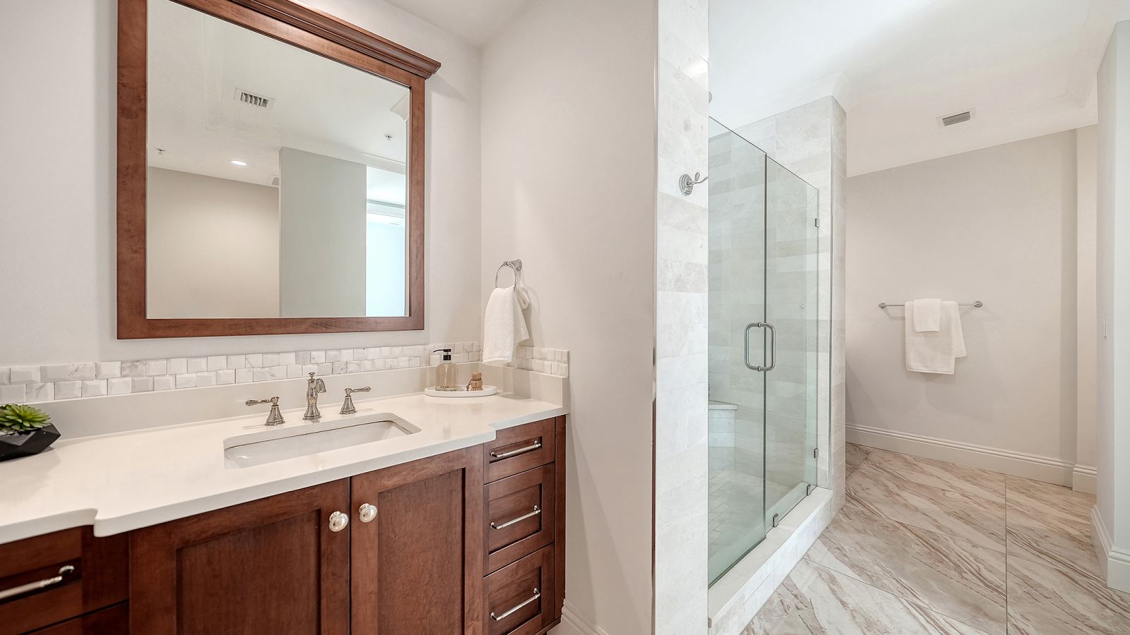 Neighbored by the upcoming new Waldorf Astoria, this spectacular penthouse at 1350 Main offers a tremendous value! Imagine living on the top floor overlooking the pool and gardens of the Waldorf Astoria! This fantastic residence was completely remodeled by the current owner. Nicely appointed with a great split floor plan that features 3 en-suite bedrooms, an additional half bath, and 3 private balconies, creating privacy for everyone. You will enjoy the fabulous kitchen featuring a natural gas range with 6 burners, custom wood cabinetry, Quartz countertops, stainless steel appliances, wine refrigerator, and a wonderful island to accommodate 3 bar stools and extra storage cabinets. The spacious primary suite has access to a private balcony, a large custom walk-in closet, and an elegant bathroom with 2 water closets, 2 sinks, and a nice walk-in shower. At the opposite end, 2 other en-suite bedrooms with balconies. Bright and open unit with natural light from the floor-to-ceiling glass, beautiful porcelain tile throughout, the great room is a comfortable place to spend your time. 2 parking spaces and a large climate control storage are included. 1350 Main offers state-of-the-art amenities with 24 hour person at the front desk, a huge social room, a library, a conference room, a heated lap pool & spa, a steam room, fitness center, a guest suite, cable and internet. The reserves are fully funded. Perfectly located at the corner of Main Street & Palm Ave, you are surrounded by restaurants, shops, theaters, parks, with access to the bayfront at Marina Jack. A short drive to St. Armands Circle and Lido Beach.