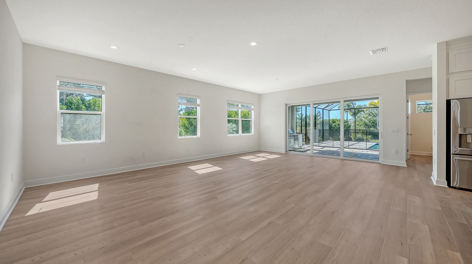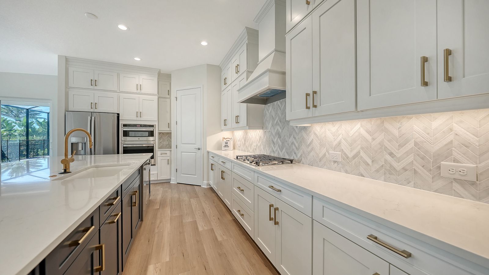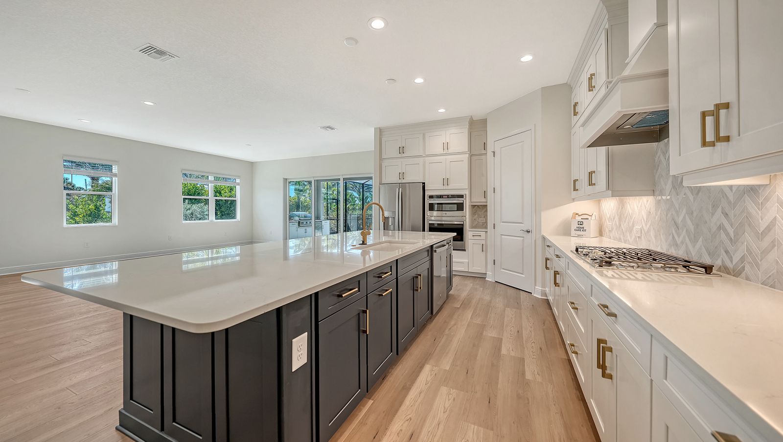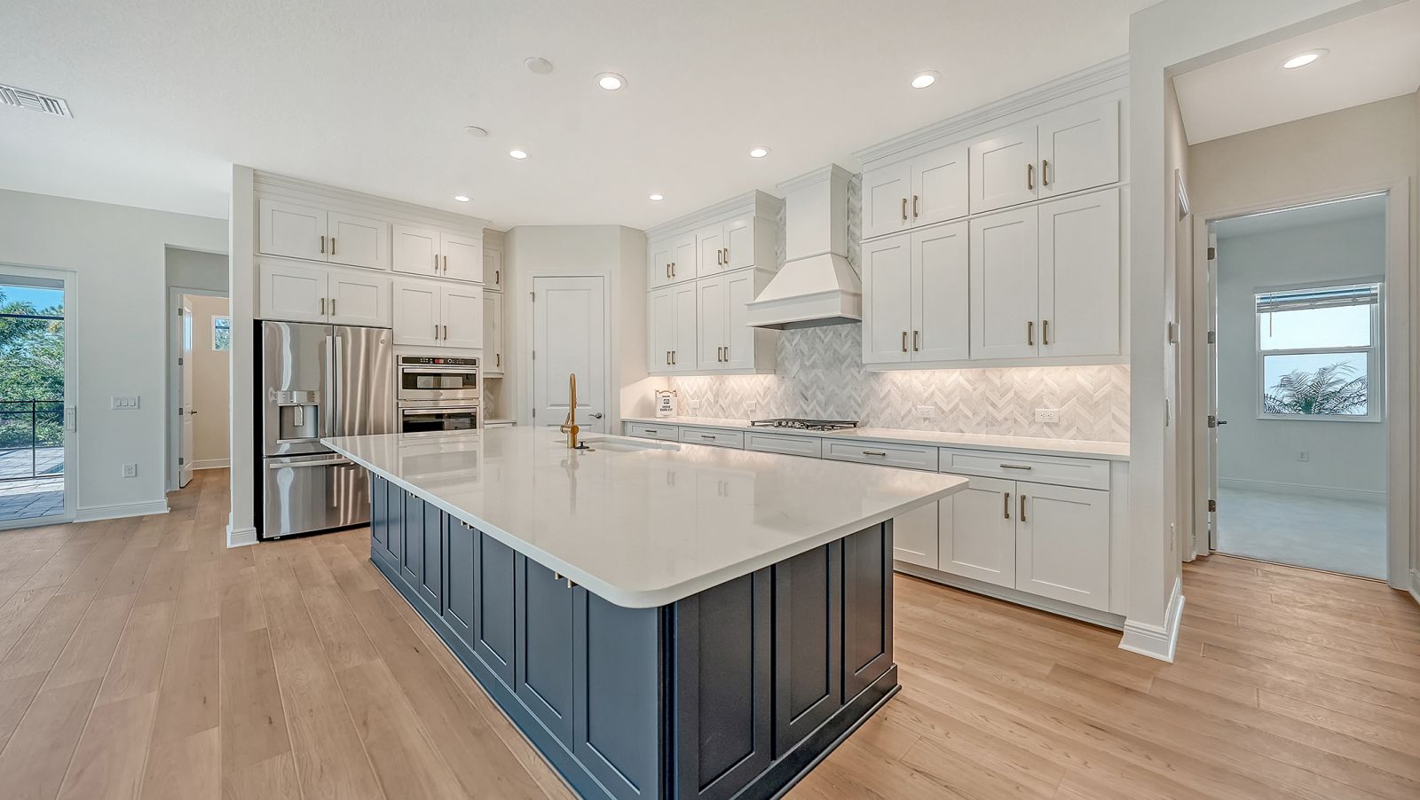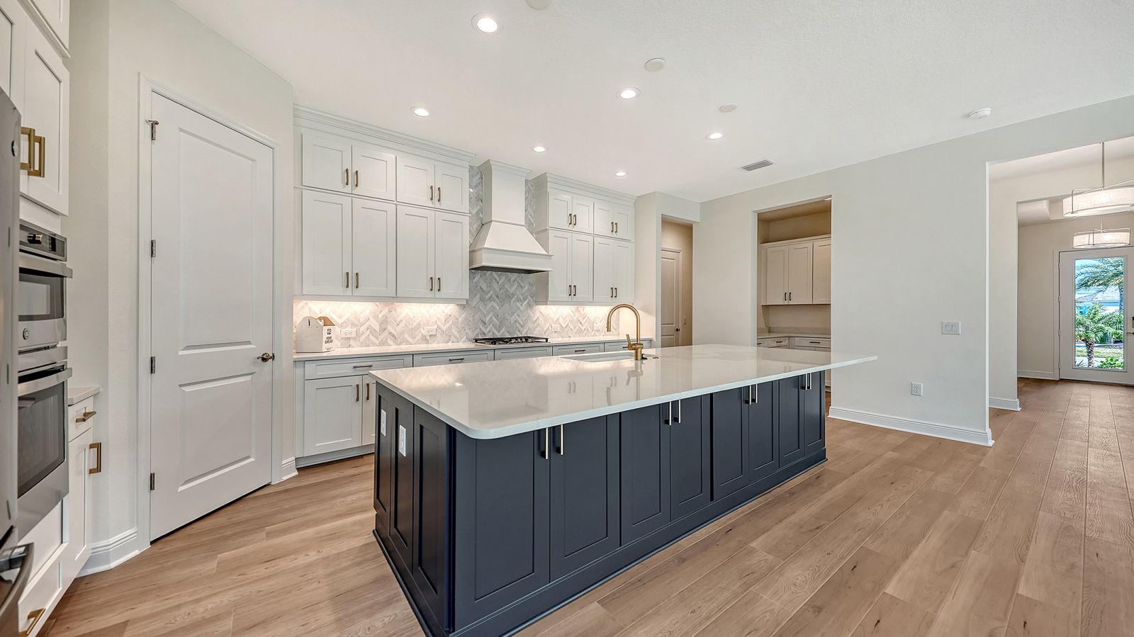 Step into The Shoreline, a beautifully designed open floor plan that blends comfort, luxury, and functionality. The spacious great room opens seamlessly to the pool and spa area through stunning impact-resistant sliding glass doors, creating the perfect indoor-outdoor living experience. A convenient pool bath is located near the master suite and great room. The home includes a chef's kitchen with a large butler's pantry and corner pantry for extra storage, plus a utility room door leading directly to the owner's closet and bedroom. Situated on a corner homesite with lush landscaping and a privacy wall, this home offers exceptional privacy and is located near the entrance for quick access to Downtown Wellen Park.