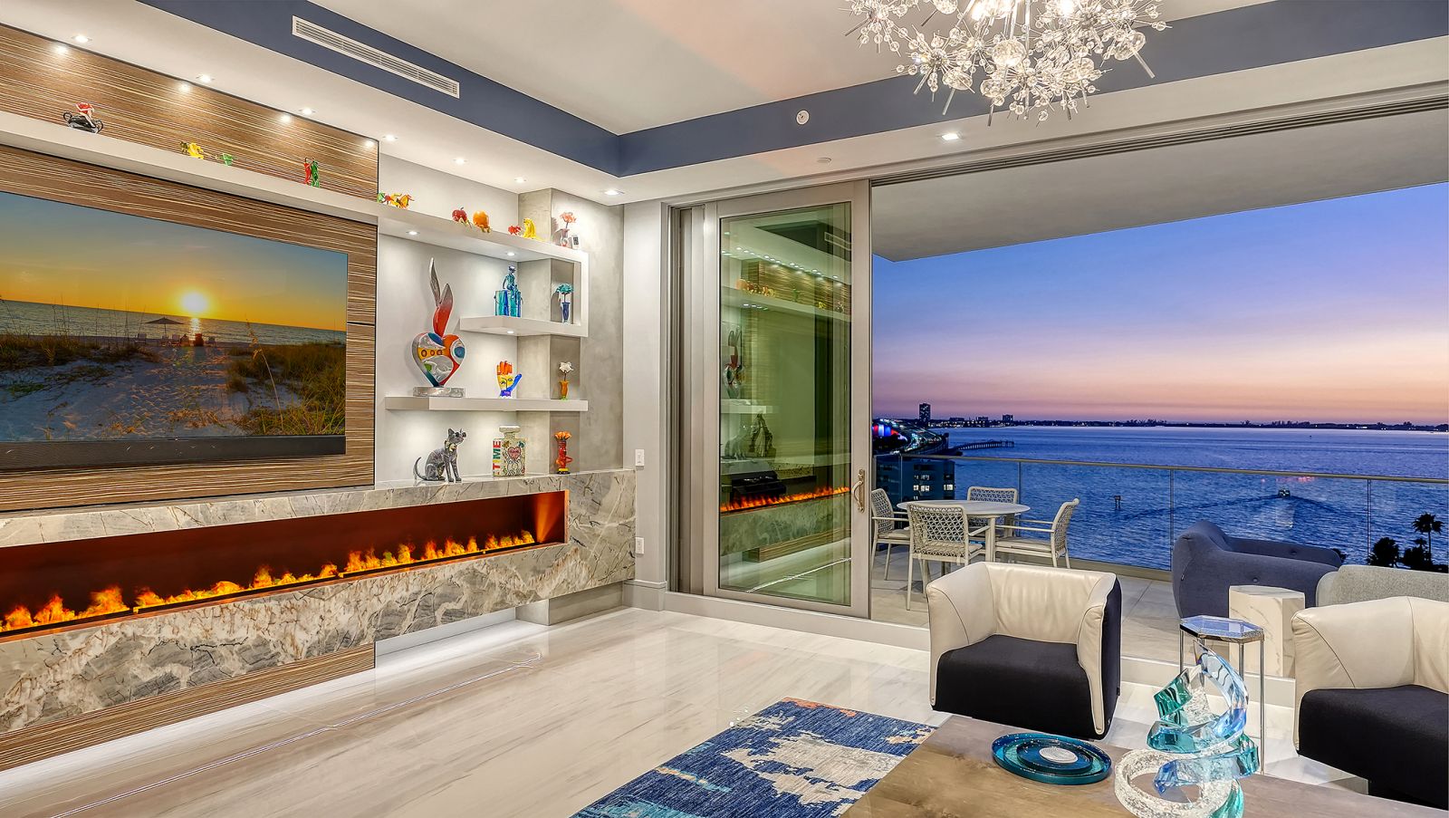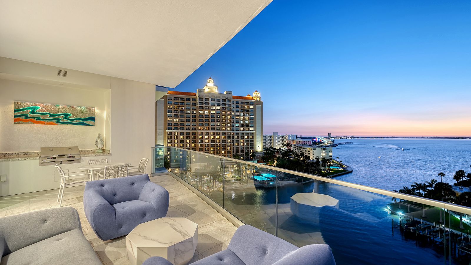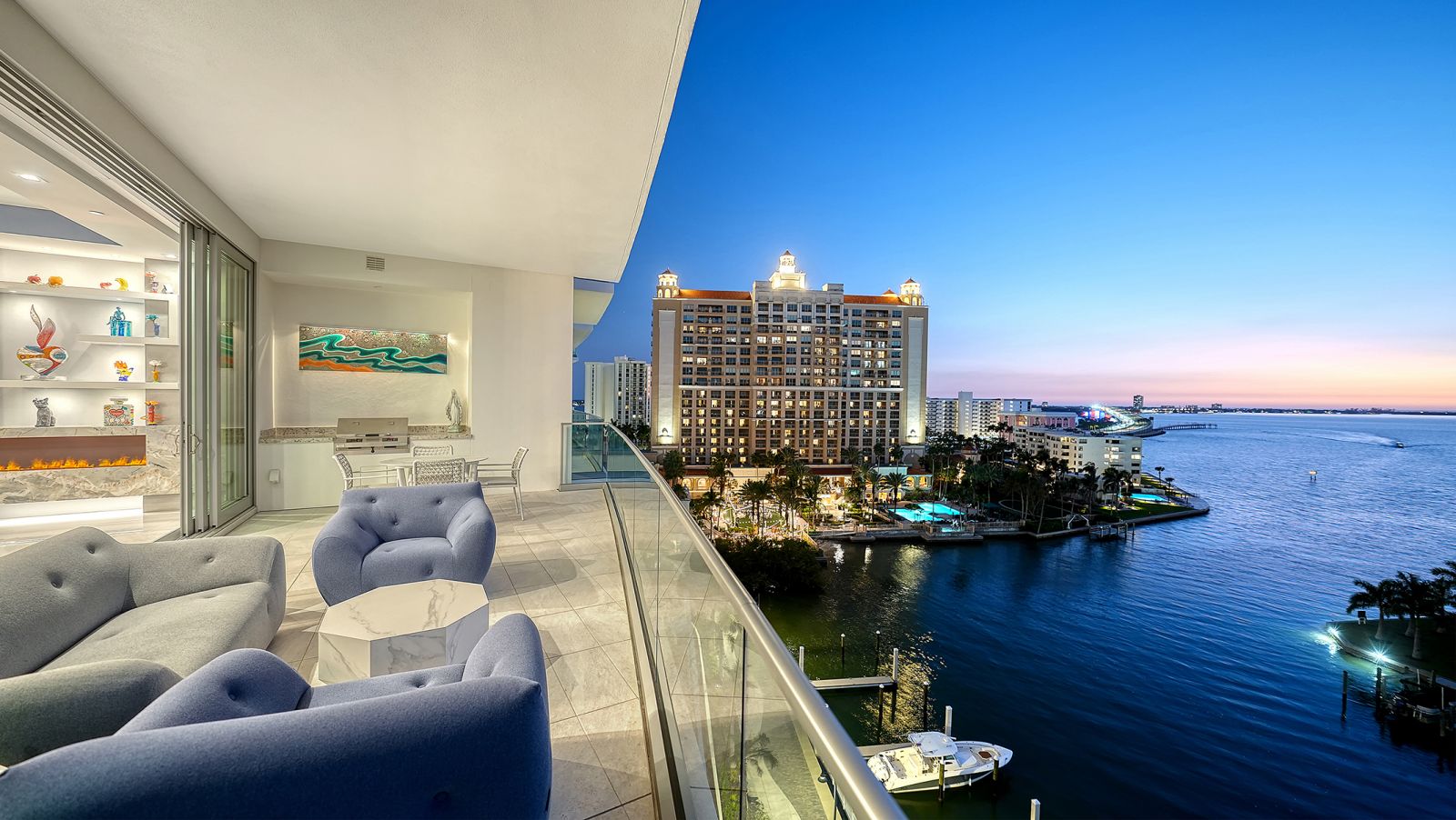 One-of-a-kind and completely custom, Residence #805 at The Ritz-Carlton Residences in downtown Sarasota is a rare offering in a premier waterfront location. Perched on the eighth floor, this highly customized corner residence is uniquely positioned with direct bridge access to The Ritz-Carlton Hotel--placing world-class amenities, valet services, and fine dining at Rufa, Jack Dusty, and Ocean Prime just seconds from your private entry. Offered furnished and professionally designed, this exceptional corner residence showcases panoramic views of Sarasota Bay, the John Ringling Bridge, the city skyline, and vistas that stretch toward the Gulf of Mexico. With more than 3,600 square feet of interior living space, this three-bedroom plus den condominium delivers refined waterfront living within a Ritz-Carlton managed property. A private residents-only elevator opens directly into the foyer, where illuminated built-in art displays and natural wood accents create a gallery-style arrival. The great-room layout is framed by 11-foot ceilings throughout and walls of floor-to-ceiling glass, maximizing water and skyline views from nearly every vantage point. Porcelain tile flooring extends throughout, reinforcing the seamless flow of the open design. The living area is anchored by a dramatic water vapor fireplace and a custom-designed bar with dual beverage refrigerators and an art-inspired wine storage wall. Expansive sliders open to the main terrace, where a summer kitchen and glass railings preserve uninterrupted bay views. The chef's kitchen blends architectural precision with performance, appointed with Wolf professional-grade appliances concealed behind sleek cabinetry, a five-burner gas cooktop with pot filler, dual built-in ovens with warming drawer, custom quartzite countertops, tile backsplash, and an oversized waterfall-edge island with dine-in seating. A walk-in pantry enhances functionality and organization. The northwest-facing primary suite serves as a private sanctuary, complete with its own bayfront terrace, custom inset lighting, built-in workstation, floating shelves, and a dry bar with beverage refrigerator. Dual walk-in closets feature motion lighting and glass display cabinetry. The spa-inspired bath includes dual vanities, a central island with bench seating, a stone shower with multiple showerheads and built-in bench, and a private water closet. Two guest suites are arranged in a split layout for added privacy, each with en-suite baths and custom built-ins. The den, framed by floor-to-ceiling glass and integrated shelving, functions beautifully as a home office or media lounge. Additional features include Crestron smart home system controlling the lighting, shades, audio, and video; Nest thermostat; three private terraces with glass railings; one of only ten oversized private one-car garages, featuring built-in storage and two full-size wine coolers accommodating 166 bottles each; and an additional oversized parking space directly across from the private garage. As part of a Ritz-Carlton managed property, residents enjoy an unmatched level of service and amenities, including a 70-foot heated lap pool, resort-style pool and spa with cabanas, poolside bar, club and social rooms, news and sports cafe, fitness center with yoga studio, boardroom, multi-purpose room, dog park with pet washing station, 24-hour concierge, valet service, and on-site management. In-residence dining, housekeeping, and laundry services are also available.