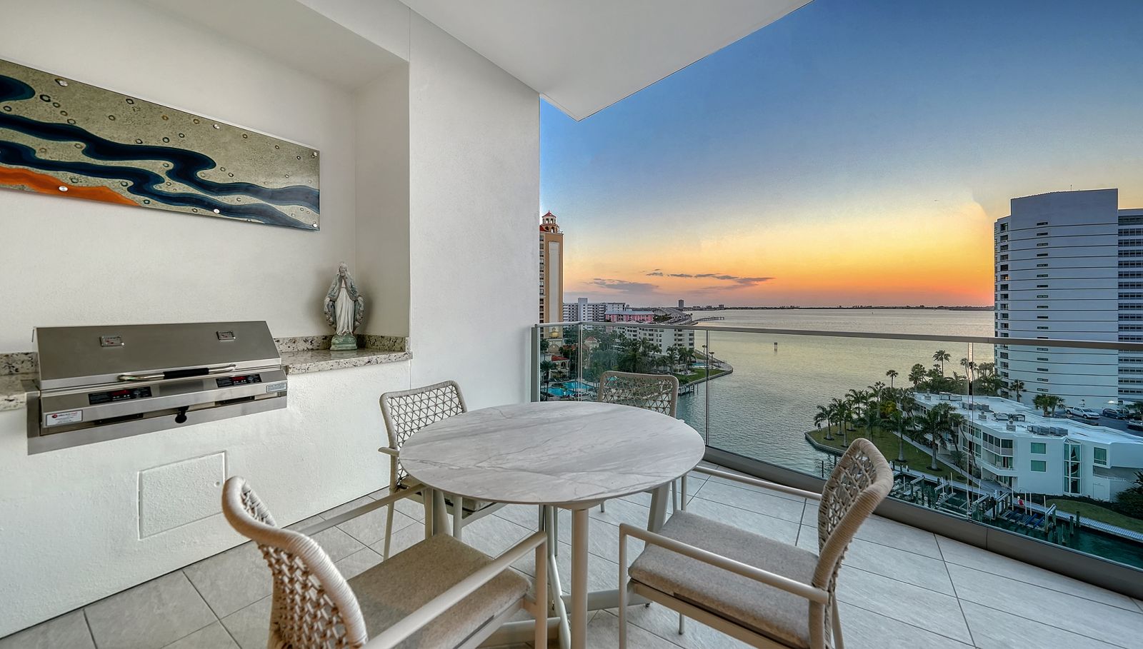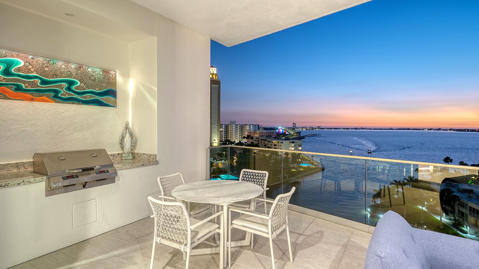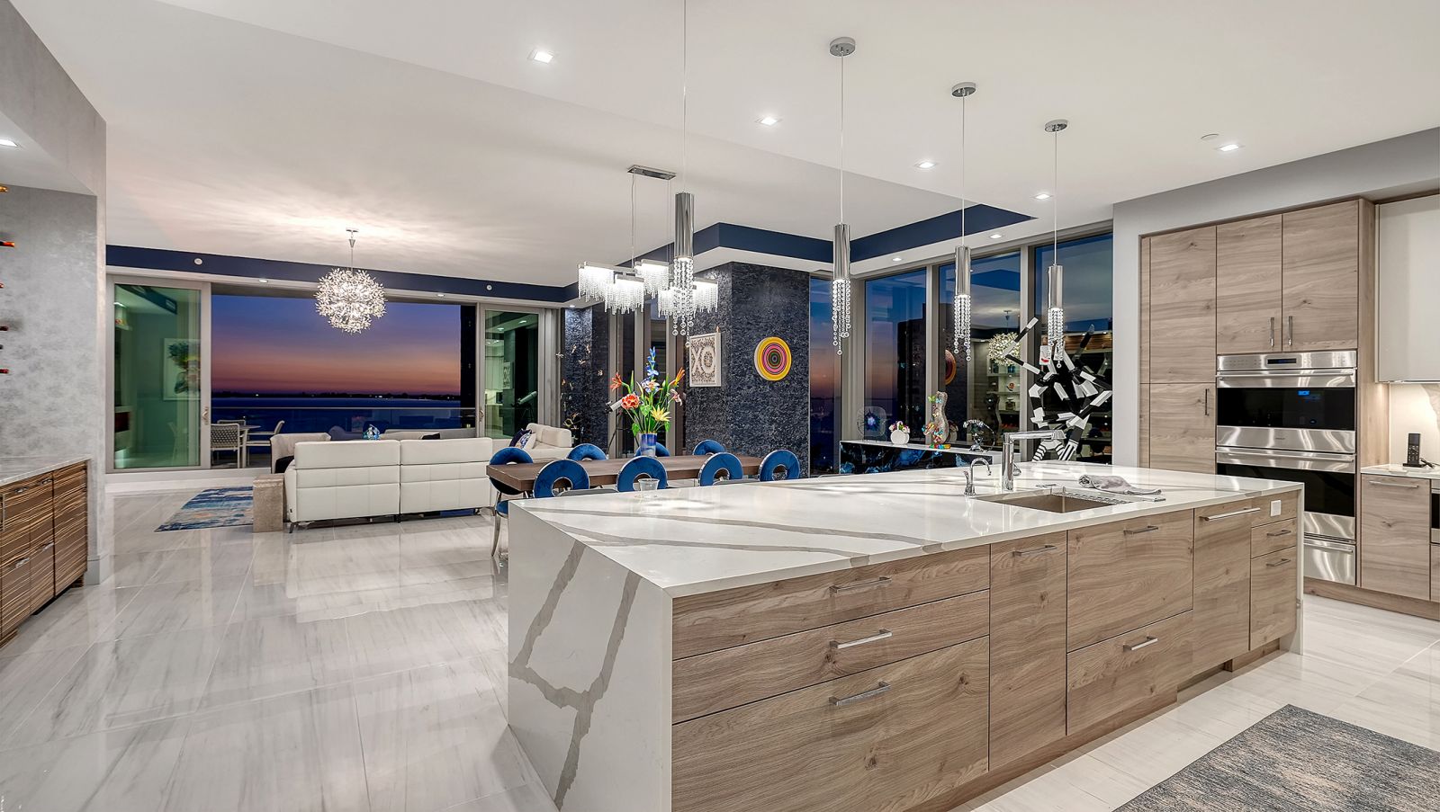 One-of-a-kind and completely custom, Residence #805 at The Ritz-Carlton Residences in downtown Sarasota is a rare offering in a premier waterfront location. Perched on the eighth floor, this highly customized corner residence is uniquely positioned with direct bridge access to The Ritz-Carlton Hotel--placing world-class amenities, valet services, and fine dining at Rufa, Jack Dusty, and Ocean Prime just seconds from your private entry. Offered furnished and professionally designed, this exceptional corner residence showcases panoramic views of Sarasota Bay, the John Ringling Bridge, the city skyline, and vistas that stretch toward the Gulf of Mexico. With more than 3,600 square feet of interior living space, this three-bedroom plus den condominium delivers refined waterfront living within a Ritz-Carlton managed property. A private residents-only elevator opens directly into the foyer, where illuminated built-in art displays and natural wood accents create a gallery-style arrival. The great-room layout is framed by 11-foot ceilings throughout and walls of floor-to-ceiling glass, maximizing water and skyline views from nearly every vantage point. Porcelain tile flooring extends throughout, reinforcing the seamless flow of the open design. The living area is anchored by a dramatic water vapor fireplace and a custom-designed bar with dual beverage refrigerators and an art-inspired wine storage wall. Expansive sliders open to the main terrace, where a summer kitchen and glass railings preserve uninterrupted bay views. The chef's kitchen blends architectural precision with performance, appointed with Wolf professional-grade appliances concealed behind sleek cabinetry, a five-burner gas cooktop with pot filler, dual built-in ovens with warming drawer, custom quartzite countertops, tile backsplash, and an oversized waterfall-edge island with dine-in seating. A walk-in pantry enhances functionality and organization. The northwest-facing primary suite serves as a private sanctuary, complete with its own bayfront terrace, custom inset lighting, built-in workstation, floating shelves, and a dry bar with beverage refrigerator. Dual walk-in closets feature motion lighting and glass display cabinetry. The spa-inspired bath includes dual vanities, a central island with bench seating, a stone shower with multiple showerheads and built-in bench, and a private water closet. Two guest suites are arranged in a split layout for added privacy, each with en-suite baths and custom built-ins. The den, framed by floor-to-ceiling glass and integrated shelving, functions beautifully as a home office or media lounge. Additional features include Crestron smart home system controlling the lighting, shades, audio, and video; Nest thermostat; three private terraces with glass railings; one of only ten oversized private one-car garages, featuring built-in storage and two full-size wine coolers accommodating 166 bottles each; and an additional oversized parking space directly across from the private garage. As part of a Ritz-Carlton managed property, residents enjoy an unmatched level of service and amenities, including a 70-foot heated lap pool, resort-style pool and spa with cabanas, poolside bar, club and social rooms, news and sports cafe, fitness center with yoga studio, boardroom, multi-purpose room, dog park with pet washing station, 24-hour concierge, valet service, and on-site management. In-residence dining, housekeeping, and laundry services are also available.