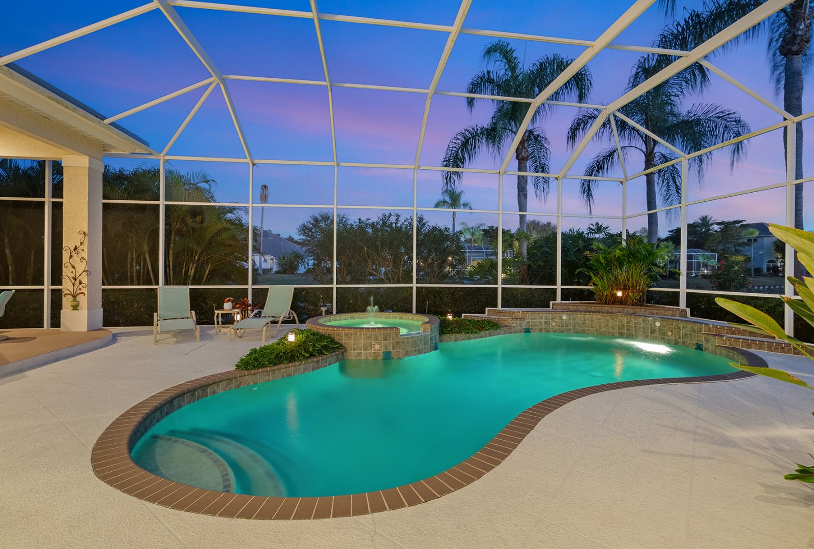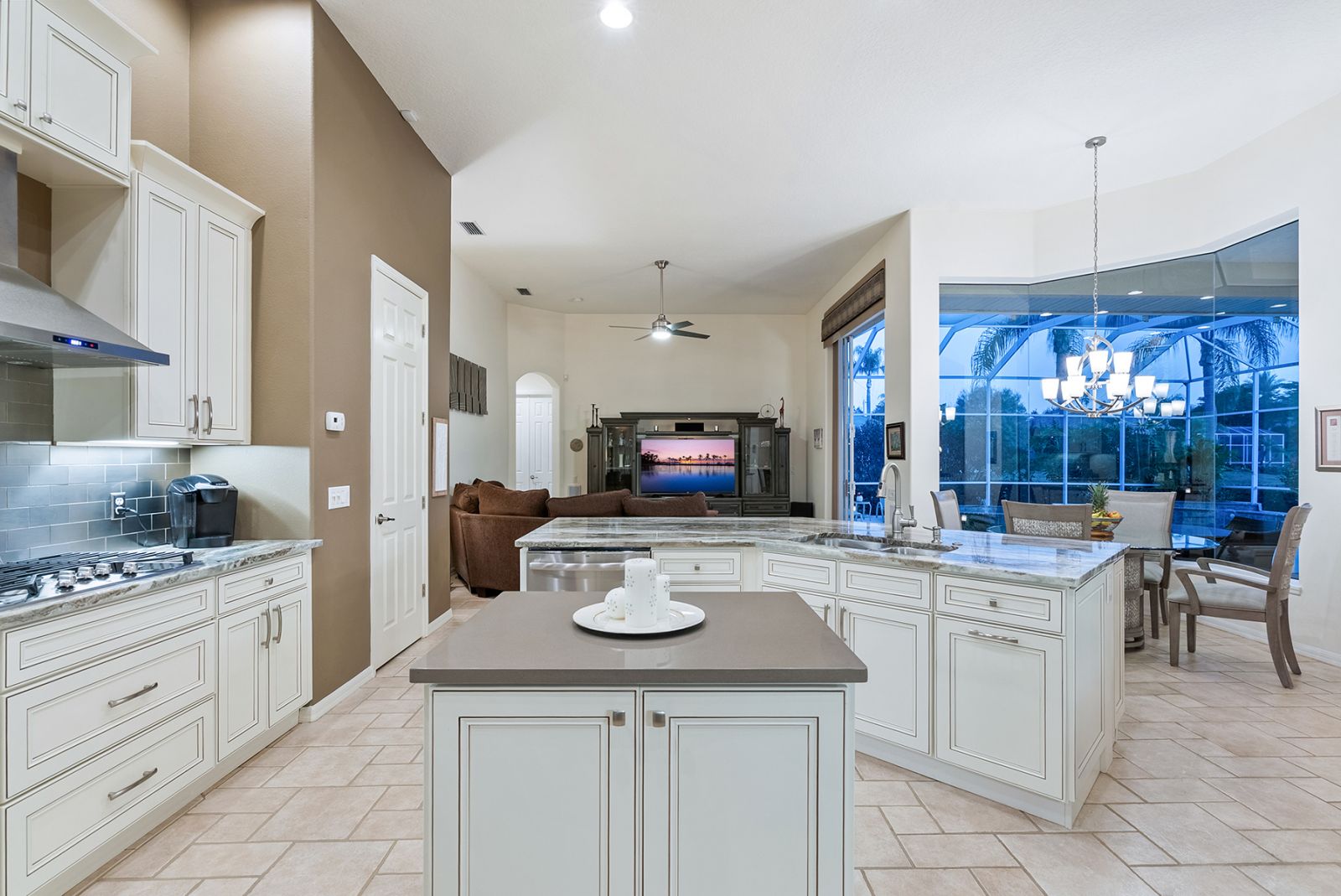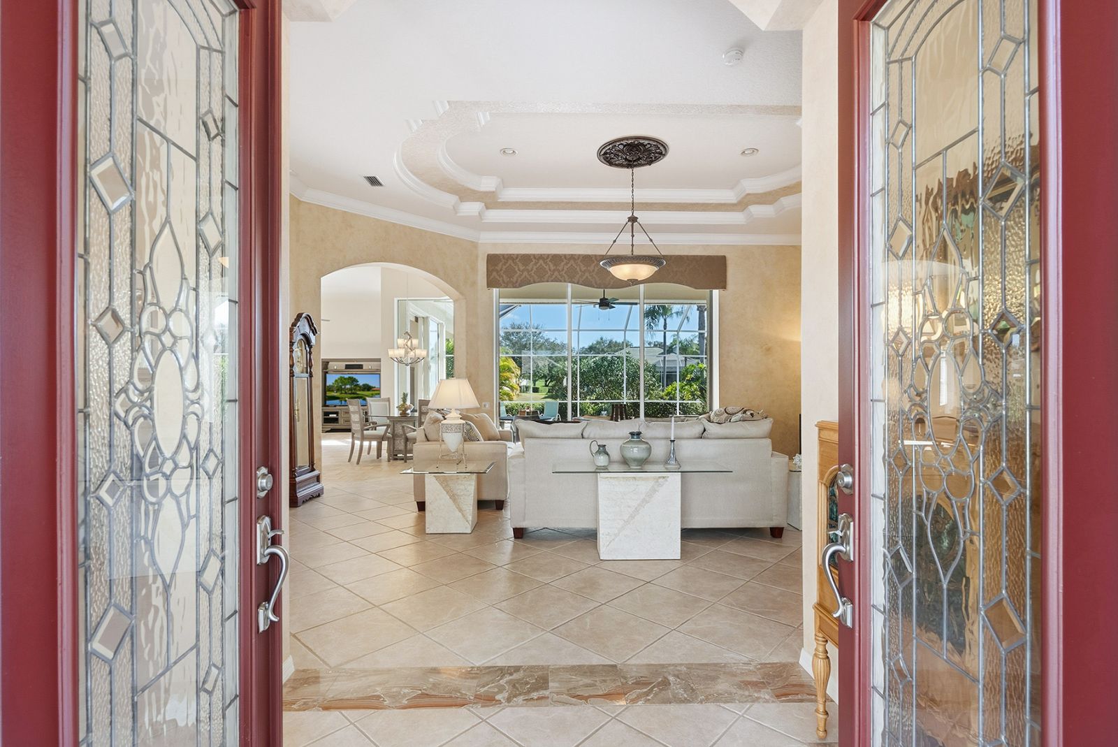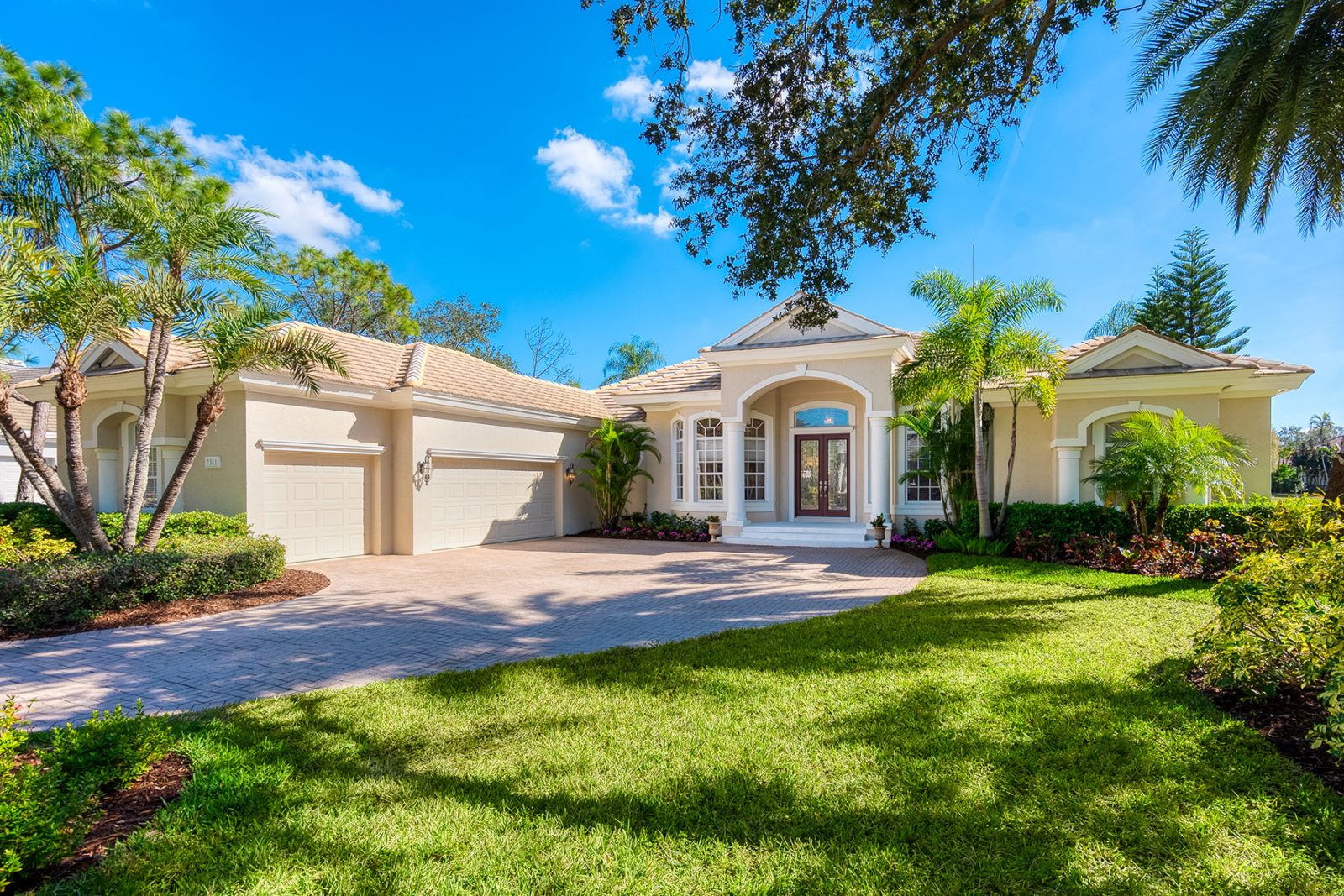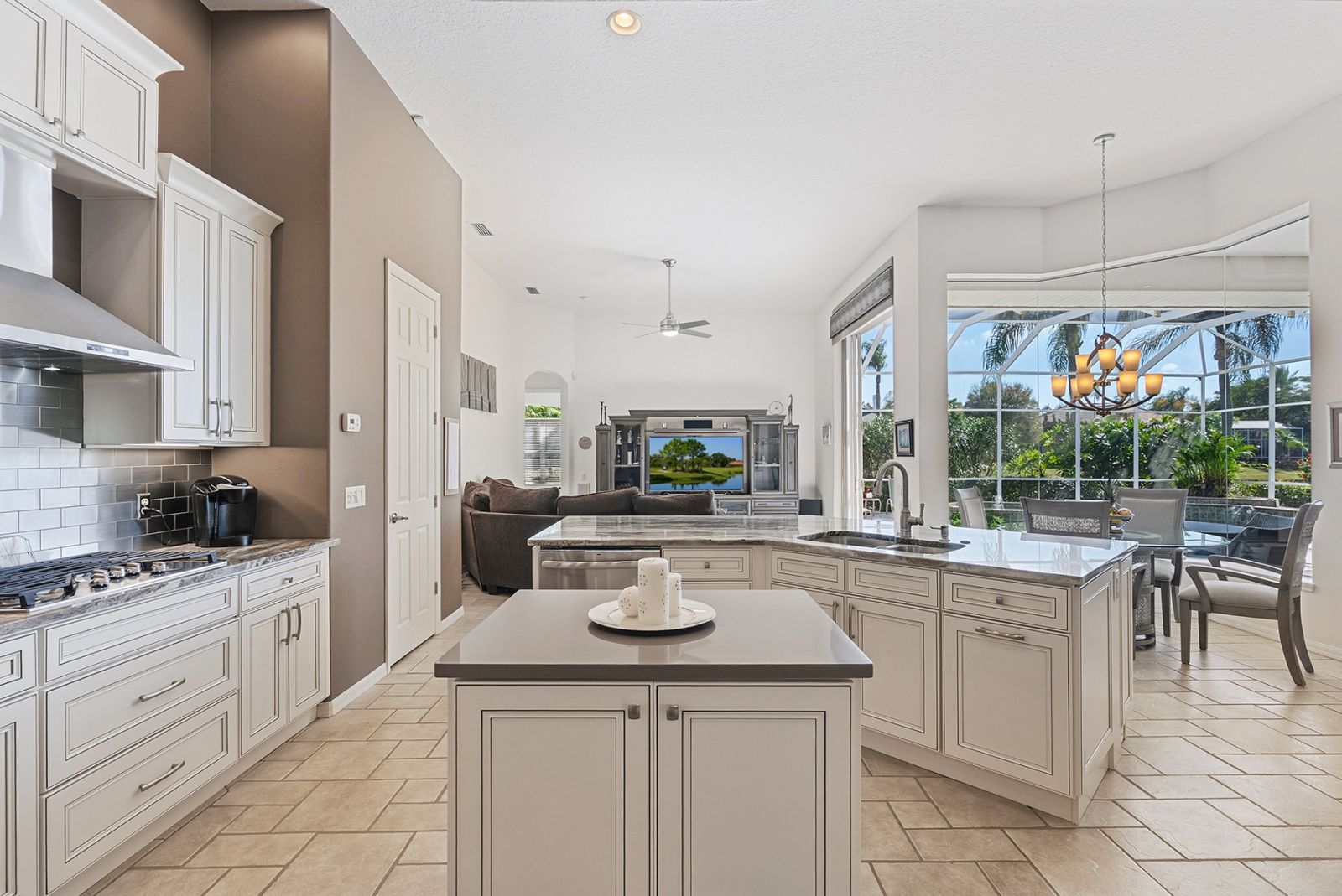 Welcome to this beautifully appointed Neal Custom Homes residence offering serene water views, exceptional architectural detail, and resort-style outdoor living. This 3-bedroom, 3-bath home with an oversized 3-car garage offers 3356 sf and is thoughtfully designed for both everyday comfort and elegant entertaining.A double designer leaded-glass front door opens to a striking foyer with marble inlay flooring, setting the tone for the refined interiors. High-end ceramic tile laid on the diagonal flows throughout the main living areas, complemented by tray and coffered ceiling details, crown molding, custom niches, and recessed lighting. The living room features a triple tray ceiling, an electric fireplace, and pocket sliders that open seamlessly to the lanai.The brand-new kitchen (2021) is the heart of the home, showcasing rich off-white wood cabinetry, exotic granite countertops, a quartz-topped center island, GE stainless steel appliances, subway tile backsplash, under-cabinet lighting, a spacious pantry, built-in oven with microwave, and an aquarium window in the breakfast area. Open to the family room and lanai, this space is ideal for entertaining.The primary suite is a private retreat featuring a sitting area with bay-style windows, coffered ceiling, dual customized closets, double-door entry, and private access to the lanai. The spa-inspired, wheelchair-accessible primary bath offers an oversized marble-detailed shower, Jacuzzi tub, marble flooring, expansive double vanity with makeup area, cultured marble countertops, triple mirrors, and new designer hardware.Bedroom two is a generously sized custom suite with a large closet and bath featuring a cultured marble vanity and tub/shower combination. Bedroom three is adjacent to a full hall bath with enclosed shower, linen closet, and updated brushed-silver fixtures. A large rear den with cathedral-style ceiling and sliders to the lanai can easily serve as a fourth bedroom with the addition of a closet.Step outside to your private oasis with a kidney-shaped heated pool and spa, lush updated landscaping with lighting, and a covered lanai offering space for a future outdoor kitchen (currently equipped with refrigerator and cabinetry).The oversized 3-car garage features higher ceilings, a painted floor, storage cabinetry, exterior access, and an electric hydraulic car lift, perfect for car enthusiasts. Additional highlights include central vacuum, exquisite lighting, select new fans, window treatments, brushed-silver hardware throughout, and a well-appointed laundry room with cabinetry, sink, and built-in ironing board.Available furnishings may be purchased separately.
