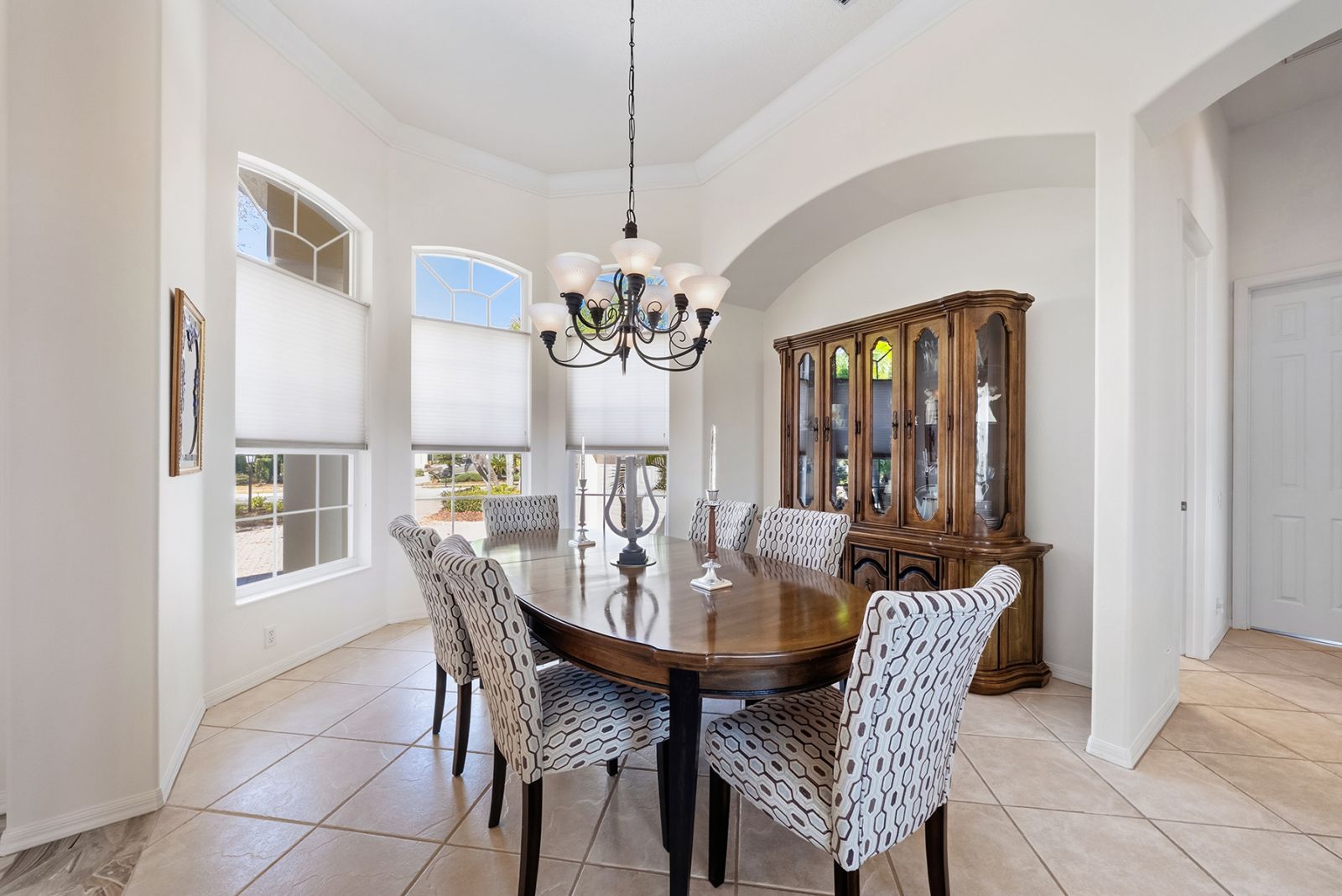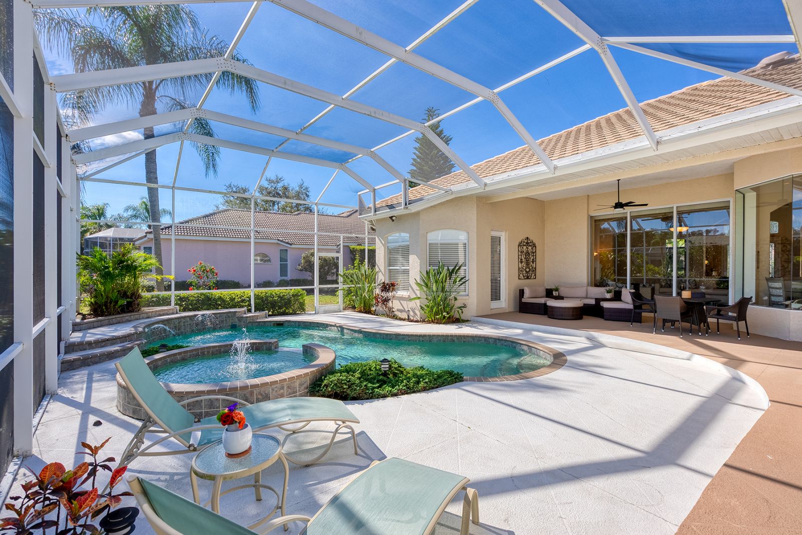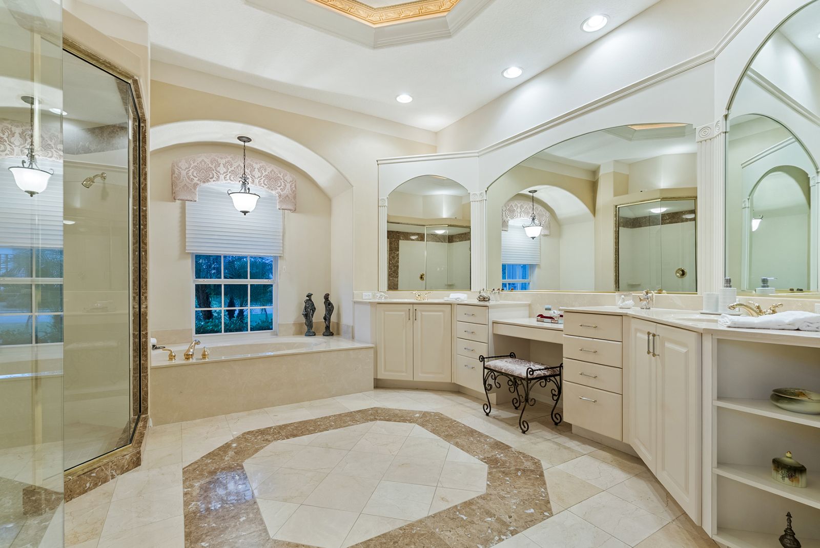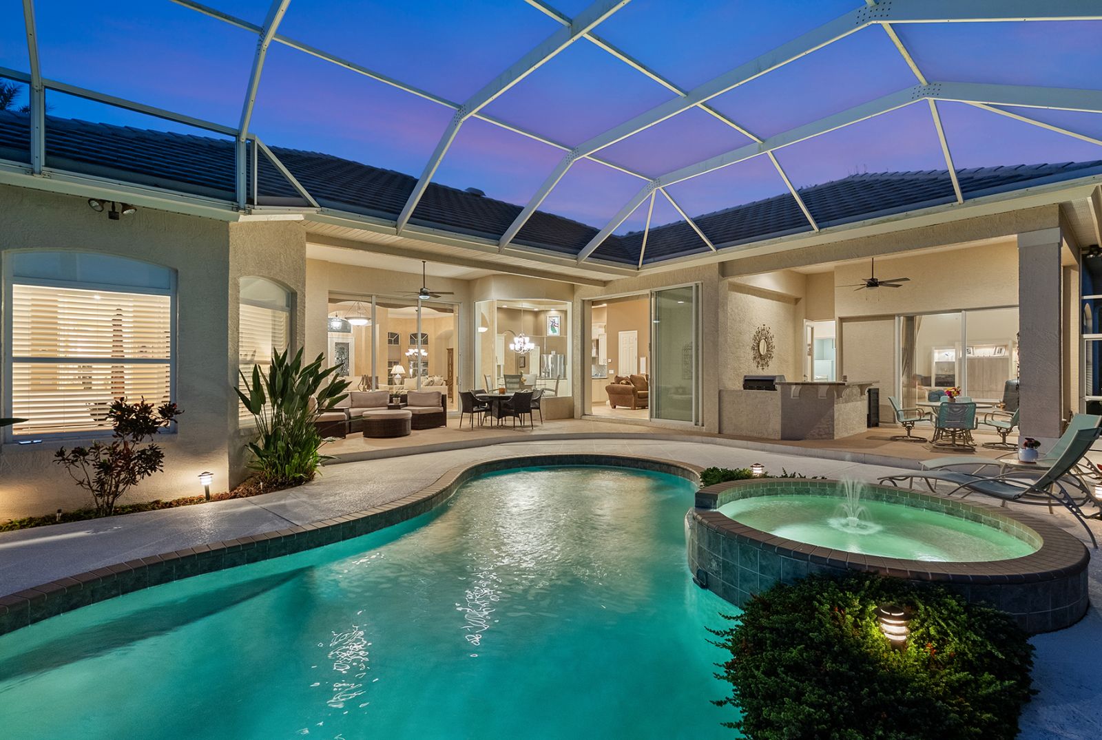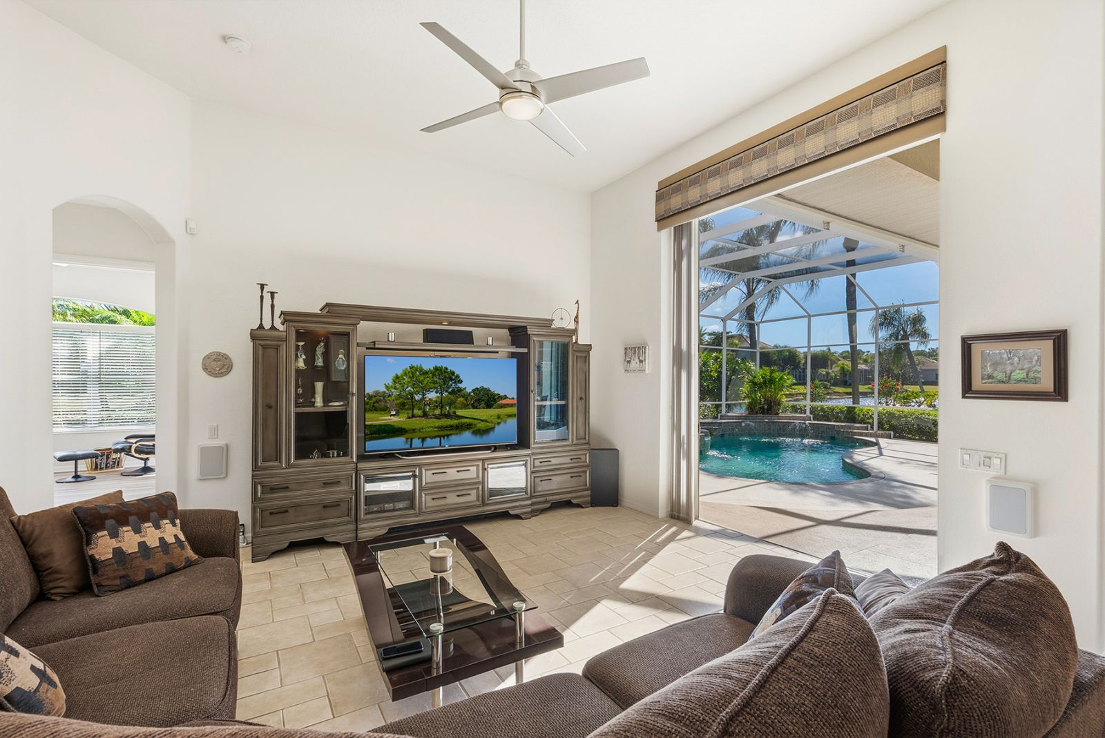Welcome to this beautifully appointed Neal Custom Homes residence offering serene water views, exceptional architectural detail, and resort-style outdoor living. This 3-bedroom, 3-bath home with an oversized 3-car garage offers 3356 sf and is thoughtfully designed for both everyday comfort and elegant entertaining.A double designer leaded-glass front door opens to a striking foyer with marble inlay flooring, setting the tone for the refined interiors. High-end ceramic tile laid on the diagonal flows throughout the main living areas, complemented by tray and coffered ceiling details, crown molding, custom niches, and recessed lighting. The living room features a triple tray ceiling, an electric fireplace, and pocket sliders that open seamlessly to the lanai.The brand-new kitchen (2021) is the heart of the home, showcasing rich off-white wood cabinetry, exotic granite countertops, a quartz-topped center island, GE stainless steel appliances, subway tile backsplash, under-cabinet lighting, a spacious pantry, built-in oven with microwave, and an aquarium window in the breakfast area. Open to the family room and lanai, this space is ideal for entertaining.The primary suite is a private retreat featuring a sitting area with bay-style windows, coffered ceiling, dual customized closets, double-door entry, and private access to the lanai. The spa-inspired, wheelchair-accessible primary bath offers an oversized marble-detailed shower, Jacuzzi tub, marble flooring, expansive double vanity with makeup area, cultured marble countertops, triple mirrors, and new designer hardware.Bedroom two is a generously sized custom suite with a large closet and bath featuring a cultured marble vanity and tub/shower combination. Bedroom three is adjacent to a full hall bath with enclosed shower, linen closet, and updated brushed-silver fixtures. A large rear den with cathedral-style ceiling and sliders to the lanai can easily serve as a fourth bedroom with the addition of a closet.Step outside to your private oasis with a kidney-shaped heated pool and spa, lush updated landscaping with lighting, and a covered lanai offering space for a future outdoor kitchen (currently equipped with refrigerator and cabinetry).The oversized 3-car garage features higher ceilings, a painted floor, storage cabinetry, exterior access, and an electric hydraulic car lift, perfect for car enthusiasts. Additional highlights include central vacuum, exquisite lighting, select new fans, window treatments, brushed-silver hardware throughout, and a well-appointed laundry room with cabinetry, sink, and built-in ironing board.Available furnishings may be purchased separately.