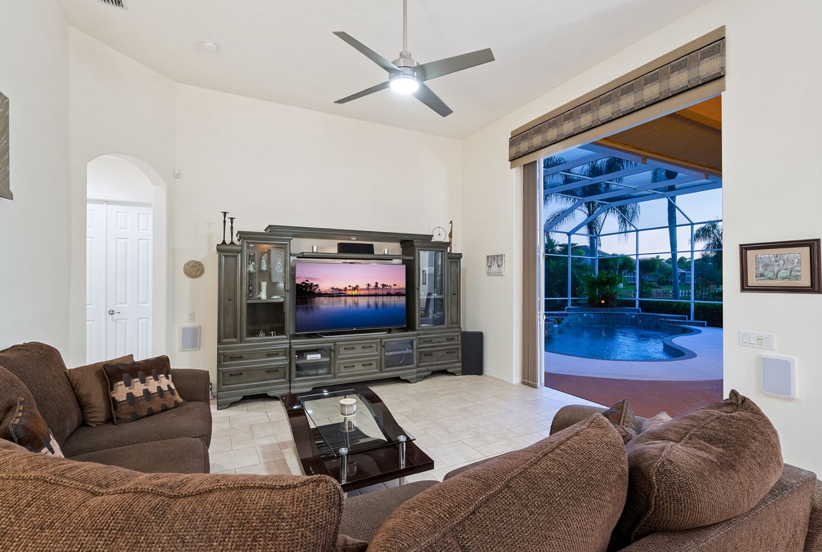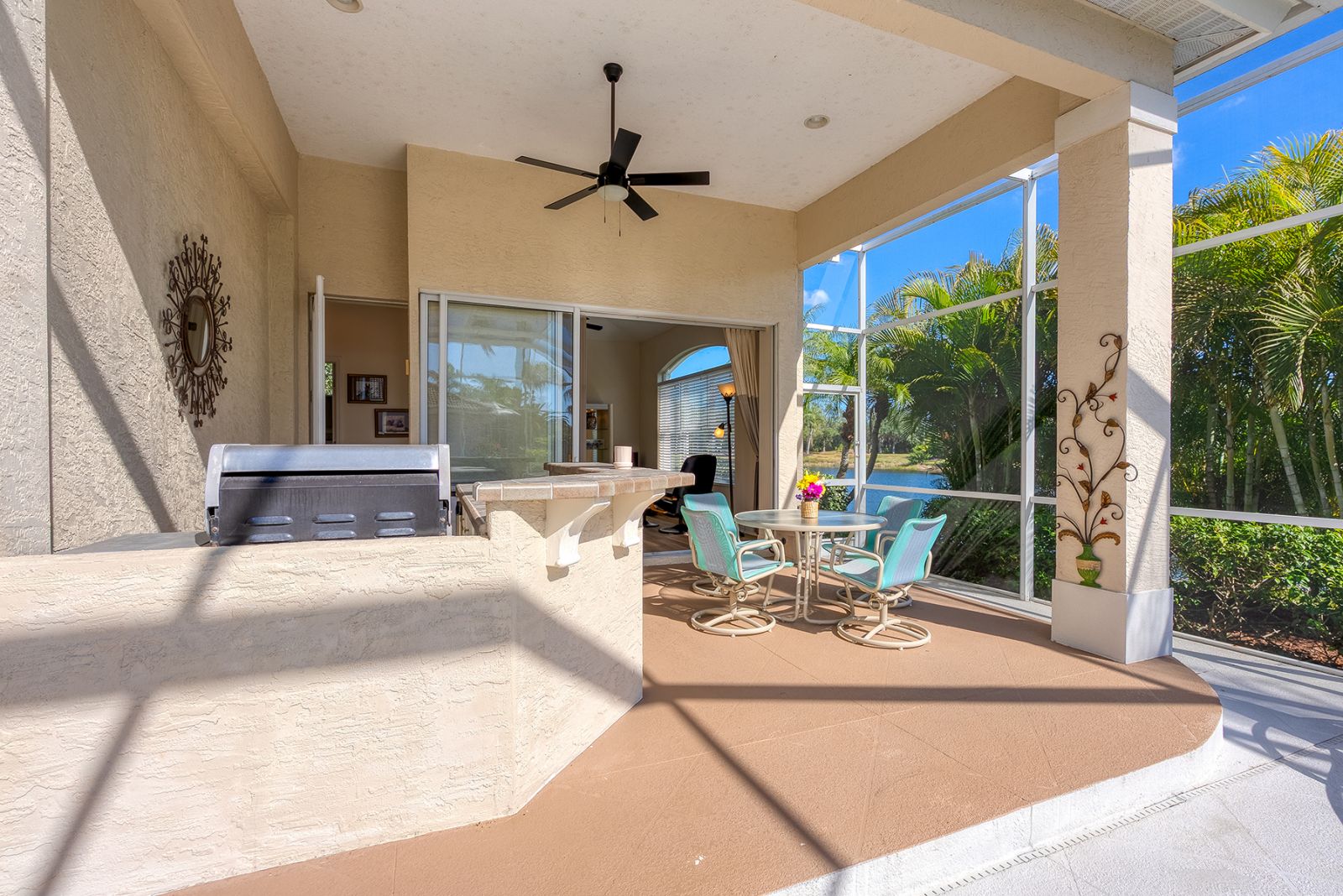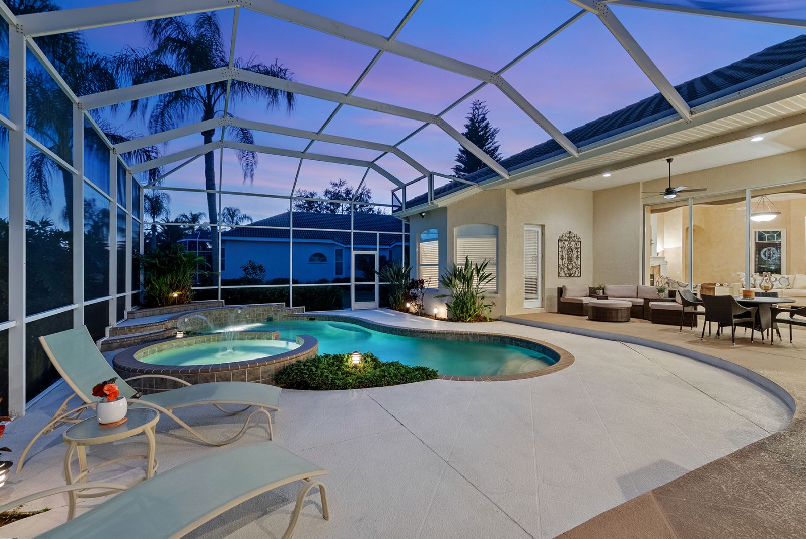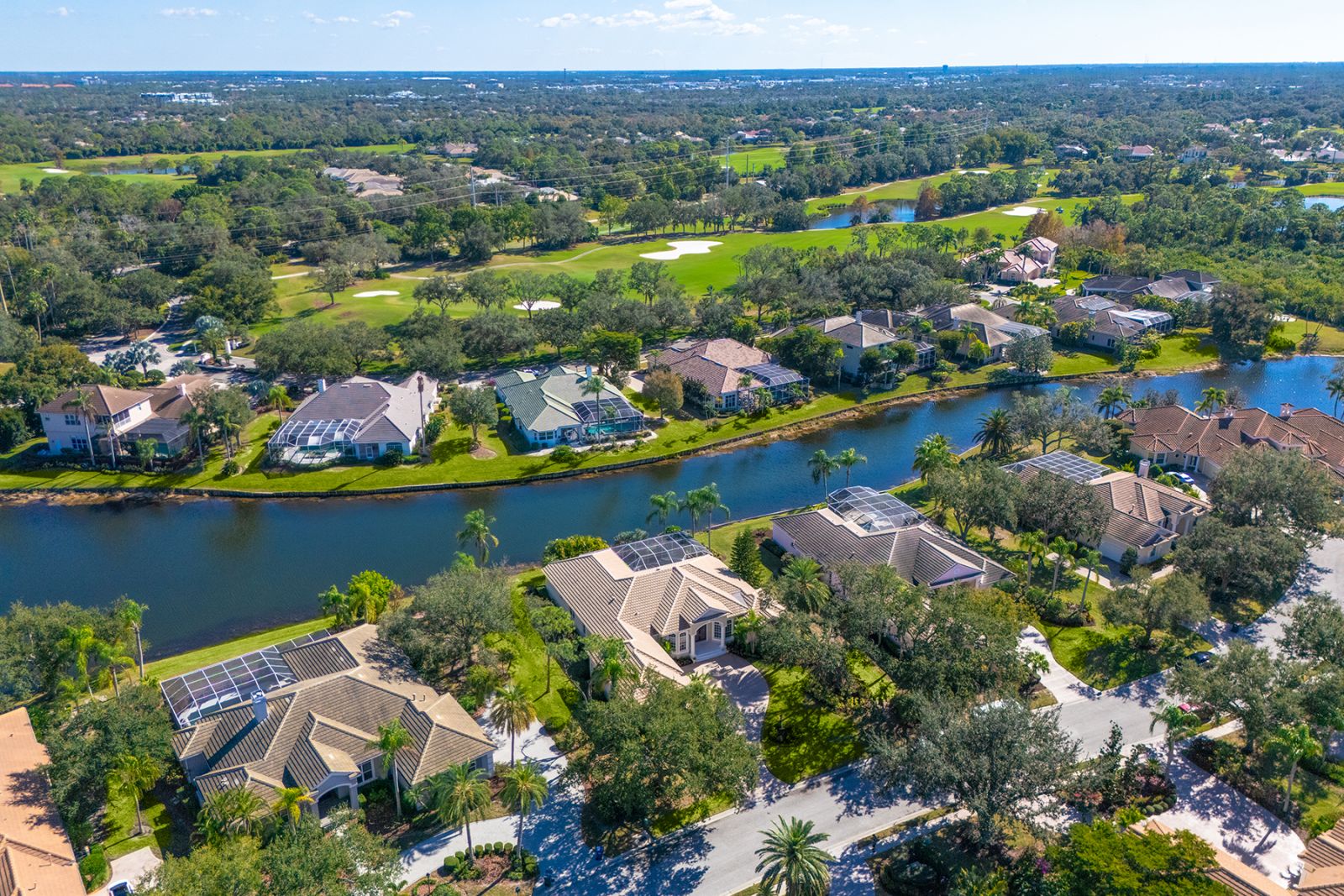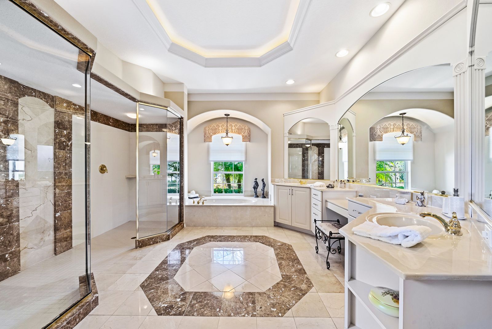 Welcome to this beautifully appointed Neal Custom Homes residence offering serene water views, exceptional architectural detail, and resort-style outdoor living. This 3-bedroom, 3-bath home with an oversized 3-car garage offers 3356 sf and is thoughtfully designed for both everyday comfort and elegant entertaining.A double designer leaded-glass front door opens to a striking foyer with marble inlay flooring, setting the tone for the refined interiors. High-end ceramic tile laid on the diagonal flows throughout the main living areas, complemented by tray and coffered ceiling details, crown molding, custom niches, and recessed lighting. The living room features a triple tray ceiling, an electric fireplace, and pocket sliders that open seamlessly to the lanai.The brand-new kitchen (2021) is the heart of the home, showcasing rich off-white wood cabinetry, exotic granite countertops, a quartz-topped center island, GE stainless steel appliances, subway tile backsplash, under-cabinet lighting, a spacious pantry, built-in oven with microwave, and an aquarium window in the breakfast area. Open to the family room and lanai, this space is ideal for entertaining.The primary suite is a private retreat featuring a sitting area with bay-style windows, coffered ceiling, dual customized closets, double-door entry, and private access to the lanai. The spa-inspired, wheelchair-accessible primary bath offers an oversized marble-detailed shower, Jacuzzi tub, marble flooring, expansive double vanity with makeup area, cultured marble countertops, triple mirrors, and new designer hardware.Bedroom two is a generously sized custom suite with a large closet and bath featuring a cultured marble vanity and tub/shower combination. Bedroom three is adjacent to a full hall bath with enclosed shower, linen closet, and updated brushed-silver fixtures. A large rear den with cathedral-style ceiling and sliders to the lanai can easily serve as a fourth bedroom with the addition of a closet.Step outside to your private oasis with a kidney-shaped heated pool and spa, lush updated landscaping with lighting, and a covered lanai offering space for a future outdoor kitchen (currently equipped with refrigerator and cabinetry).The oversized 3-car garage features higher ceilings, a painted floor, storage cabinetry, exterior access, and an electric hydraulic car lift, perfect for car enthusiasts. Additional highlights include central vacuum, exquisite lighting, select new fans, window treatments, brushed-silver hardware throughout, and a well-appointed laundry room with cabinetry, sink, and built-in ironing board.Available furnishings may be purchased separately.