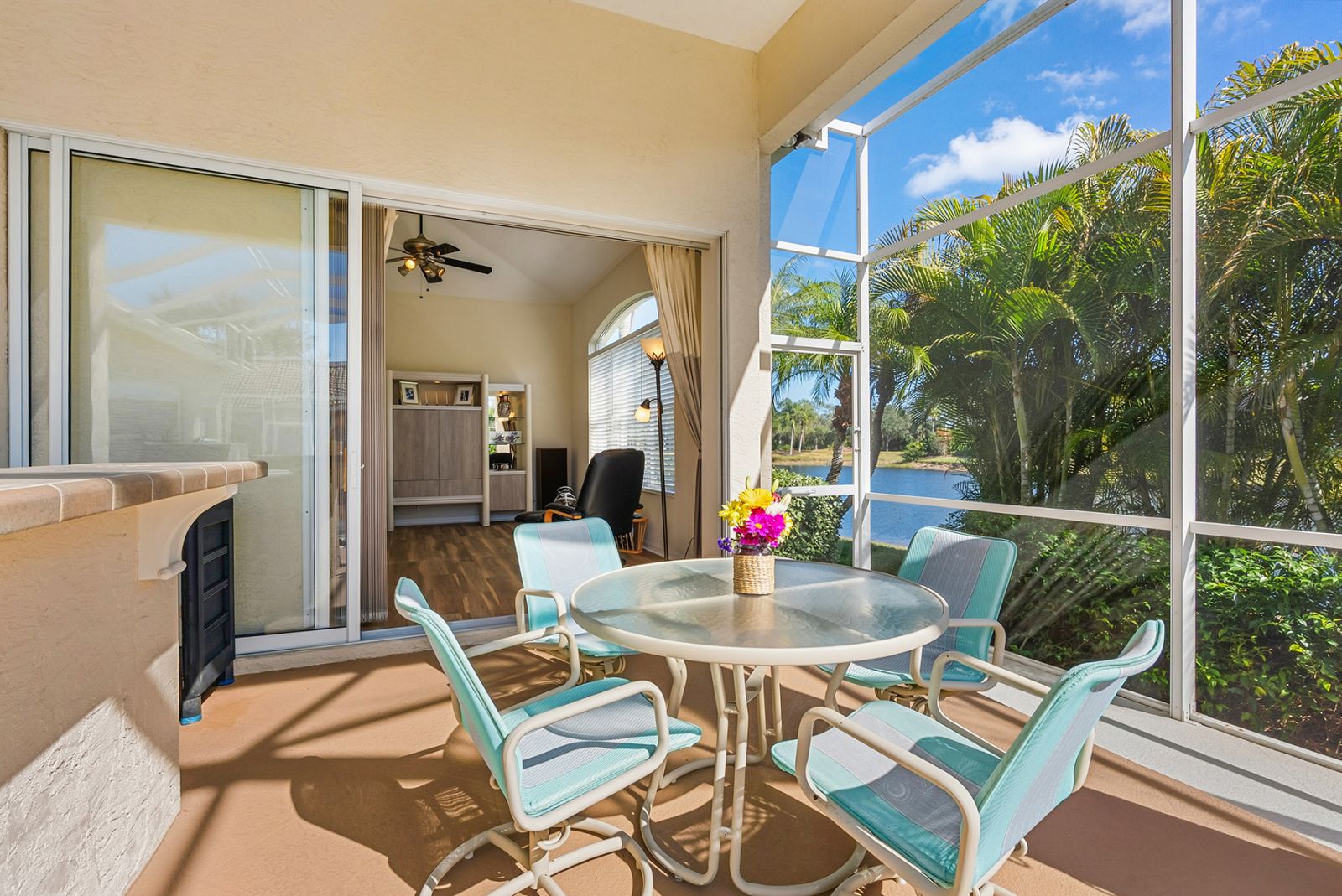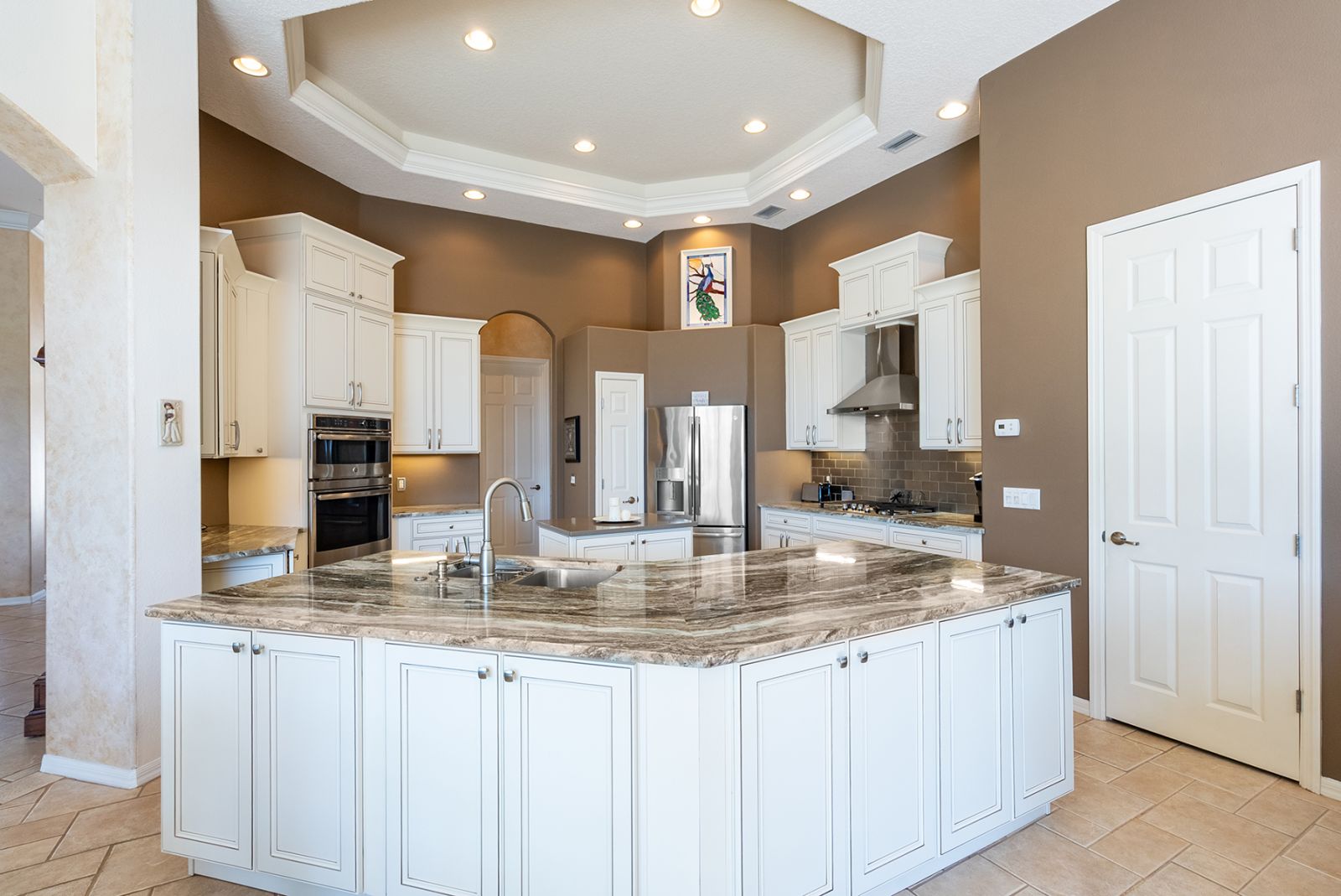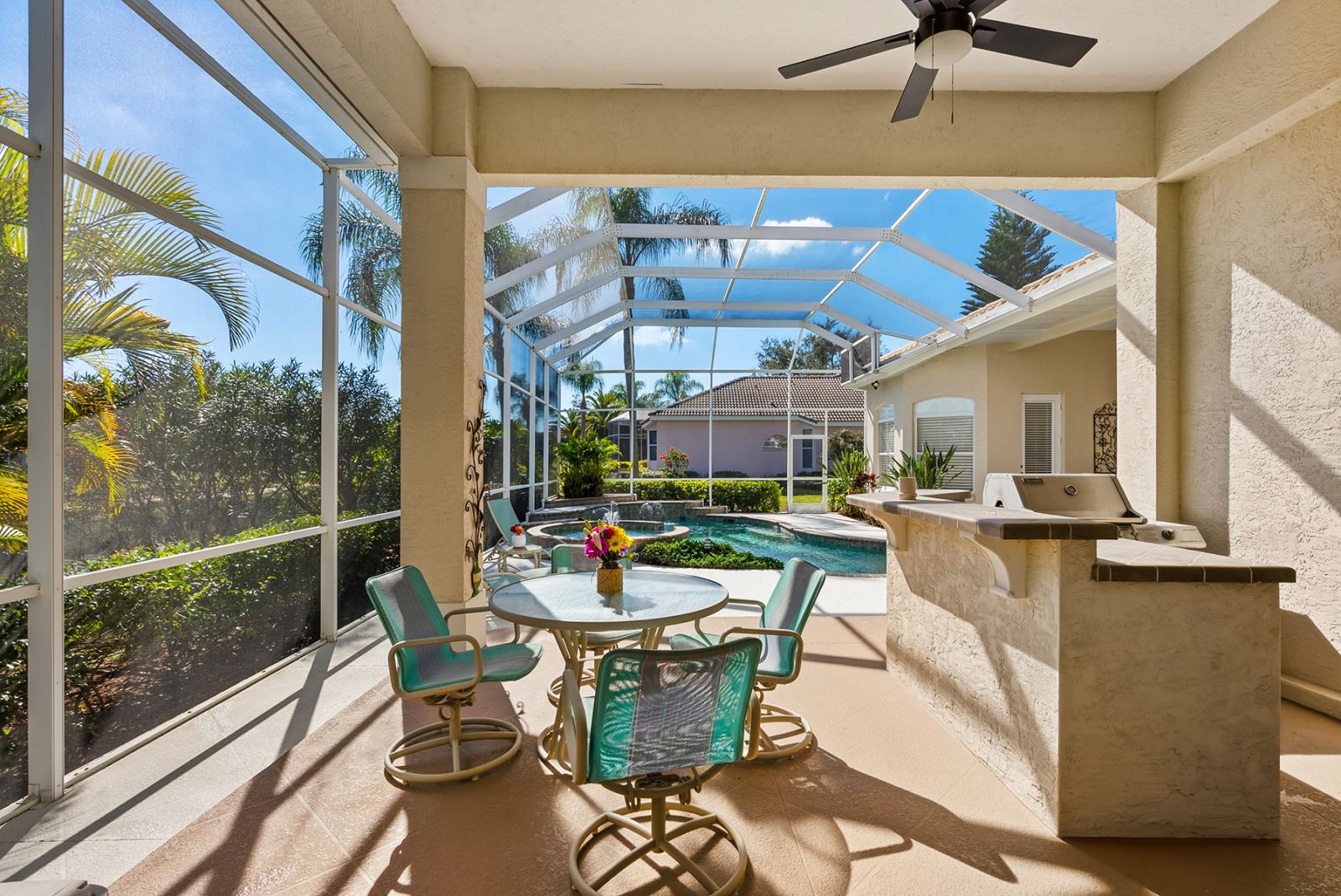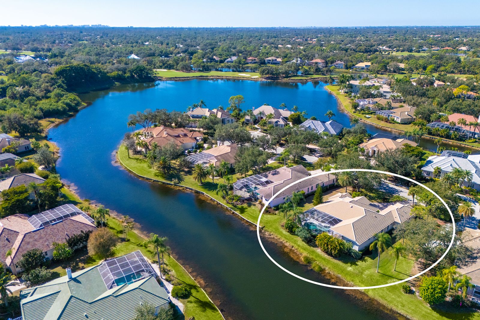 Welcome to this beautifully appointed Neal Custom Homes residence offering serene water views, exceptional architectural detail, and resort-style outdoor living. This 3-bedroom, 3-bath home with an oversized 3-car garage offers 3356 sf and is thoughtfully designed for both everyday comfort and elegant entertaining.A double designer leaded-glass front door opens to a striking foyer with marble inlay flooring, setting the tone for the refined interiors. High-end ceramic tile laid on the diagonal flows throughout the main living areas, complemented by tray and coffered ceiling details, crown molding, custom niches, and recessed lighting. The living room features a triple tray ceiling, an electric fireplace, and pocket sliders that open seamlessly to the lanai.The brand-new kitchen (2021) is the heart of the home, showcasing rich off-white wood cabinetry, exotic granite countertops, a quartz-topped center island, GE stainless steel appliances, subway tile backsplash, under-cabinet lighting, a spacious pantry, built-in oven with microwave, and an aquarium window in the breakfast area. Open to the family room and lanai, this space is ideal for entertaining.The primary suite is a private retreat featuring a sitting area with bay-style windows, coffered ceiling, dual customized closets, double-door entry, and private access to the lanai. The spa-inspired, wheelchair-accessible primary bath offers an oversized marble-detailed shower, Jacuzzi tub, marble flooring, expansive double vanity with makeup area, cultured marble countertops, triple mirrors, and new designer hardware.Bedroom two is a generously sized custom suite with a large closet and bath featuring a cultured marble vanity and tub/shower combination. Bedroom three is adjacent to a full hall bath with enclosed shower, linen closet, and updated brushed-silver fixtures. A large rear den with cathedral-style ceiling and sliders to the lanai can easily serve as a fourth bedroom with the addition of a closet.Step outside to your private oasis with a kidney-shaped heated pool and spa, lush updated landscaping with lighting, and a covered lanai offering space for a future outdoor kitchen (currently equipped with refrigerator and cabinetry).The oversized 3-car garage features higher ceilings, a painted floor, storage cabinetry, exterior access, and an electric hydraulic car lift, perfect for car enthusiasts. Additional highlights include central vacuum, exquisite lighting, select new fans, window treatments, brushed-silver hardware throughout, and a well-appointed laundry room with cabinetry, sink, and built-in ironing board.Available furnishings may be purchased separately.