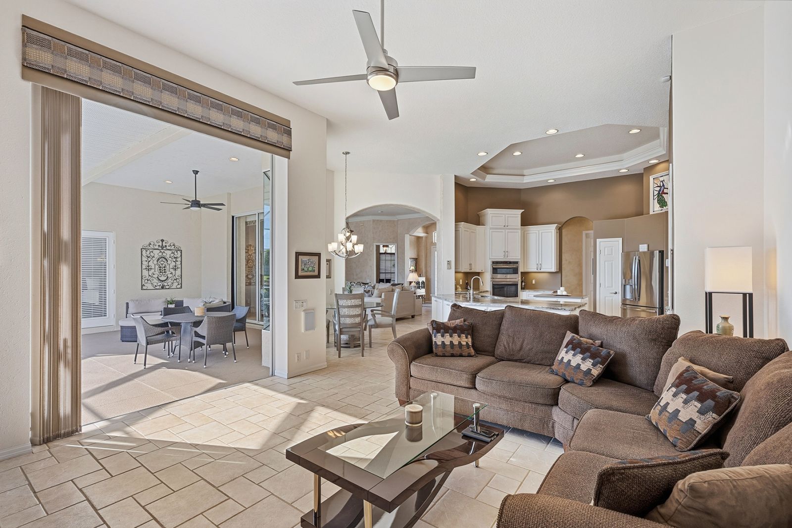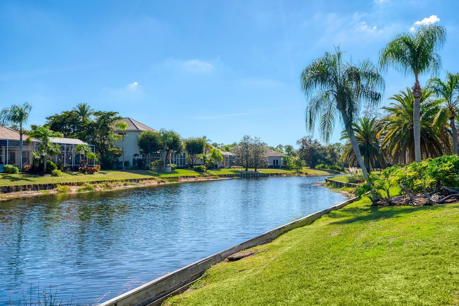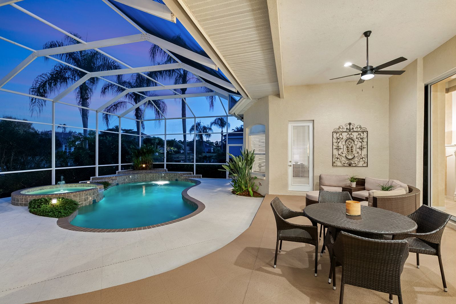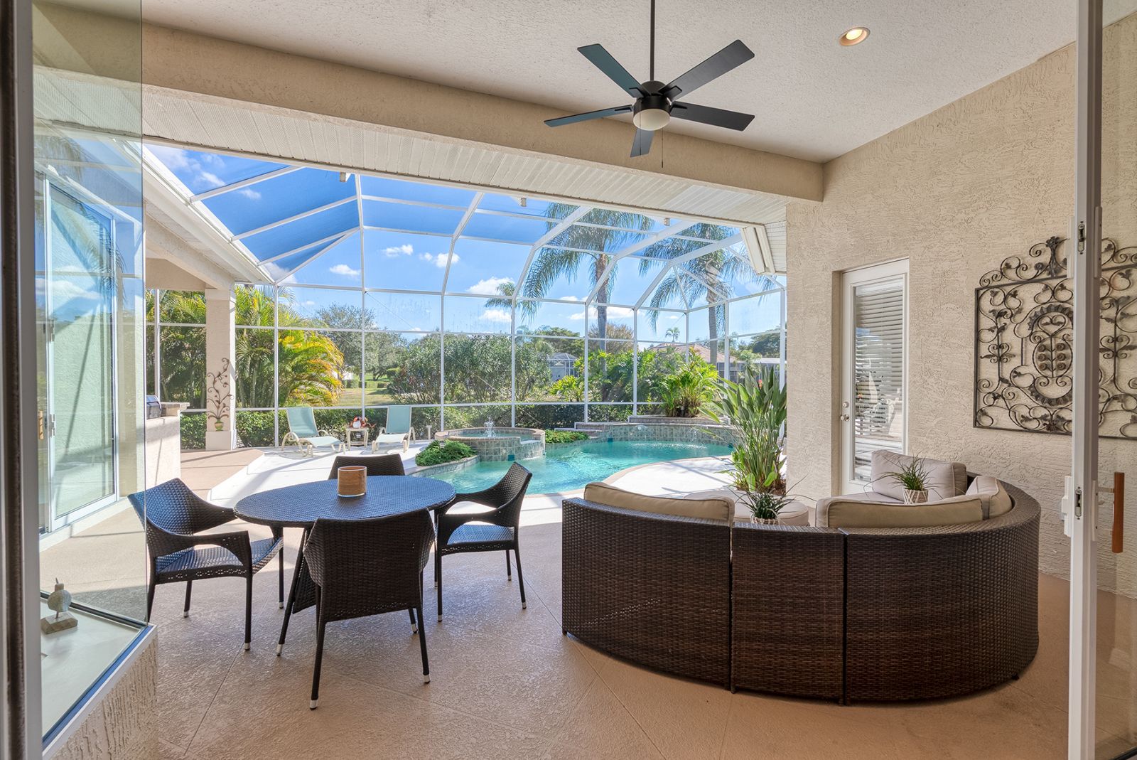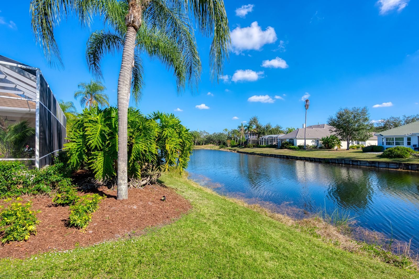 Welcome to this beautifully appointed Neal Custom Homes residence offering serene water views, exceptional architectural detail, and resort-style outdoor living. This 3-bedroom, 3-bath home with an oversized 3-car garage offers 3356 sf and is thoughtfully designed for both everyday comfort and elegant entertaining.A double designer leaded-glass front door opens to a striking foyer with marble inlay flooring, setting the tone for the refined interiors. High-end ceramic tile laid on the diagonal flows throughout the main living areas, complemented by tray and coffered ceiling details, crown molding, custom niches, and recessed lighting. The living room features a triple tray ceiling, an electric fireplace, and pocket sliders that open seamlessly to the lanai.The brand-new kitchen (2021) is the heart of the home, showcasing rich off-white wood cabinetry, exotic granite countertops, a quartz-topped center island, GE stainless steel appliances, subway tile backsplash, under-cabinet lighting, a spacious pantry, built-in oven with microwave, and an aquarium window in the breakfast area. Open to the family room and lanai, this space is ideal for entertaining.The primary suite is a private retreat featuring a sitting area with bay-style windows, coffered ceiling, dual customized closets, double-door entry, and private access to the lanai. The spa-inspired, wheelchair-accessible primary bath offers an oversized marble-detailed shower, Jacuzzi tub, marble flooring, expansive double vanity with makeup area, cultured marble countertops, triple mirrors, and new designer hardware.Bedroom two is a generously sized custom suite with a large closet and bath featuring a cultured marble vanity and tub/shower combination. Bedroom three is adjacent to a full hall bath with enclosed shower, linen closet, and updated brushed-silver fixtures. A large rear den with cathedral-style ceiling and sliders to the lanai can easily serve as a fourth bedroom with the addition of a closet.Step outside to your private oasis with a kidney-shaped heated pool and spa, lush updated landscaping with lighting, and a covered lanai offering space for a future outdoor kitchen (currently equipped with refrigerator and cabinetry).The oversized 3-car garage features higher ceilings, a painted floor, storage cabinetry, exterior access, and an electric hydraulic car lift, perfect for car enthusiasts. Additional highlights include central vacuum, exquisite lighting, select new fans, window treatments, brushed-silver hardware throughout, and a well-appointed laundry room with cabinetry, sink, and built-in ironing board.Available furnishings may be purchased separately.